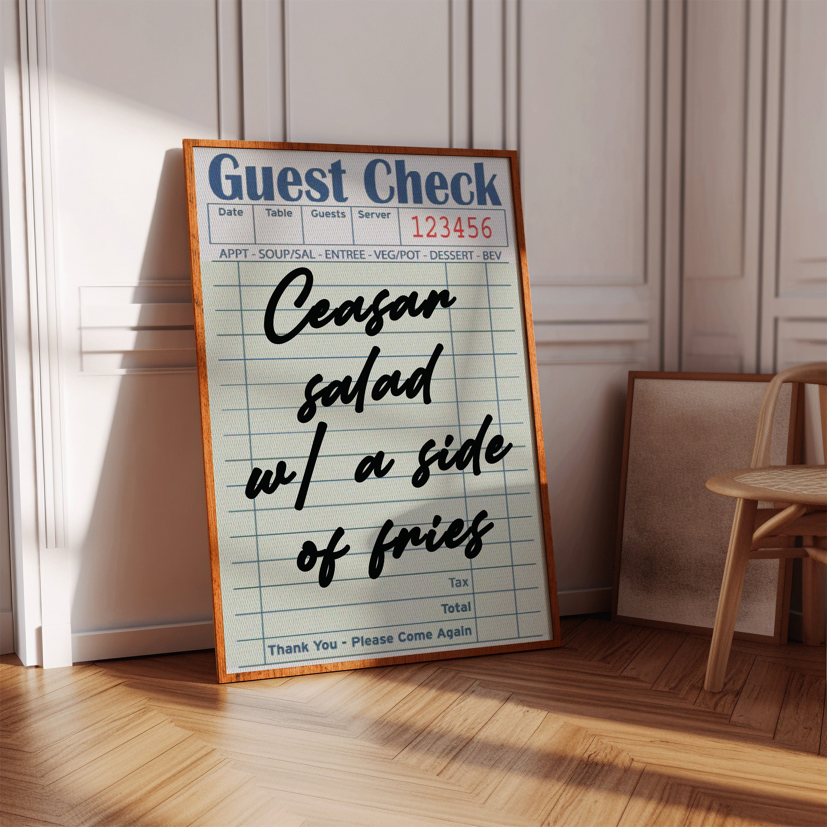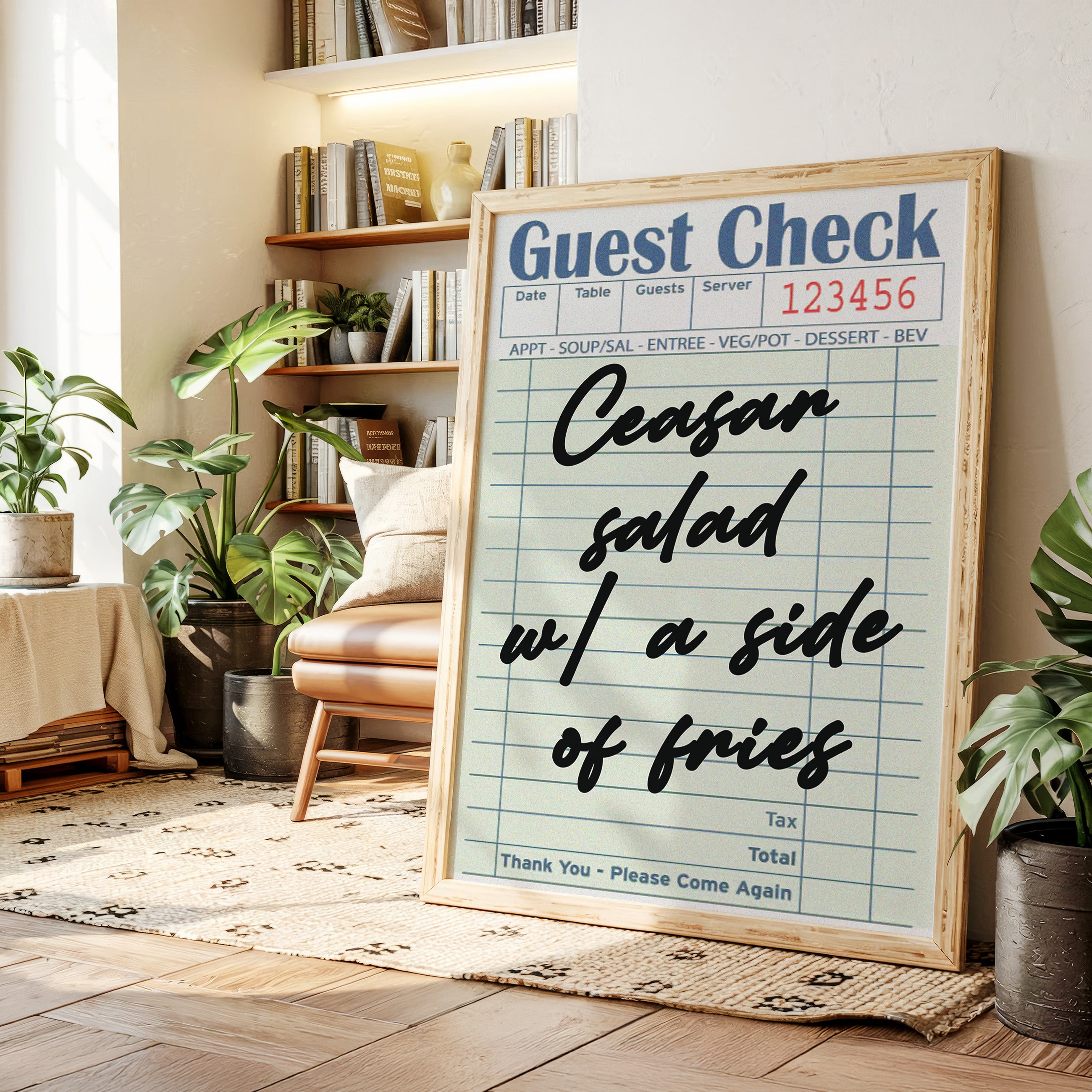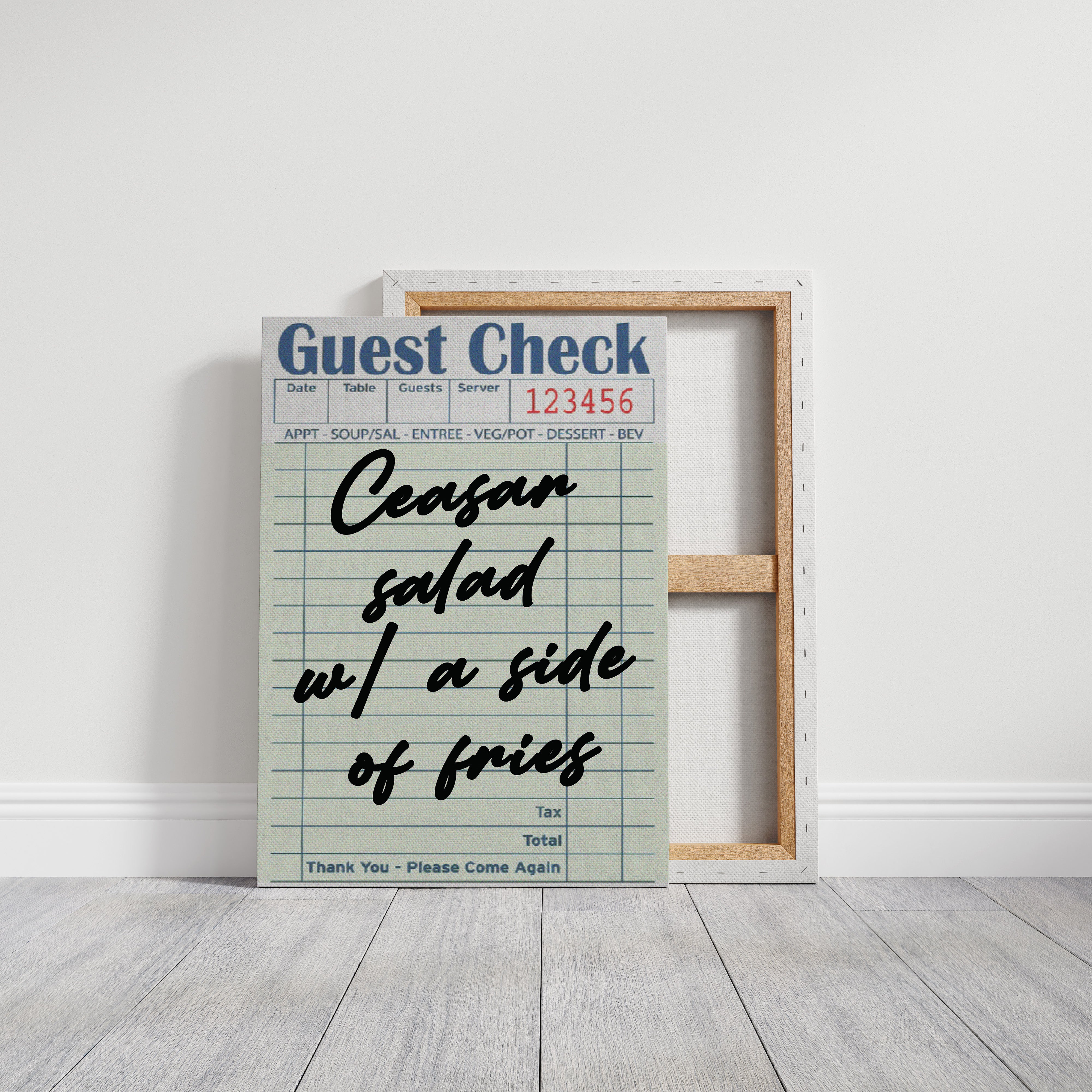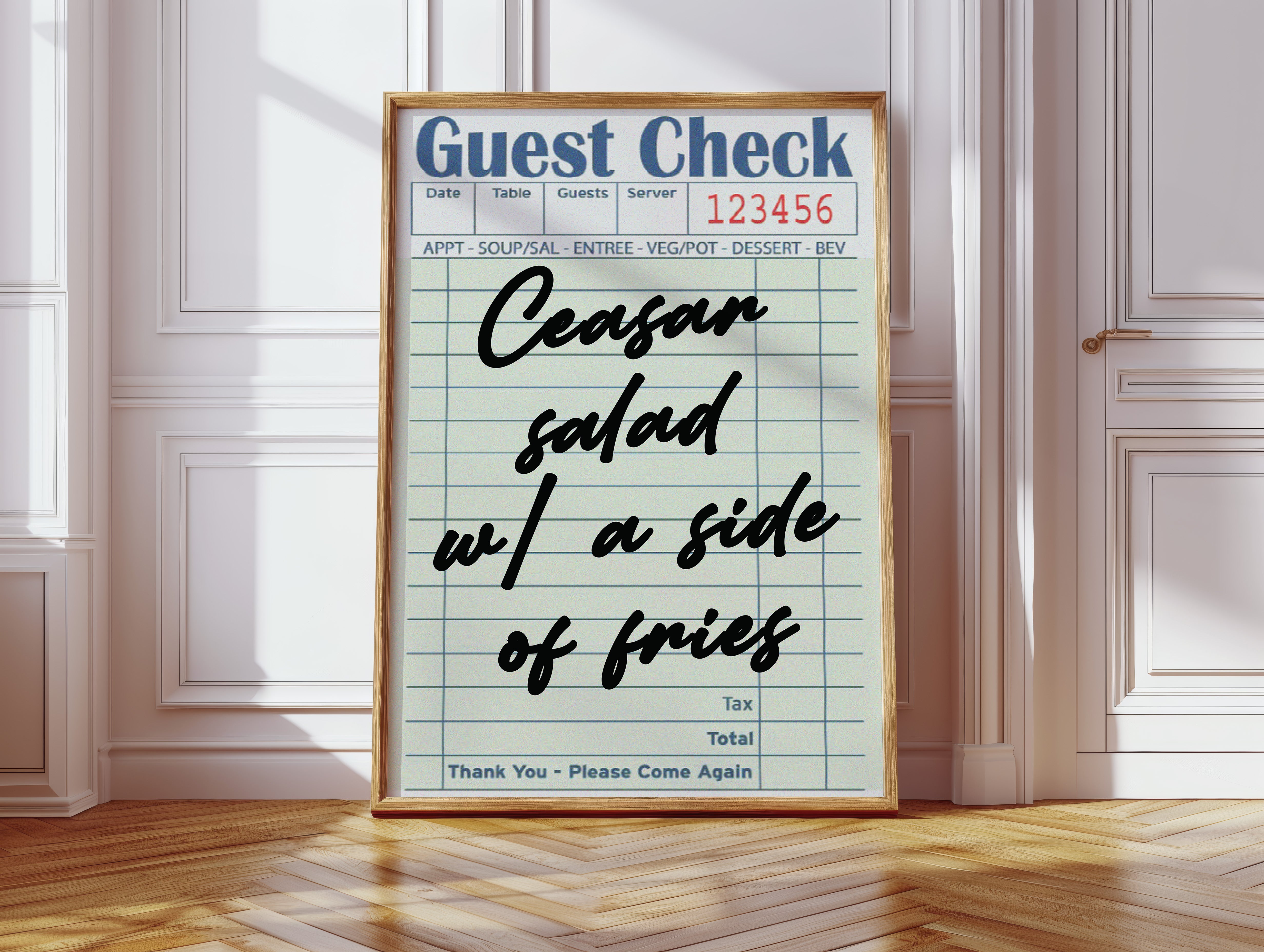 Sunlight streams across a vintage guest check, casting long shadows that dance with handwritten cursive on mint-green paper. This piece from our Contemporary Typography collection transforms everyday restaurant ephemera into striking modern art. Bold black script contrasts against the delicate lined paper, while the golden frame and classic guest check header create a nostalgic narrative about casual dining culture. The composition speaks to shared meals and simple pleasures, elevated through clean design and thoughtful presentation. Perfect for adding personality to a dining room, kitchen, or restaurant-inspired space, this piece celebrates the beauty found in life's casual moments.