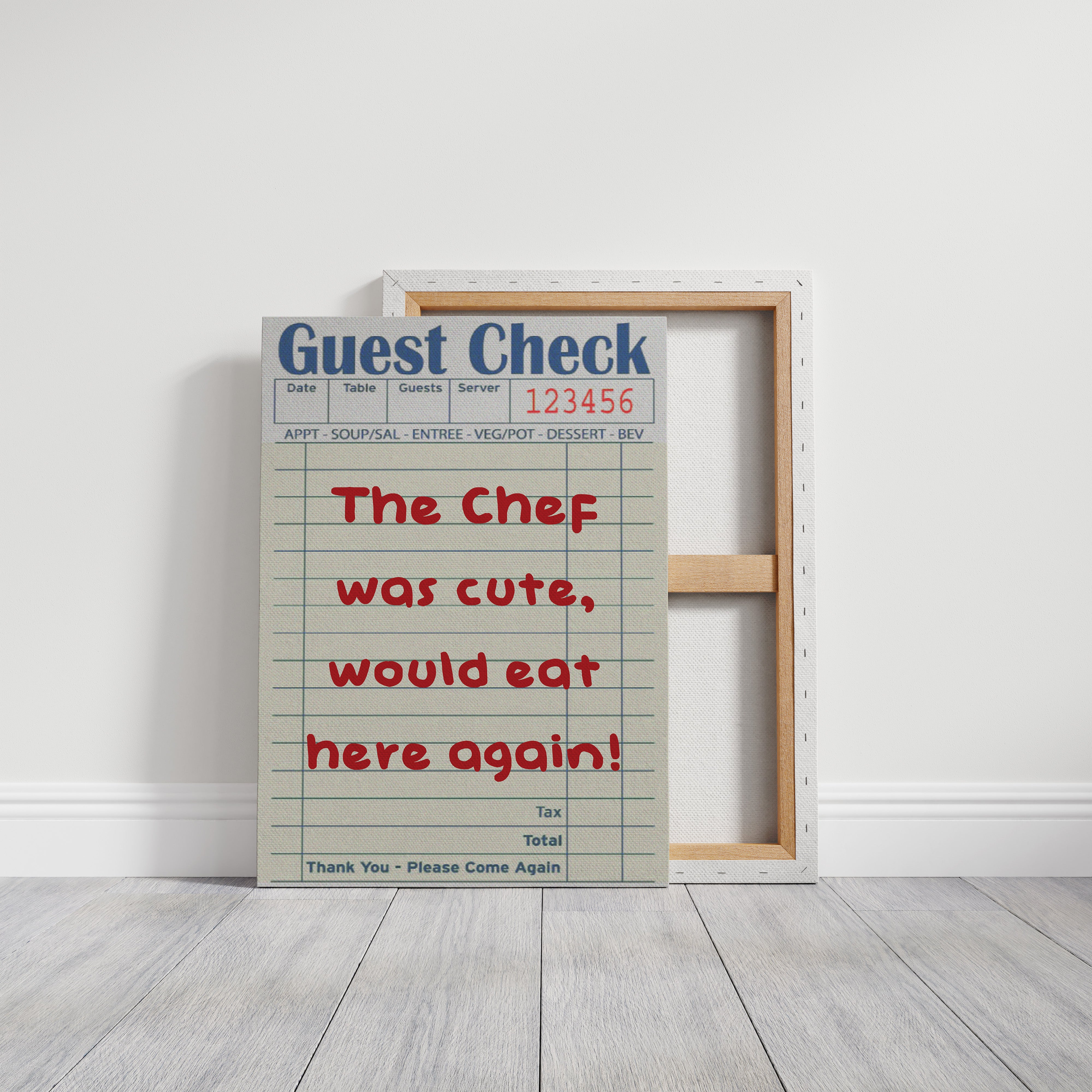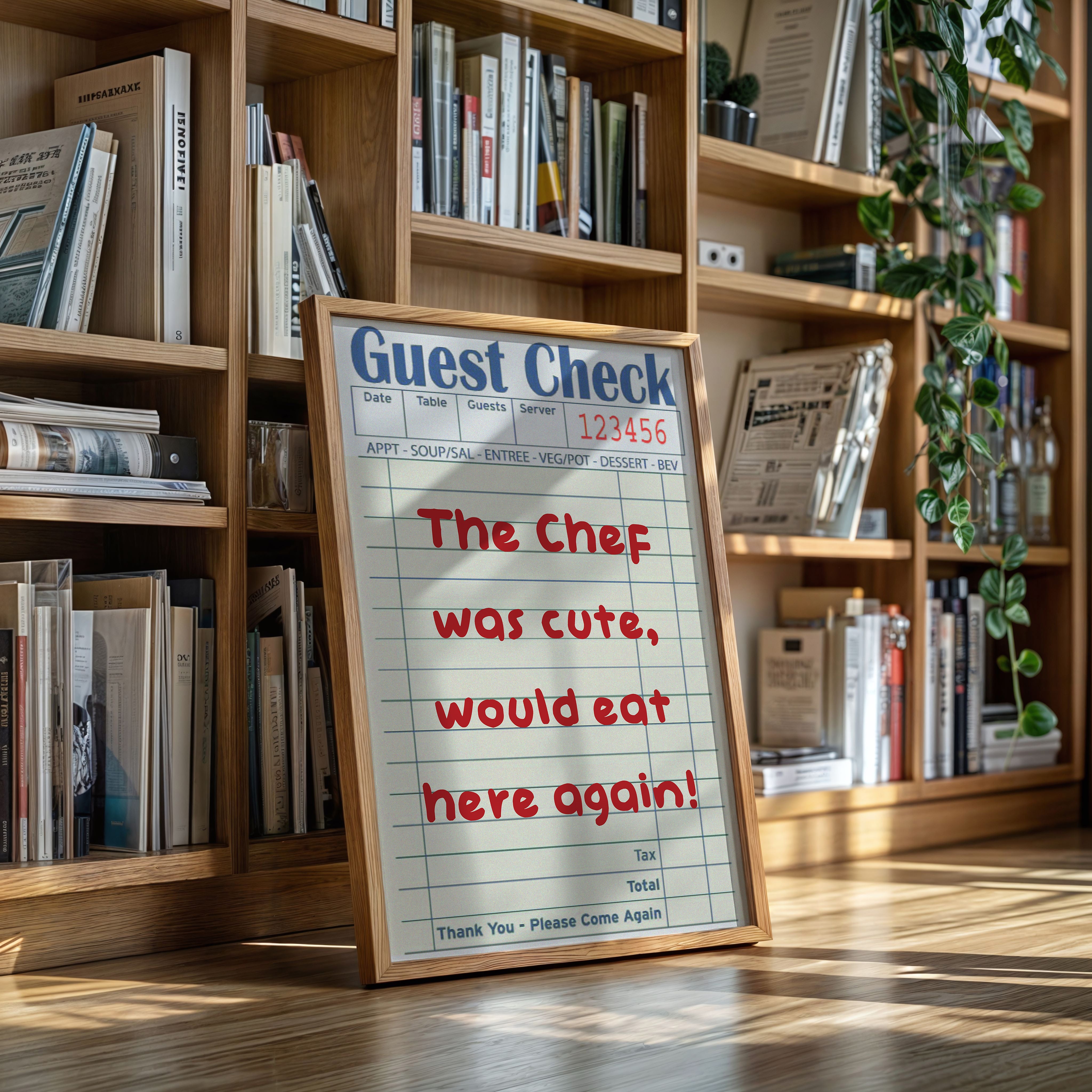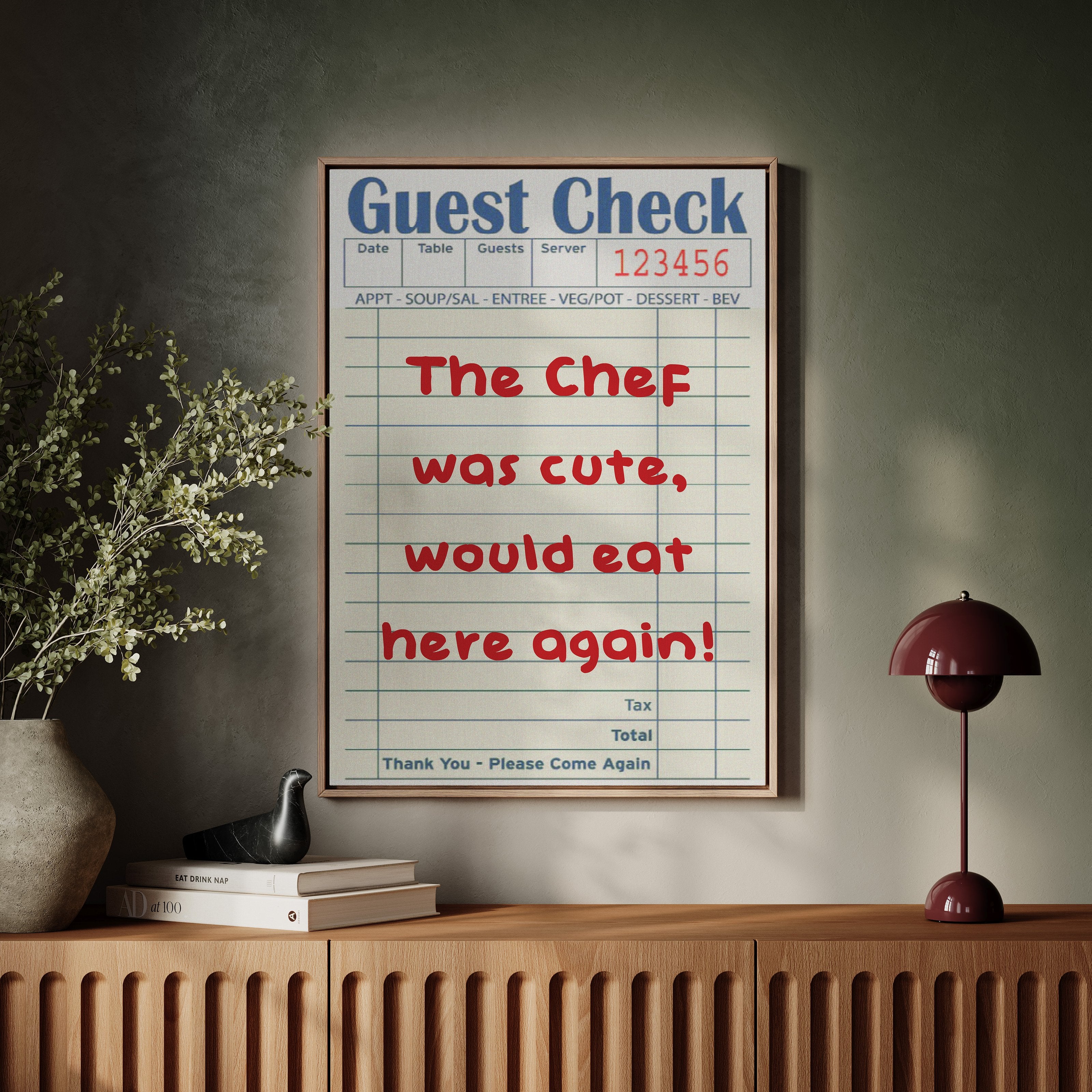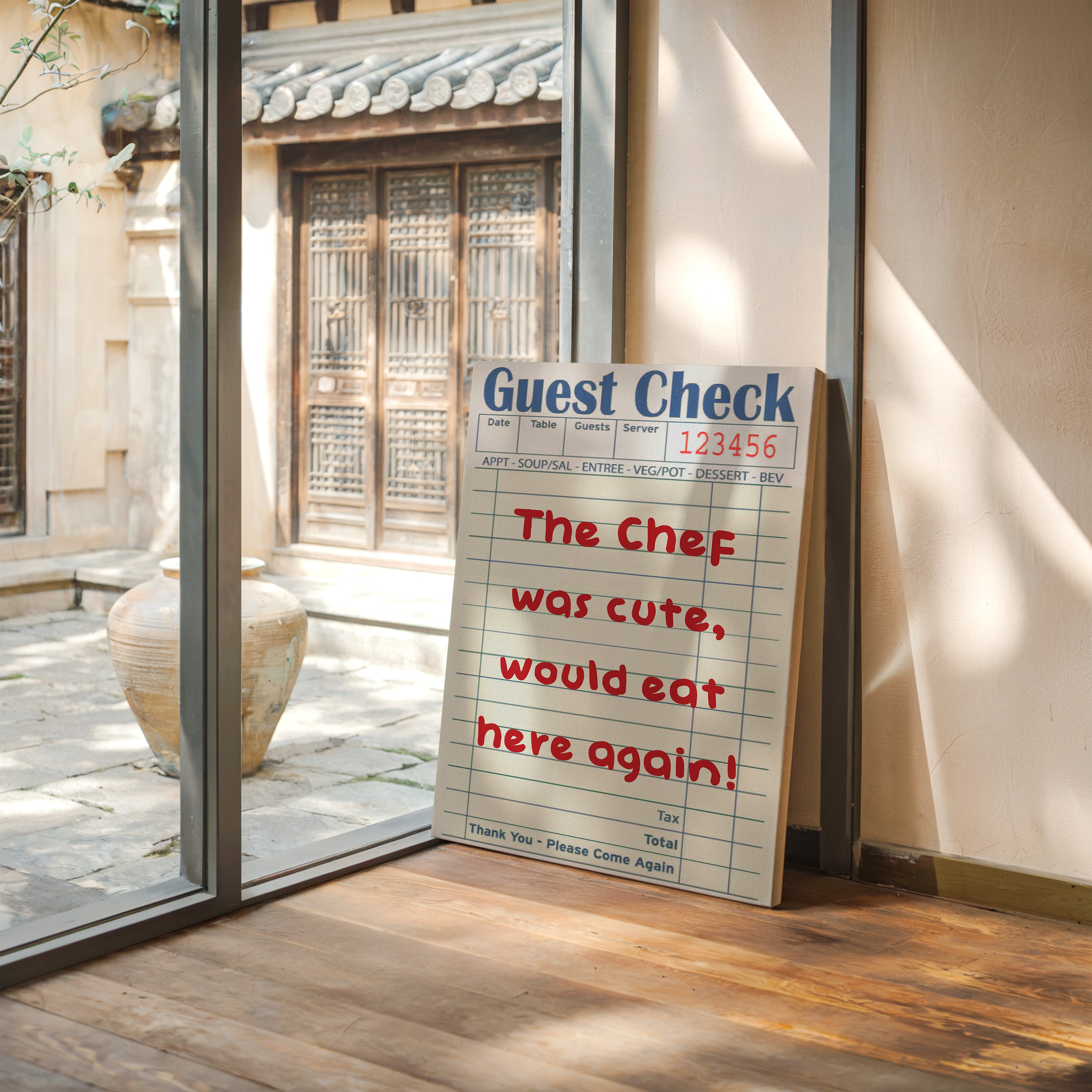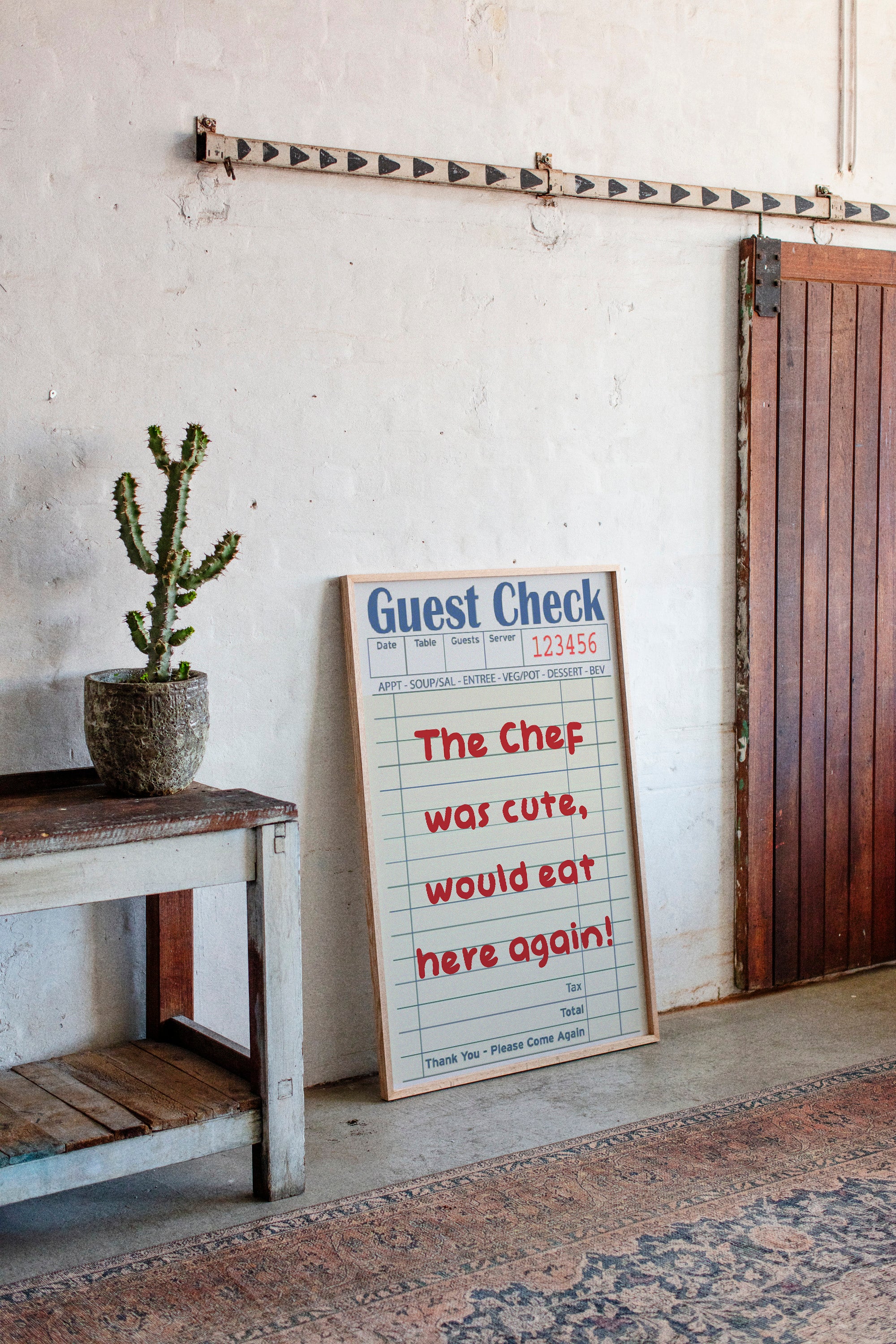 A playful guest check transforms into an artistic statement, where red handwriting dances across lined paper with flirtatious charm. This piece from our Contemporary collection captures the intersection of restaurant culture and modern wit. The composition juxtaposes industrial elements - a weathered wall, vintage sliding track, and potted cactus - with the warmth of handwritten sentiment, creating a story of connection in unexpected places. Perfect for adding personality to a modern kitchen, dining room, or restaurant space. The piece invites conversation while celebrating the simple joy of shared meals and memorable service.