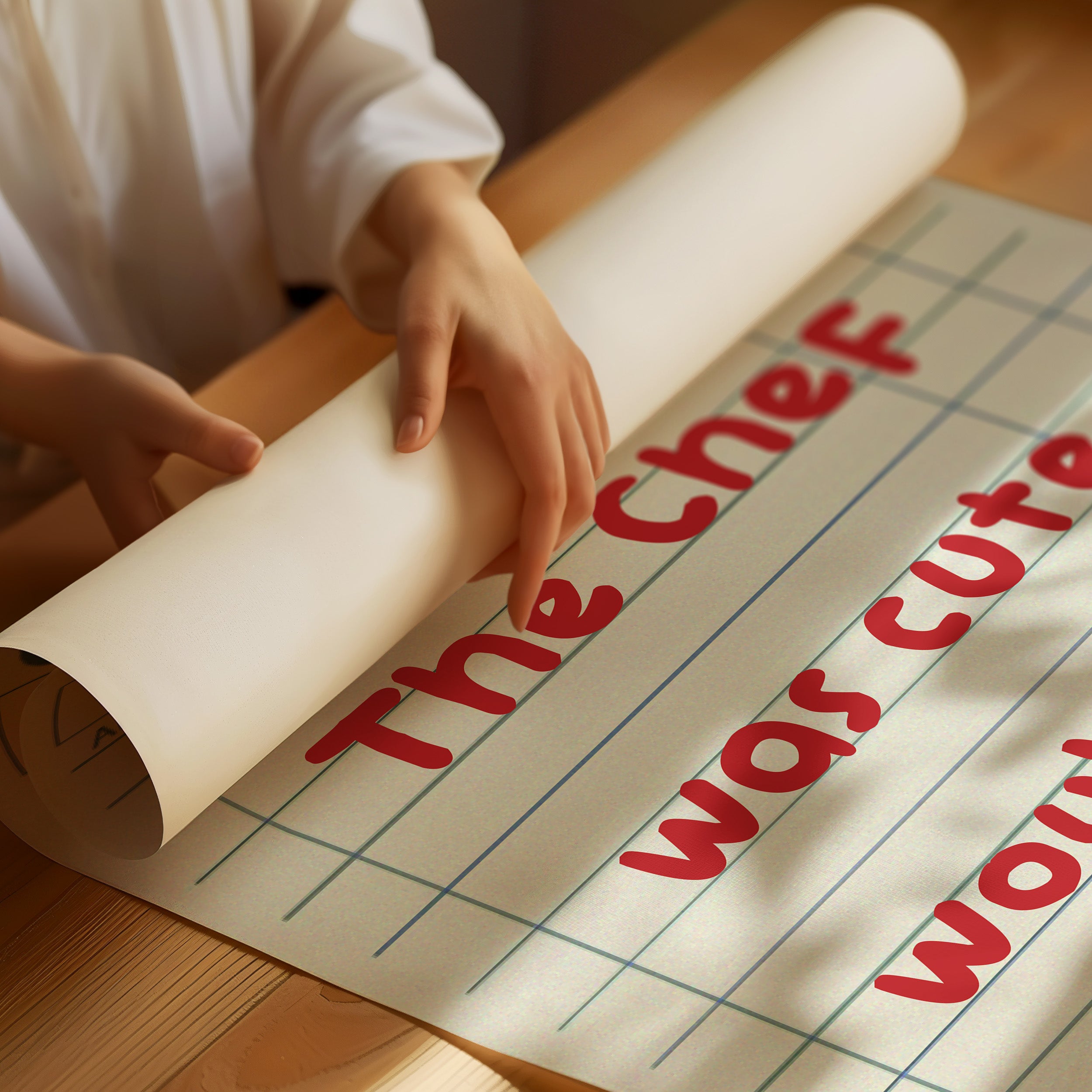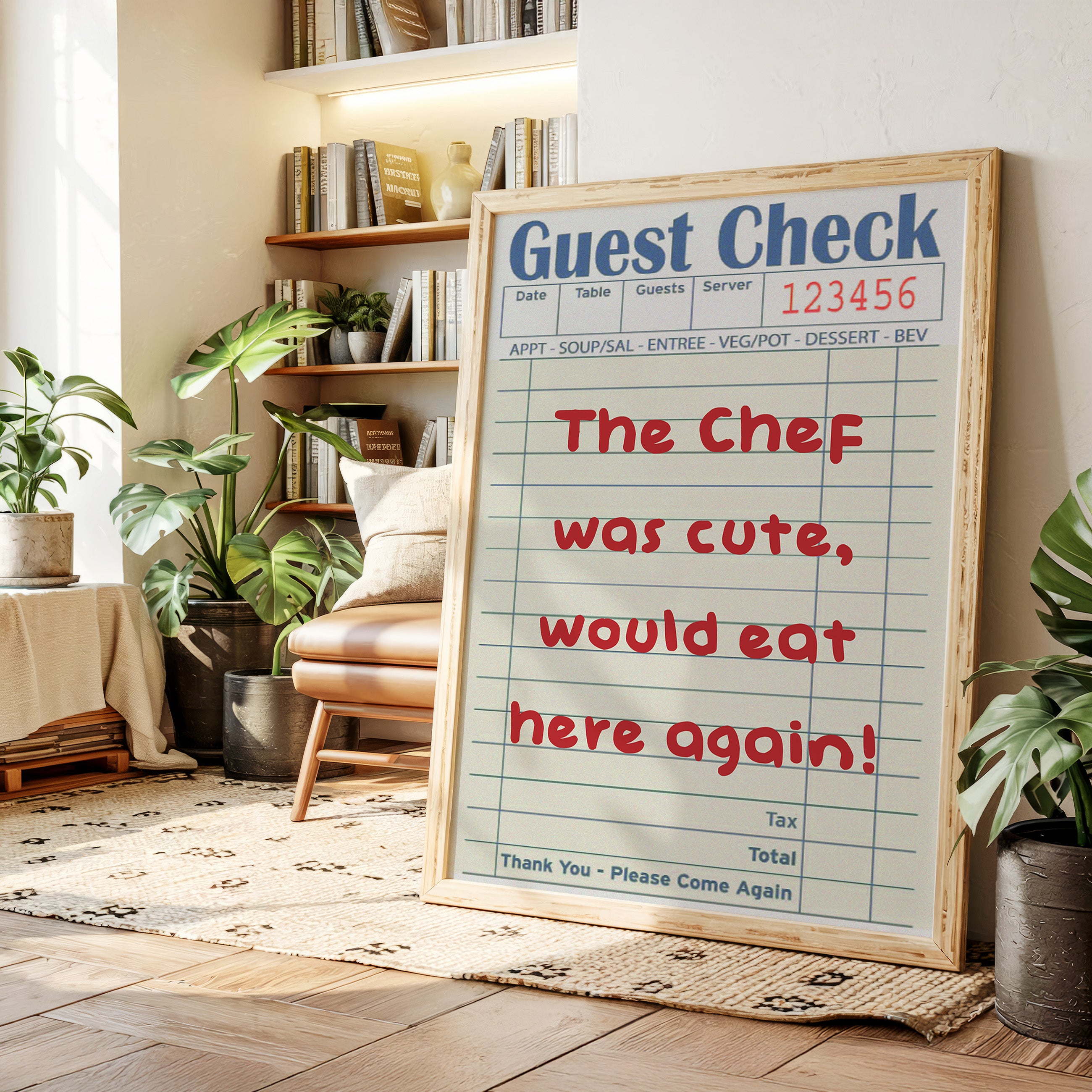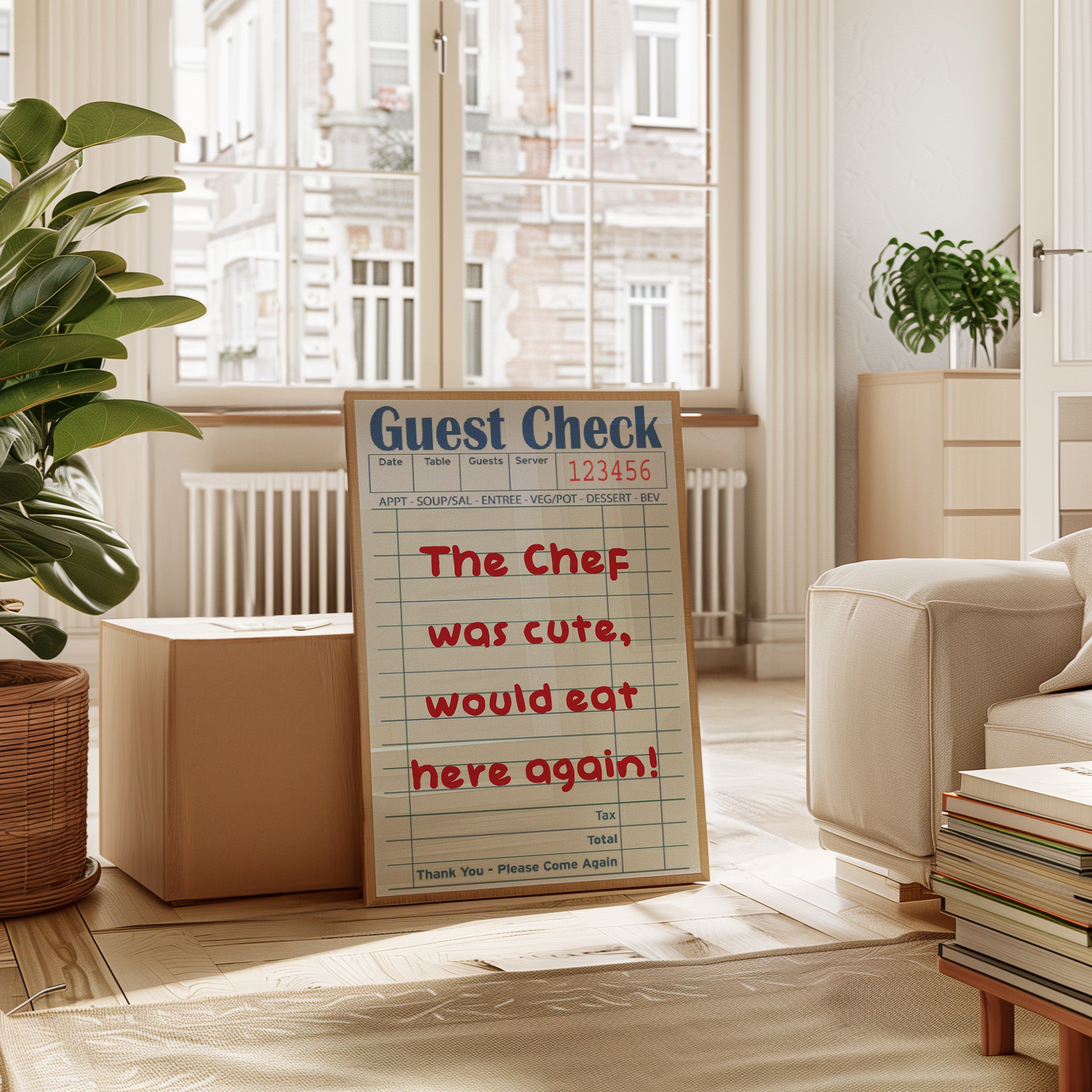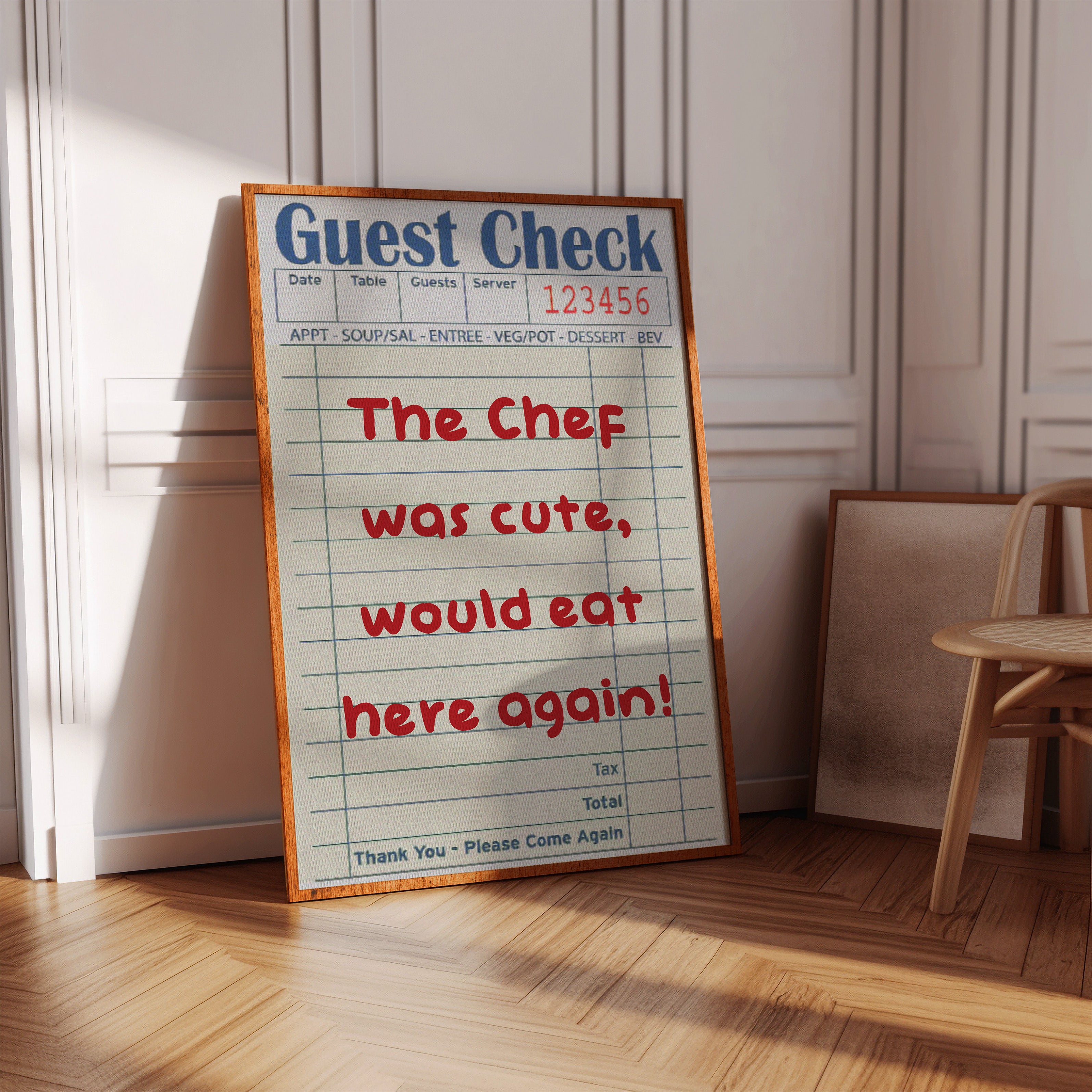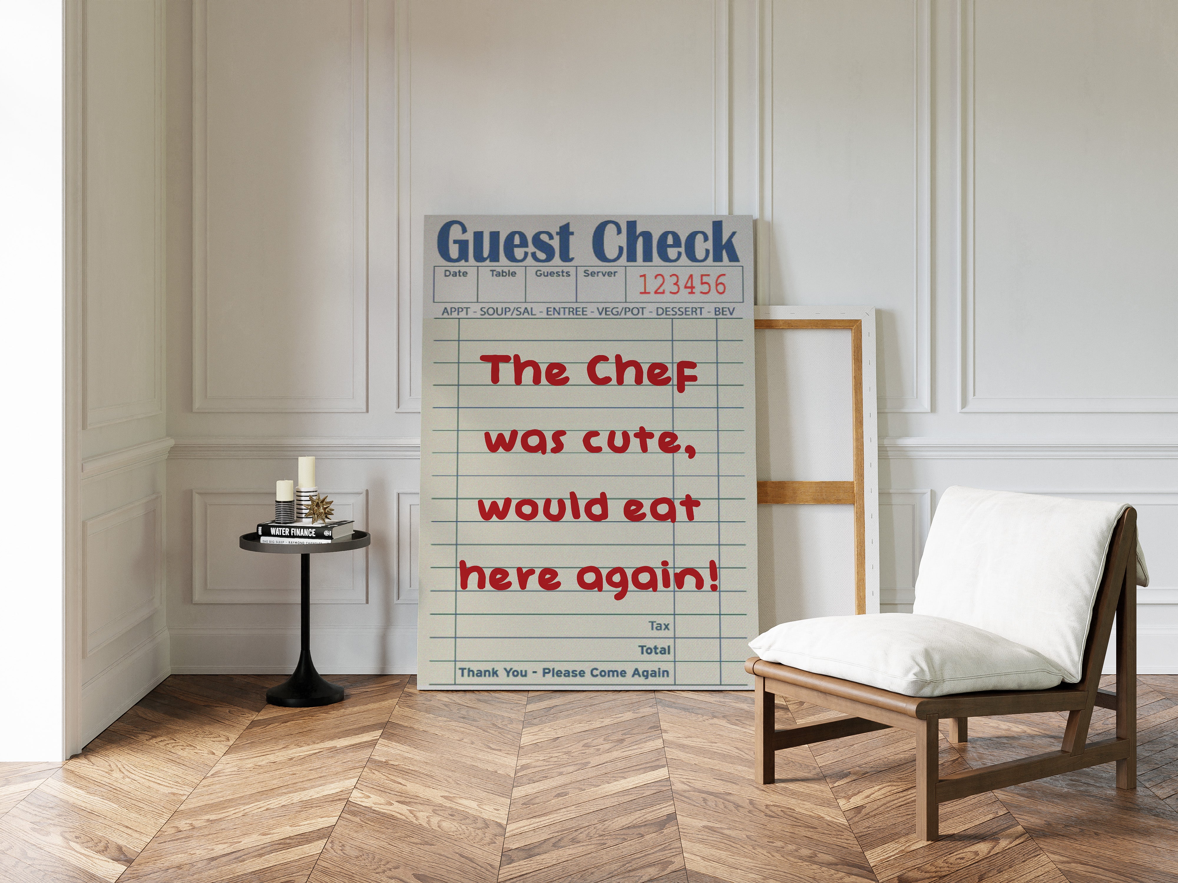 A playful guest check transforms into an artistic statement, where red handwriting dances across lined paper with flirtatious charm. This piece from our Contemporary collection captures the intersection of restaurant culture and modern wit. The composition juxtaposes industrial elements - a weathered wall, vintage sliding track, and potted cactus - with the warmth of handwritten sentiment, creating a story of connection in unexpected places. Perfect for adding personality to a modern kitchen, dining room, or restaurant space. The piece invites conversation while celebrating the simple joy of shared meals and memorable service.