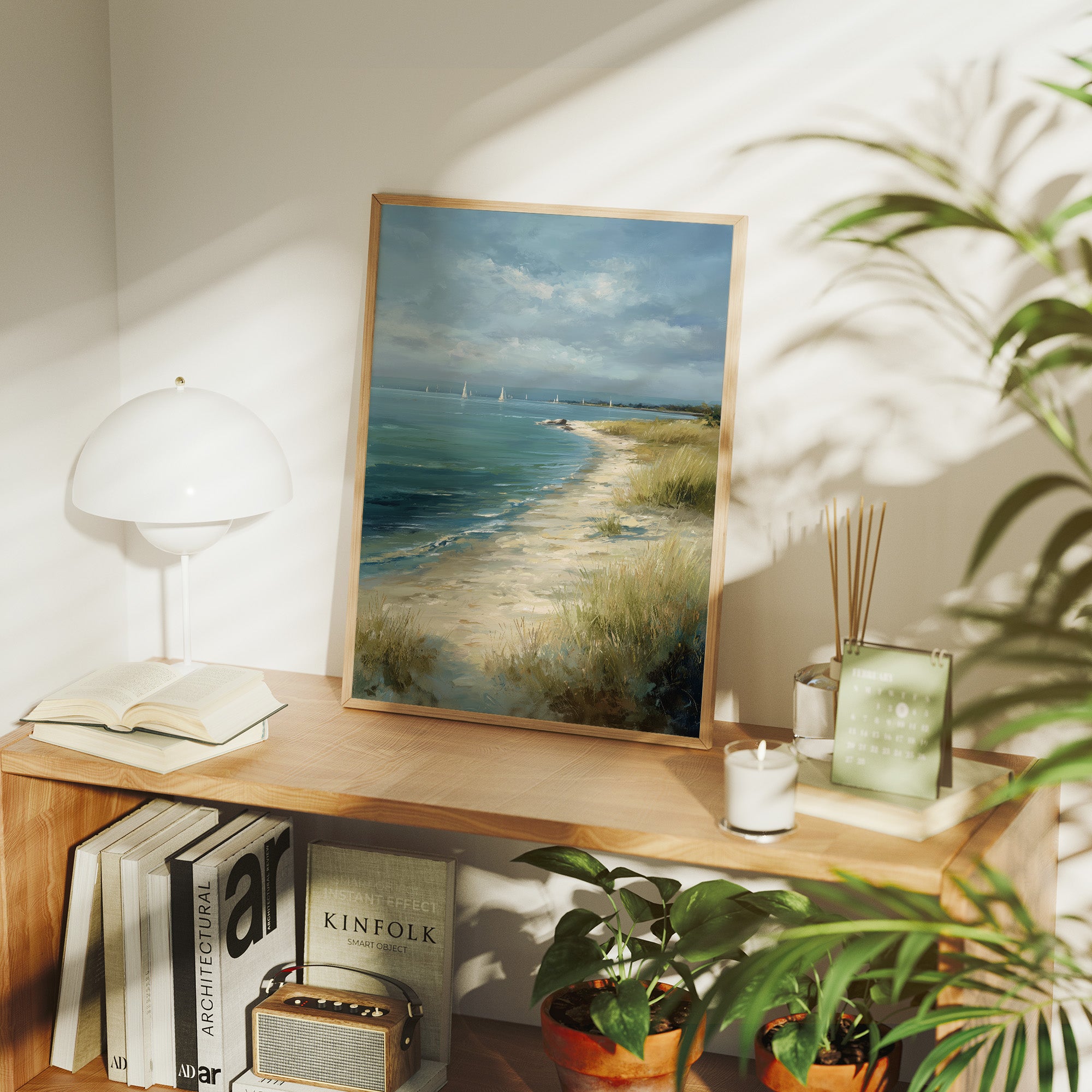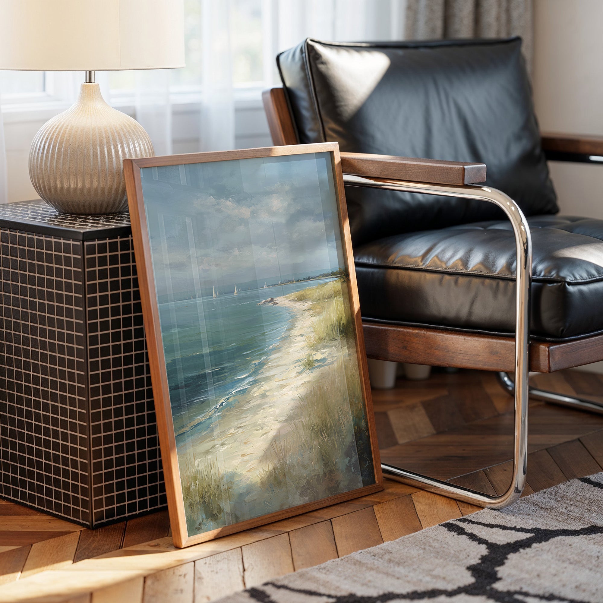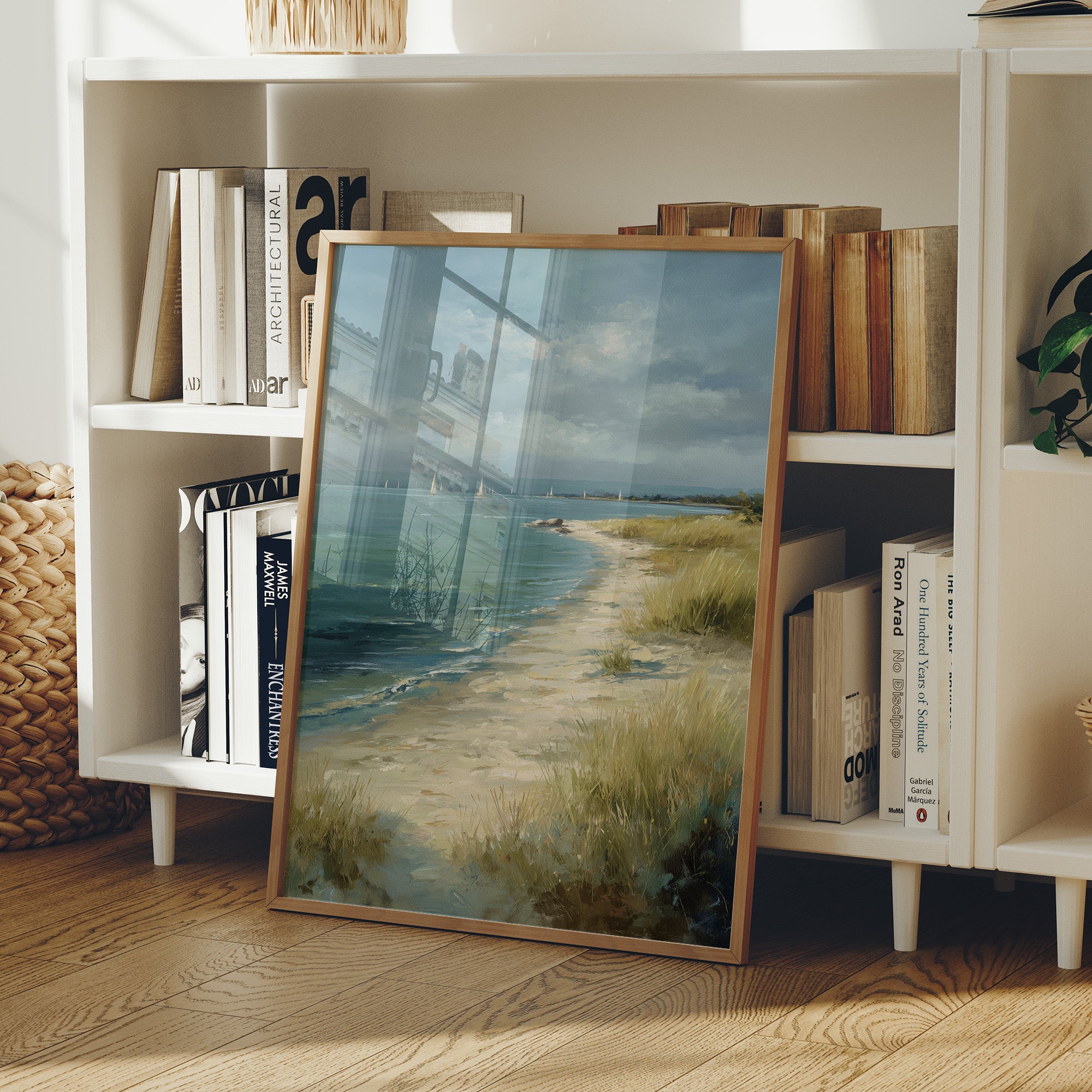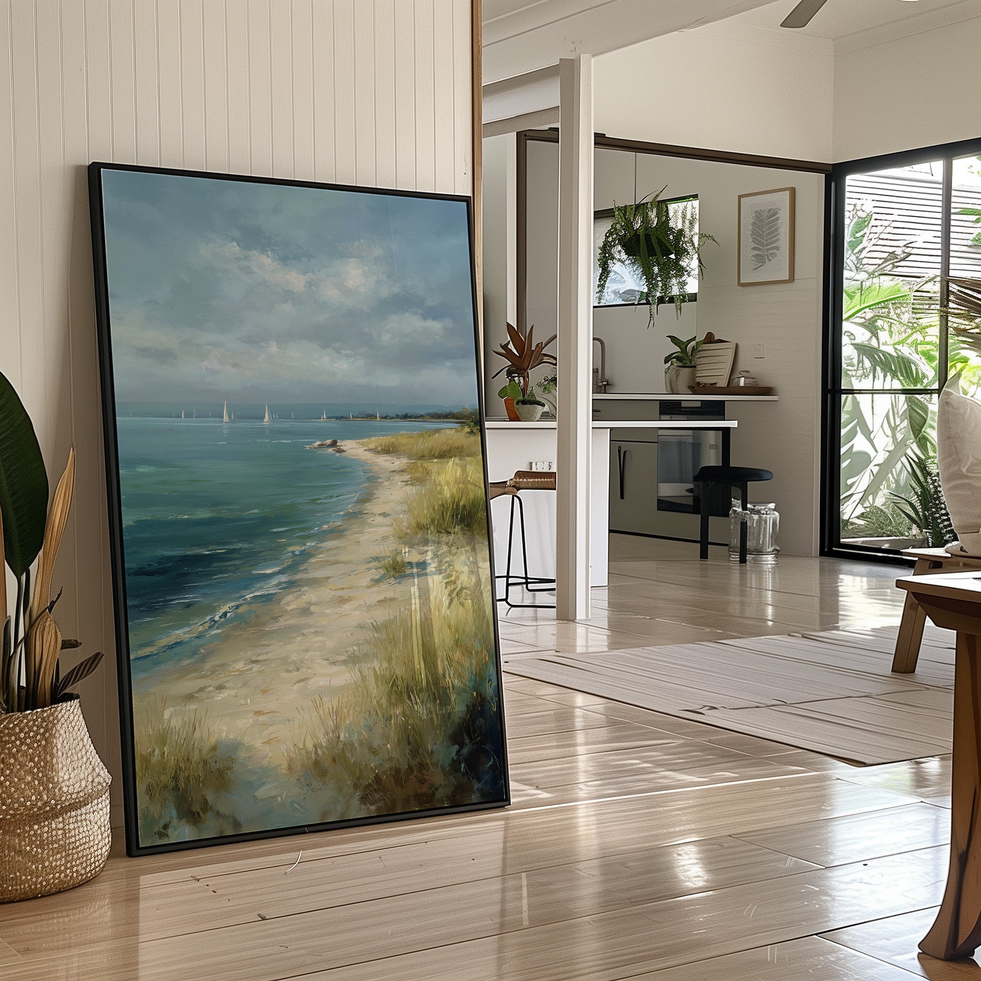 A serene coastal landscape painting resting against its wooden In the distance, white sailboats dot the teal-blue waters under a dramatic sky of gathering clouds. The painting evokes a contemplative atmosphere with its soft color palette of blues, sandy beiges, and muted greens. The composition beautifully balances the vast expanse of water against the intimate details of the beach grasses, creating a sense of peaceful solitude.