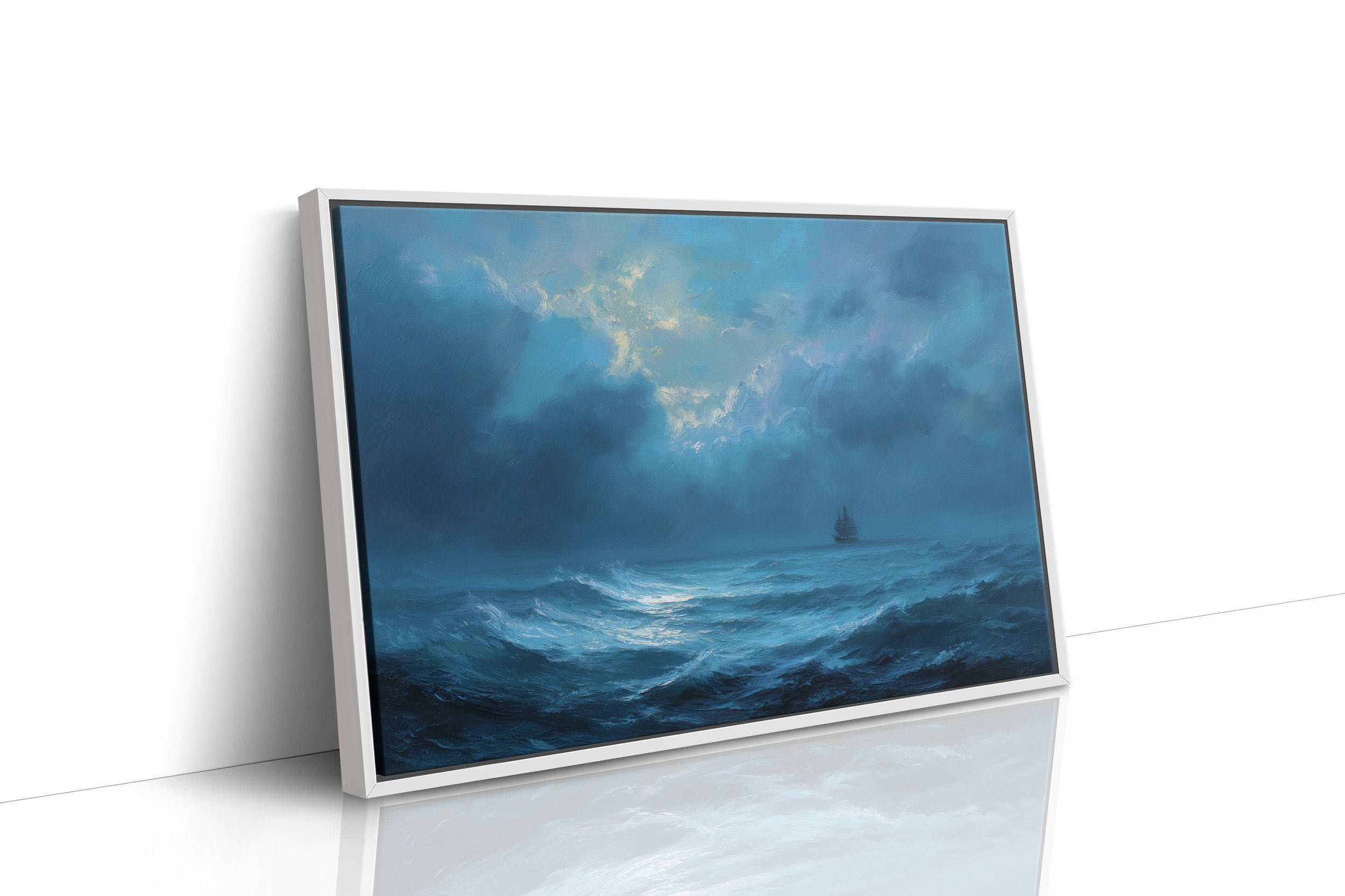 A solitary vessel drifts through tempestuous waters, small against the vast expanse of churning waves. The painting captures the dramatic interplay of light breaking through storm clouds, casting ethereal blue hues across the tumultuous seascape. Displayed elegantly against a backdrop of carefully arranged bookshelves, this maritime scene invites contemplation of human courage against nature's raw power. This piece would create a captivating focal point in a study, library, or any space where thoughtful introspection is welcomed.