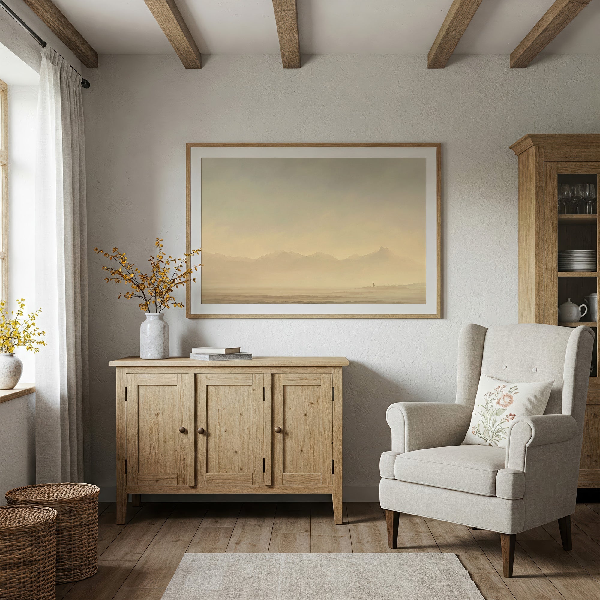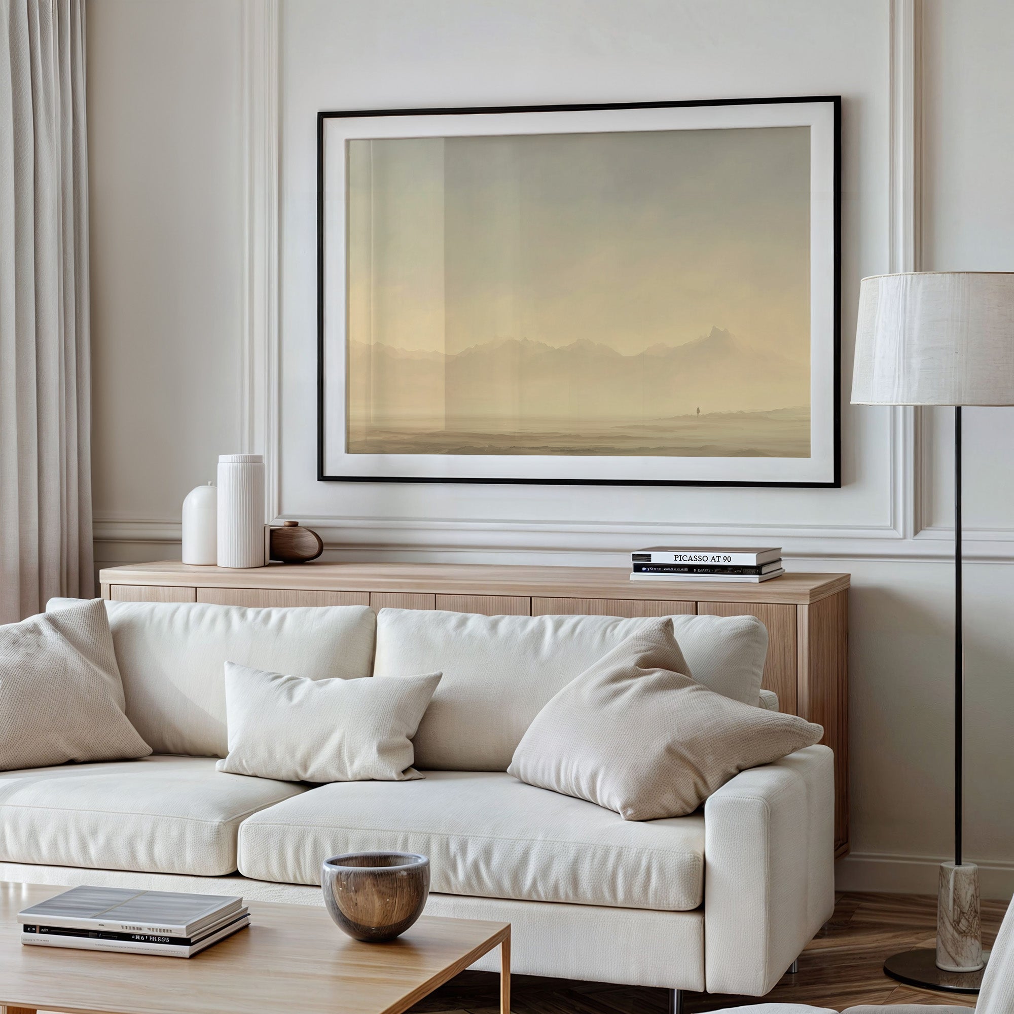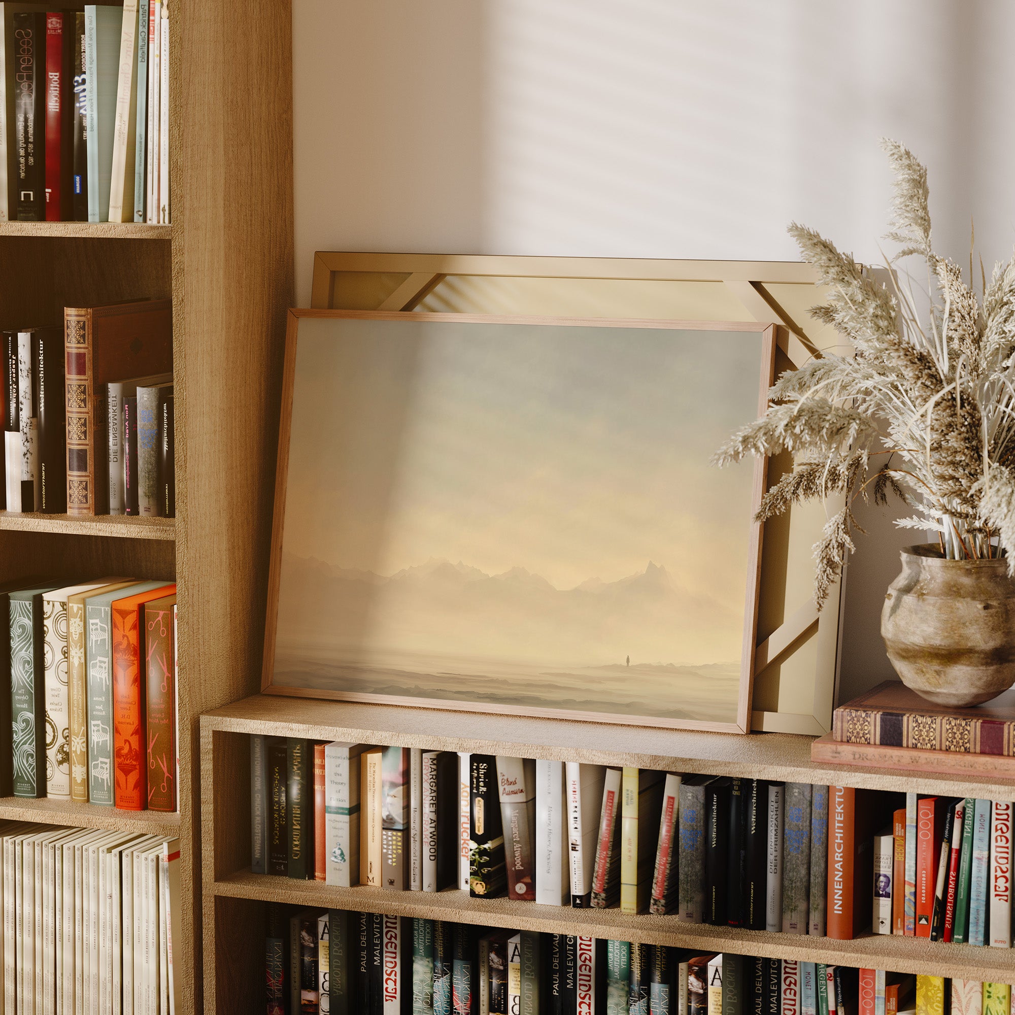 Golden light bathes the horizon where mountains meet mist, inviting contemplation of journeys not yet taken. The delicate seascape, with its solitary sailboat adrift in hazy waters, captures that fleeting moment when day surrenders to dusk. Framed in warm wood and nestled among collected volumes, the painting creates a focal point of serene escape within the thoughtful library setting.