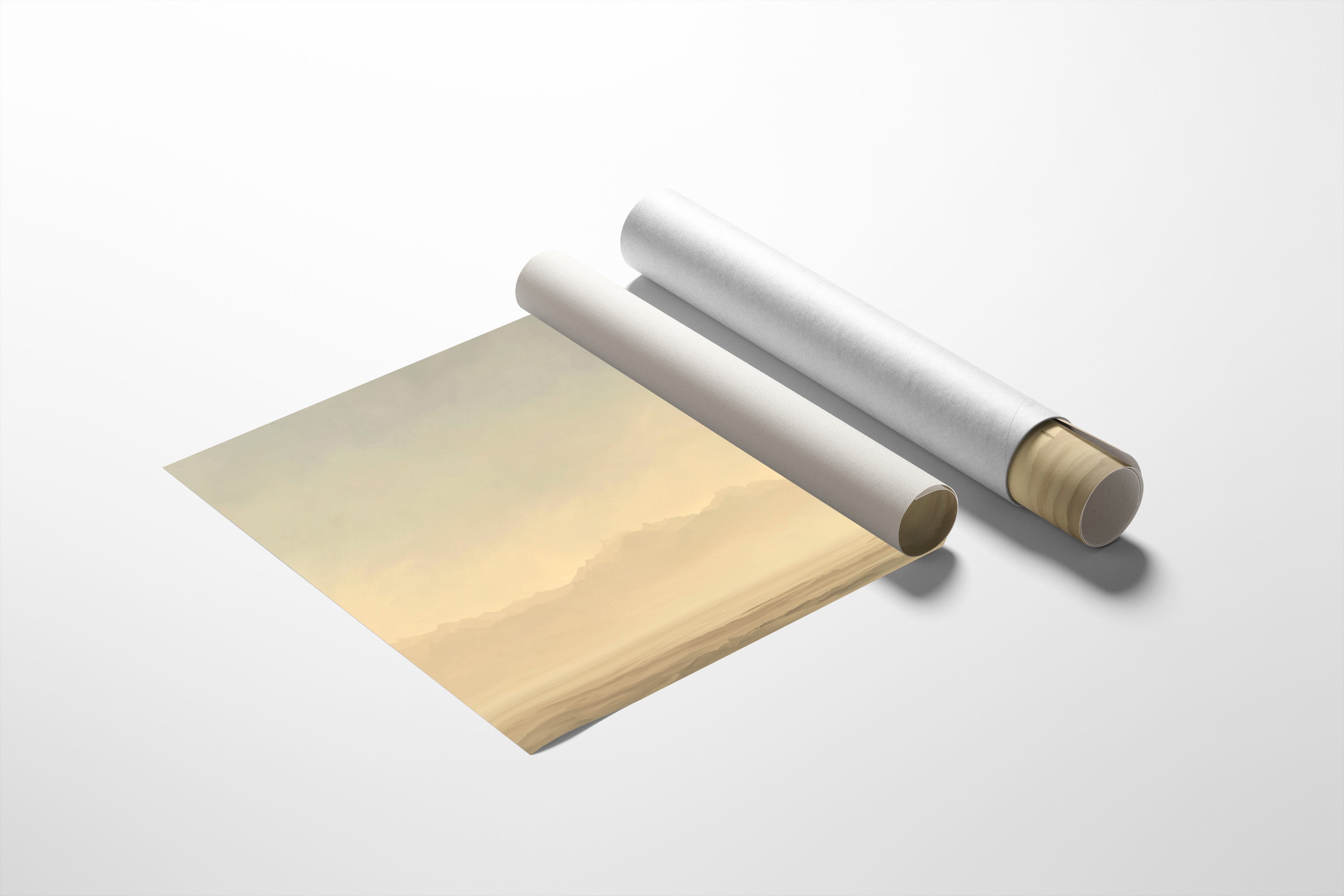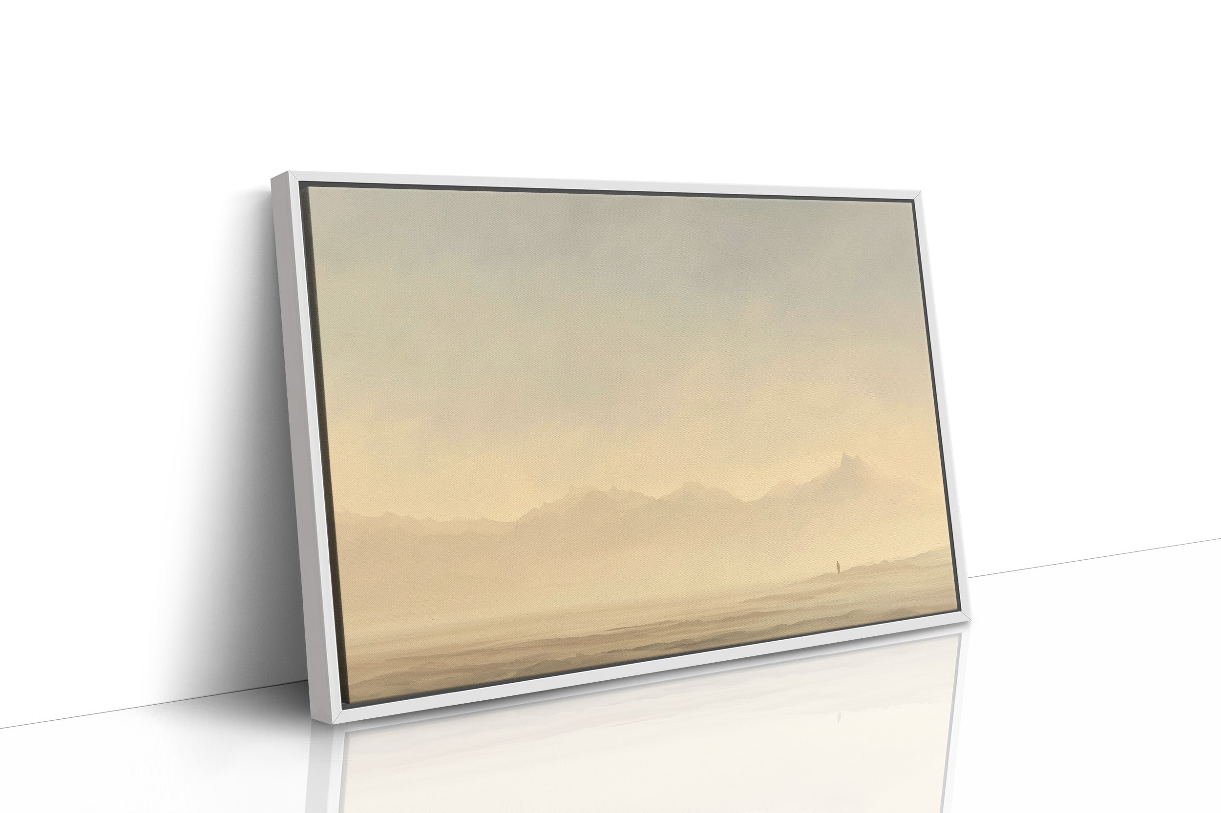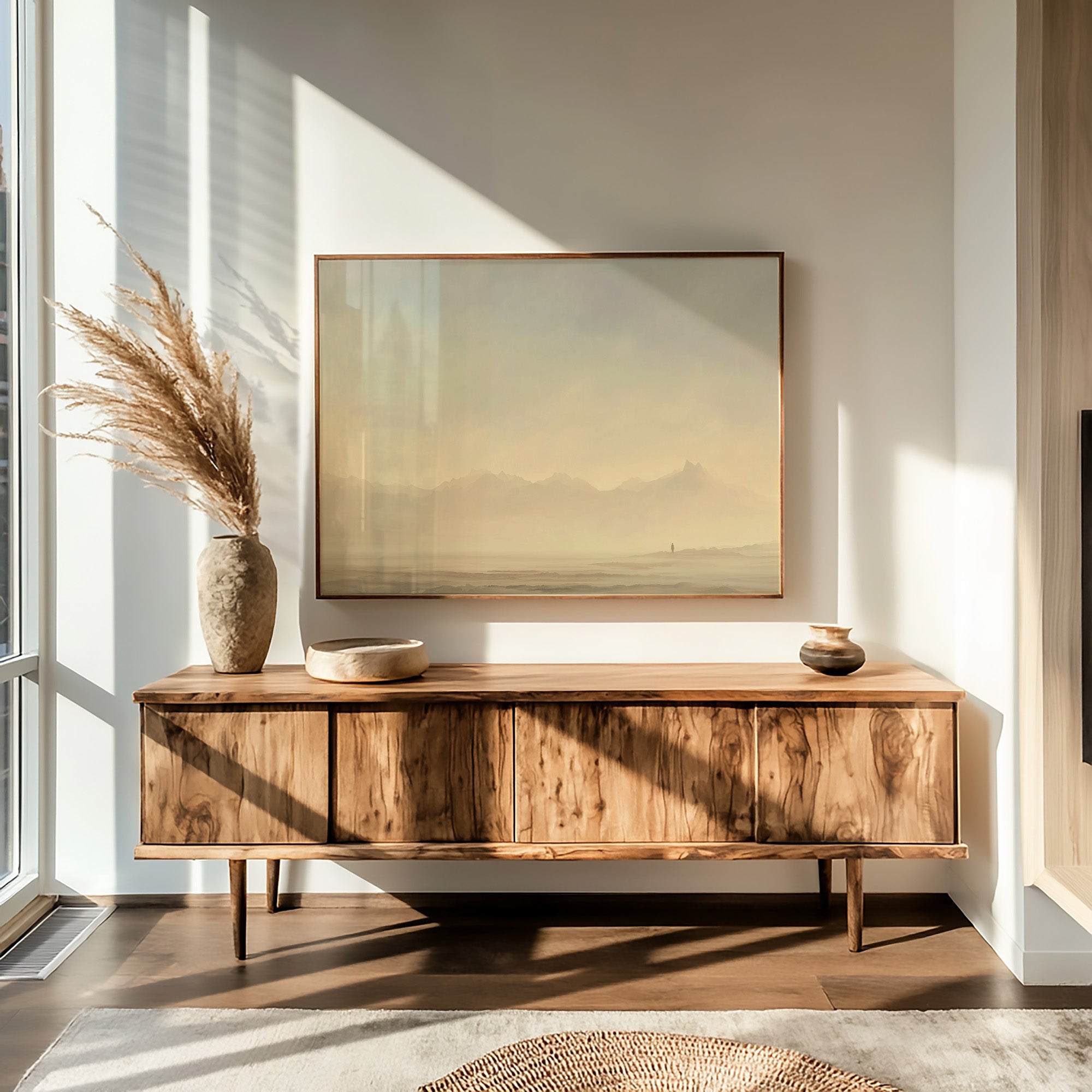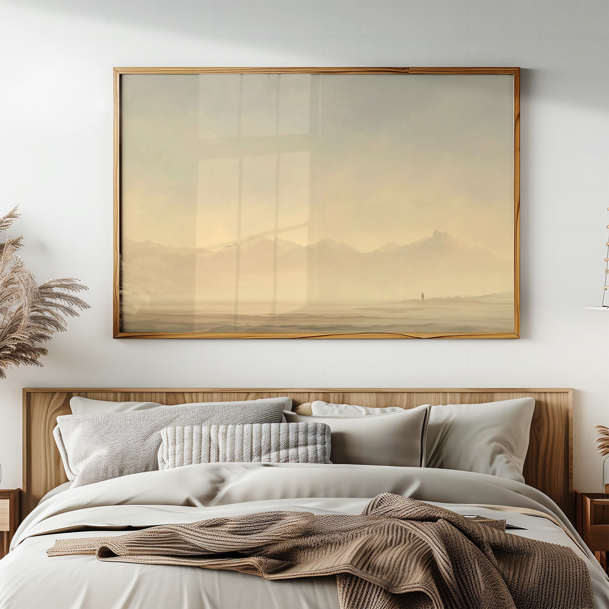 Golden light bathes the horizon where mountains meet mist, inviting contemplation of journeys not yet taken. The delicate seascape, with its solitary sailboat adrift in hazy waters, captures that fleeting moment when day surrenders to dusk. Framed in warm wood and nestled among collected volumes, the painting creates a focal point of serene escape within the thoughtful library setting.