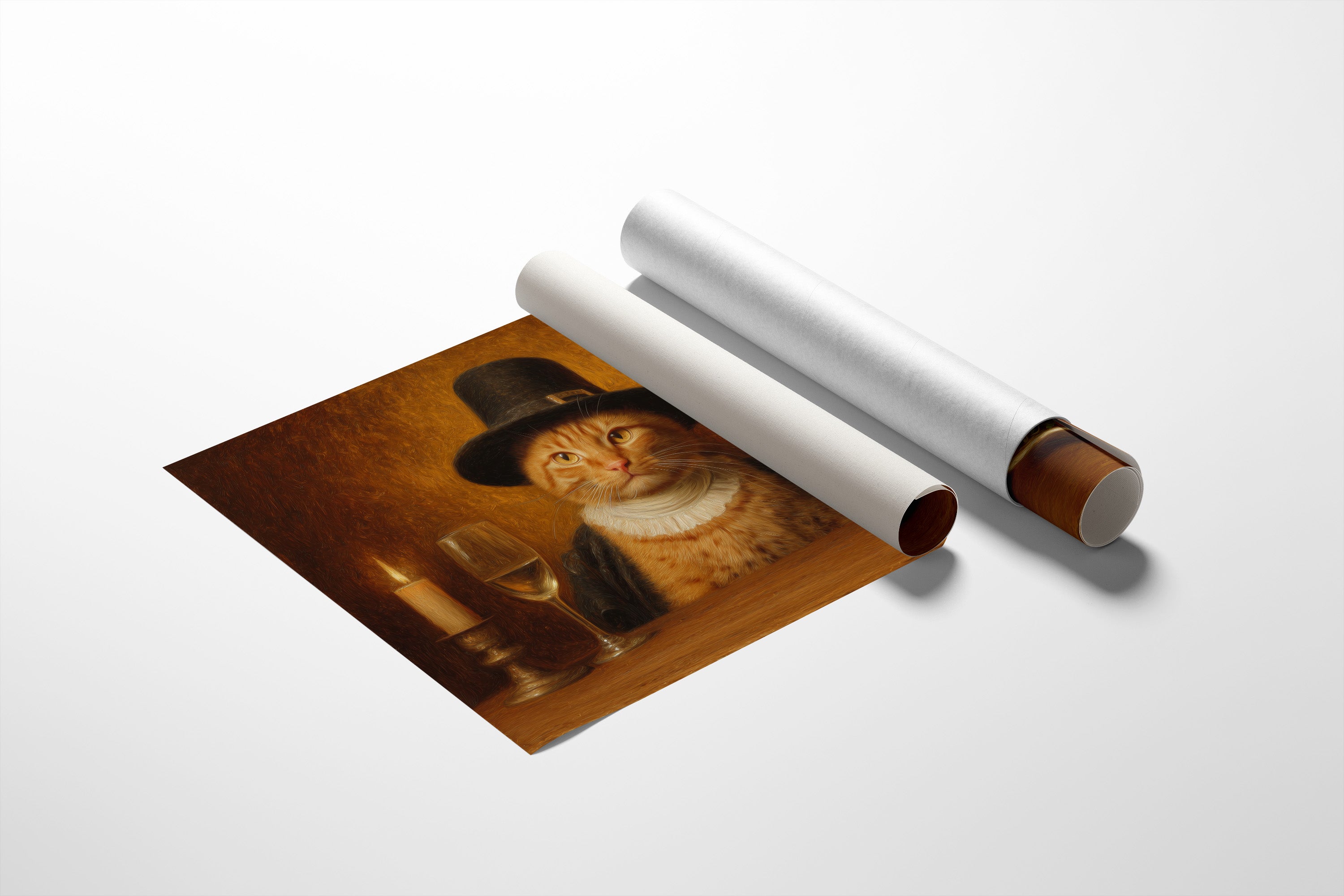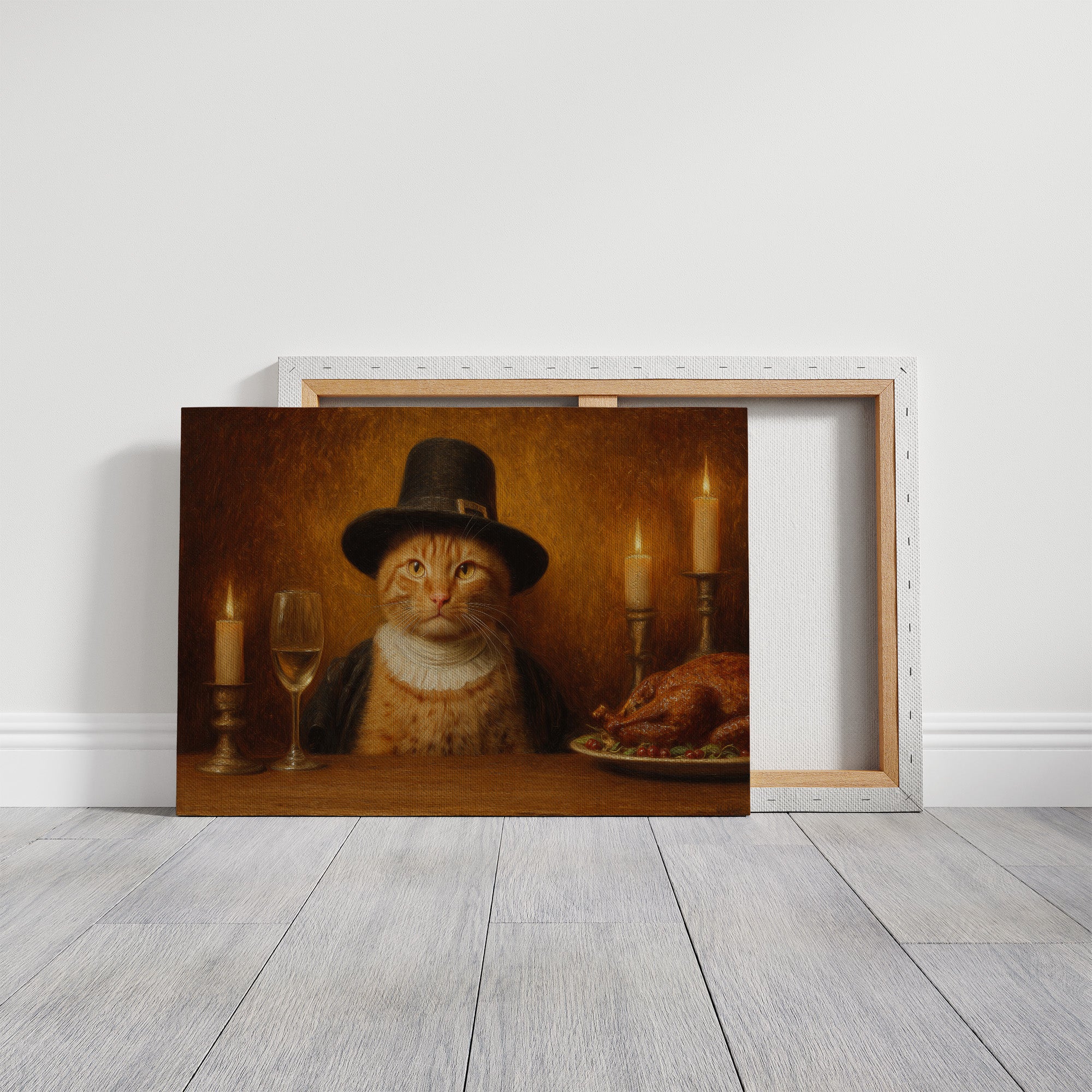 A whimsical artwork depicting an orange tabby cat dressed in Pilgrim attire, complete with a tall black hat and white collar. The cat sits regally at a wooden table against a warm amber background, illuminated by glowing candles. Beside the distinguished feline is a festive spread featuring a roasted turkey and a glass of wine, creating a humorous take on a traditional Thanksgiving dinner portrait. The painting style mimics classical portraiture with rich textures and dramatic lighting that highlights the cat's expressive golden eyes and whiskers.