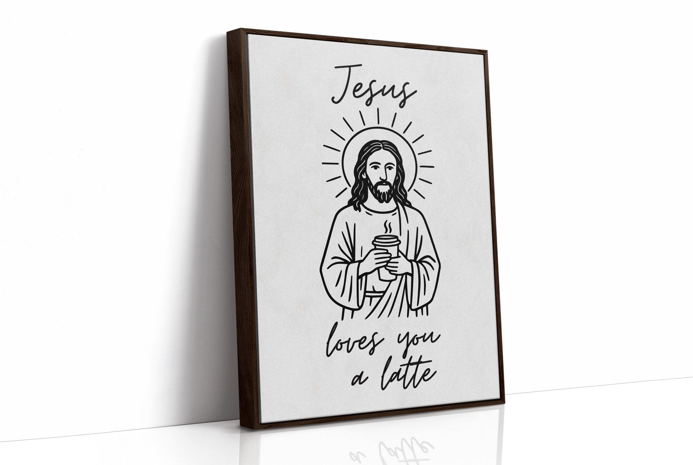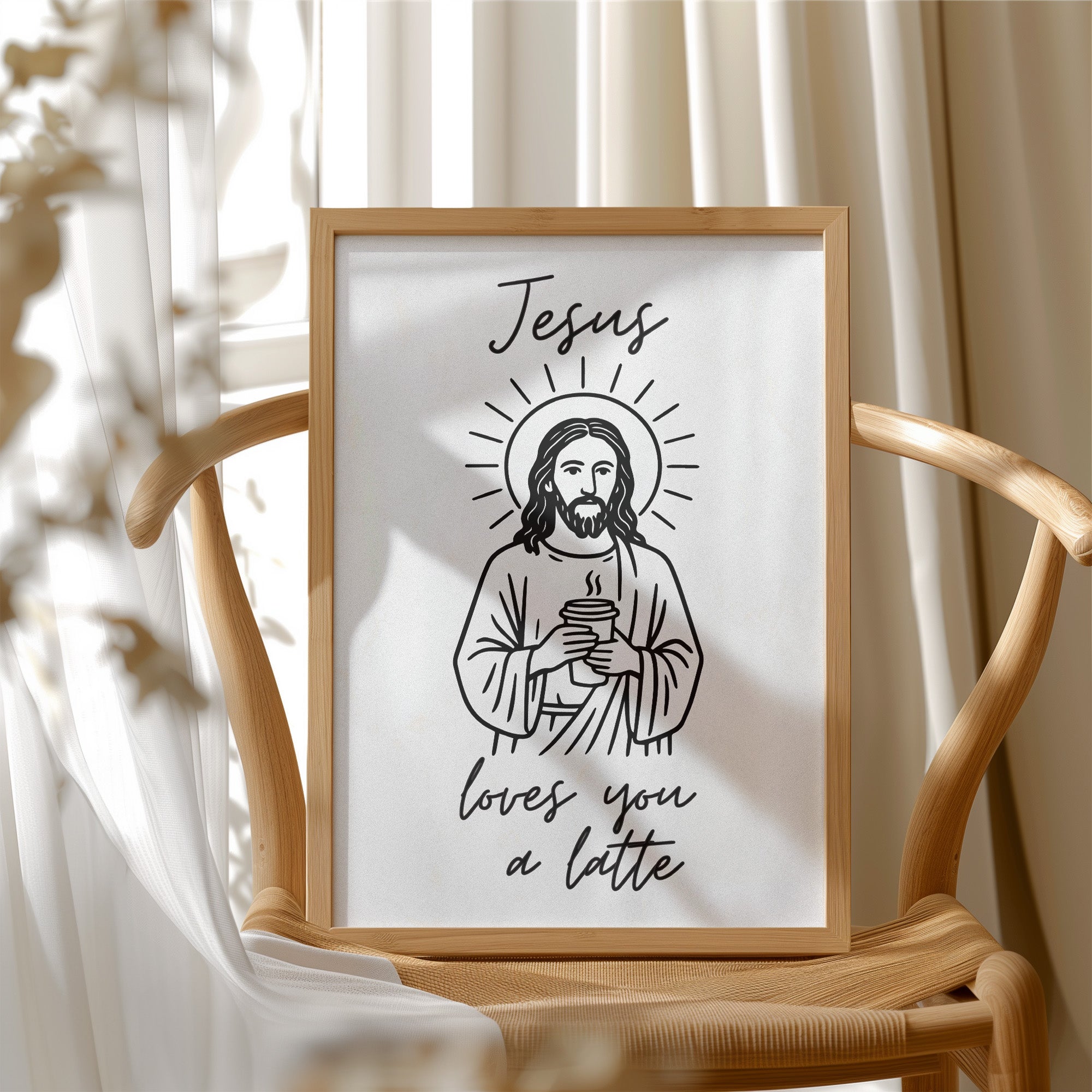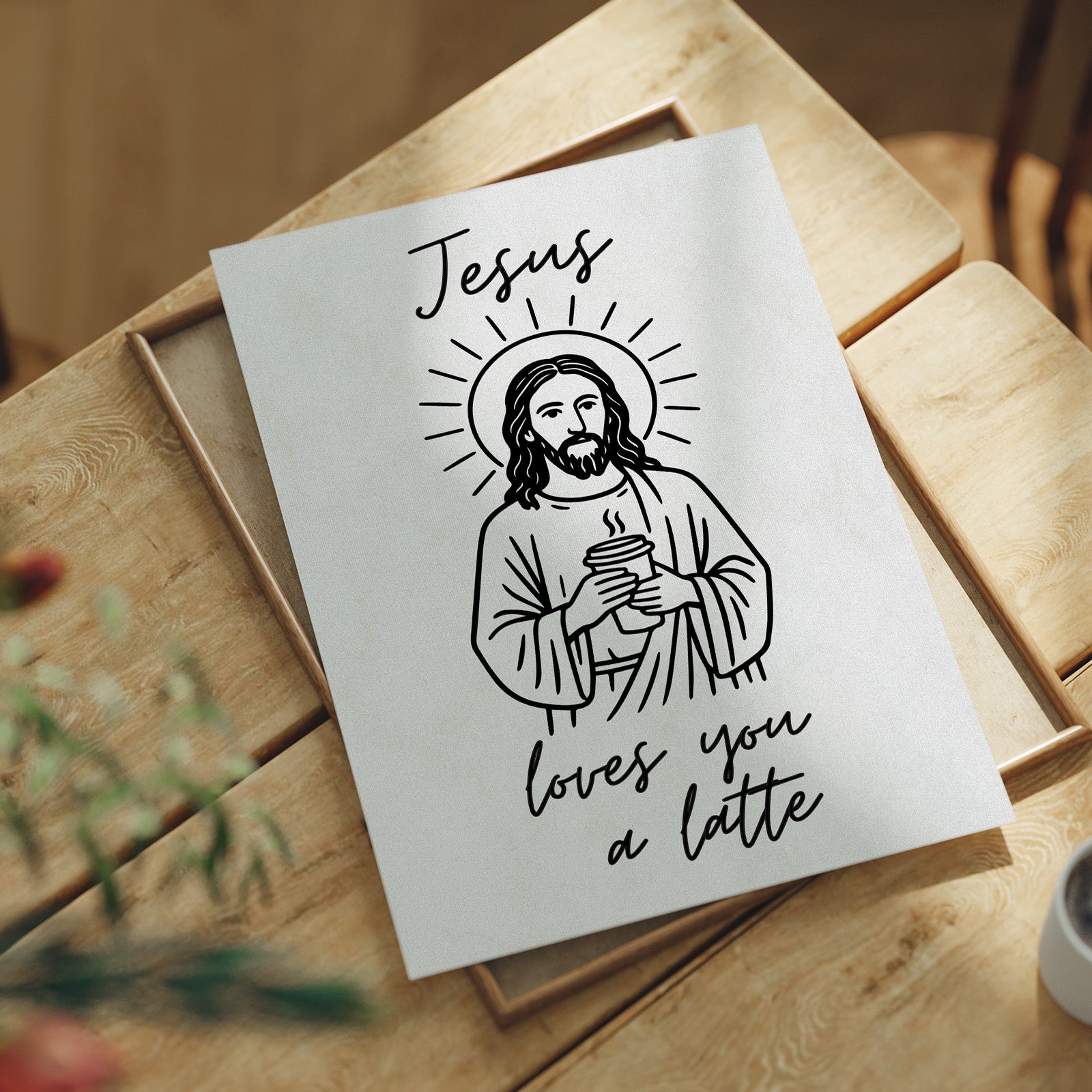 A playful illustration rests in warm morning light, bringing a lighthearted twist to faith with its clever coffee pun. The minimalist line drawing combines reverence and modern wit, all captured on crisp white paper against natural wooden tones. This contemporary piece creates a space where spirituality meets everyday life, inviting both reflection and a smile.