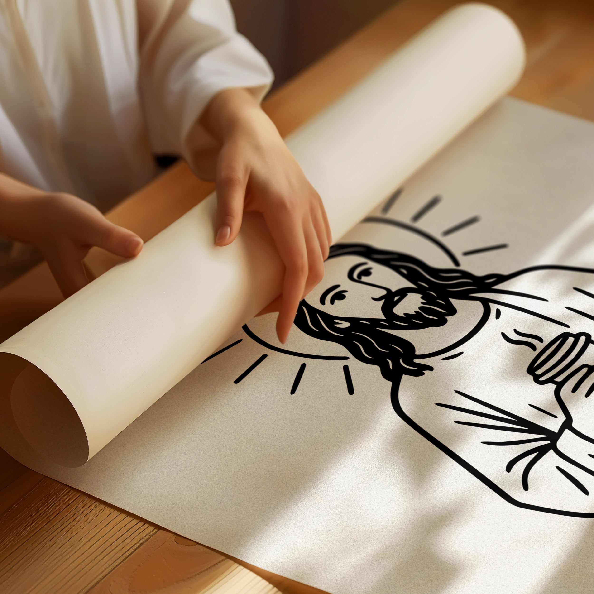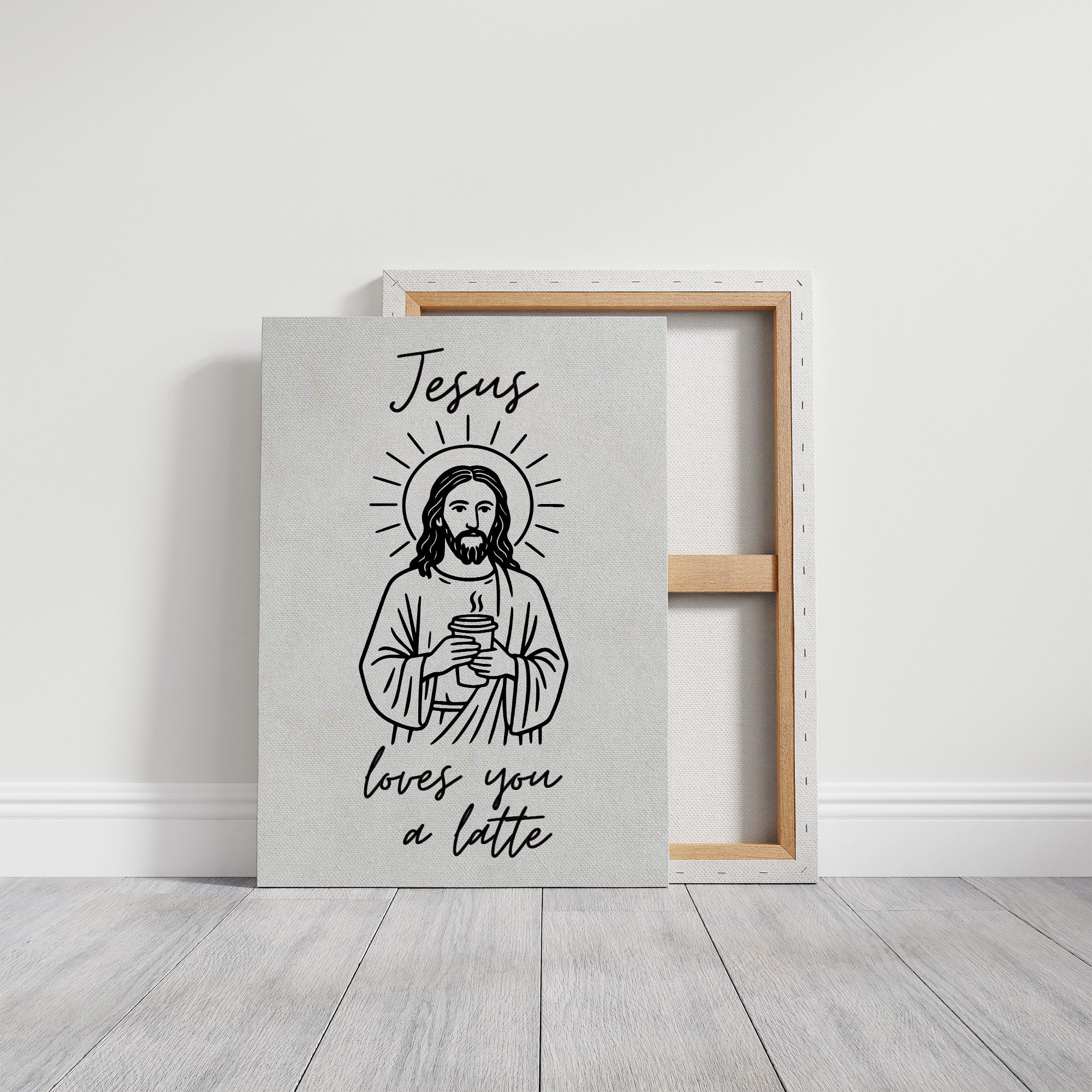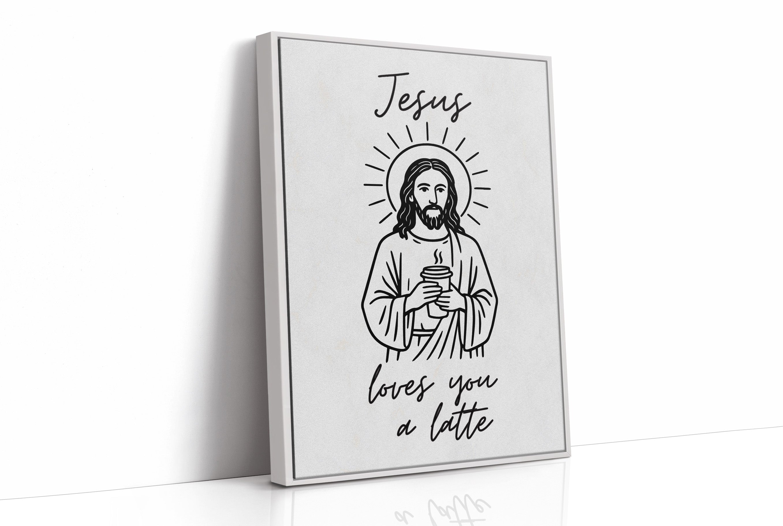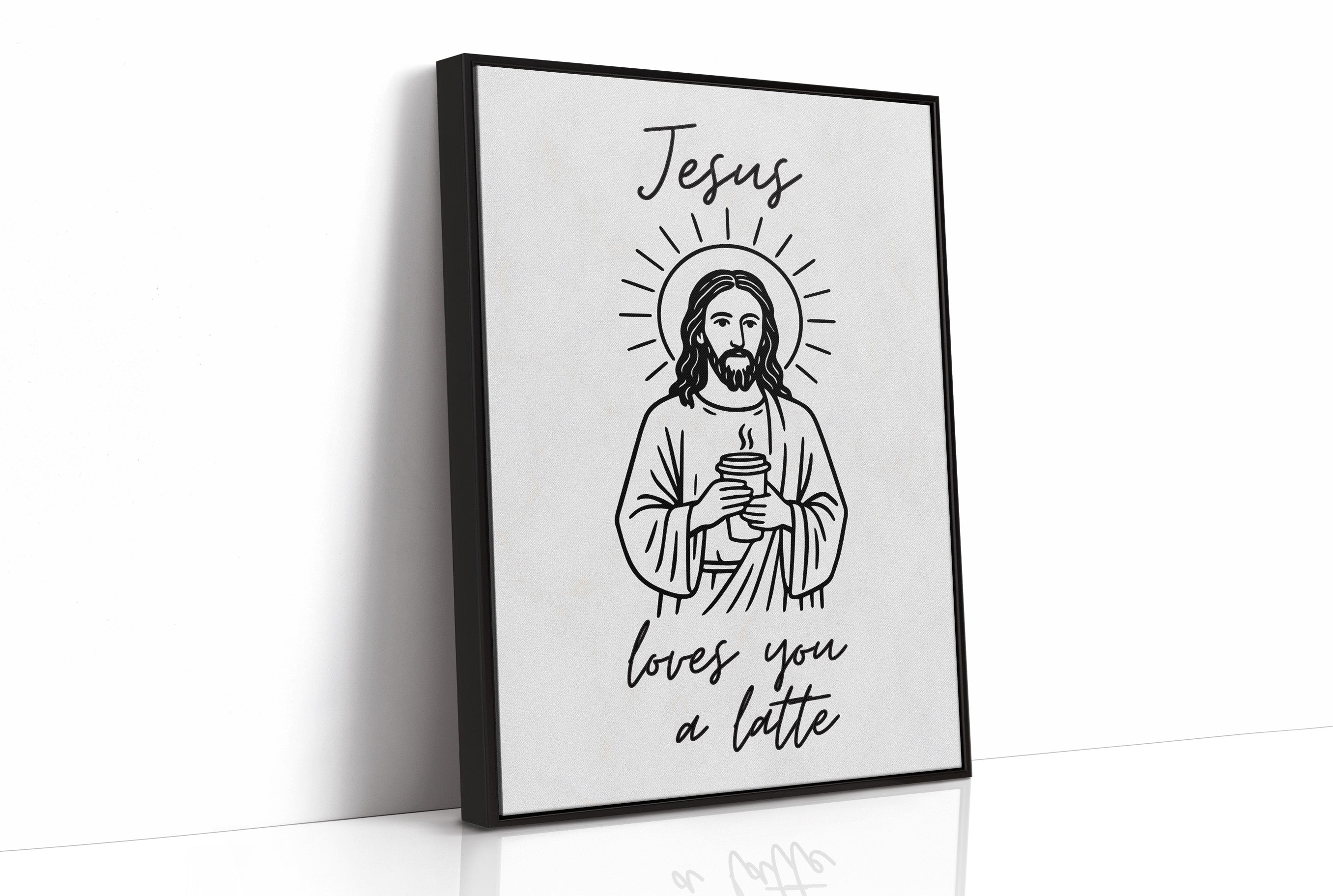 A playful illustration rests in warm morning light, bringing a lighthearted twist to faith with its clever coffee pun. The minimalist line drawing combines reverence and modern wit, all captured on crisp white paper against natural wooden tones. This contemporary piece creates a space where spirituality meets everyday life, inviting both reflection and a smile.