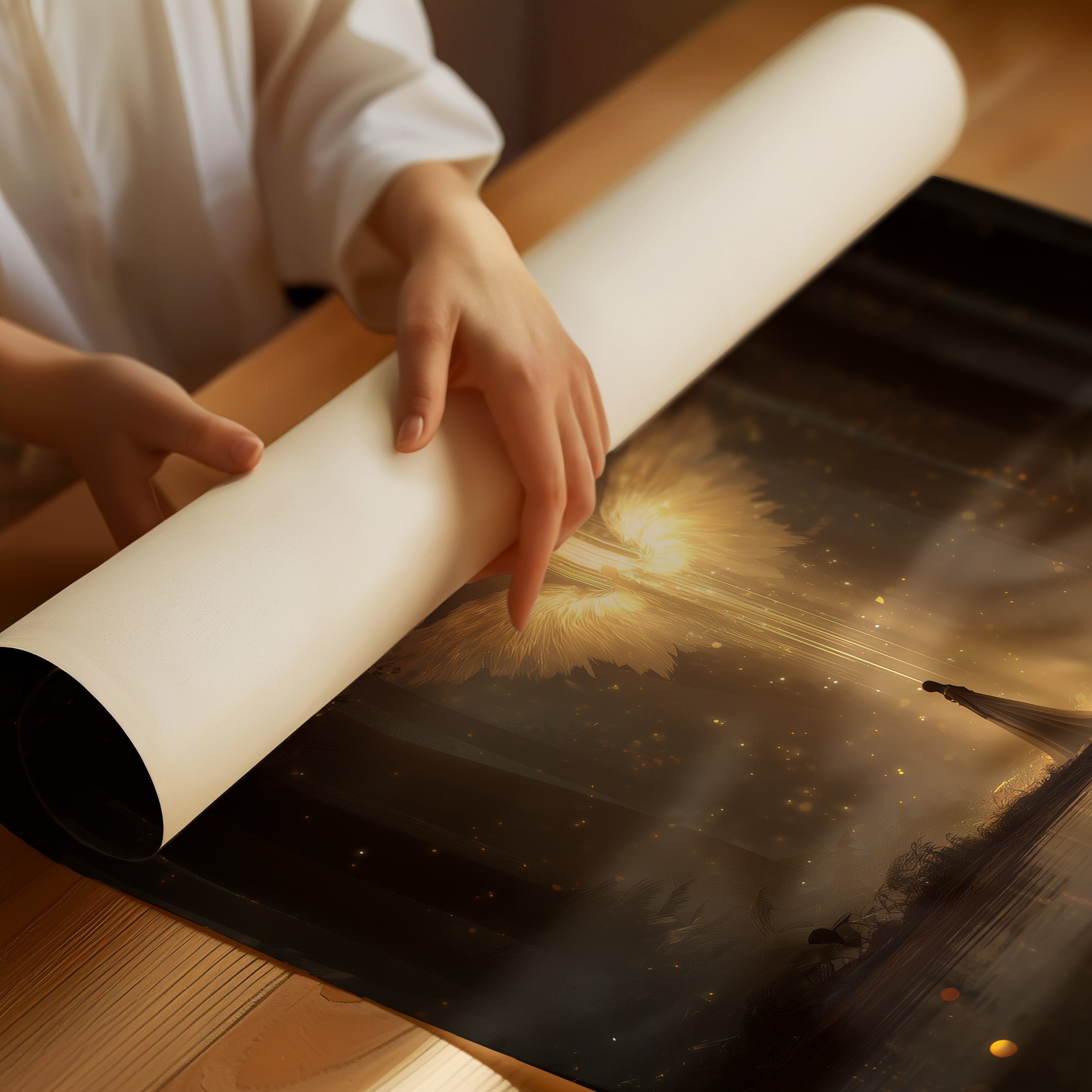 A solitary figure stands transfixed as golden light cascades from above, forming luminous wings that hover between heaven and earth. The ethereal glow cuts through the darkness, creating a sacred moment where divinity touches the mortal world. Reflections shimmer across still waters, doubling the transcendent vision while particles of light dance like suspended stars in the forest air. This piece transforms any space into a sanctuary of contemplation and spiritual depth.