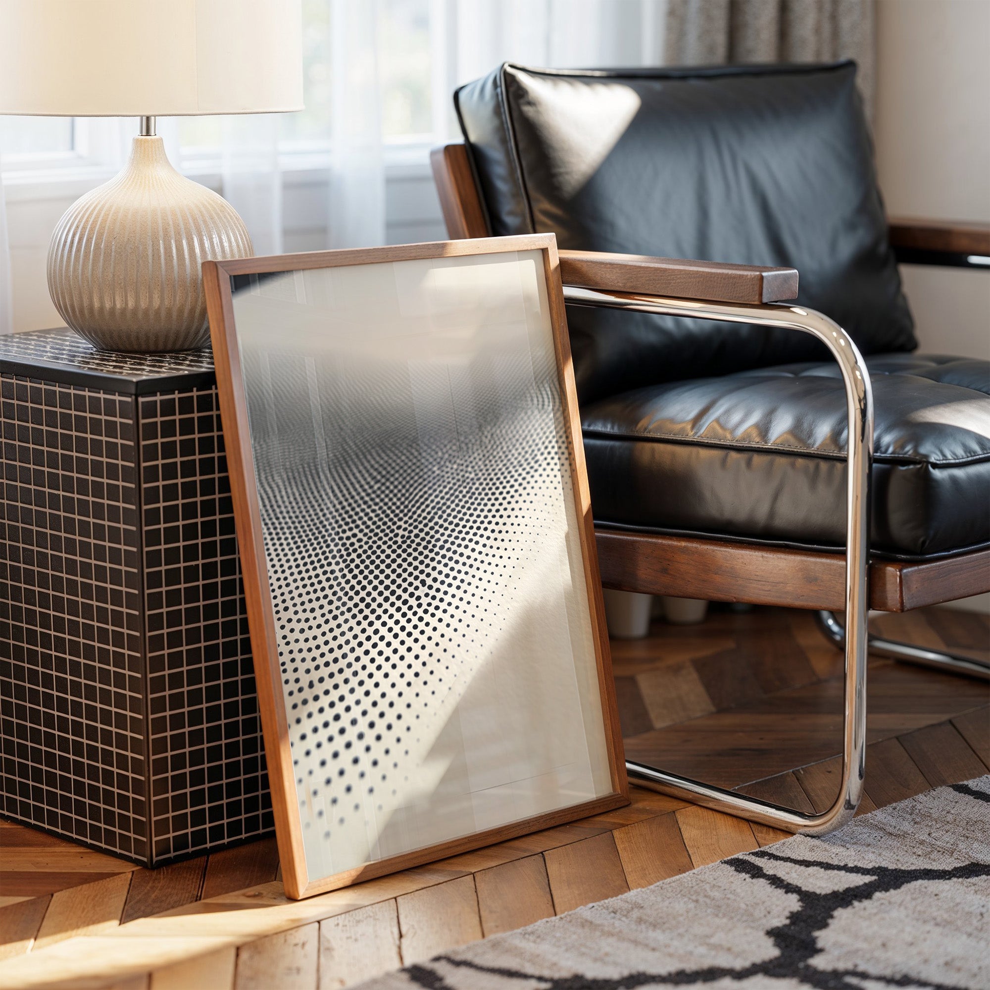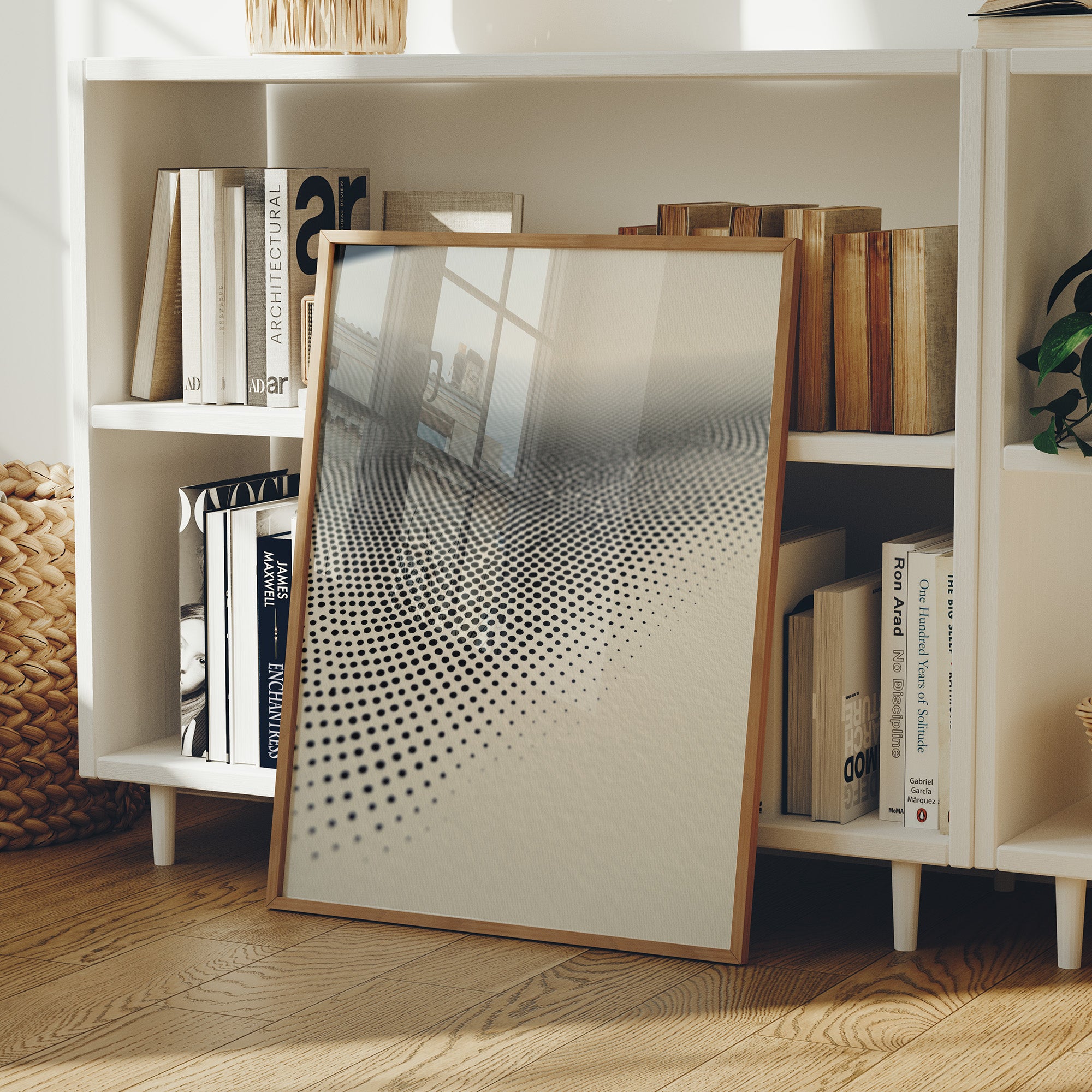 A mesmerizing gradient of black dots cascades across a pristine white canvas, creating an illusion of depth and movement. The precise pattern flows like a digital rain, each point carefully placed to create a hypnotic rhythm that draws the eye into its geometric poetry. Set against the clean lines of a modern interior, the piece brings sophisticated dynamism while maintaining harmony with the surrounding minimal aesthetic.