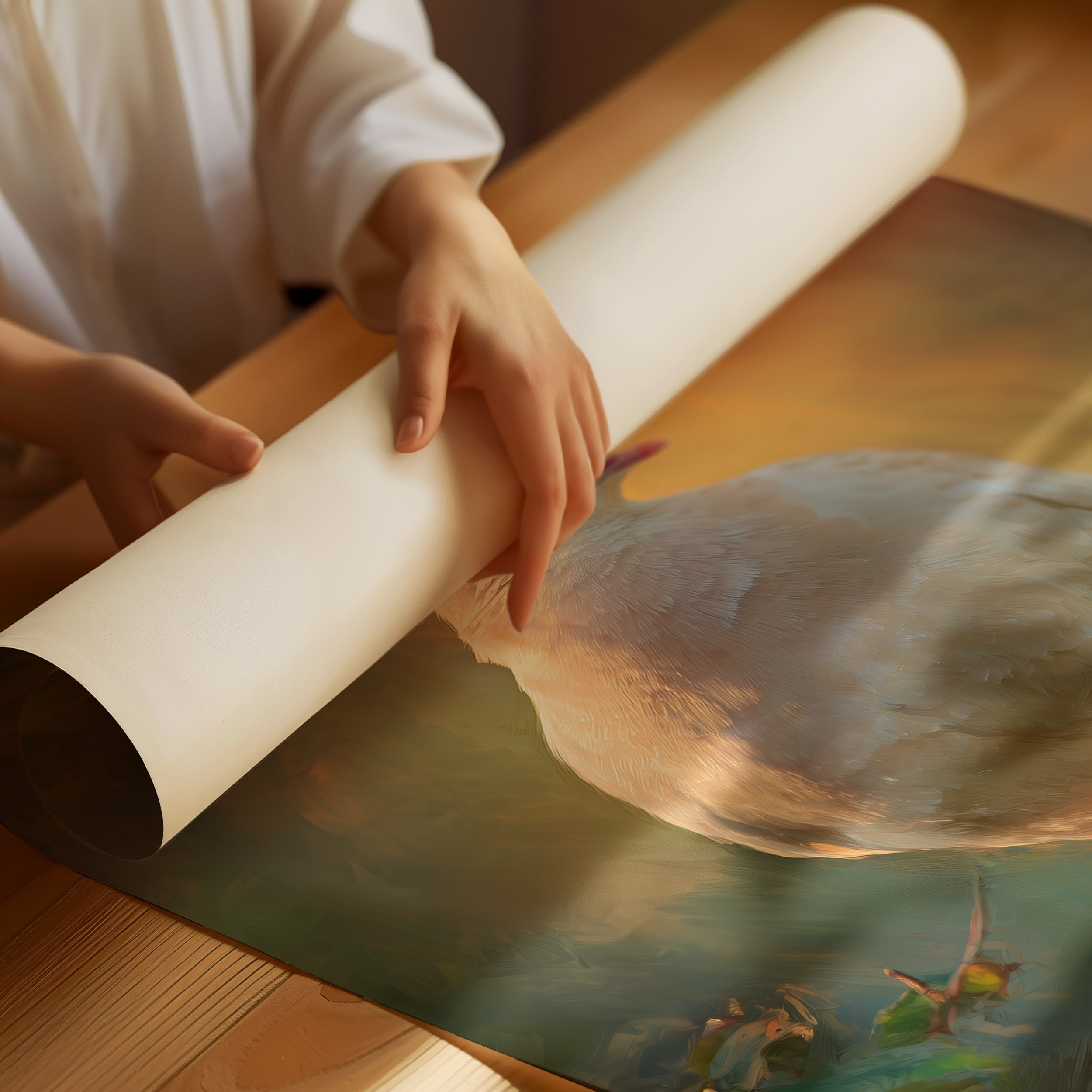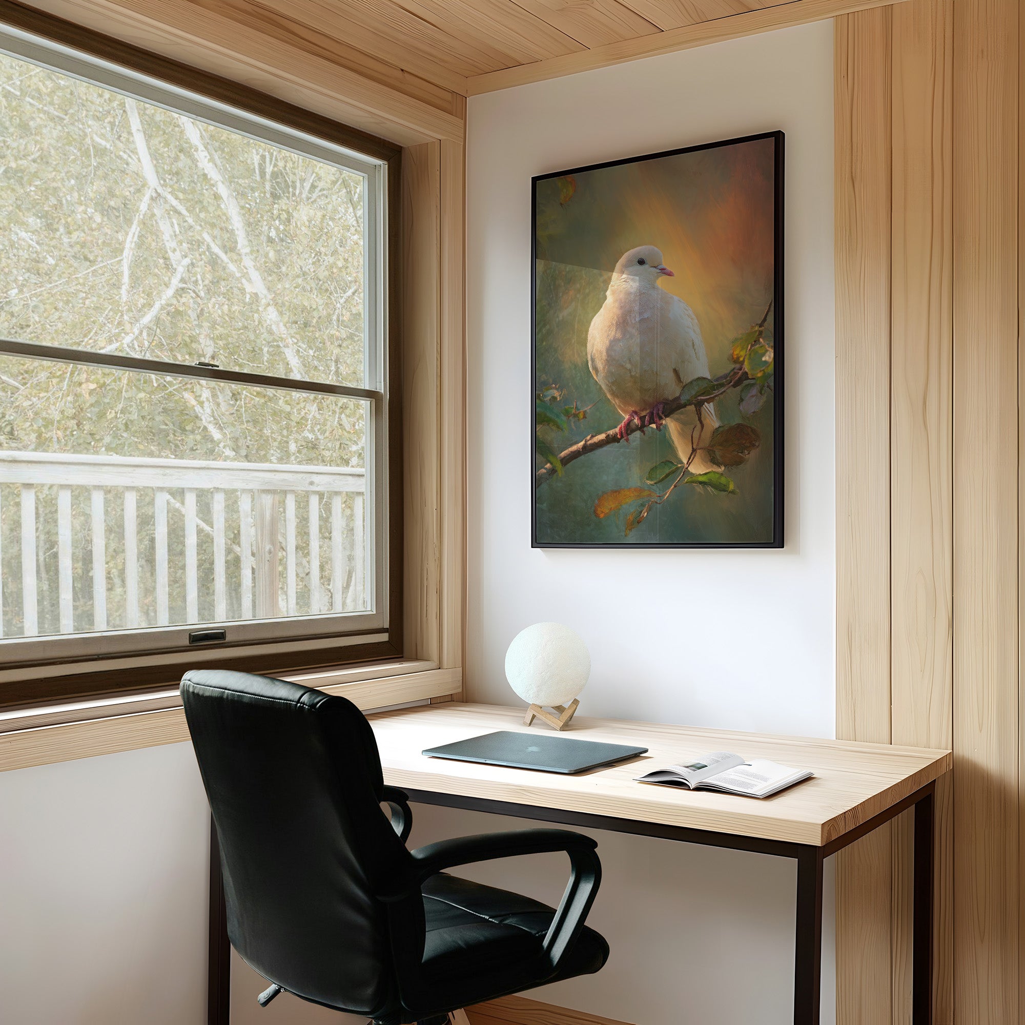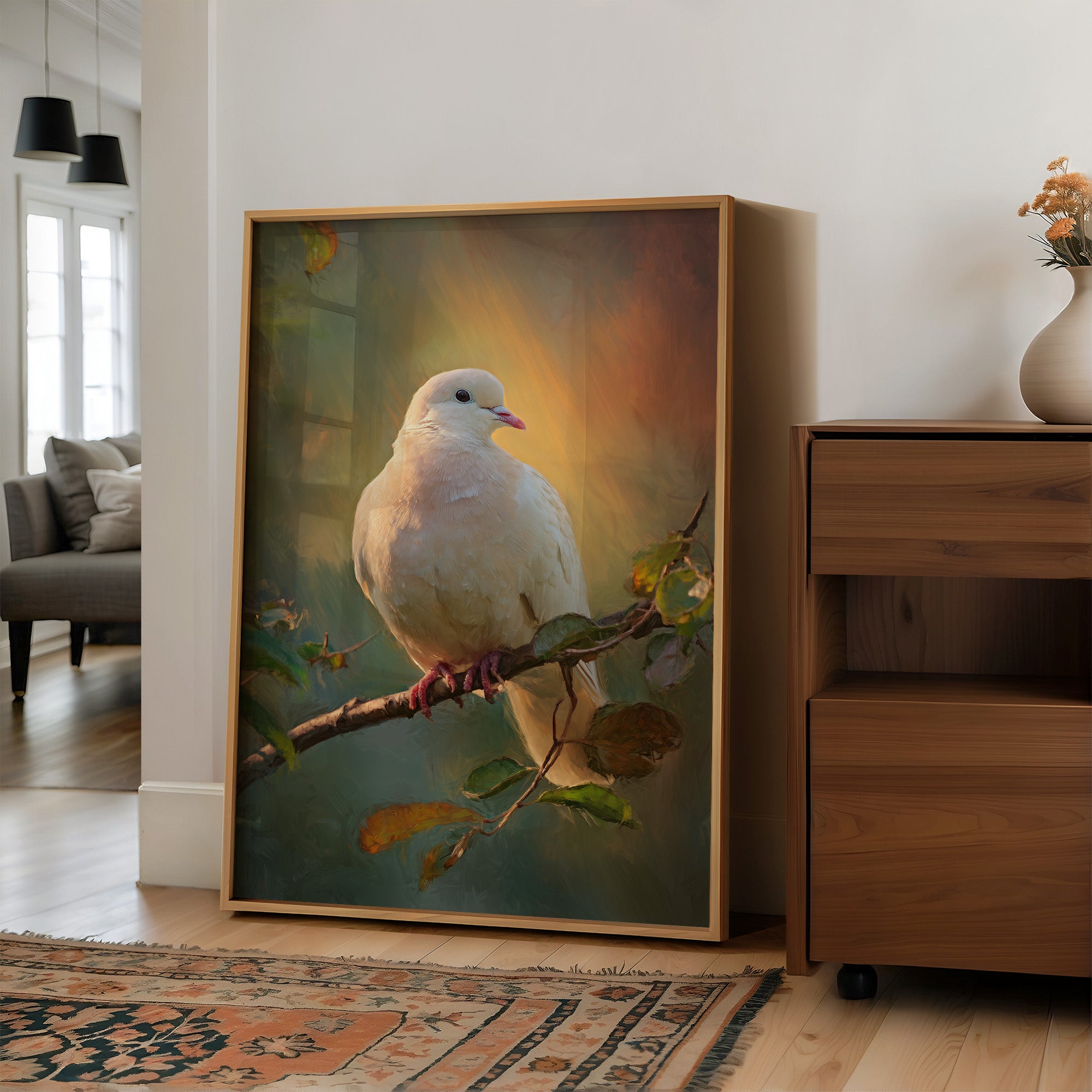 A serene white dove rests on a delicate branch, bathed in the warm glow of afternoon light. The luminous background creates a halo effect, highlighting the bird's pure white feathers against the soft greens and ambers of autumn foliage. The painting captures that fleeting moment of perfect stillness, where time seems suspended between the rustling of leaves and the gentle breathing of the natural world. This peaceful portrait would bring a sense of tranquility to reading nooks or meditation spaces, inviting moments of reflection amid busy days.