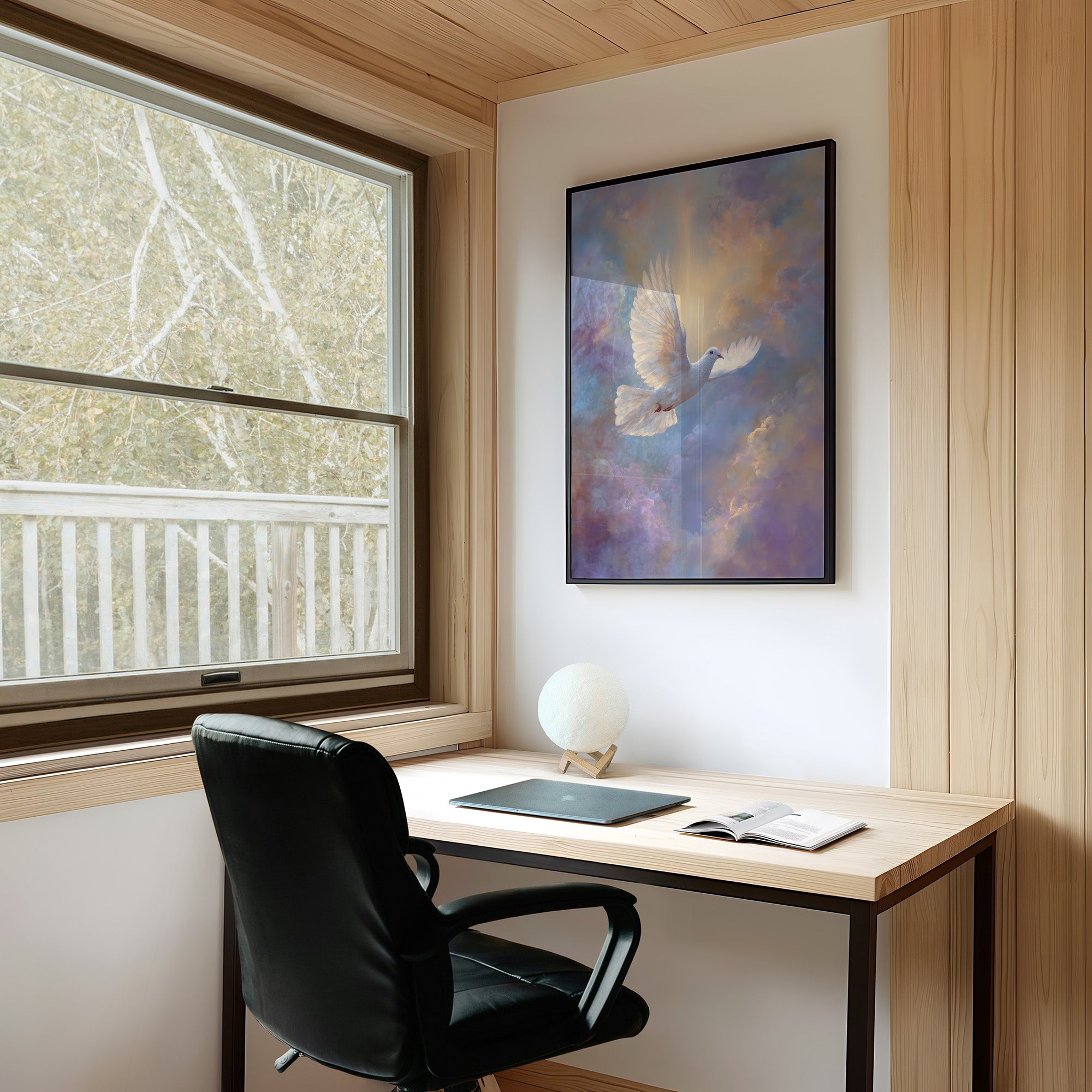 A single white dove ascends through a luminous sky, wings spread wide in a moment of perfect grace. The ethereal backdrop blends lavender, gold, and periwinkle clouds, creating a celestial atmosphere where divine light breaks through. The painting captures that transcendent space between earth and heaven, where hope takes flight and peace becomes tangible. This serene piece brings spiritual calm to meditation spaces, prayer corners, or any room where you seek tranquility and inspiration.