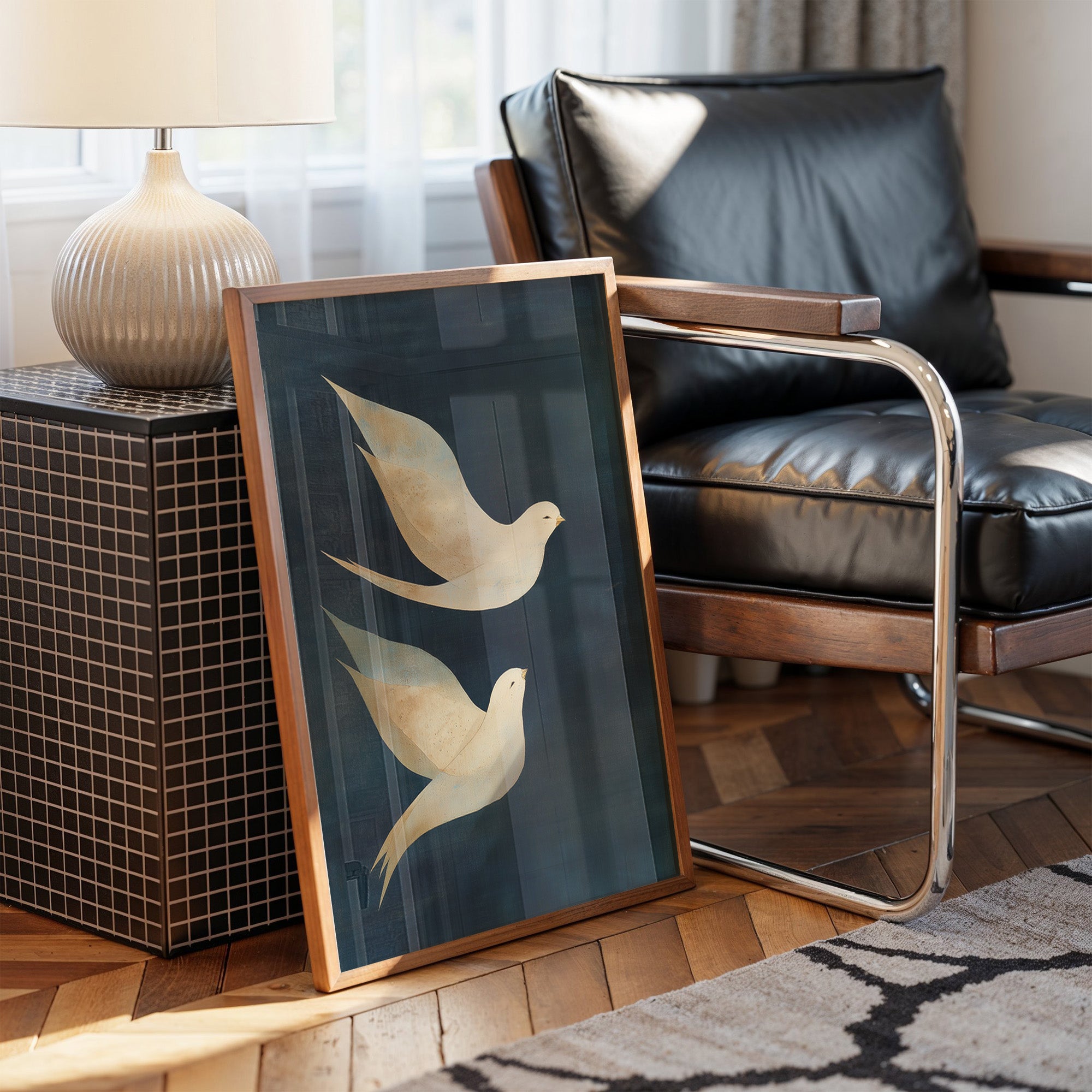 Soft golden light bathes a serene scene where two ethereal doves glide through a deep navy expanse. Their delicate forms, rendered in luminous cream and gold, create a graceful dance against the textured darkness. The minimalist composition speaks to freedom and connection, while the contrasting colors evoke both the mystery of night and the promise of dawn. This tranquil space breathes with modern sophistication, where a designer lamp casts gentle shadows across carefully curated books and verdant plants. Perfect for a reading nook, meditation space, or any room seeking a touch of peaceful elegance.