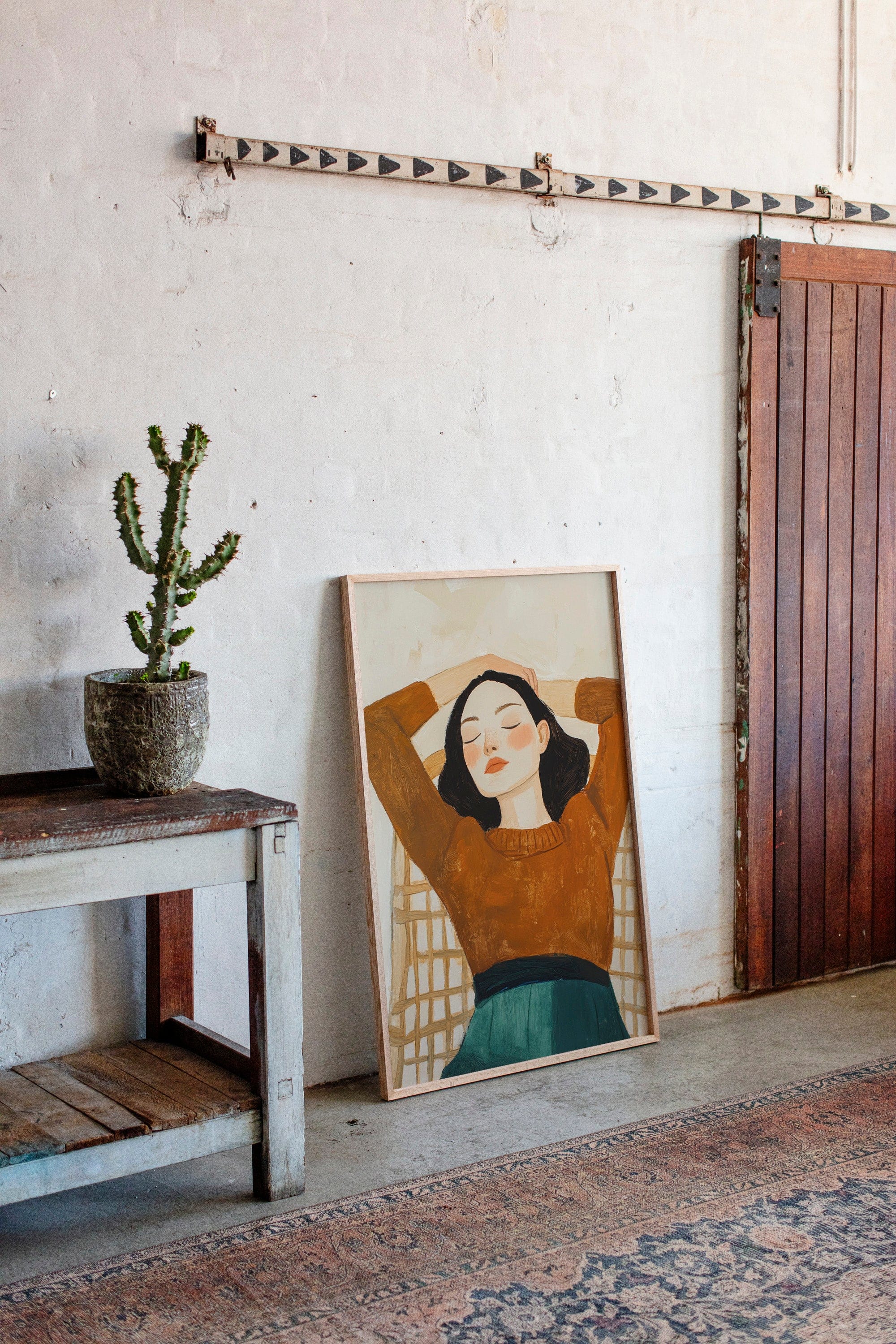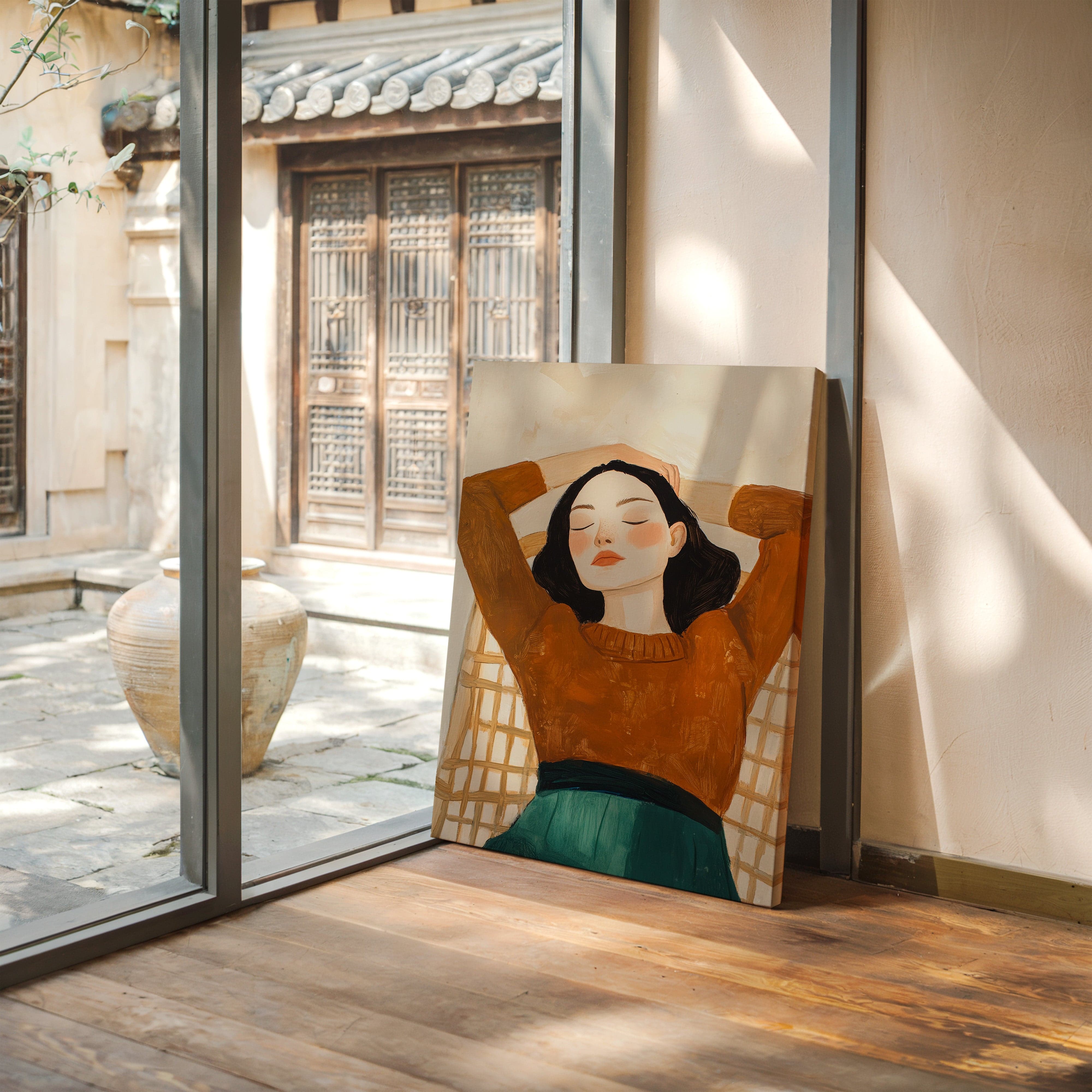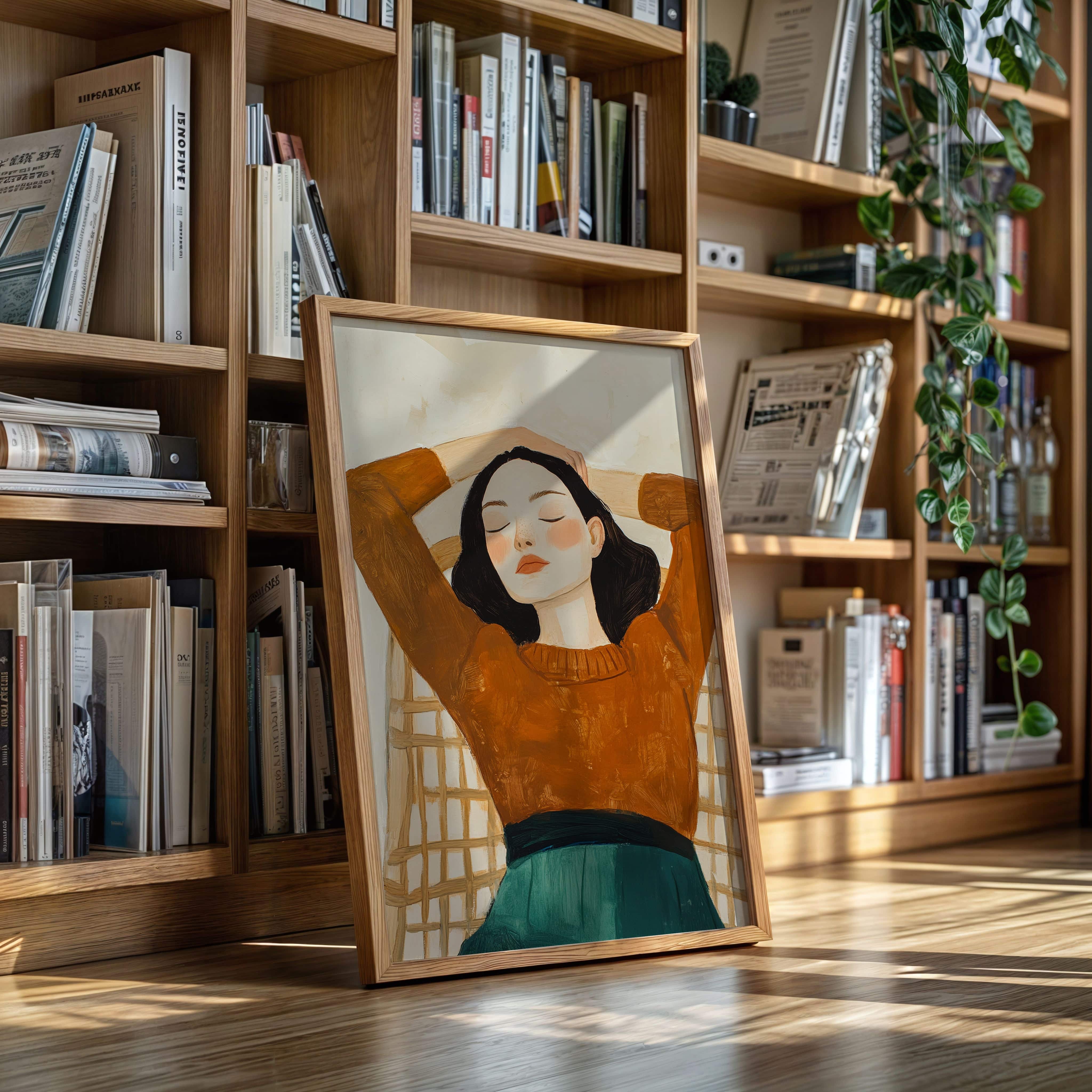A moment of pure contentment unfolds as afternoon light bathes the scene in honey-warm tones. The illustration captures serenity in its purest form - eyes closed in peaceful reflection, framed by flowing dark hair against a rustic backdrop. Rich burnt orange and deep teal create a harmonious dance of color, while delicate brush strokes bring texture and emotion to every element. This contemporary piece would bring a sense of calm sophistication to a reading nook, bedroom, or any space meant for quiet contemplation.