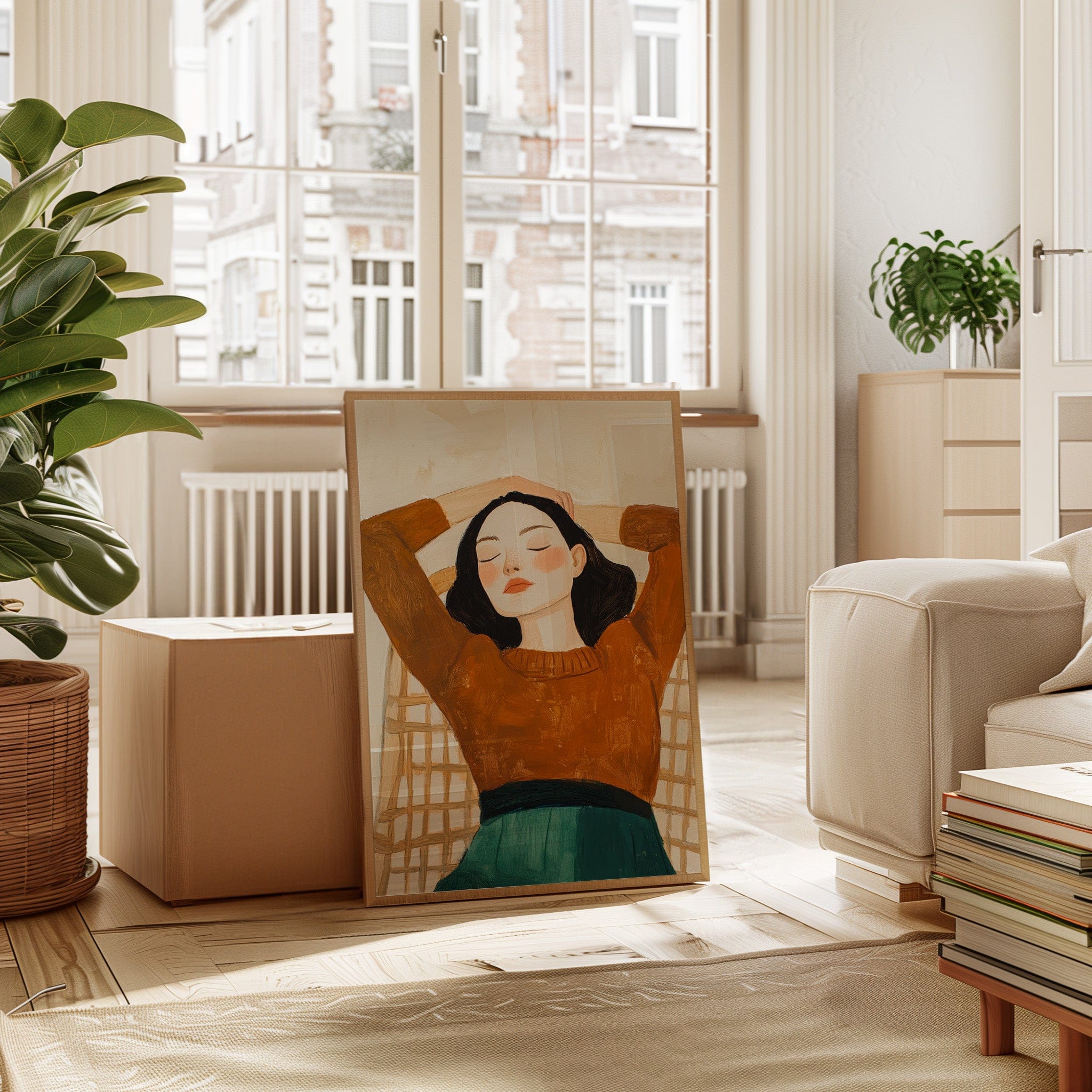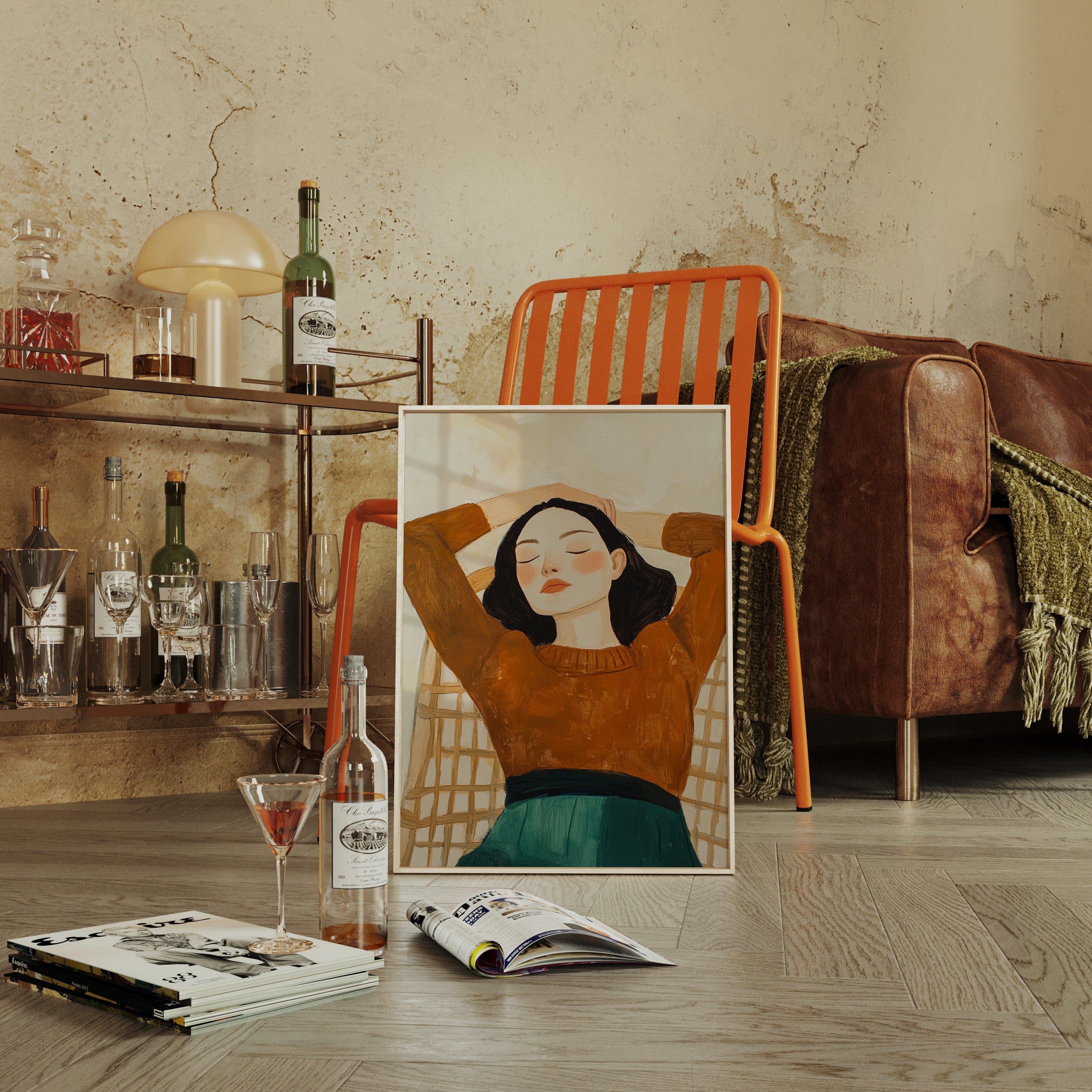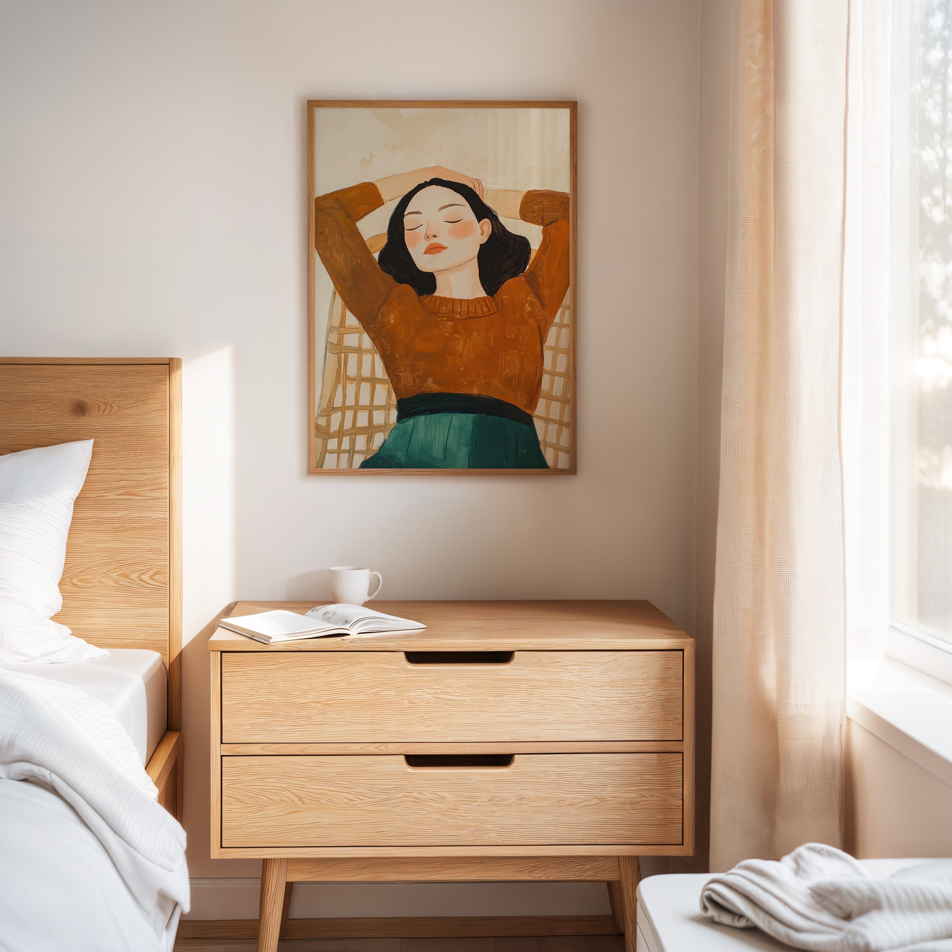 A moment of pure contentment unfolds as afternoon light bathes the scene in honey-warm tones. The illustration captures serenity in its purest form - eyes closed in peaceful reflection, framed by flowing dark hair against a rustic backdrop. Rich burnt orange and deep teal create a harmonious dance of color, while delicate brush strokes bring texture and emotion to every element. This contemporary piece would bring a sense of calm sophistication to a reading nook, bedroom, or any space meant for quiet contemplation.