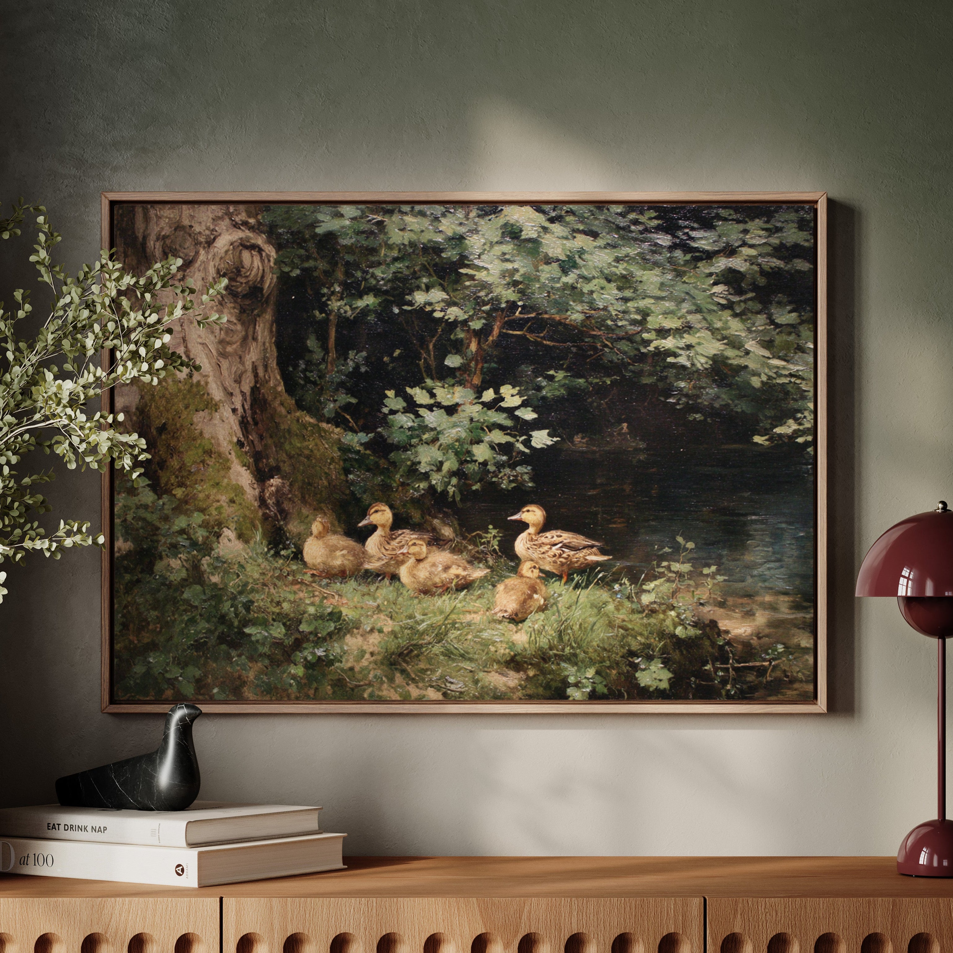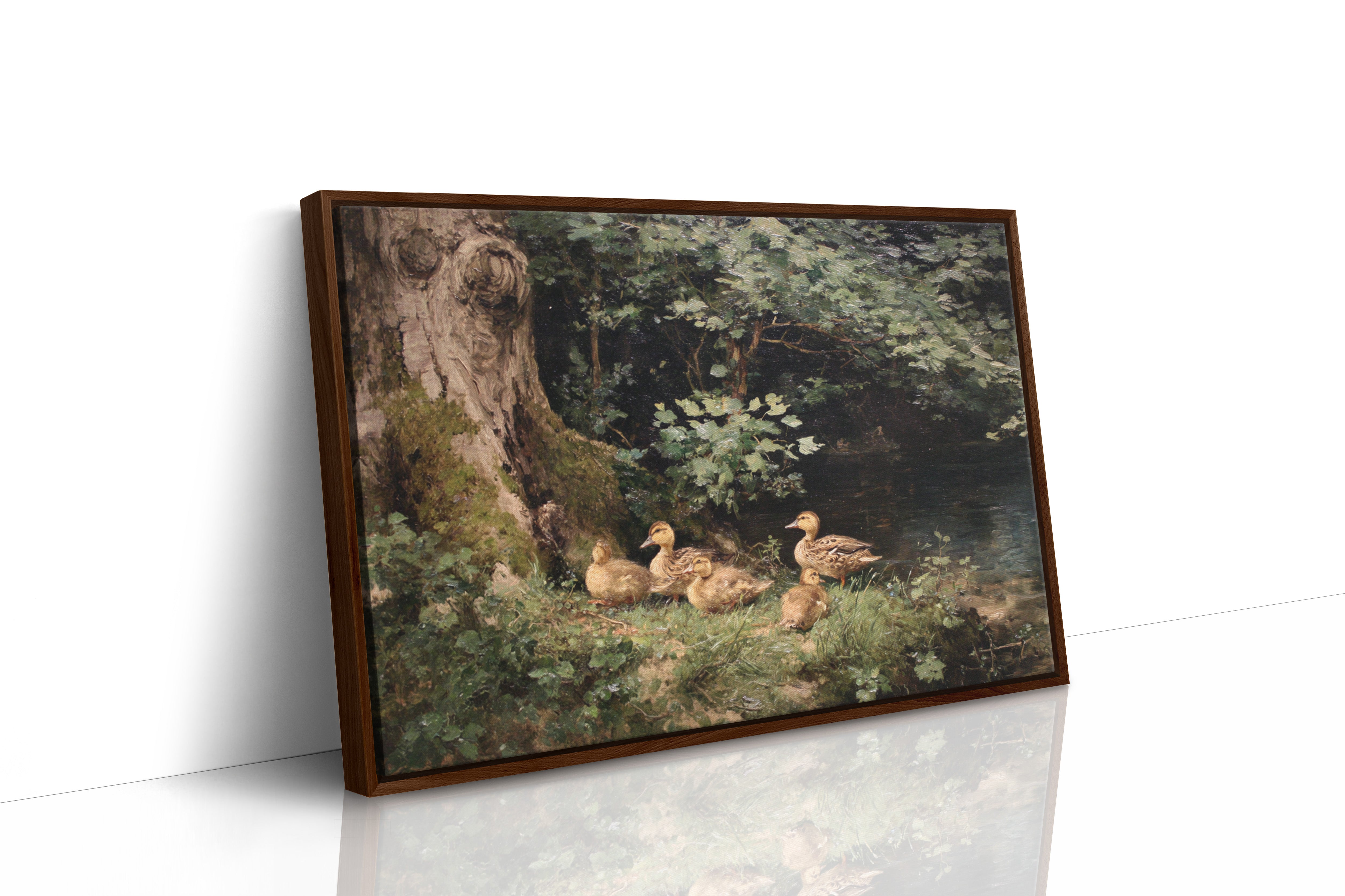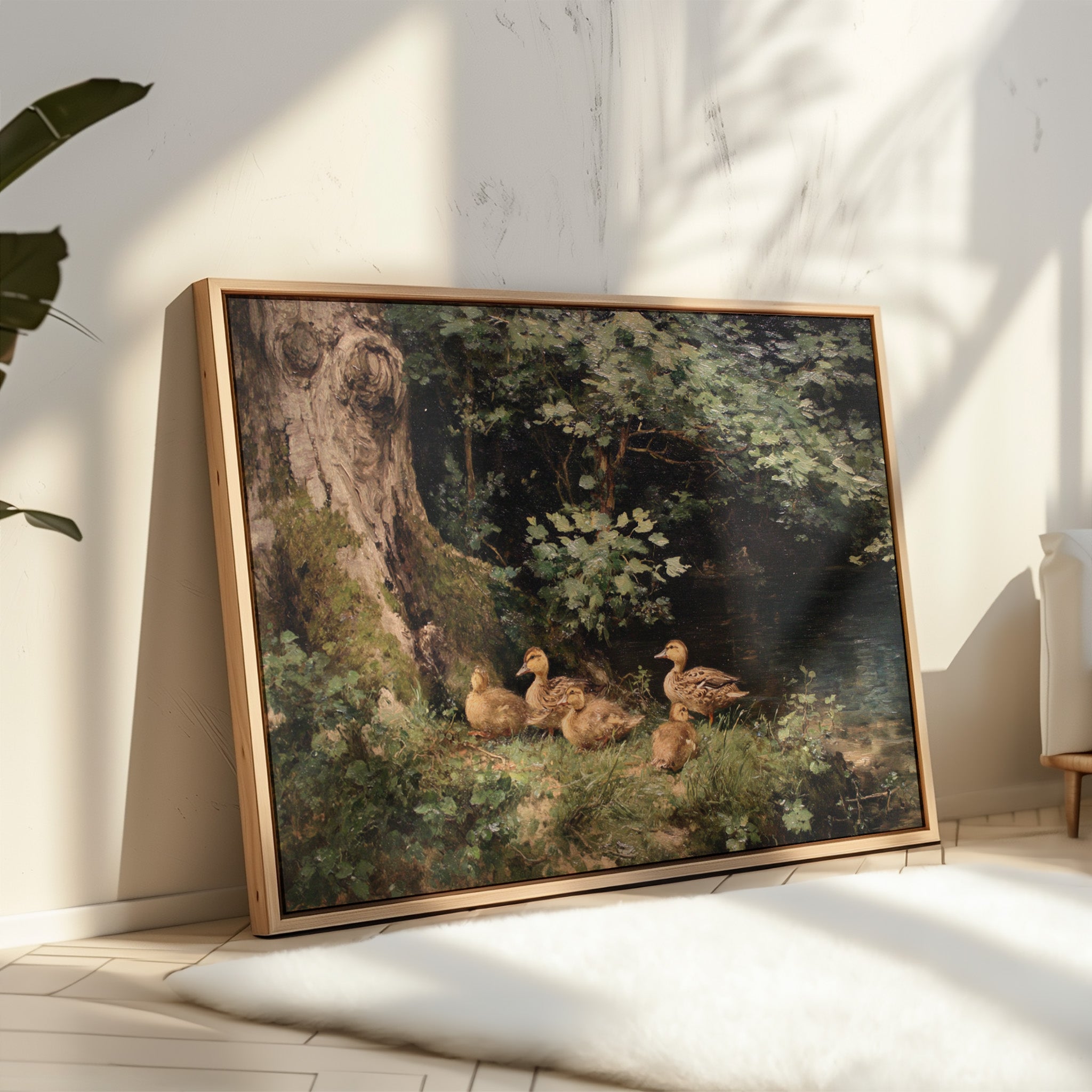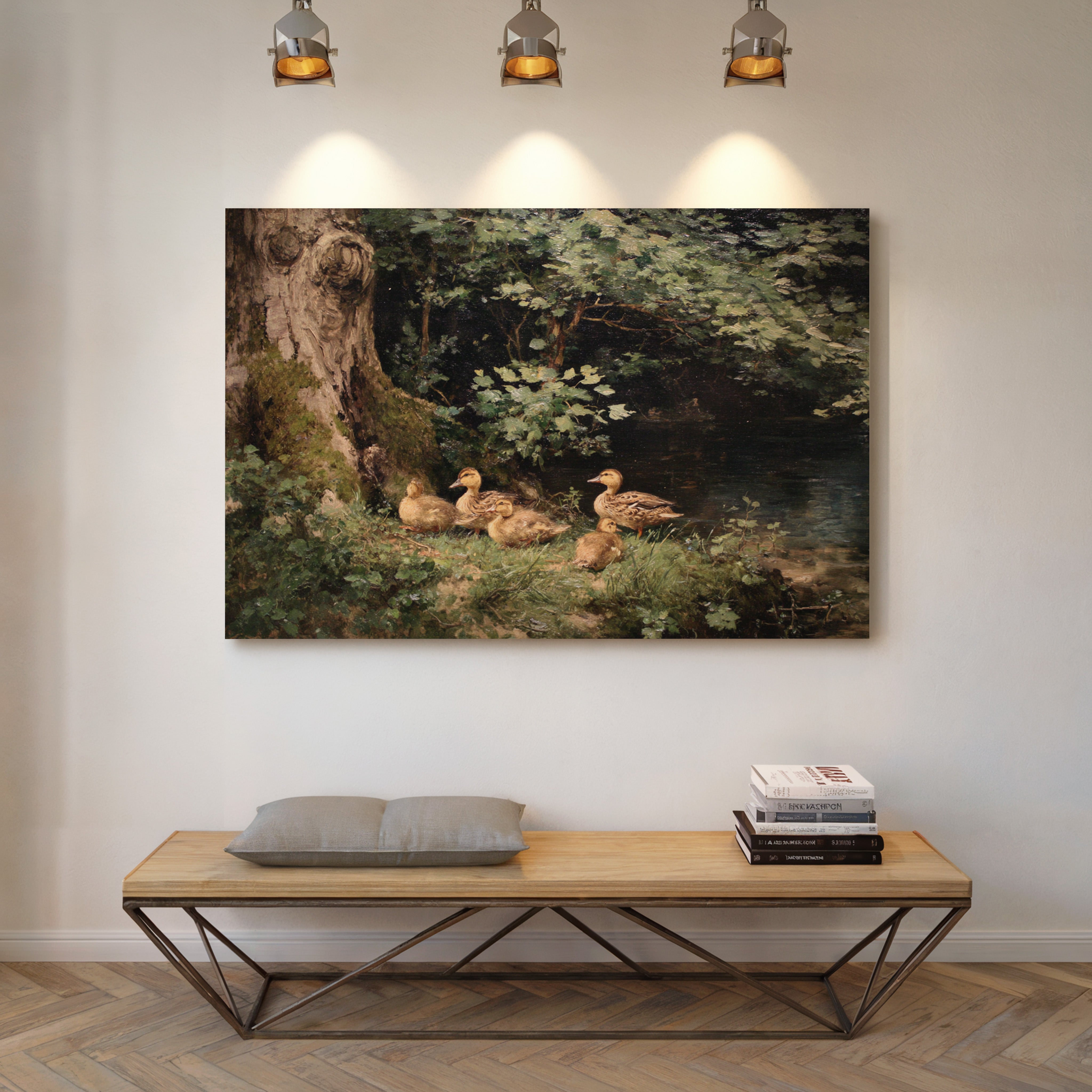 Sunlight filters through dense foliage, casting dappled shadows on a peaceful gathering of ducks nestled along a secluded riverbank. The scene captures an intimate moment where nature's creatures find sanctuary beneath a weathered oak's protective presence. Rich earth tones and verdant greens create a harmonious palette, while delicate brushstrokes bring to life the textured bark, soft feathers, and rippling water. This tranquil composition would bring a sense of pastoral serenity to a traditional study, dining room, or any space seeking to evoke the timeless charm of classical landscape art.