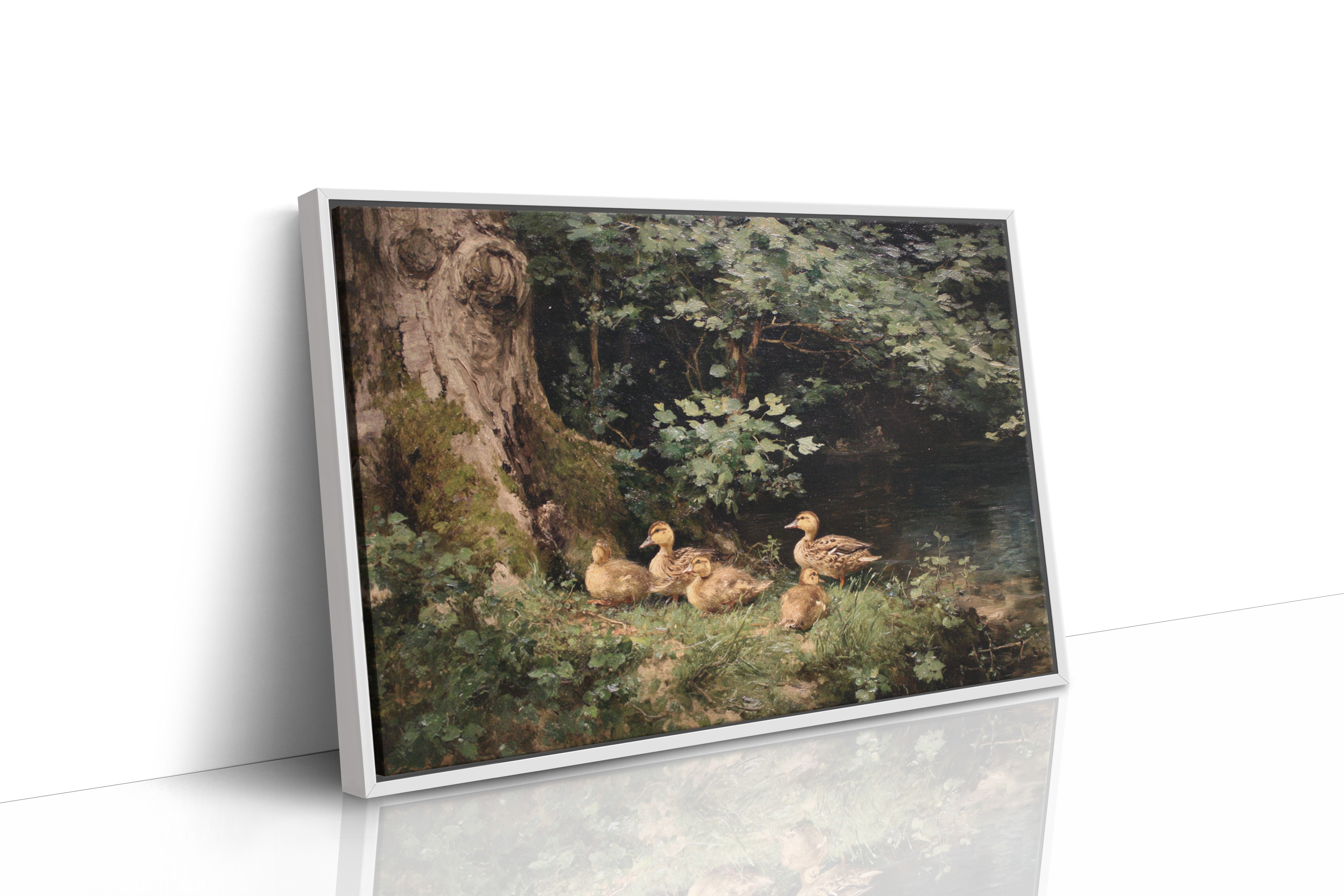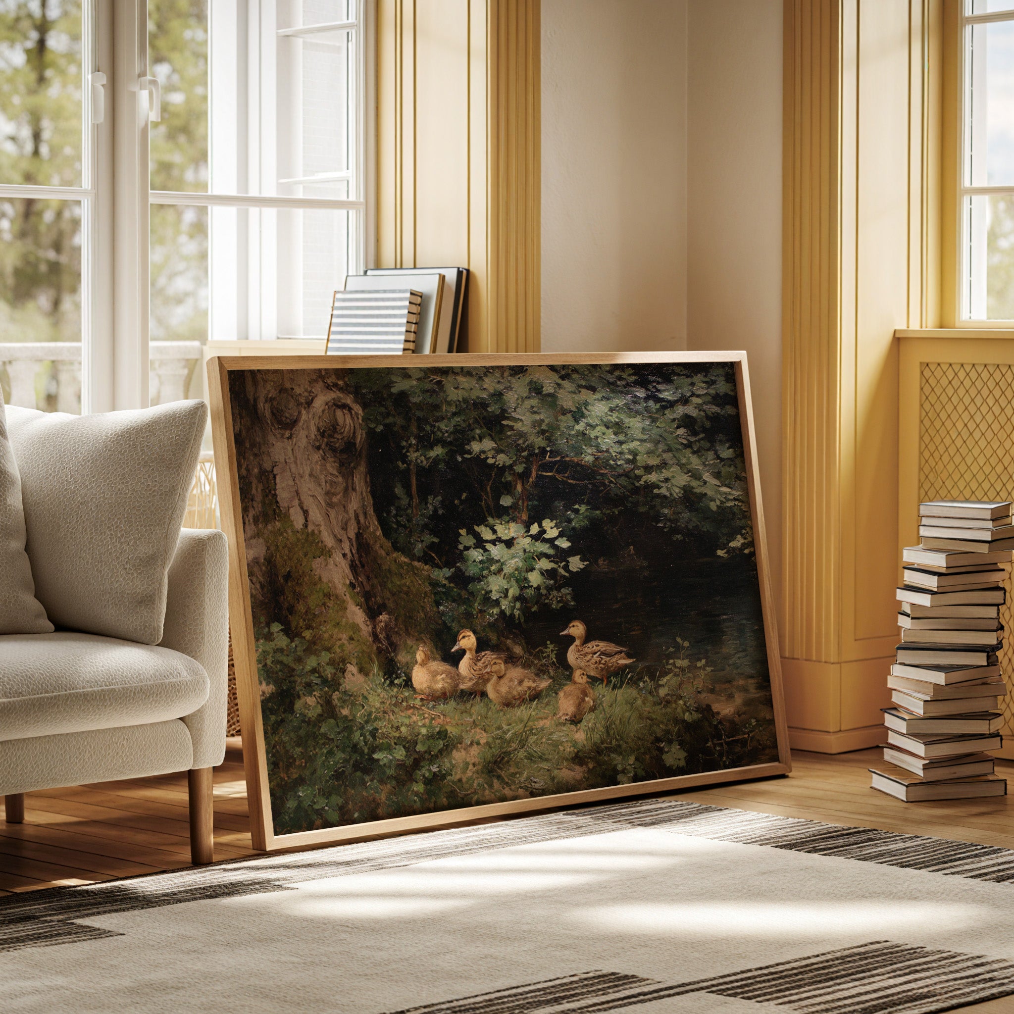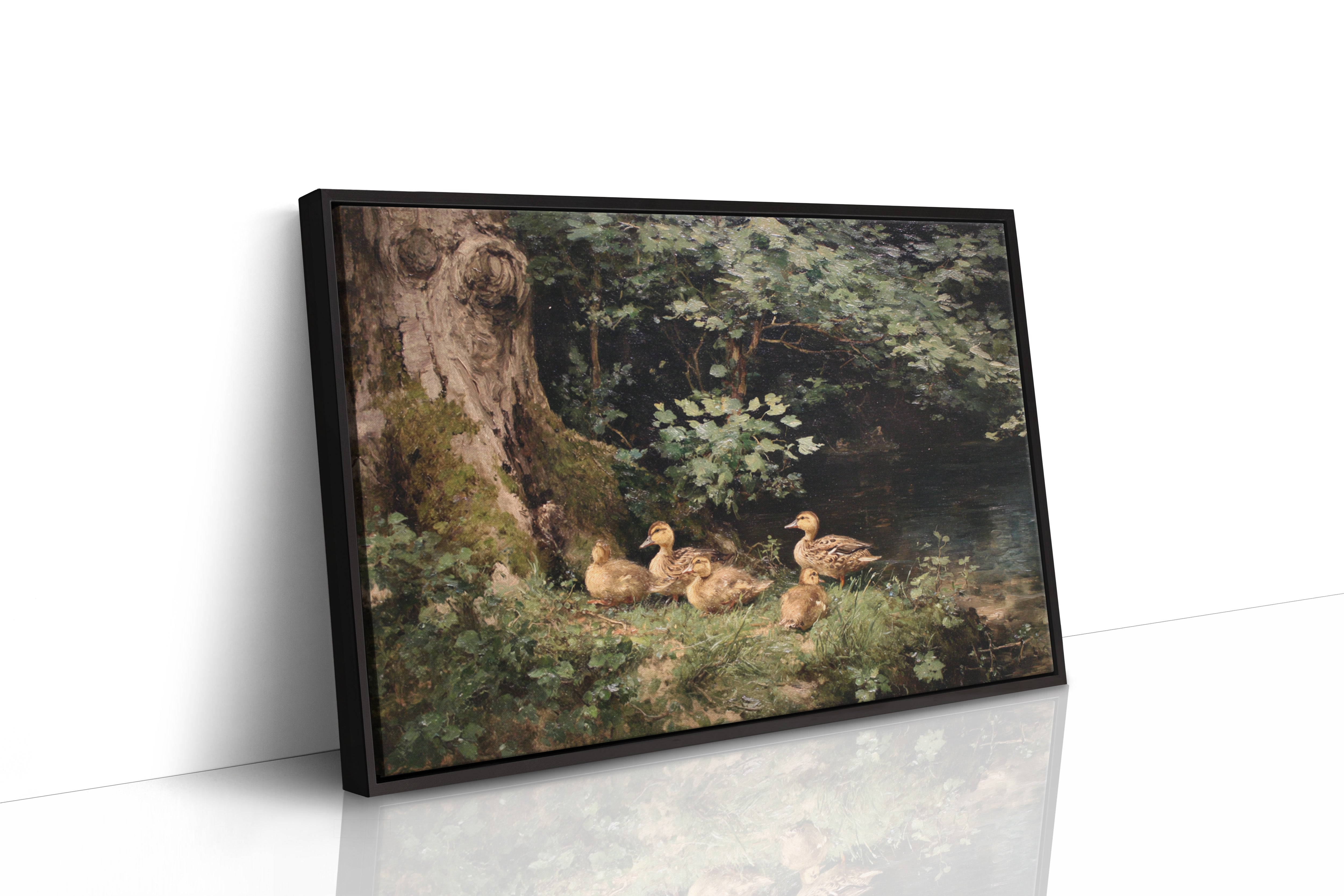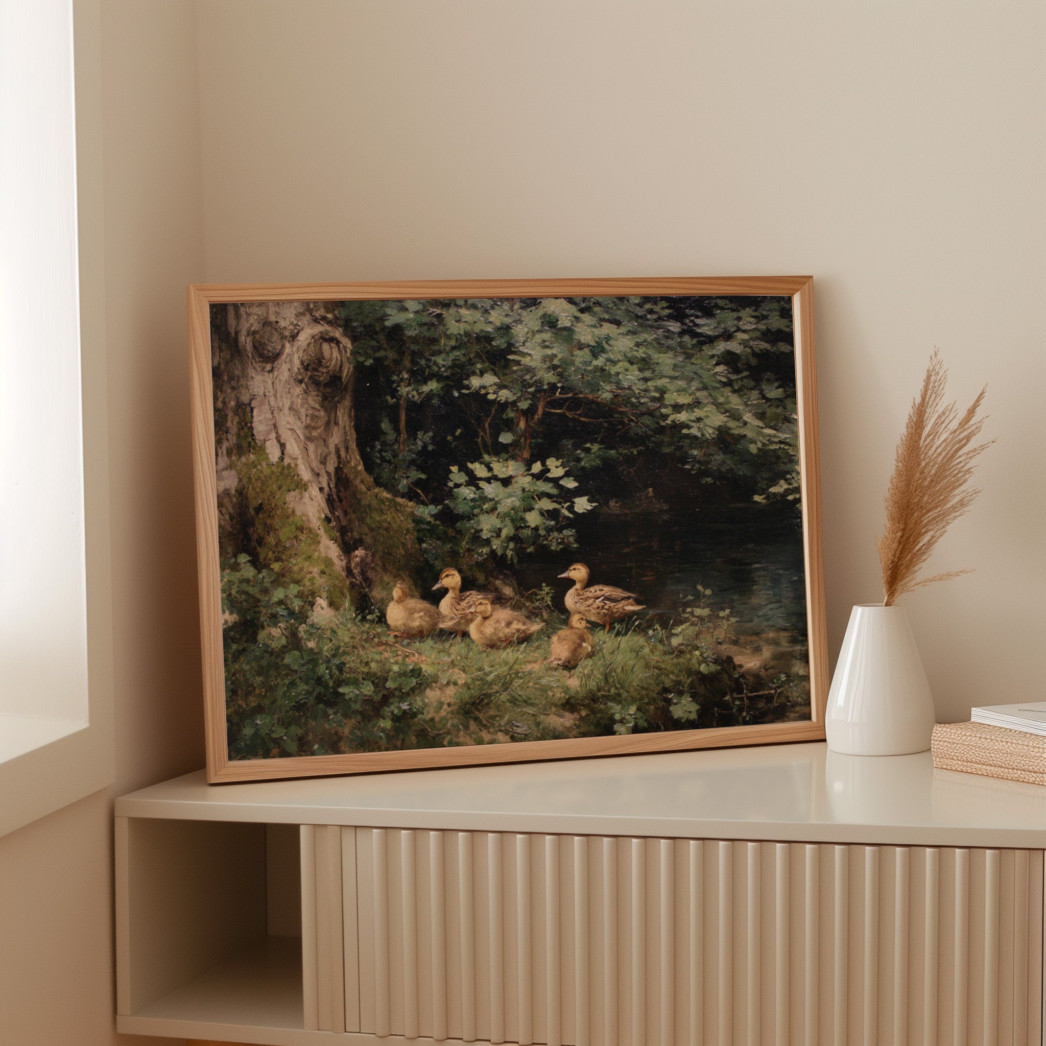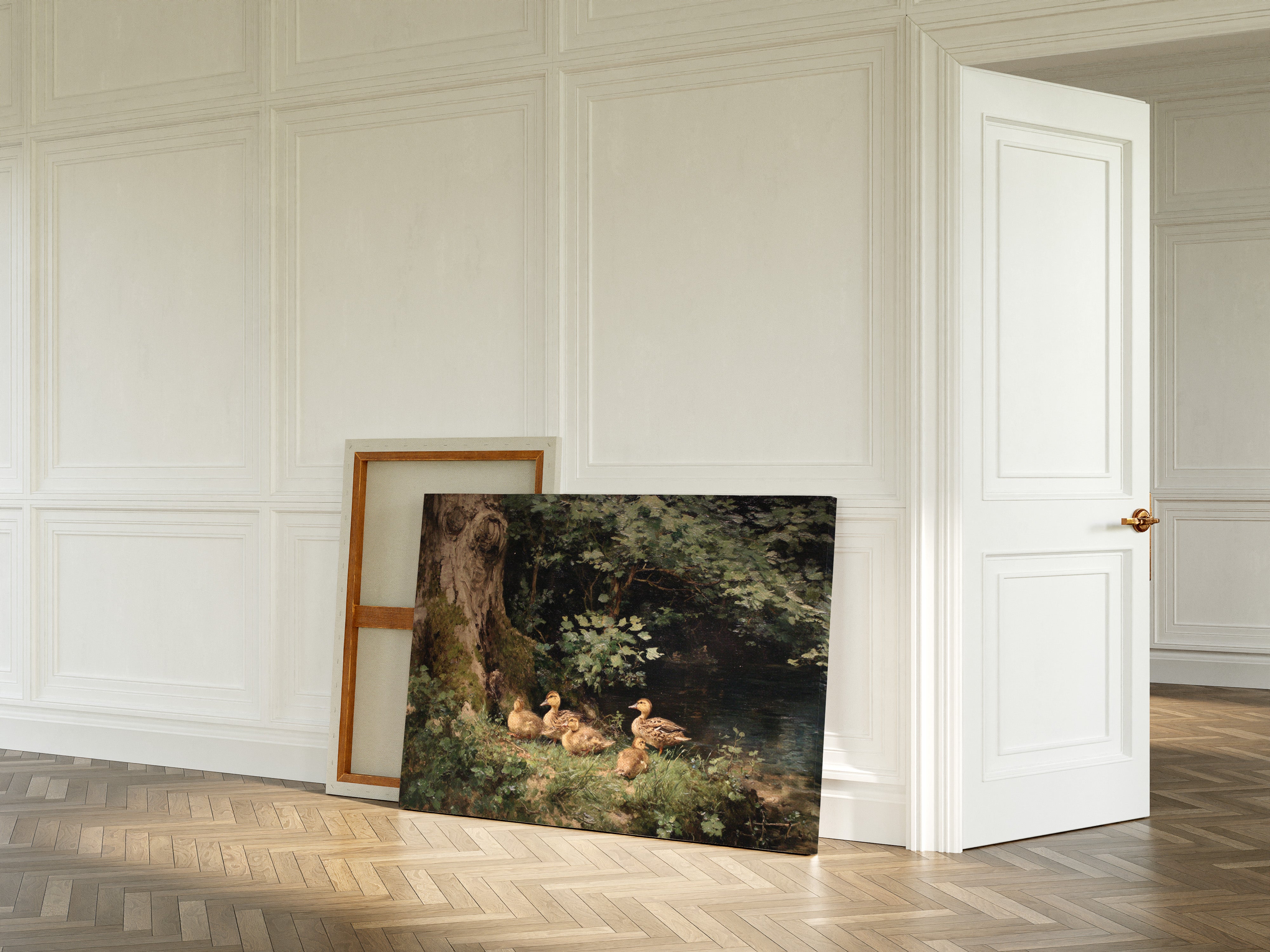 Sunlight filters through dense foliage, casting dappled shadows on a peaceful gathering of ducks nestled along a secluded riverbank. The scene captures an intimate moment where nature's creatures find sanctuary beneath a weathered oak's protective presence. Rich earth tones and verdant greens create a harmonious palette, while delicate brushstrokes bring to life the textured bark, soft feathers, and rippling water. This tranquil composition would bring a sense of pastoral serenity to a traditional study, dining room, or any space seeking to evoke the timeless charm of classical landscape art.
