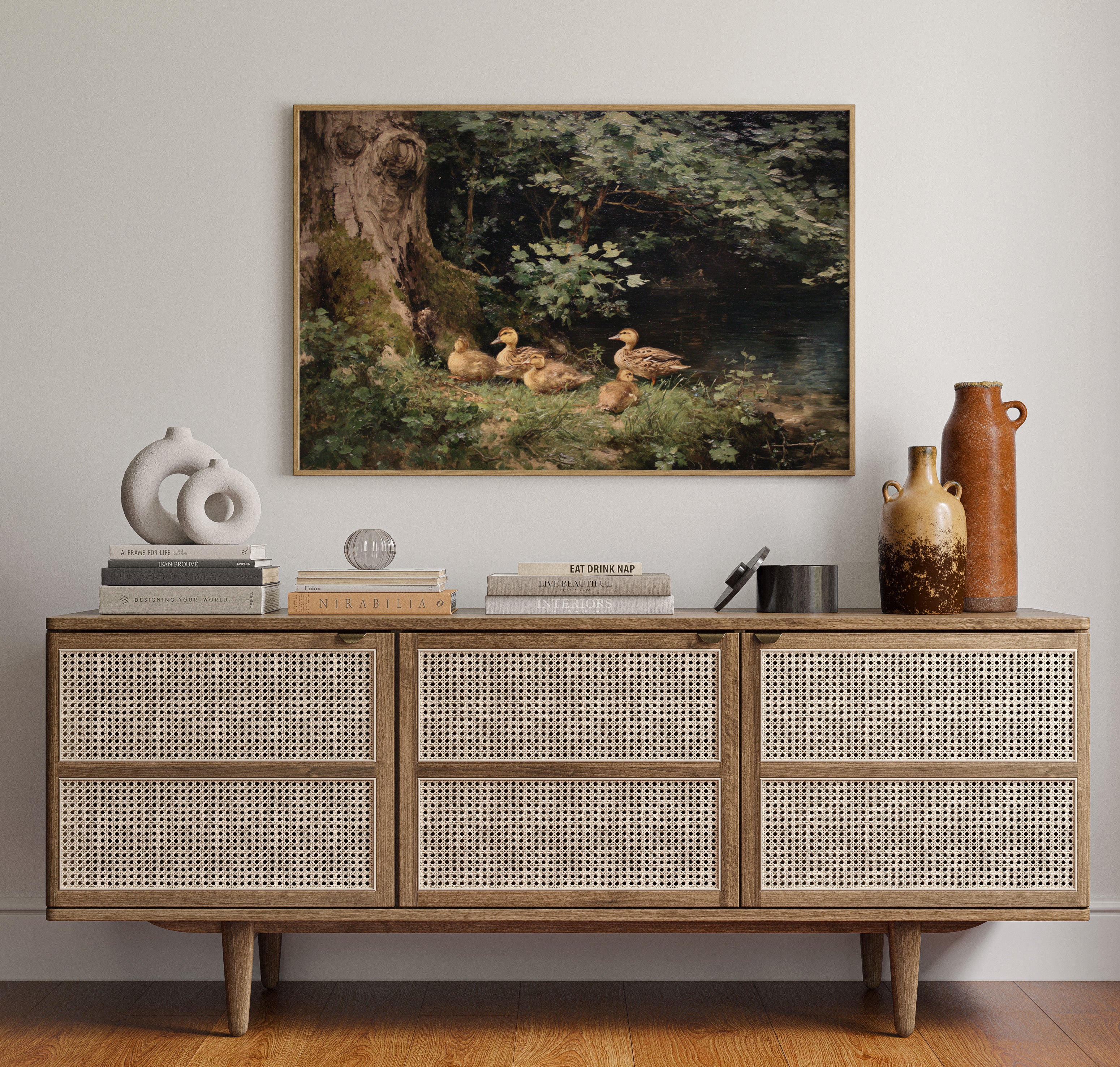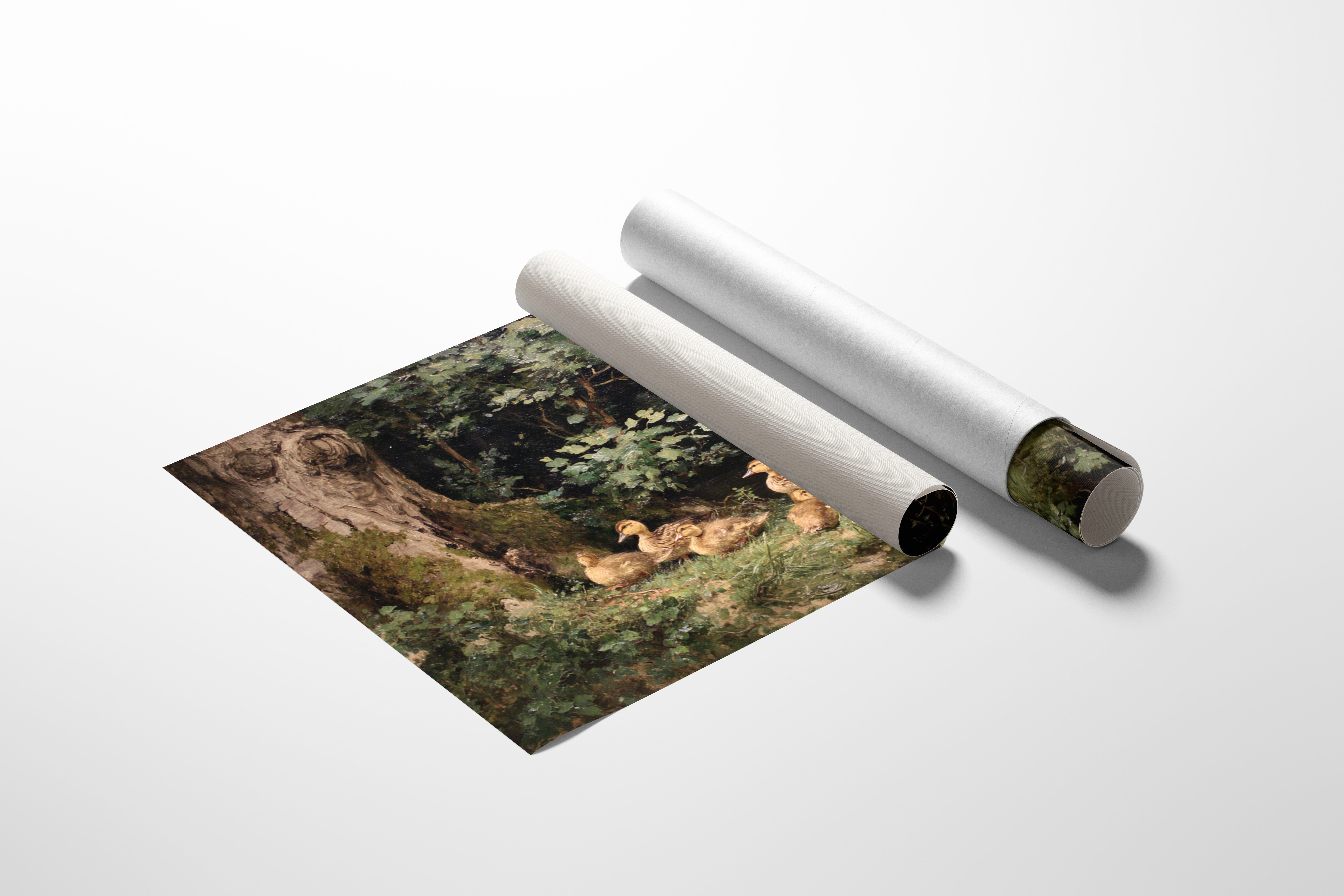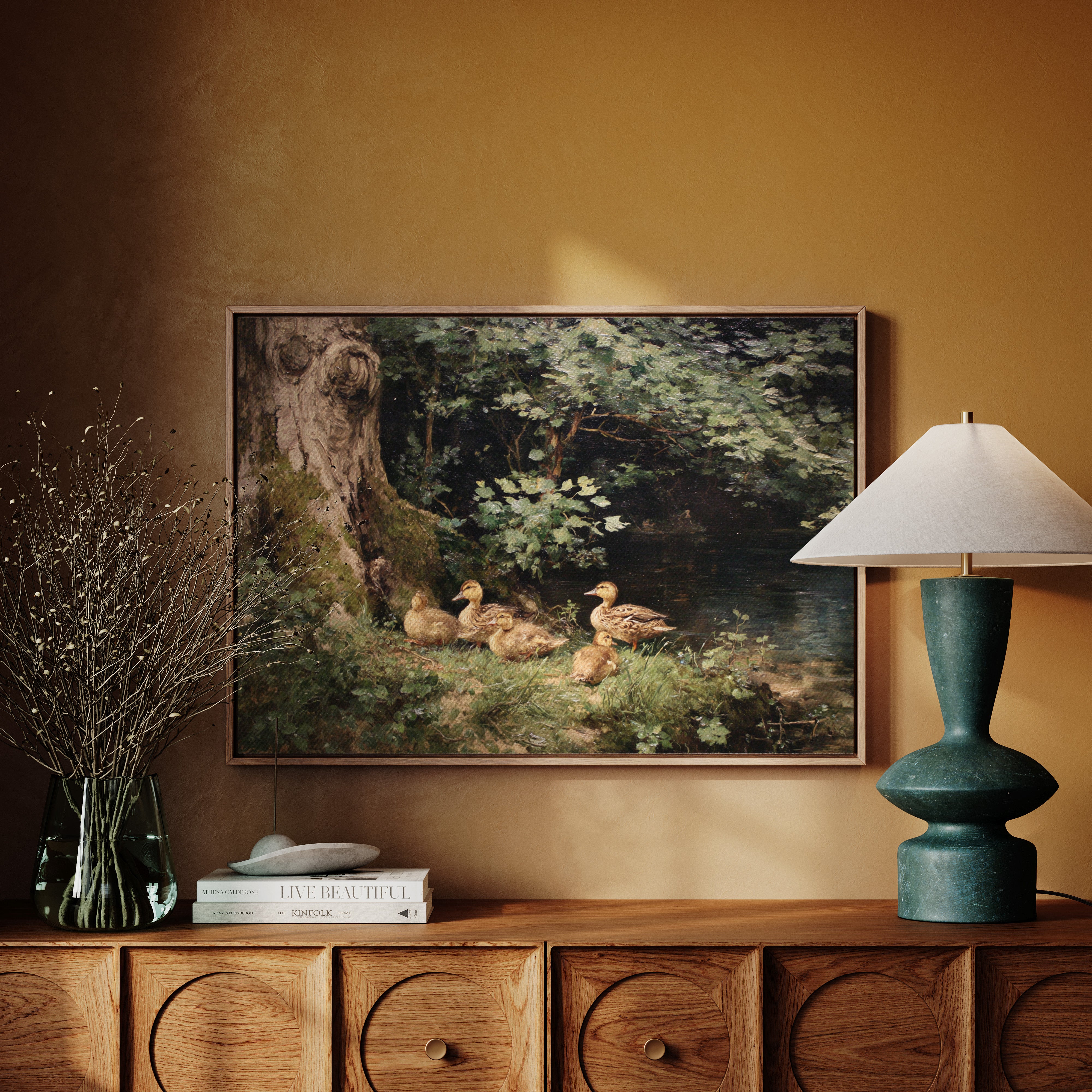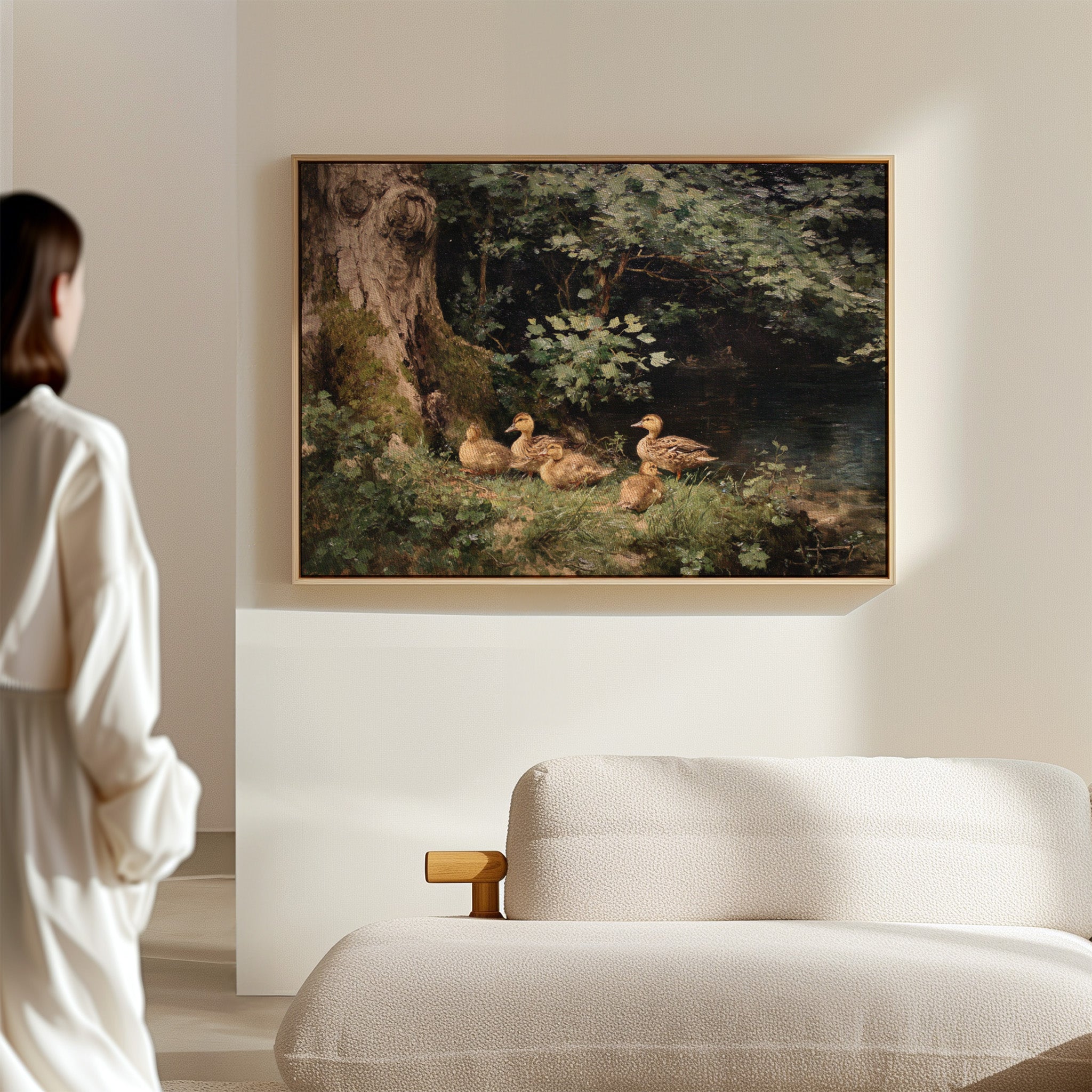 Sunlight filters through dense foliage, casting dappled shadows on a peaceful gathering of ducks nestled along a secluded riverbank. The scene captures an intimate moment where nature's creatures find sanctuary beneath a weathered oak's protective presence. Rich earth tones and verdant greens create a harmonious palette, while delicate brushstrokes bring to life the textured bark, soft feathers, and rippling water. This tranquil composition would bring a sense of pastoral serenity to a traditional study, dining room, or any space seeking to evoke the timeless charm of classical landscape art.