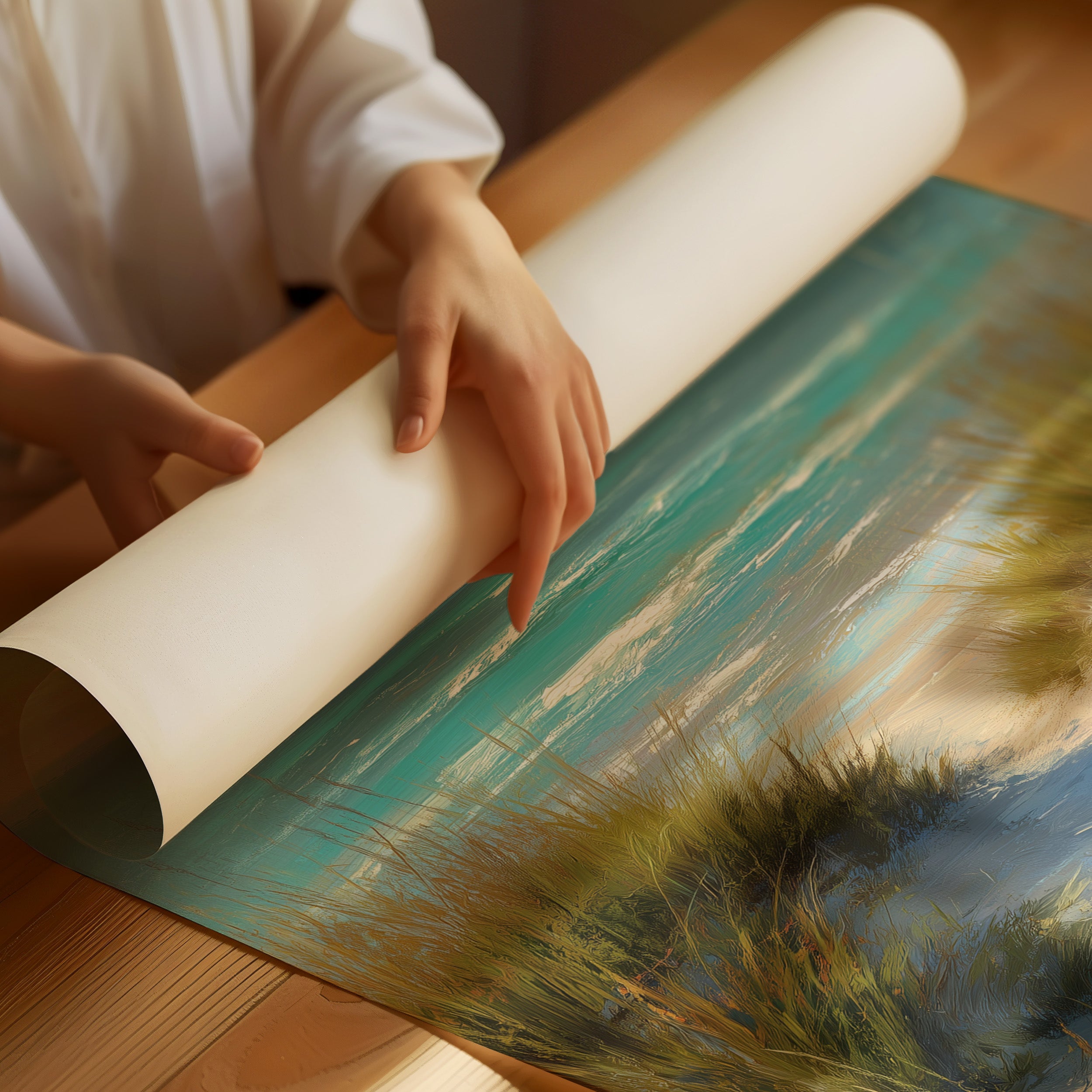 Sunlight spills across sandy pathways, inviting you to follow the winding trail toward distant waves. The soft blues and aquas of the ocean horizon blend with creamy sand dunes, while delicate beach grasses sway in an unseen breeze. This coastal scene captures that perfect moment of anticipationwhen the sound of breaking waves grows louder with each step forward.