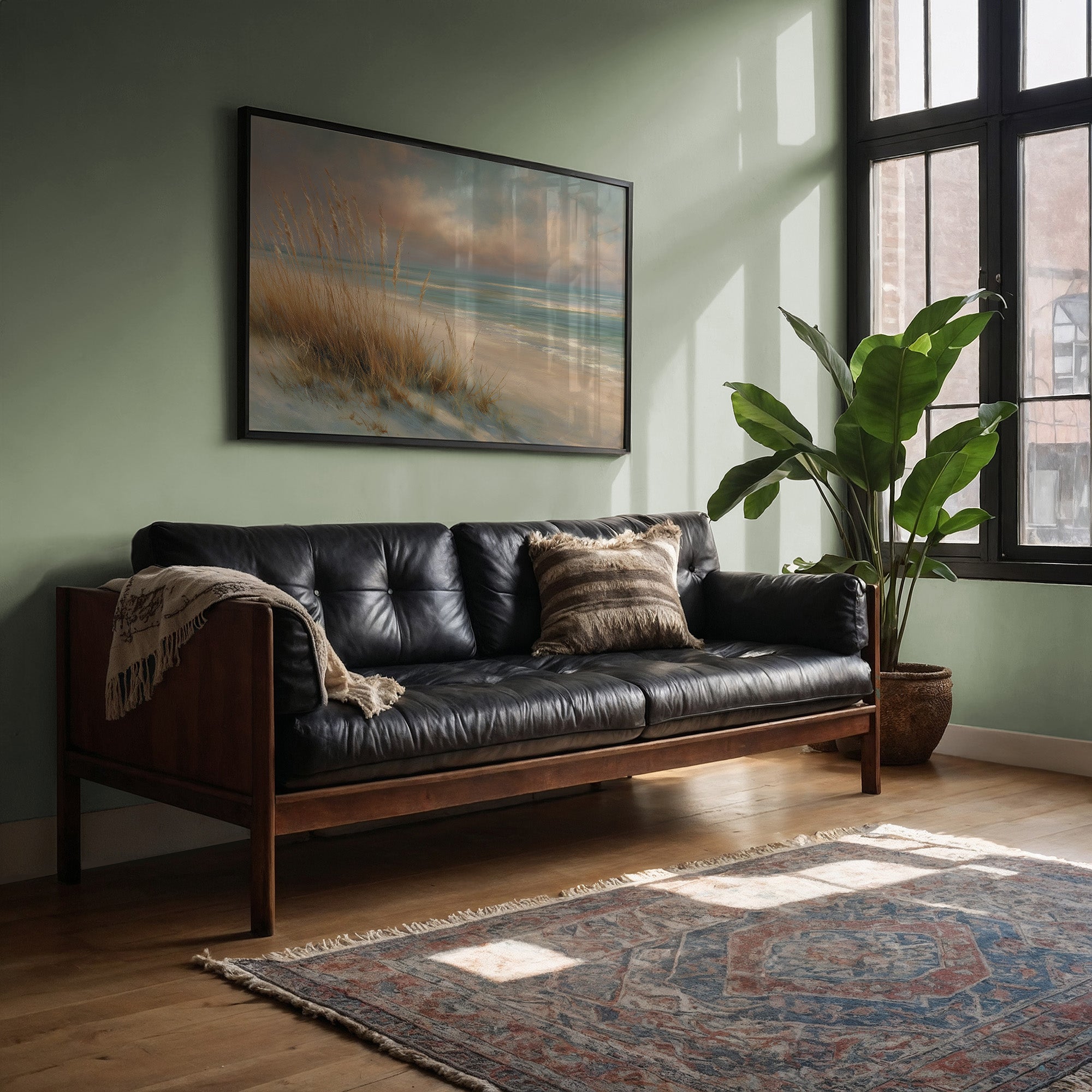Your artwork should take up 60-75% of wall space above furniture. For standard sofas, choose 24"x36" or larger. When in doubt, go slightly bigger.