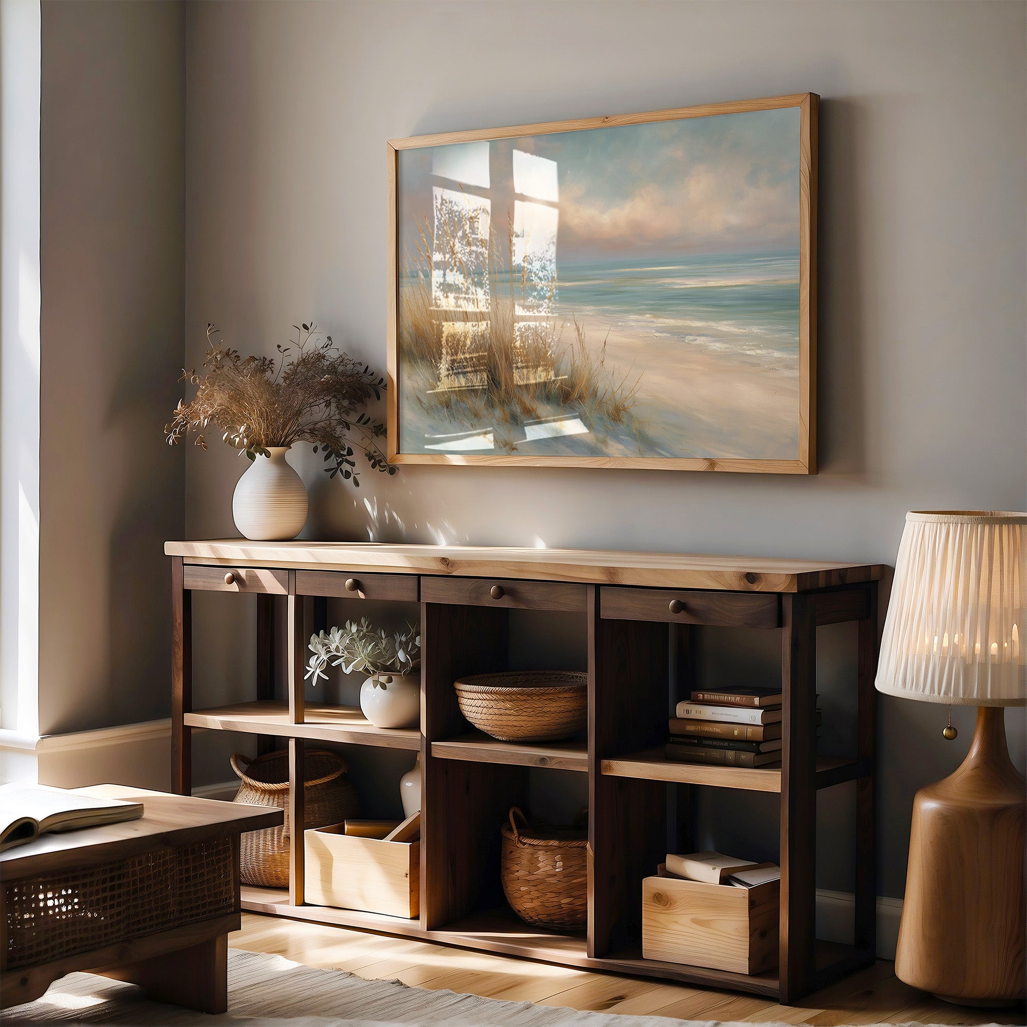 Golden grasses bend in the coastal breeze, their delicate silhouettes dancing against a backdrop of turquoise waters and soft clouds. The scene captures that perfect moment when afternoon light bathes the shoreline in honeyed warmth, creating a dreamlike quality that blurs the boundary between sand and sea. Weathered dune grass stands sentinel over the peaceful shoreline, where gentle waves leave lace-like patterns on pristine sand.