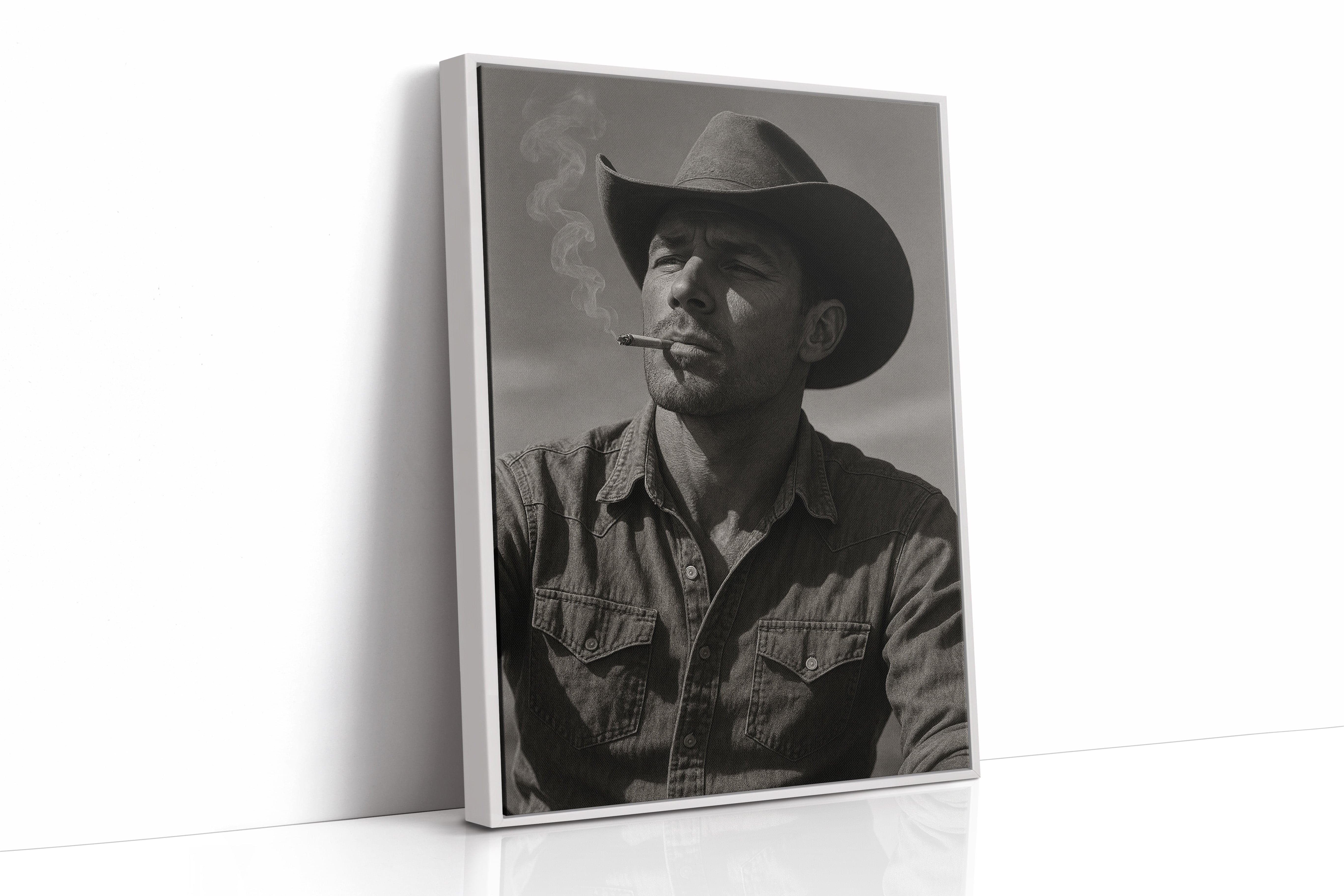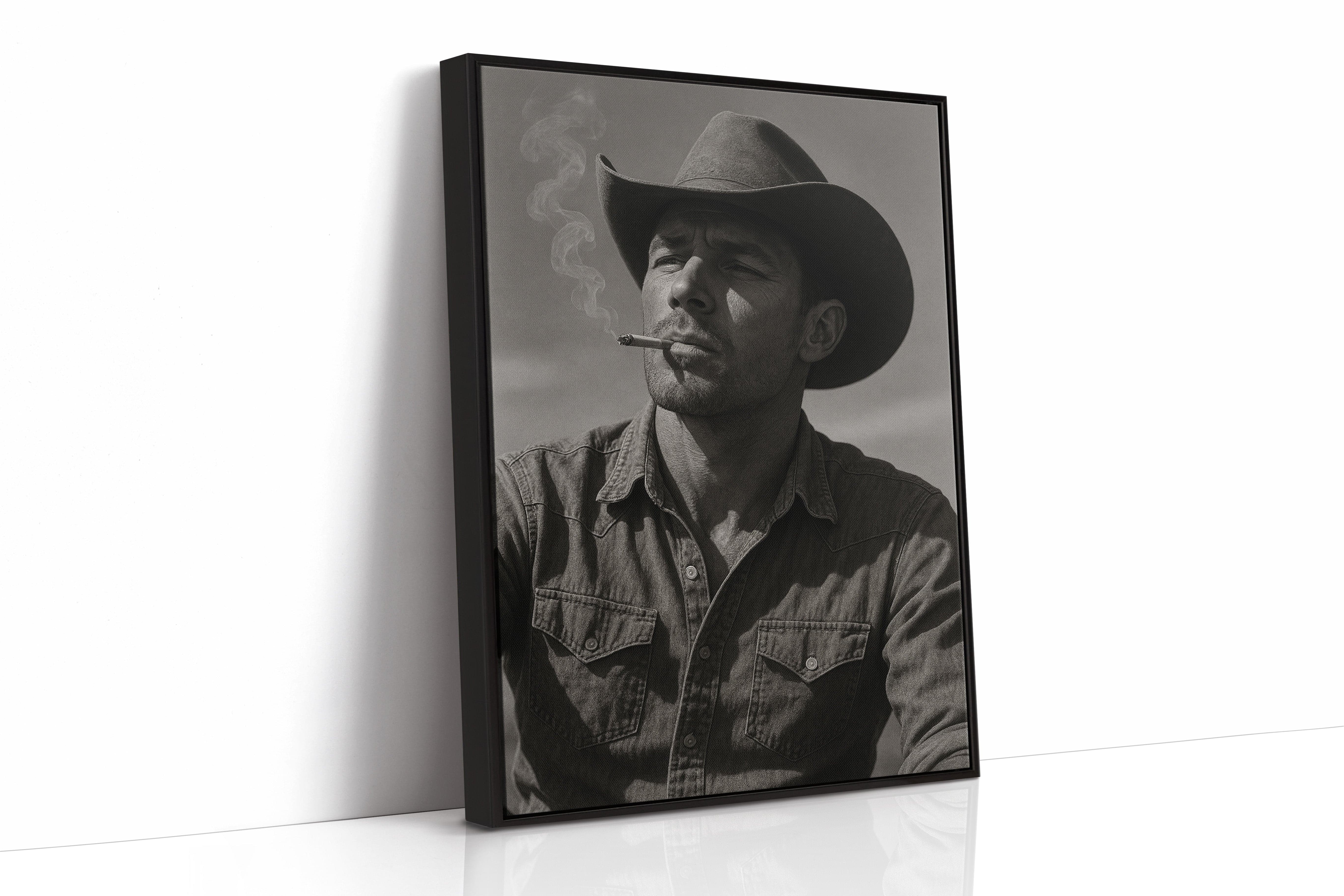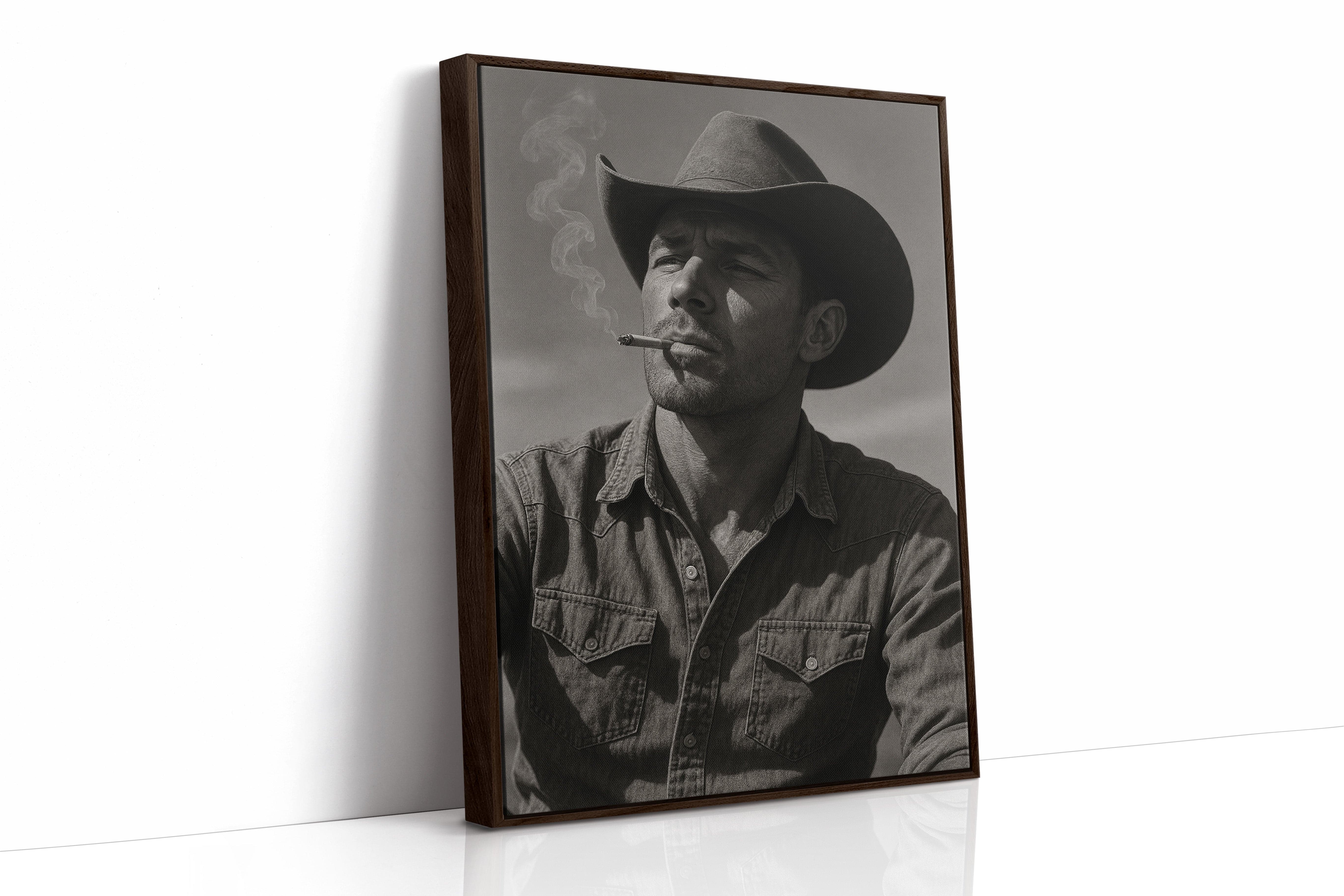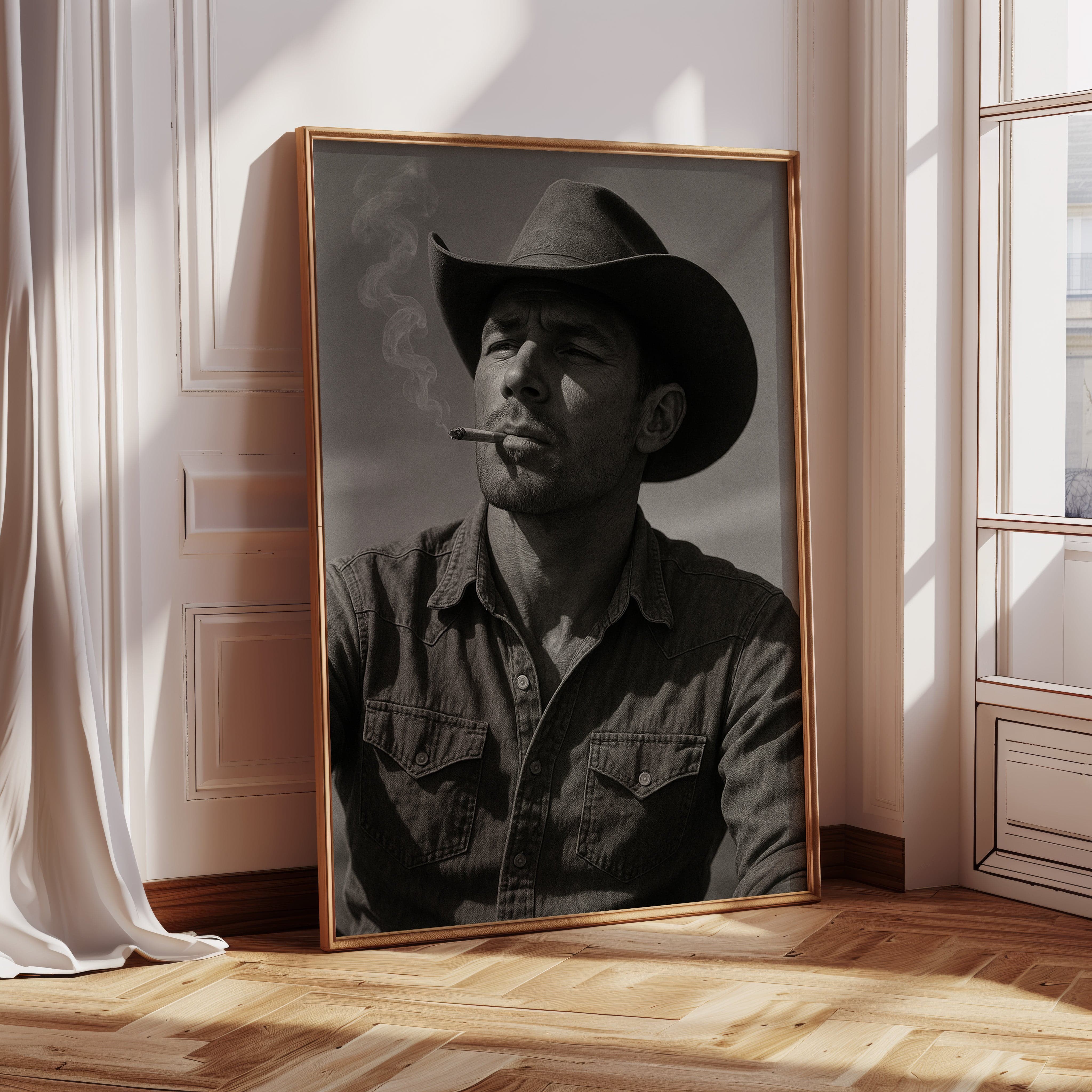 Dust and Grit is a striking black-and-white portrait capturing the raw charisma of the American cowboy. With sun-worn features, a steady gaze, and smoke curling from a cigarette, this image exudes the resilience and solitude of the rugged West. A bold, masculine addition to any Western or vintage-inspired space.