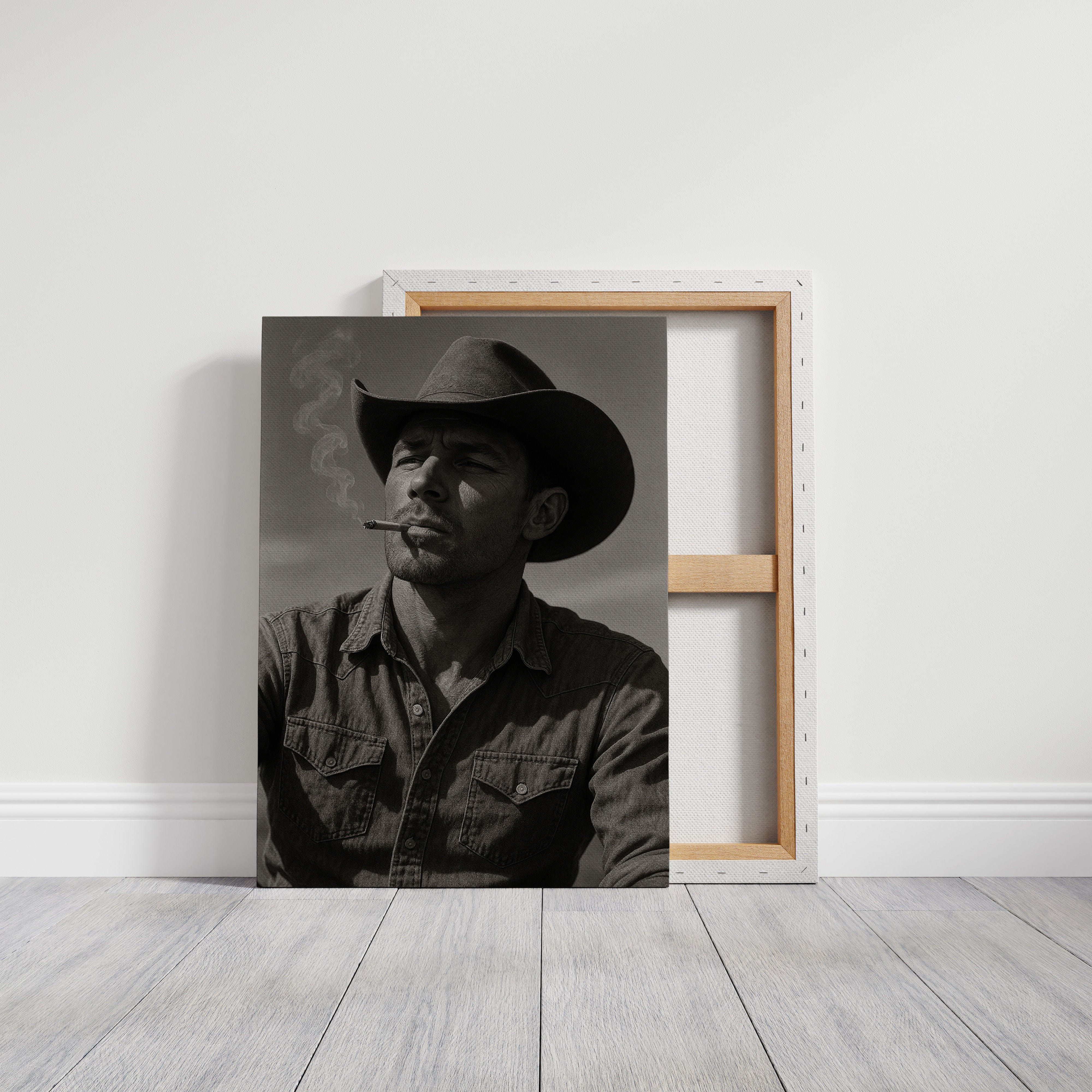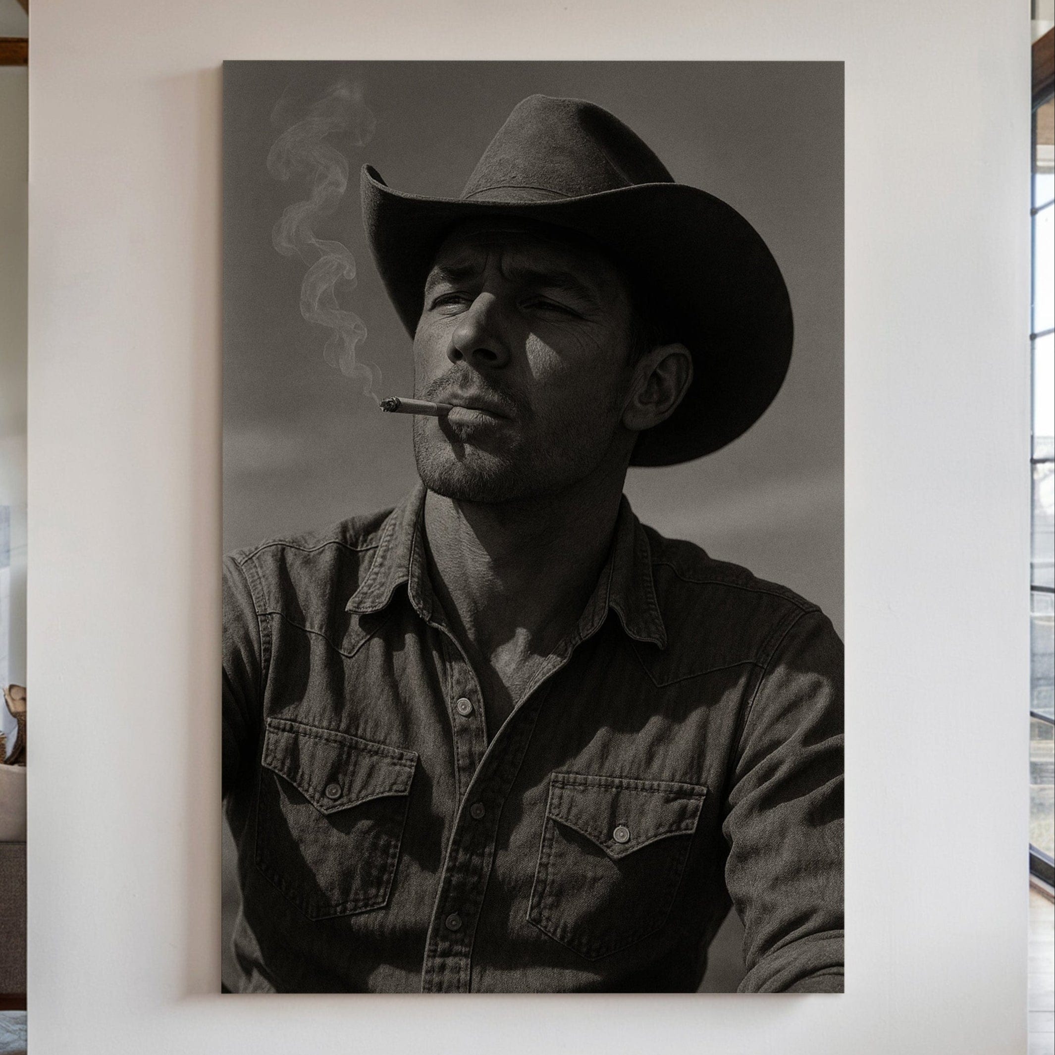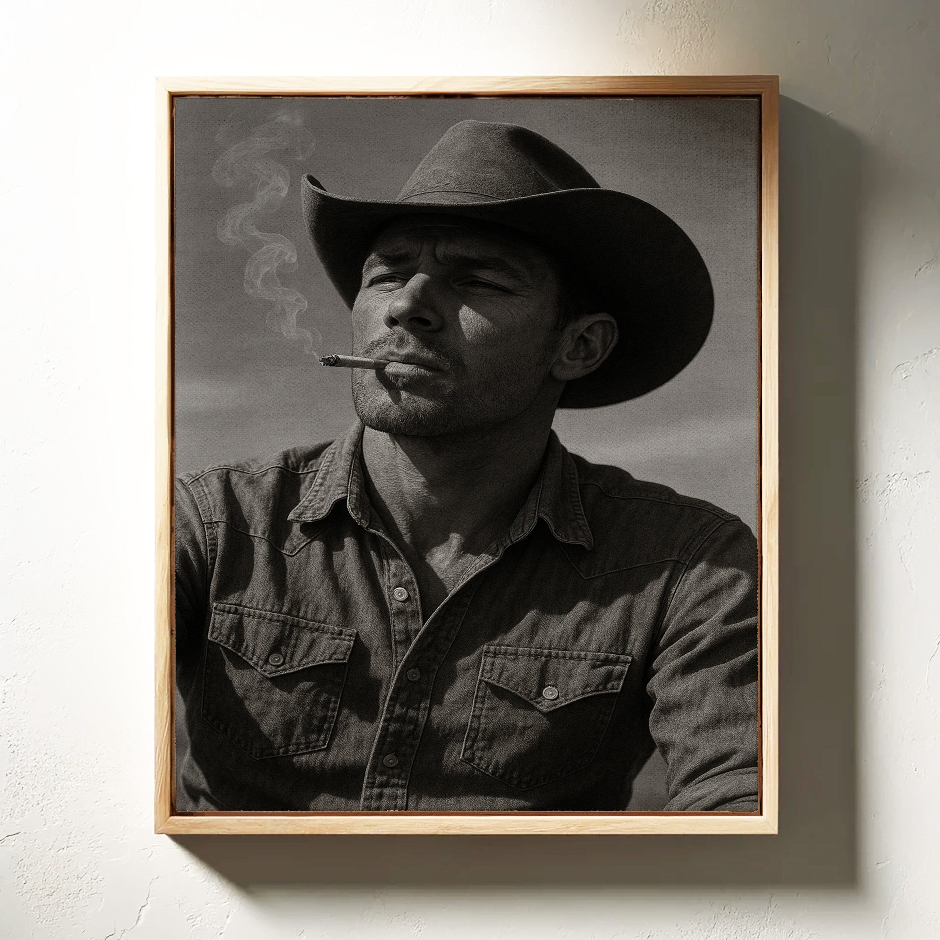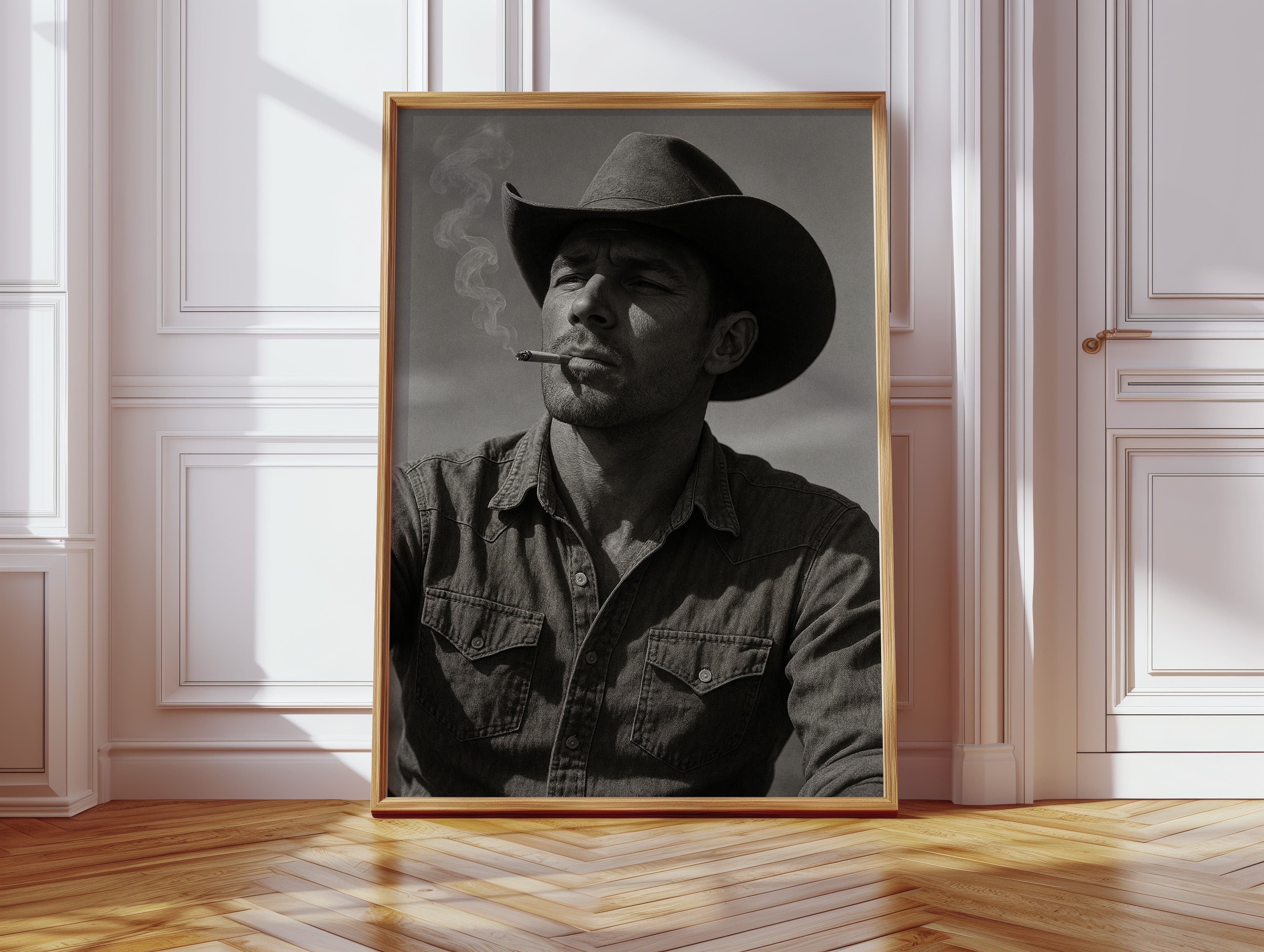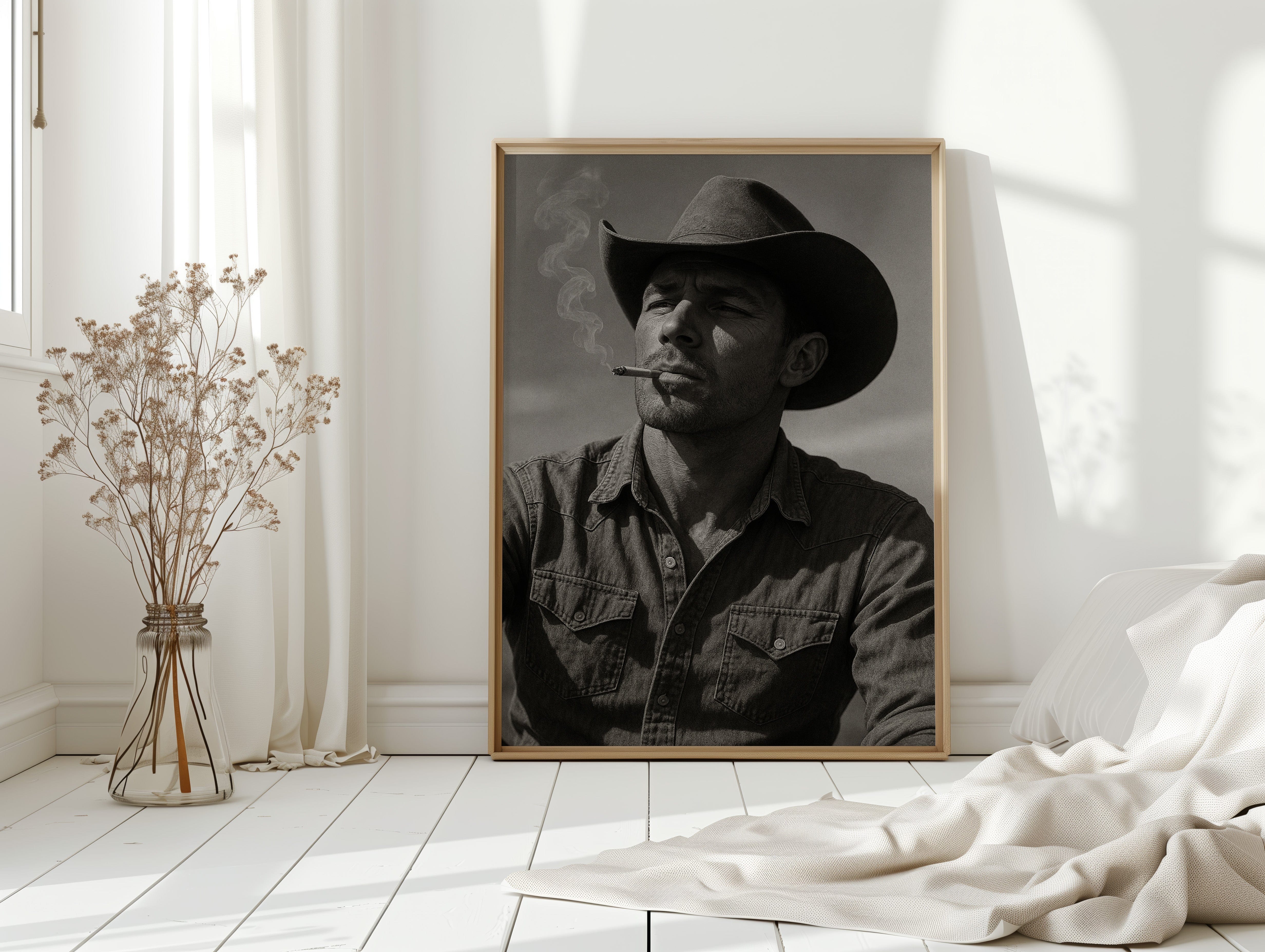 Dust and Grit is a striking black-and-white portrait capturing the raw charisma of the American cowboy. With sun-worn features, a steady gaze, and smoke curling from a cigarette, this image exudes the resilience and solitude of the rugged West. A bold, masculine addition to any Western or vintage-inspired space.