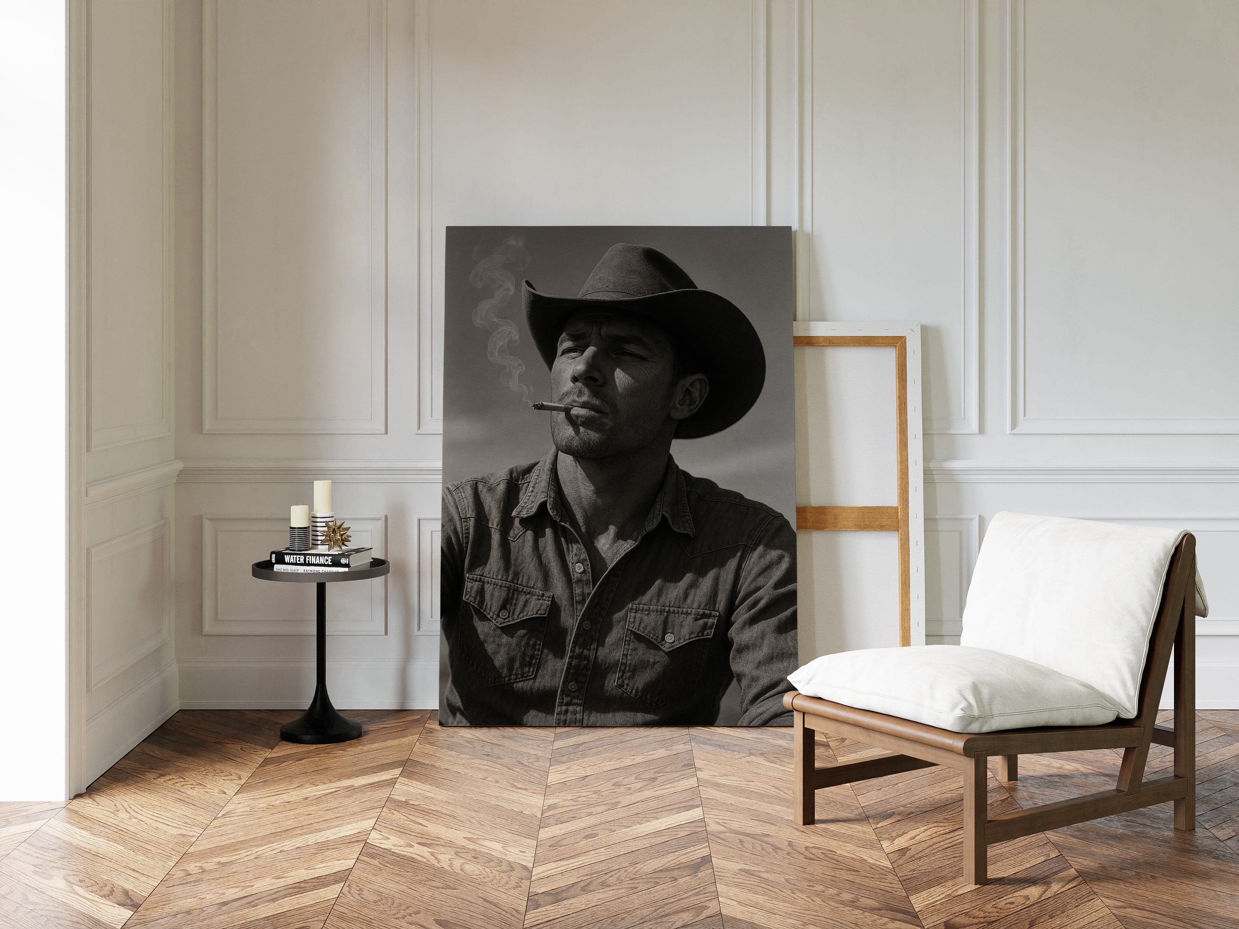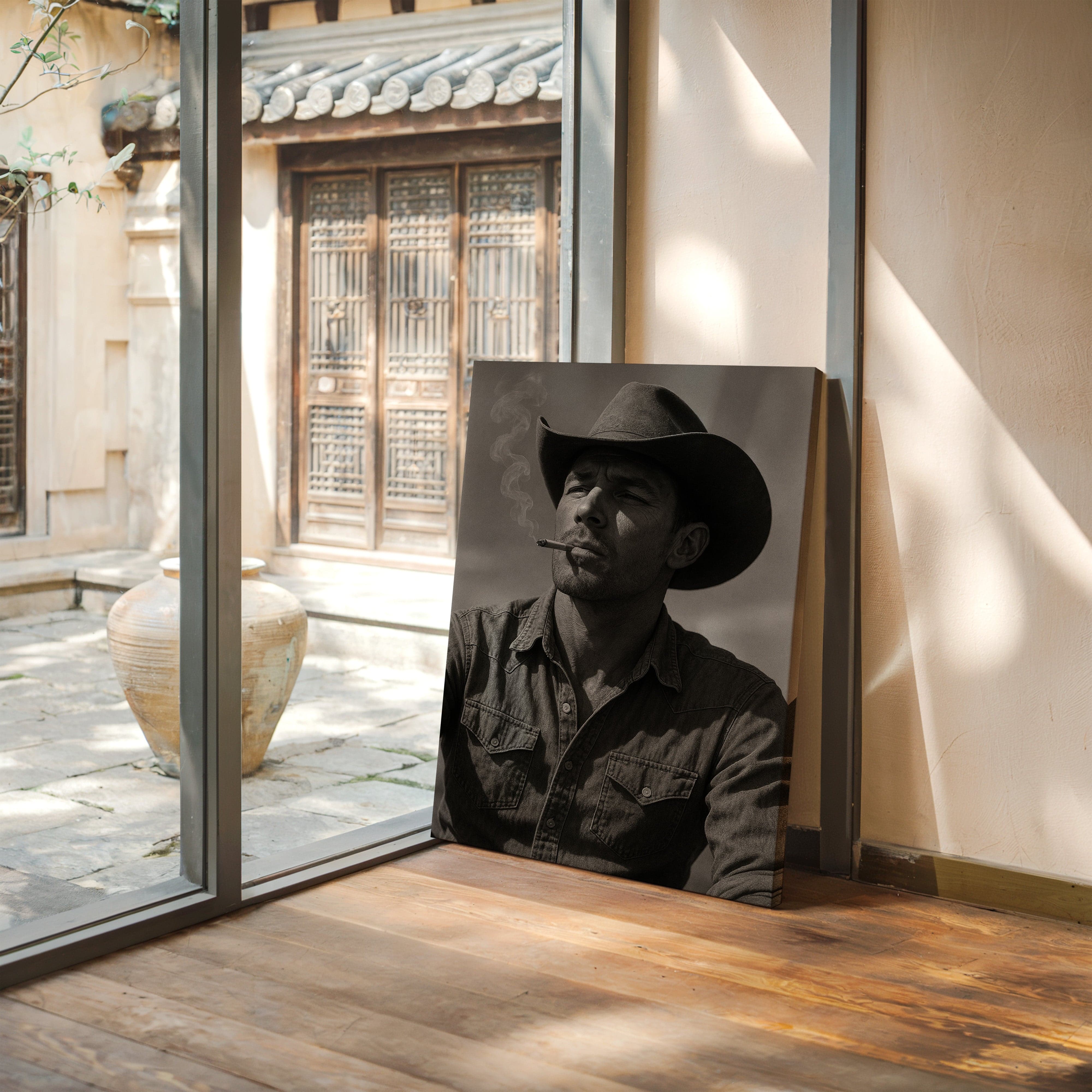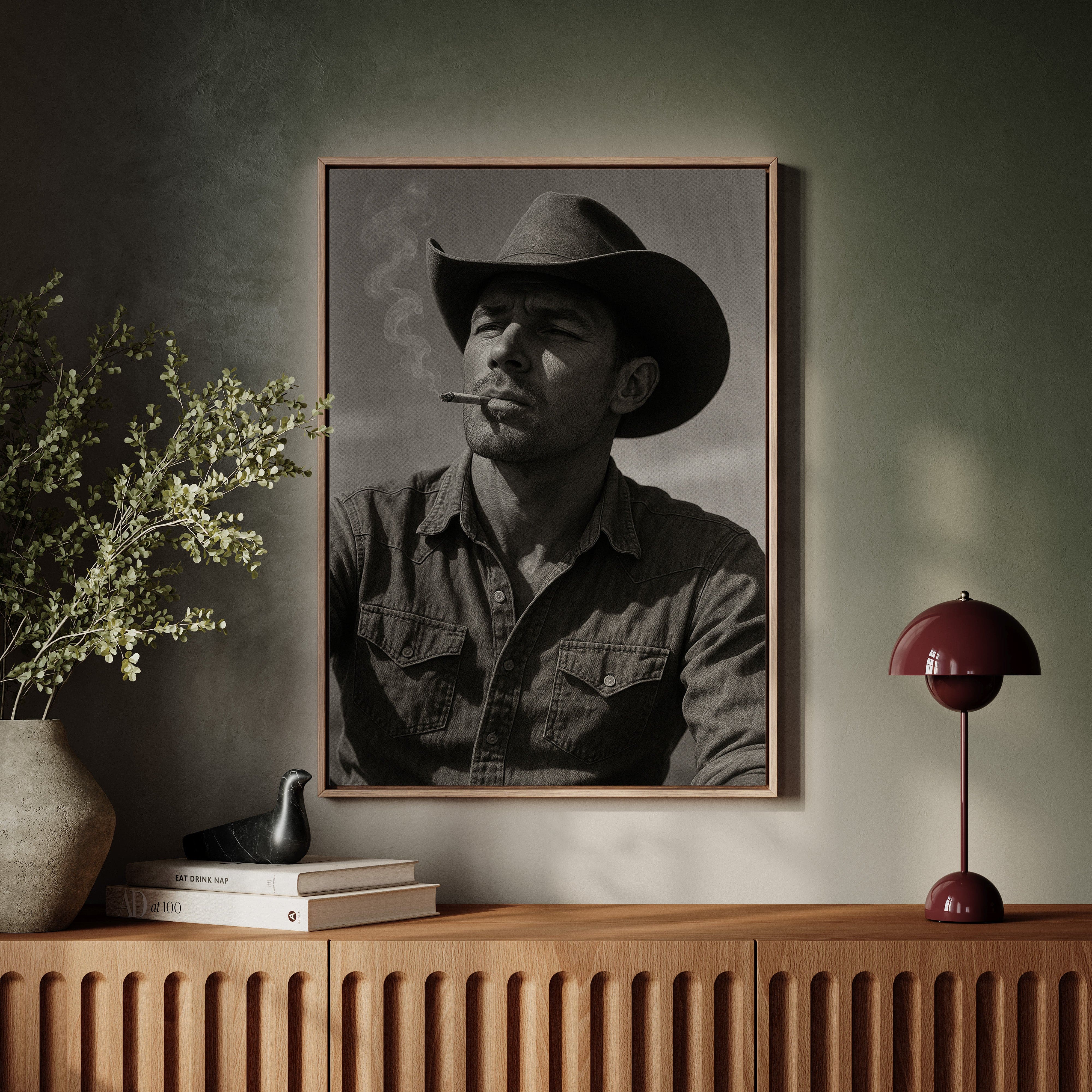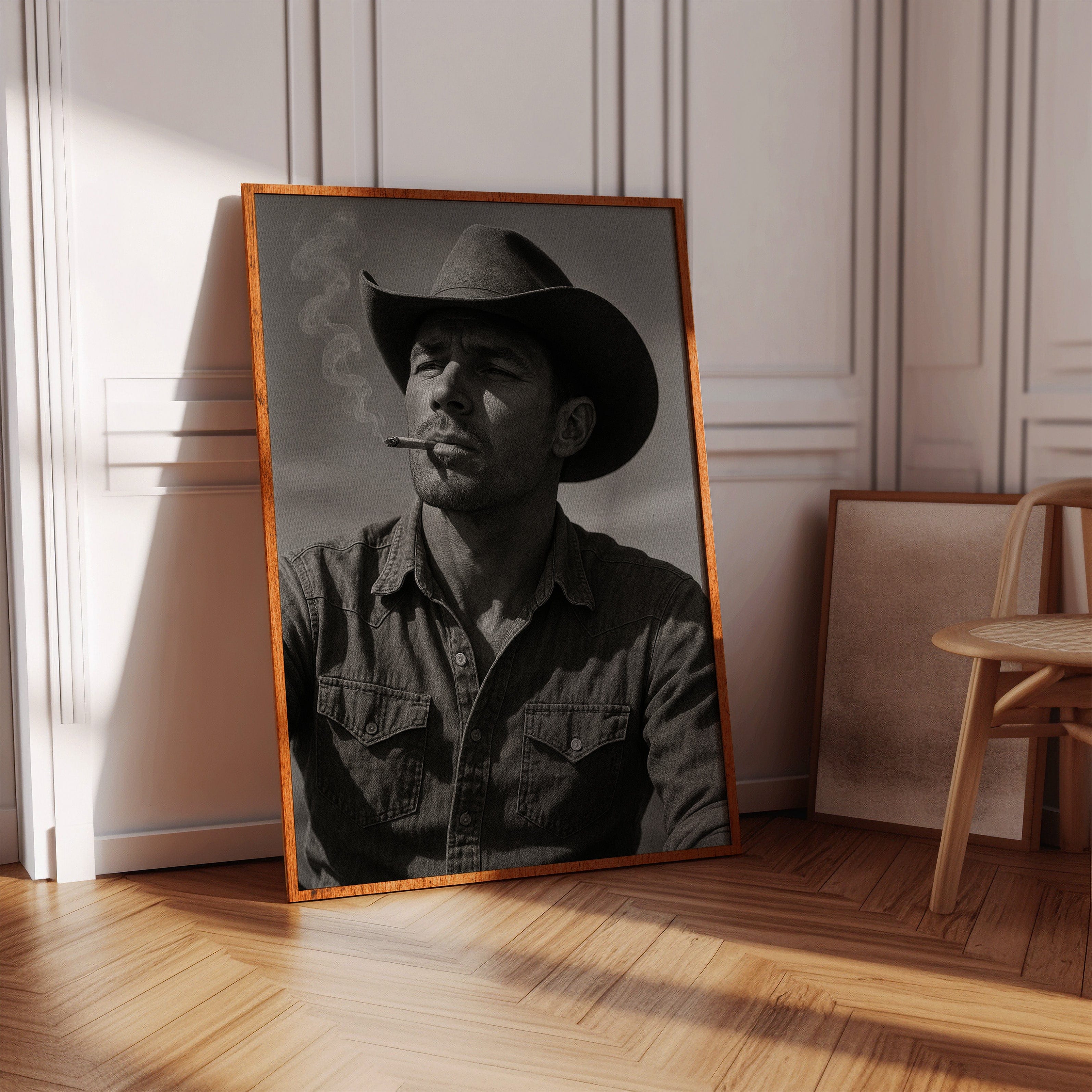 Dust and Grit is a striking black-and-white portrait capturing the raw charisma of the American cowboy. With sun-worn features, a steady gaze, and smoke curling from a cigarette, this image exudes the resilience and solitude of the rugged West. A bold, masculine addition to any Western or vintage-inspired space.