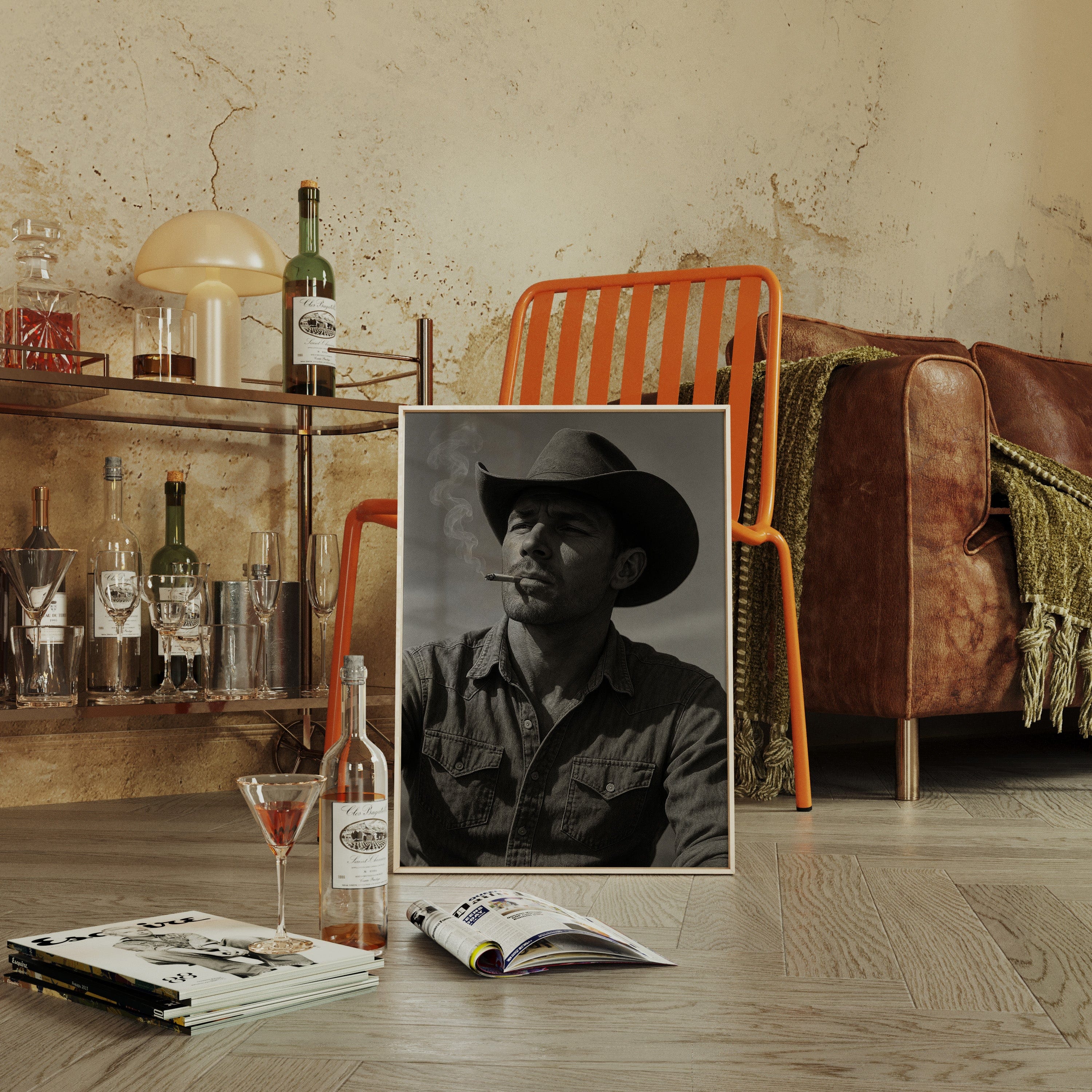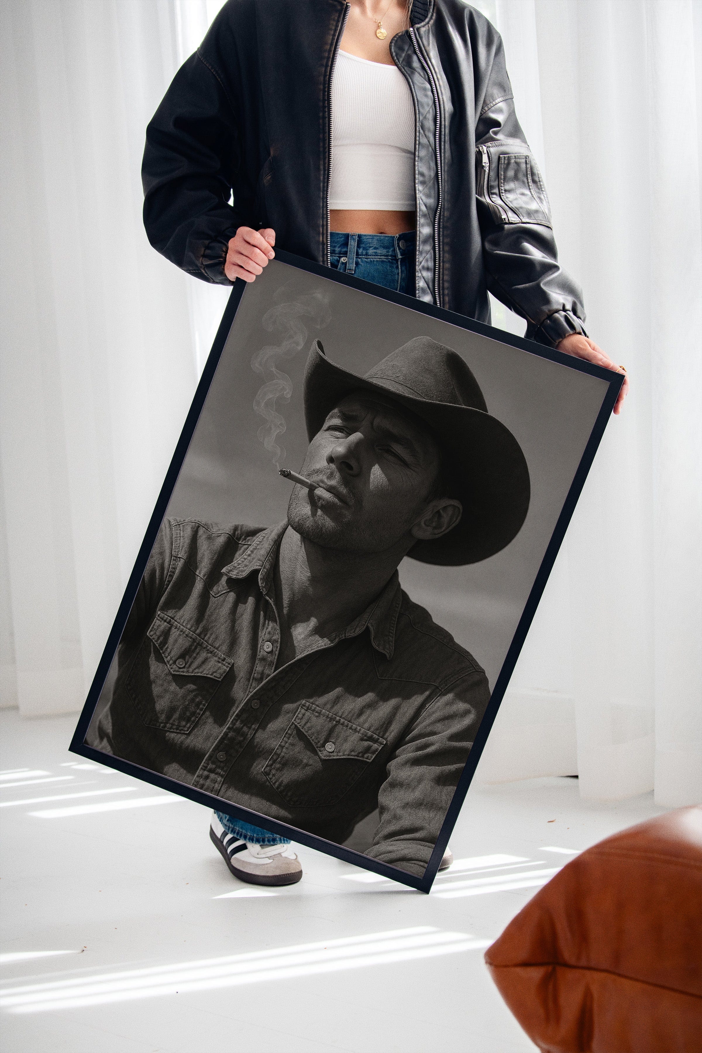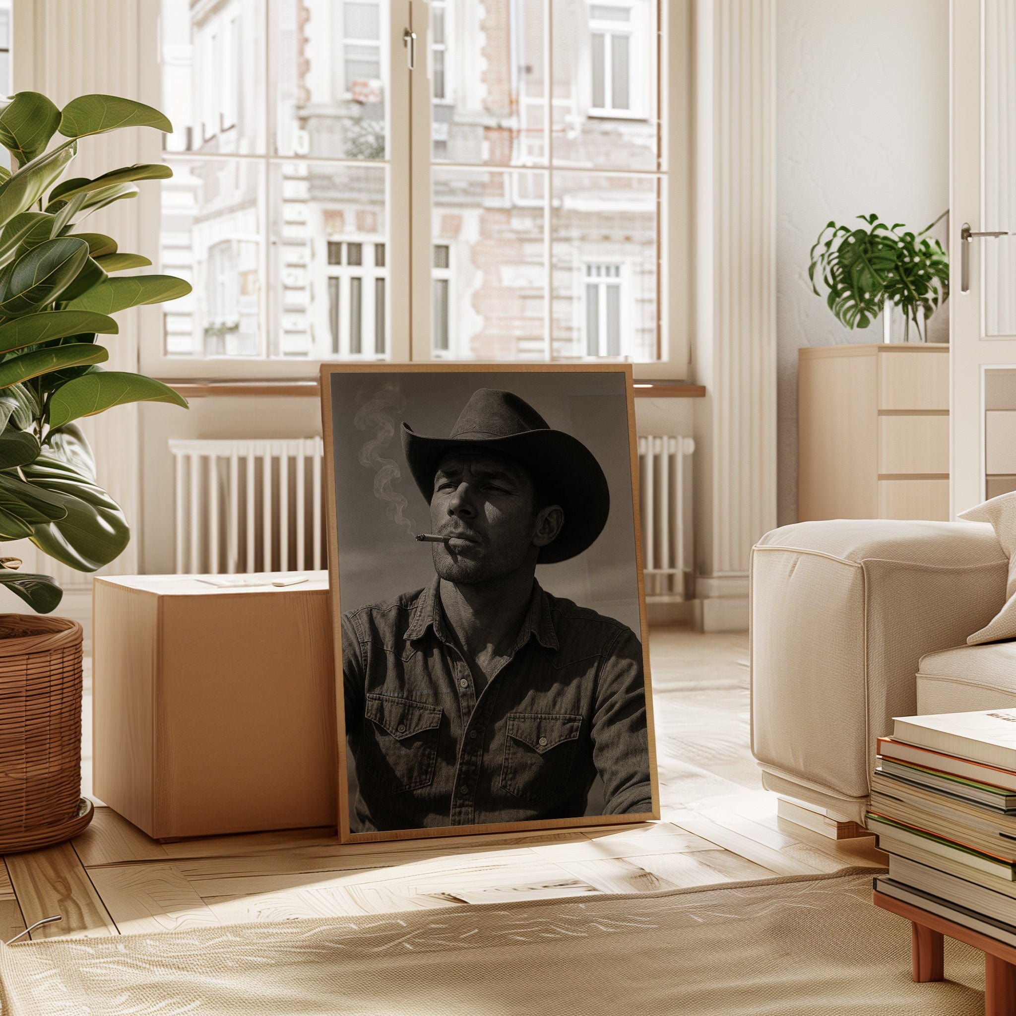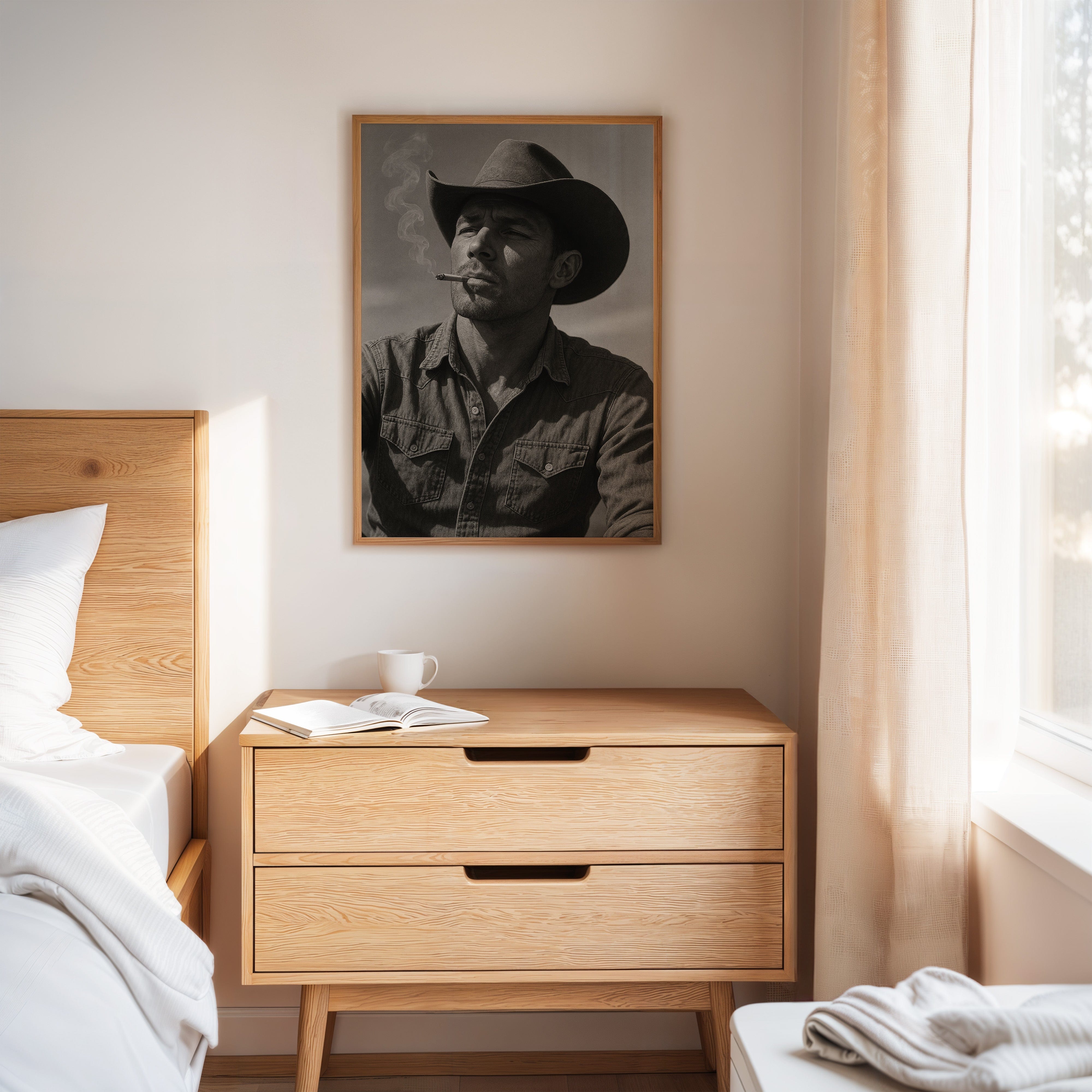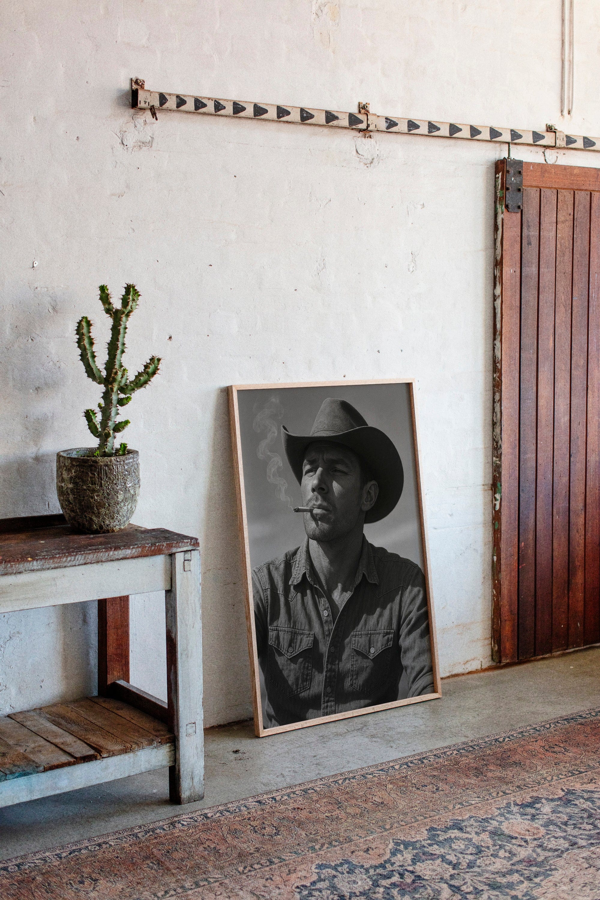 Dust and Grit is a striking black-and-white portrait capturing the raw charisma of the American cowboy. With sun-worn features, a steady gaze, and smoke curling from a cigarette, this image exudes the resilience and solitude of the rugged West. A bold, masculine addition to any Western or vintage-inspired space.