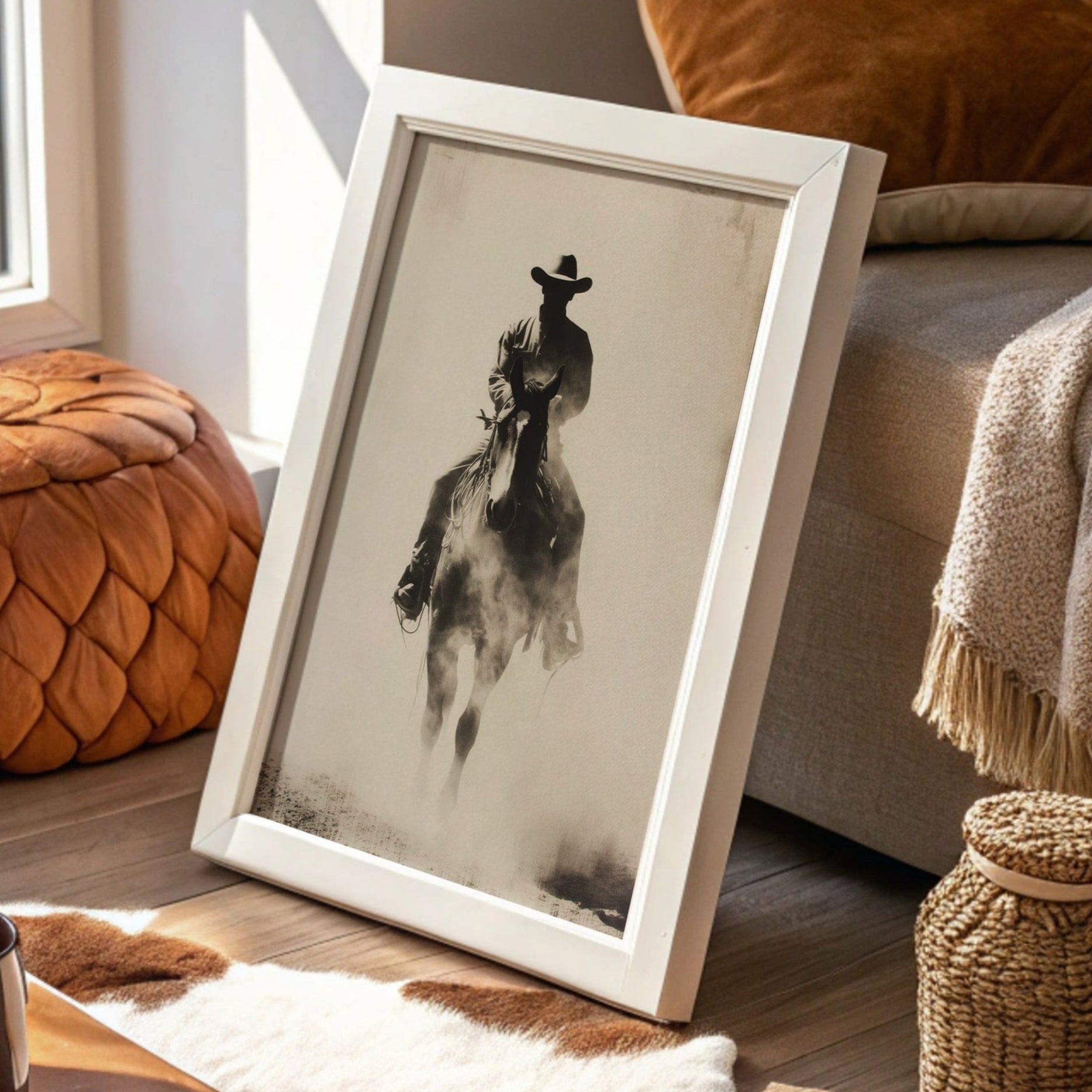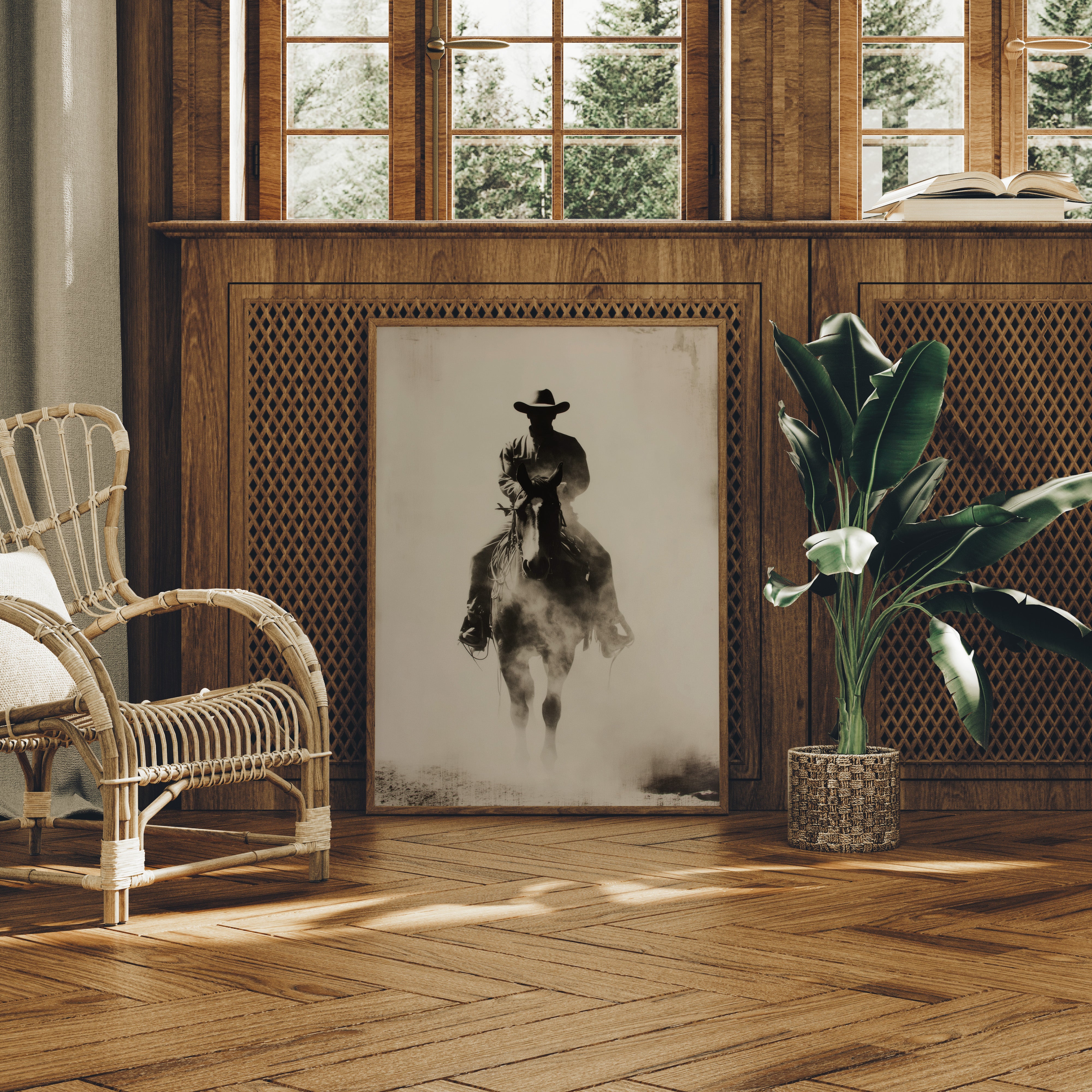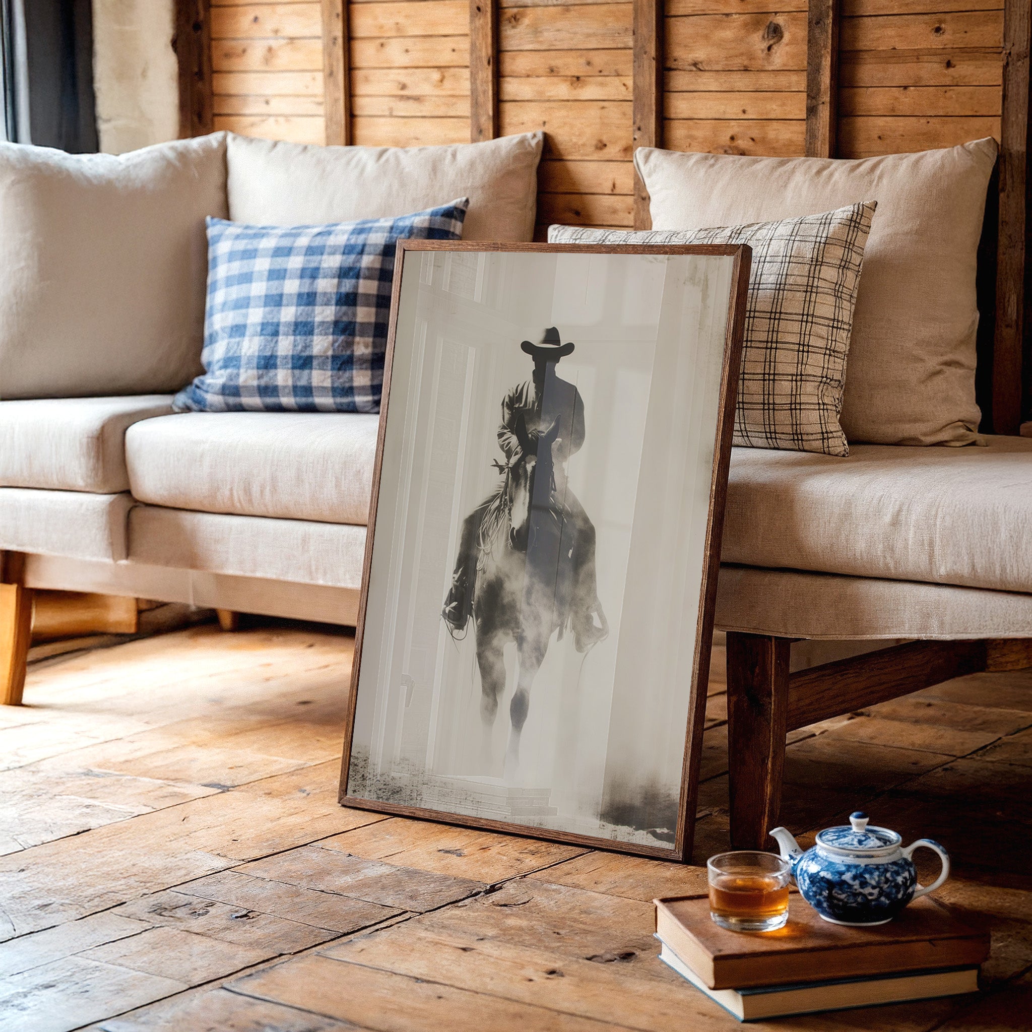 A lone rider emerges through swirling dust, his silhouette stark against the misty backdrop. The black and white photograph captures raw western energy, with the horse and rider moving as one through the ethereal haze. This striking image embodies the untamed spirit of the American West, where adventure and solitude dance together in perfect harmony. An ideal statement piece for a modern ranch house, rustic office, or any space seeking to capture the romantic essence of western heritage.