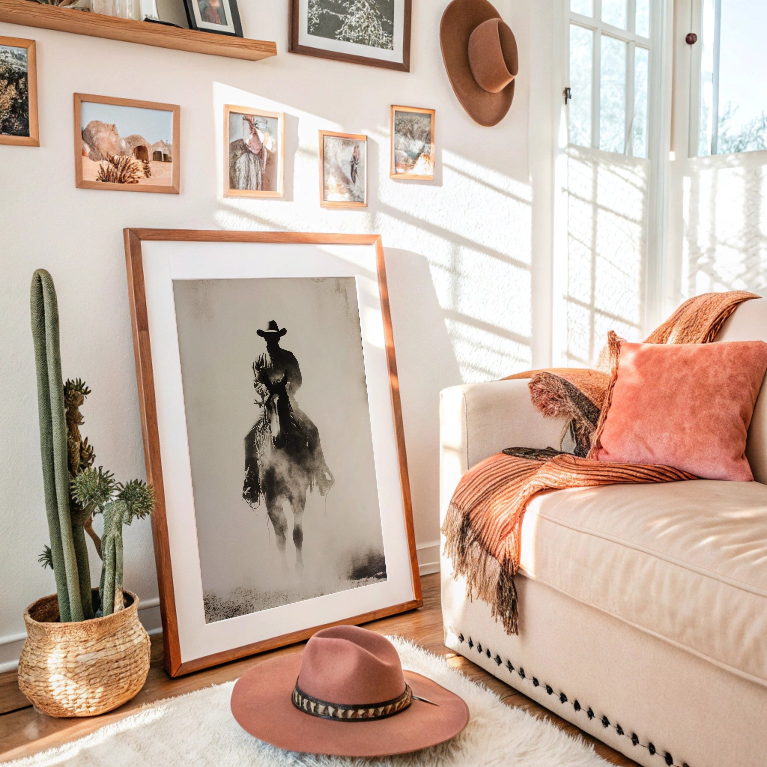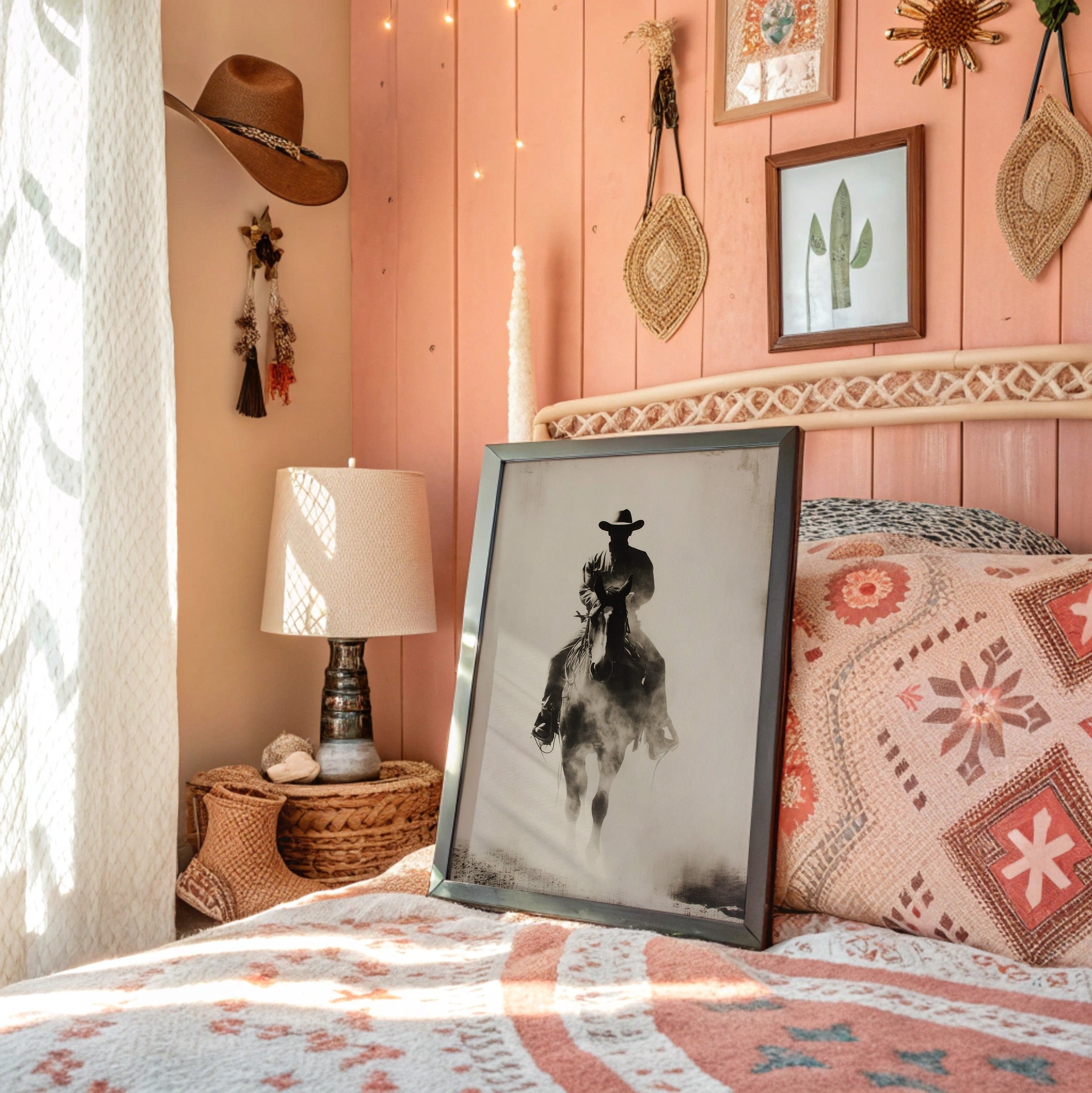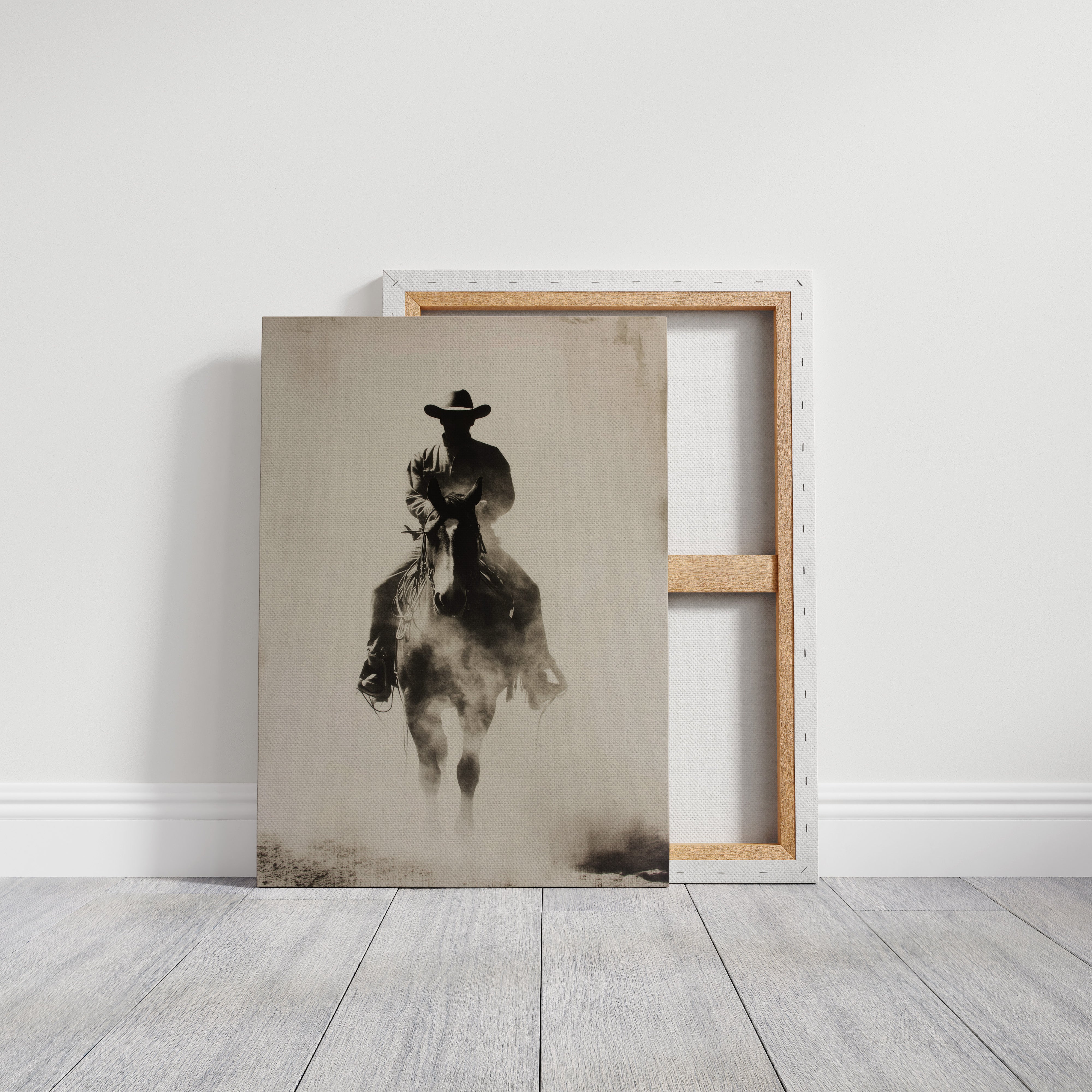 A lone rider emerges through swirling dust, his silhouette stark against the misty backdrop. The black and white photograph captures raw western energy, with the horse and rider moving as one through the ethereal haze. This striking image embodies the untamed spirit of the American West, where adventure and solitude dance together in perfect harmony. An ideal statement piece for a modern ranch house, rustic office, or any space seeking to capture the romantic essence of western heritage.