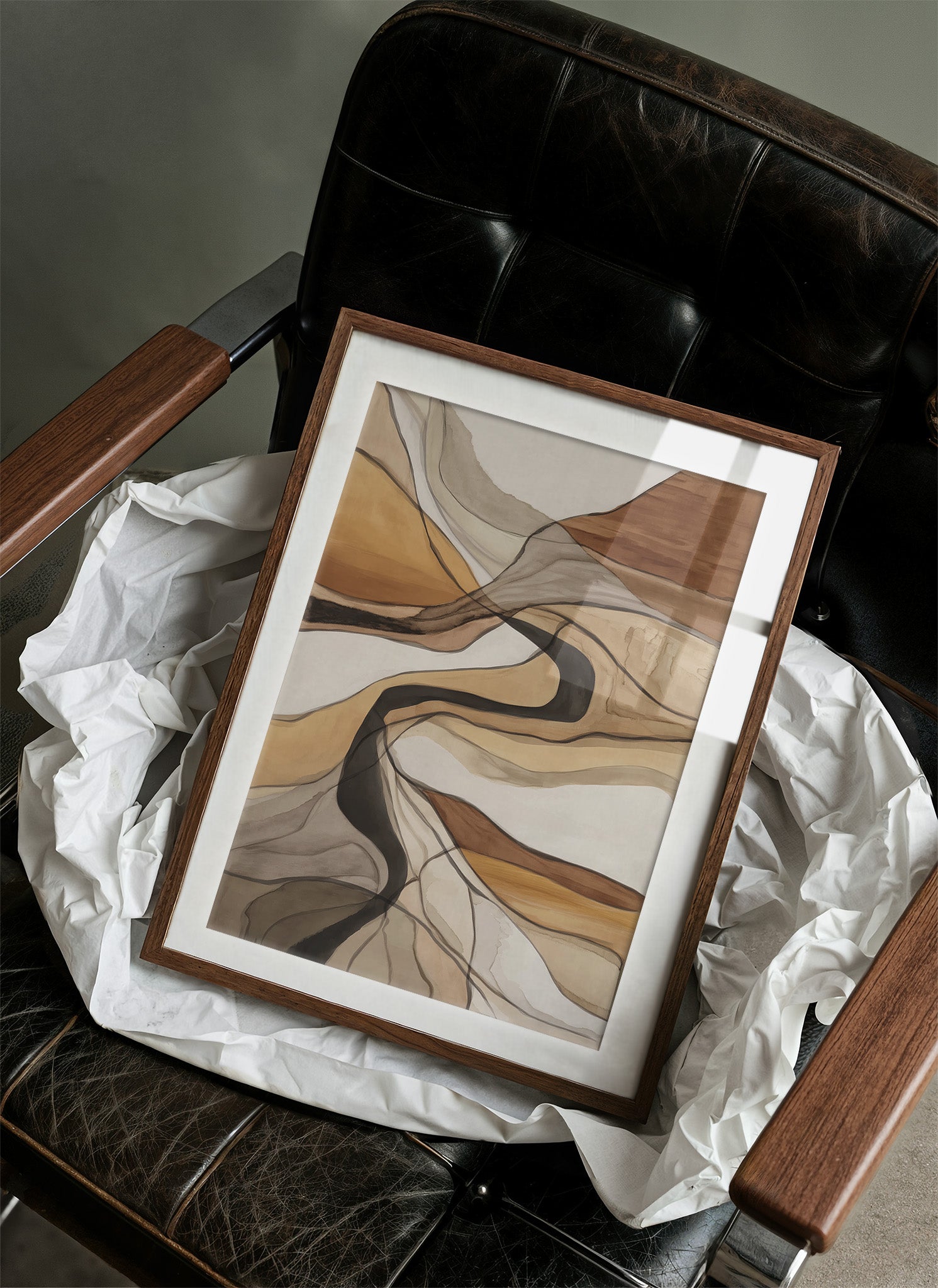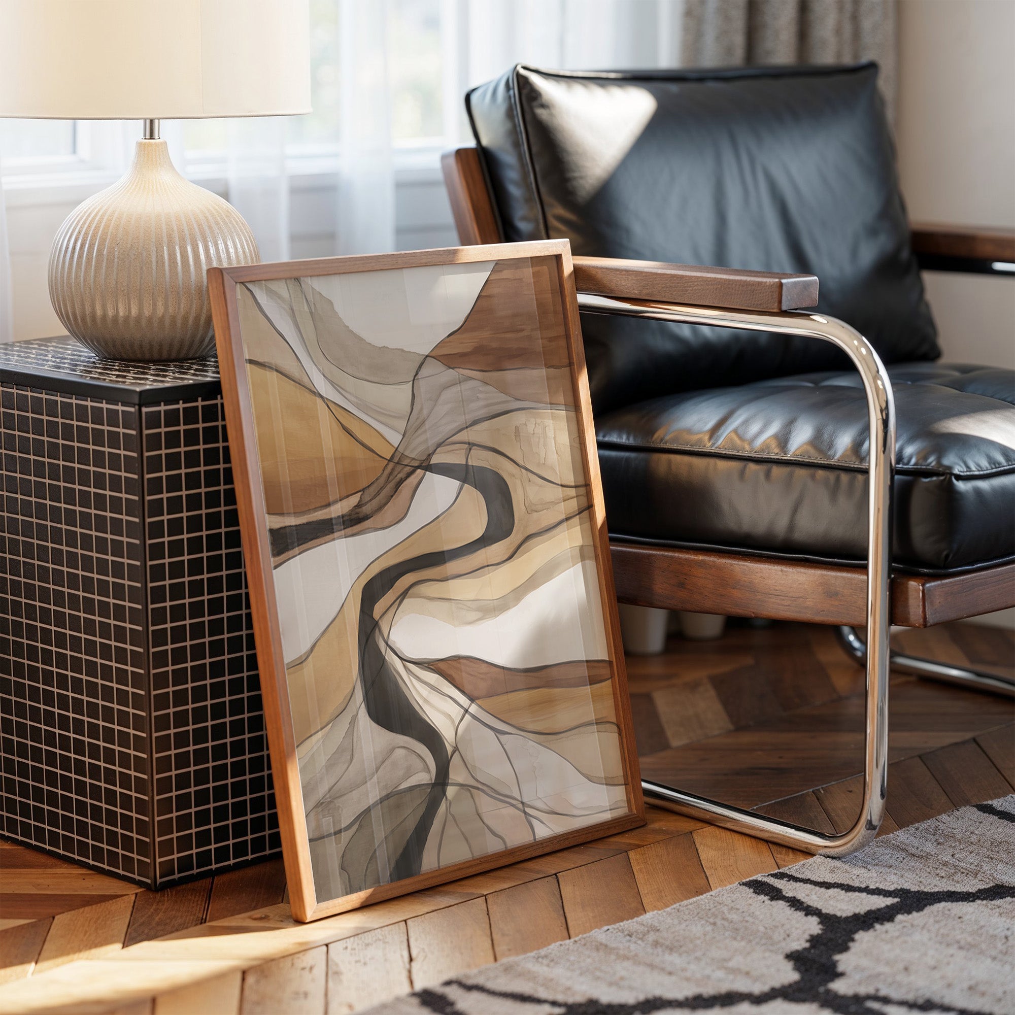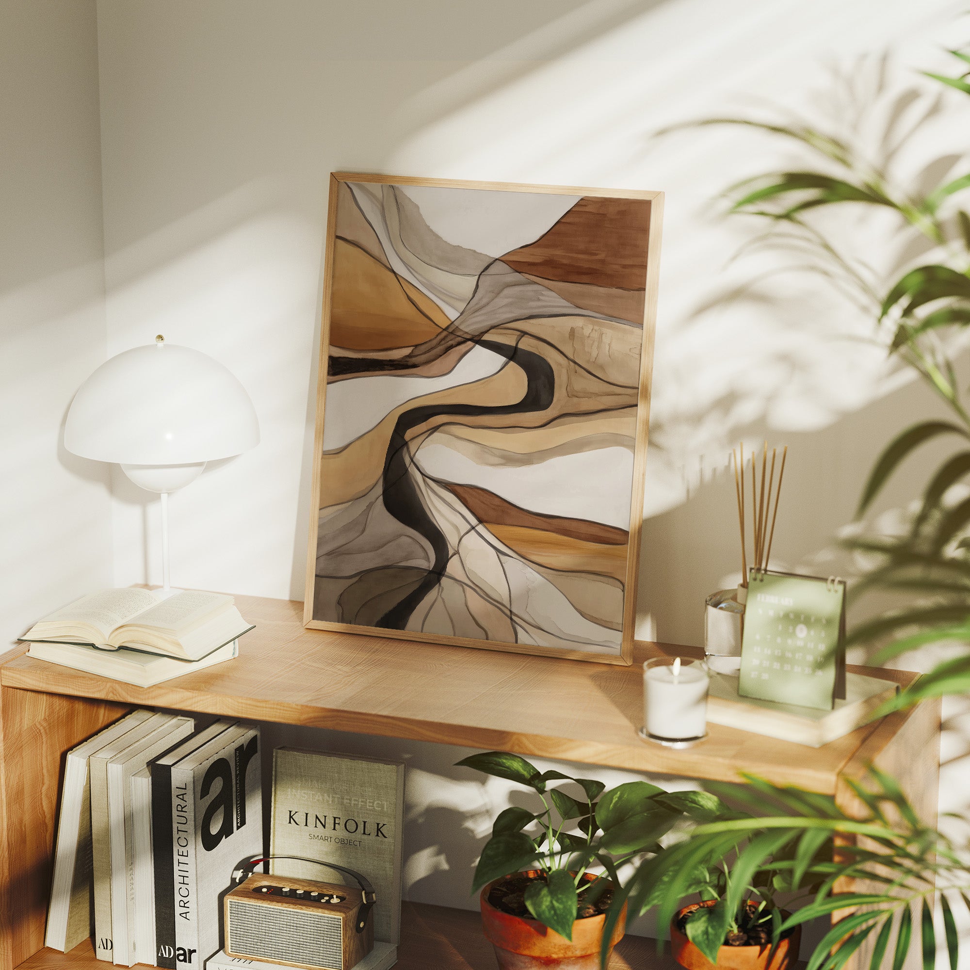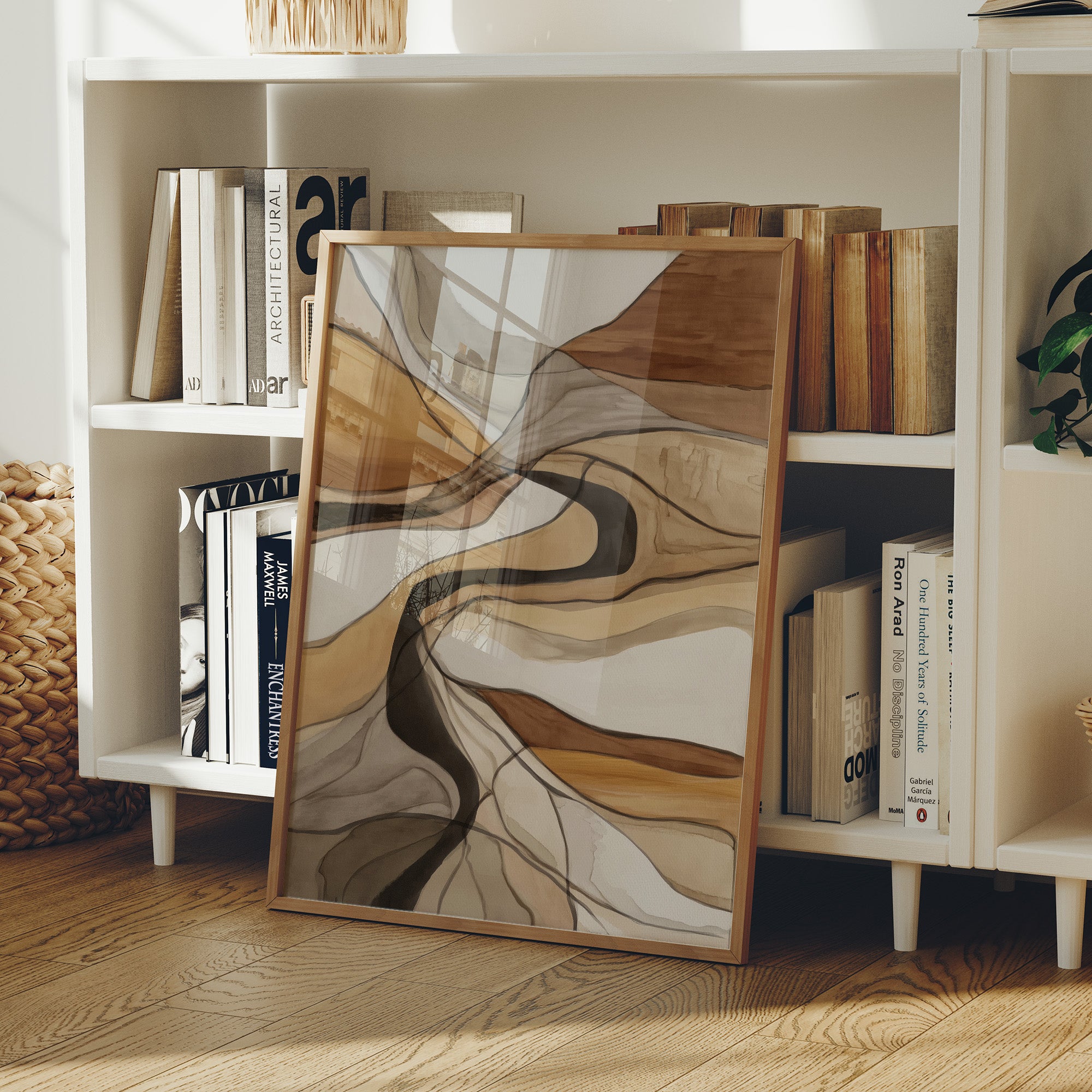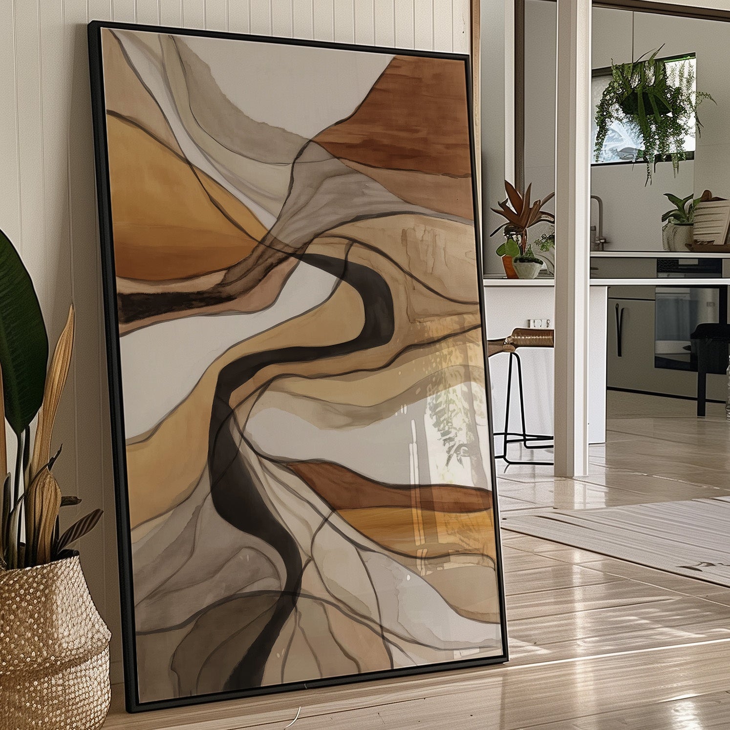 Gentle curves of ochre and umber flow like ancient riverbeds carved through desert canyons. The abstract landscape unfolds in fluid layers of warm earth tones, creating a meditative journey through geological time. Dark ribbons weave between sandy shores and chalky cliffs, while soft shadows play at the edges of each graceful bend, suggesting the patient work of water and wind. This contemporary piece brings natural serenity to a modern reading nook or creative workspace, where its flowing lines and soothing palette create a perfect backdrop for quiet contemplation.
