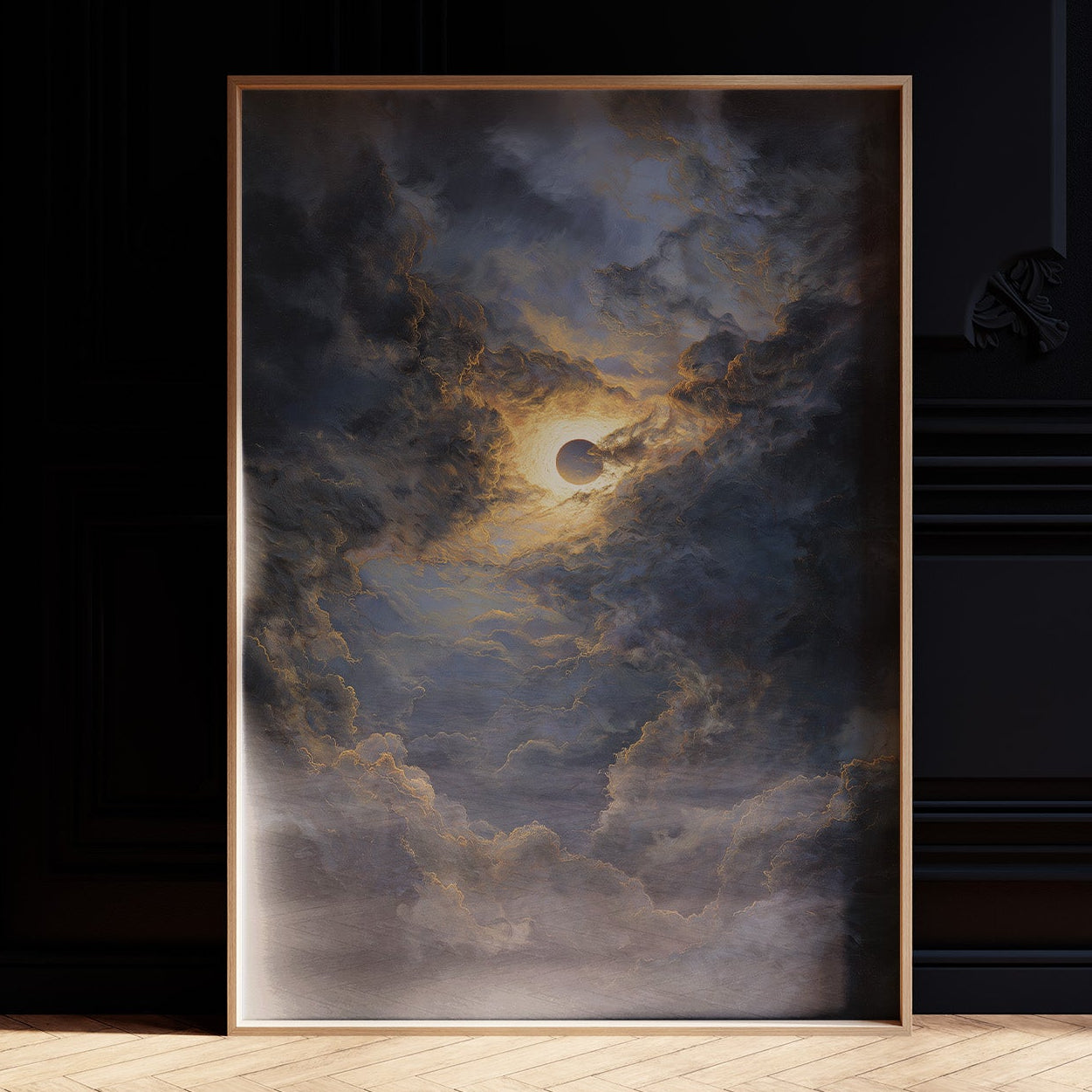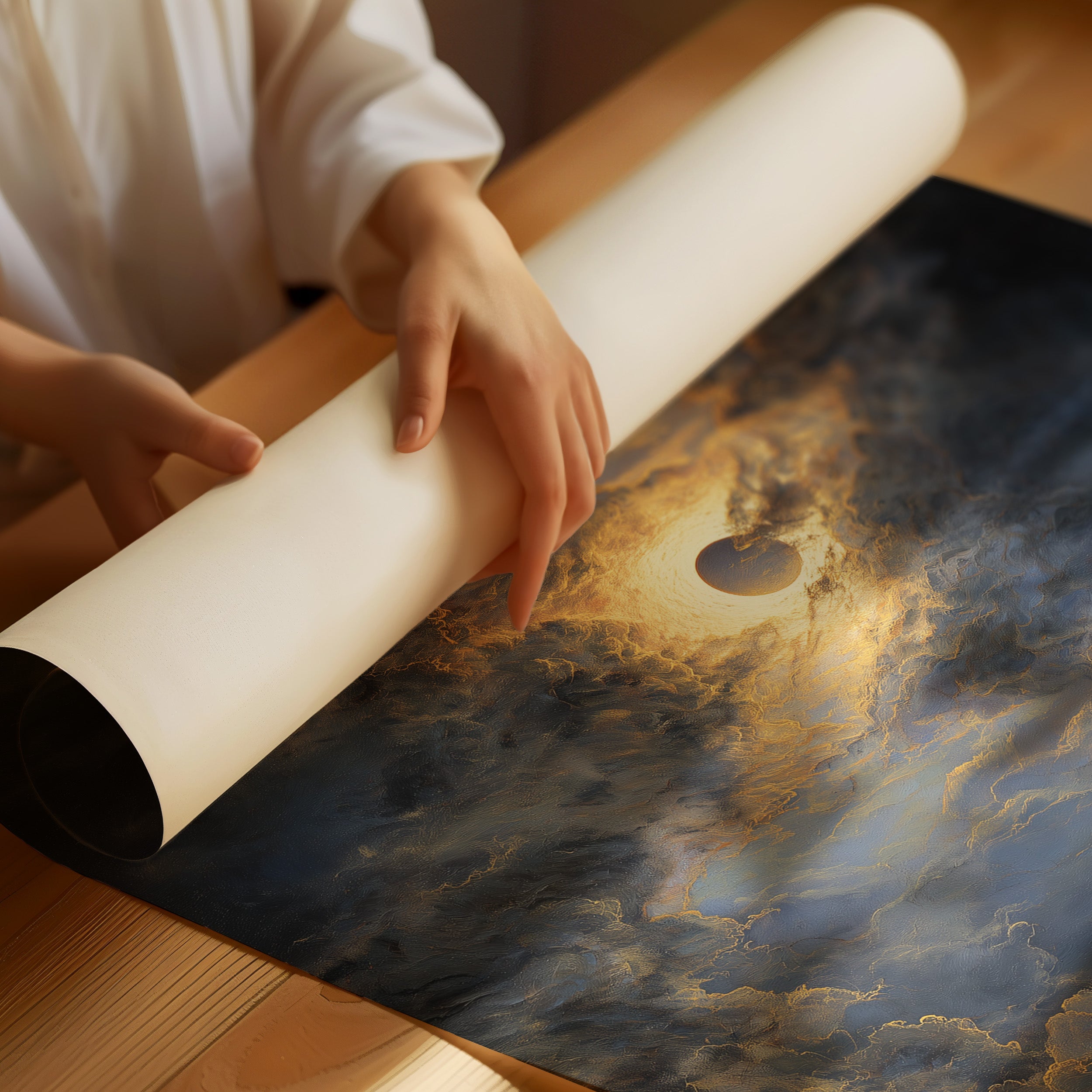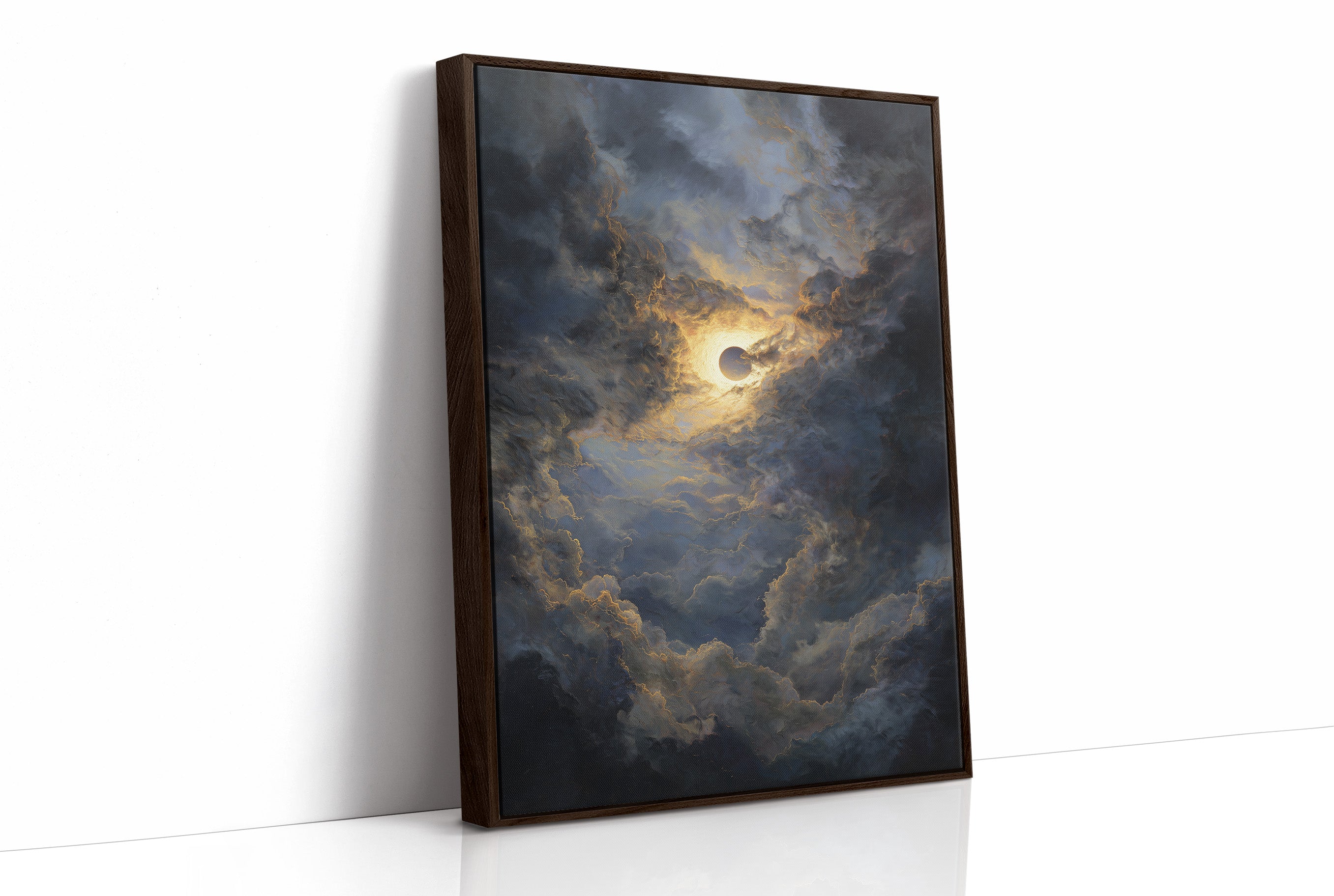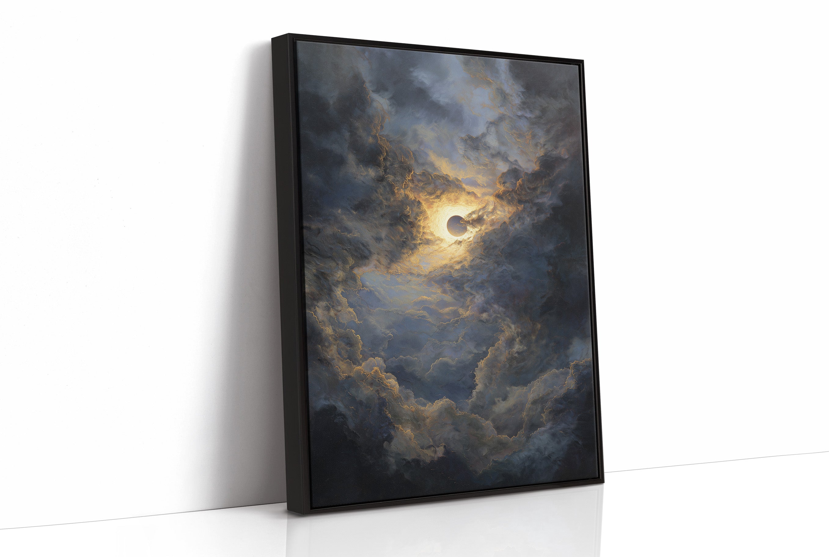 Light fights against darkness in this celestial drama, where a luminous eclipse pierces through tumultuous clouds. The painting captures that breathtaking moment when golden rays illuminate the edges of billowing storm formations, creating a sublime contrast between light and shadow. Deep blues and smoky grays swirl around the central glow, evoking both the power of nature and the transcendence of cosmic events. This statement piece commands attention in minimalist living spaces, creating a focal point that brings depth and contemplation to contemporary interiors.