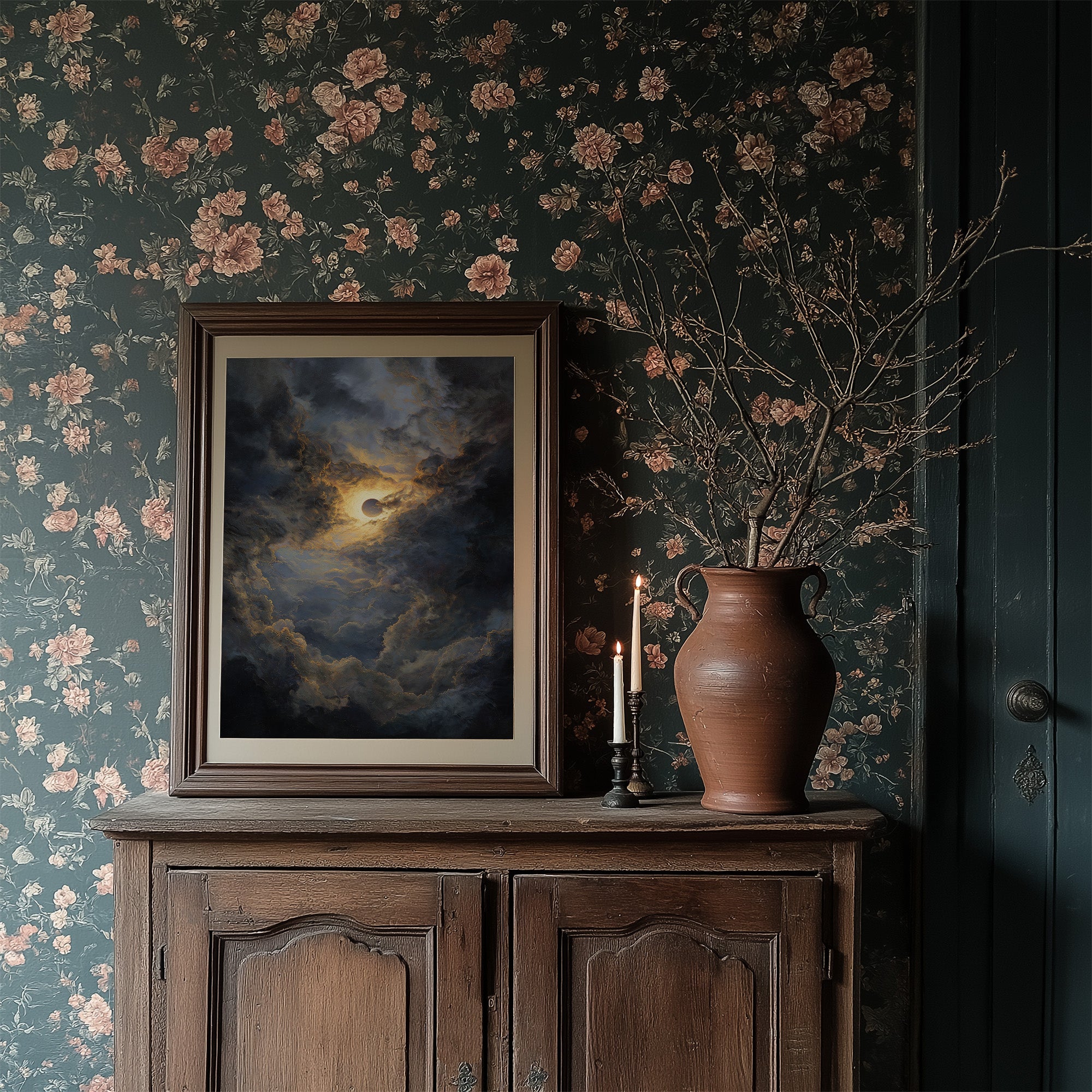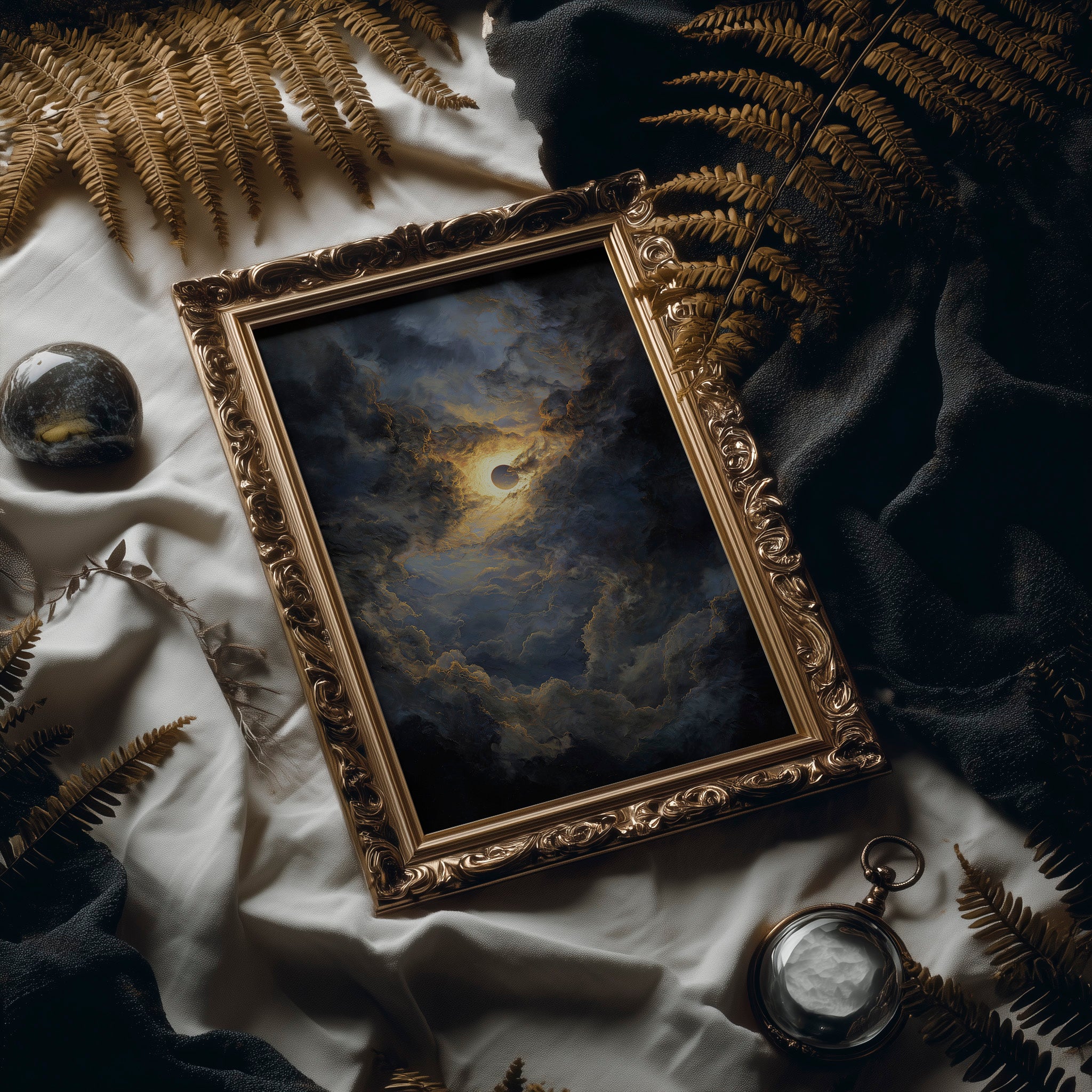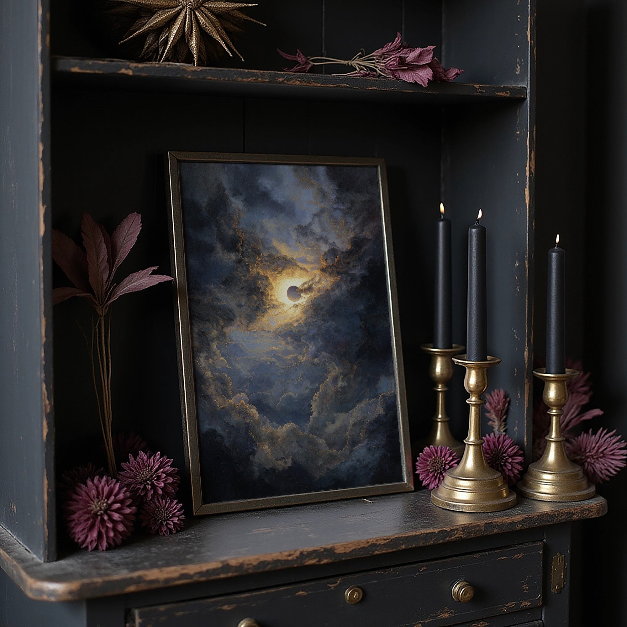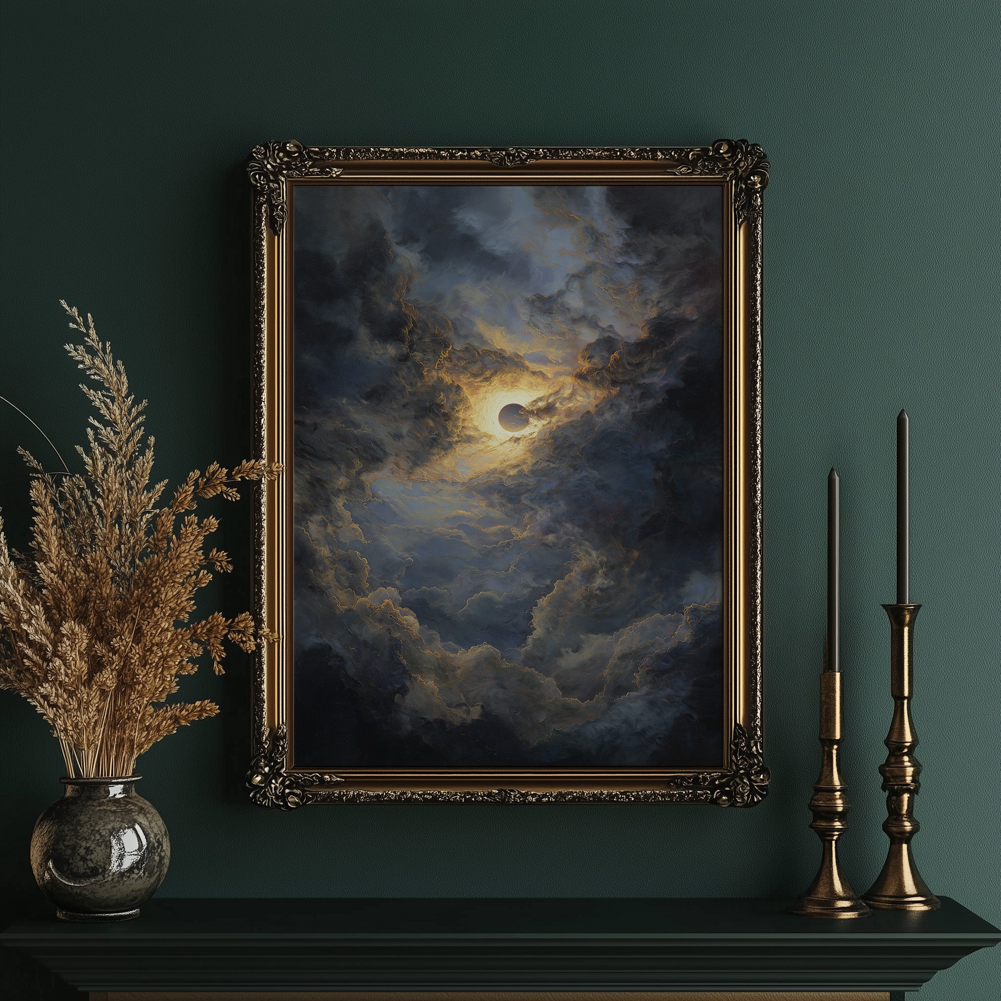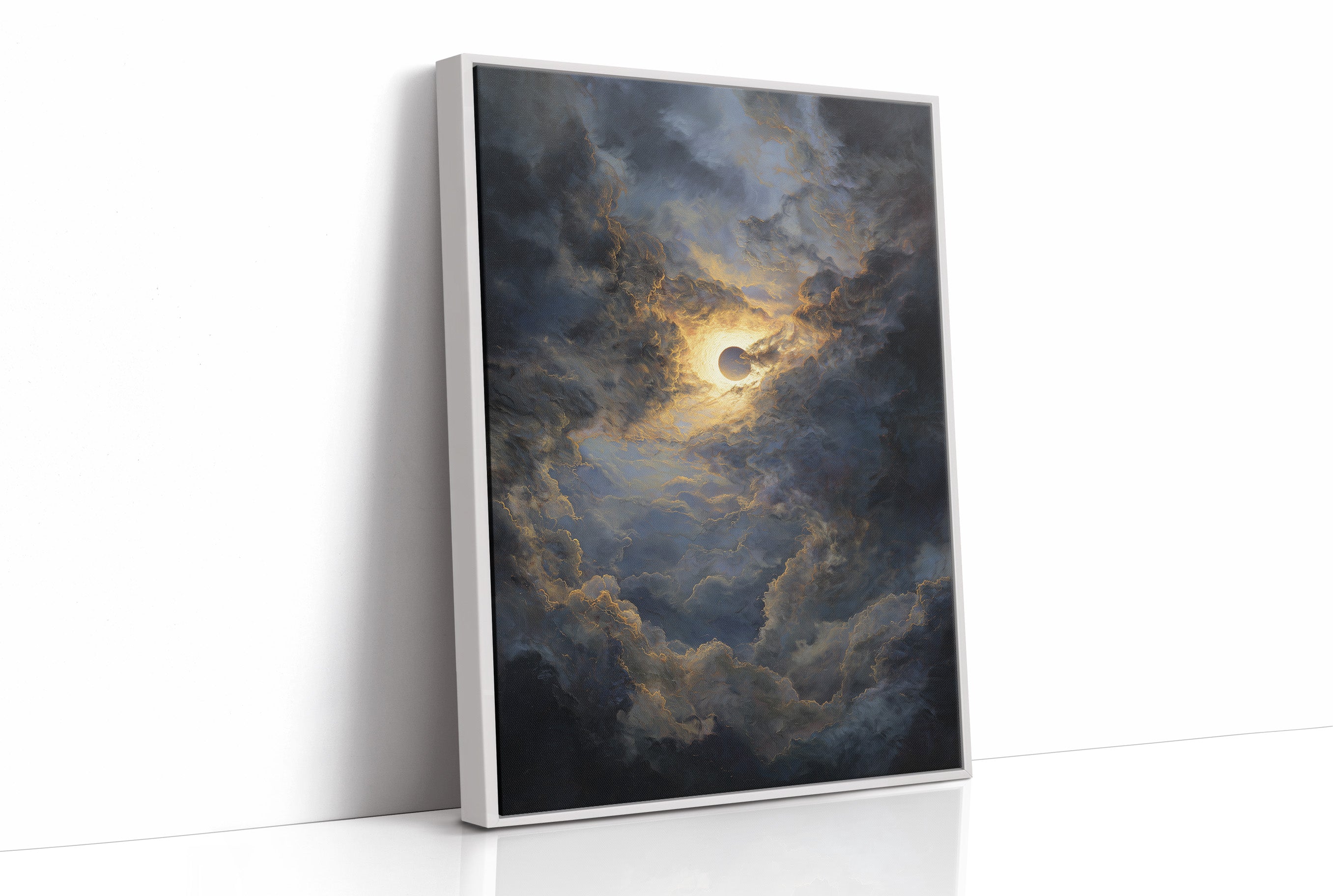 Light fights against darkness in this celestial drama, where a luminous eclipse pierces through tumultuous clouds. The painting captures that breathtaking moment when golden rays illuminate the edges of billowing storm formations, creating a sublime contrast between light and shadow. Deep blues and smoky grays swirl around the central glow, evoking both the power of nature and the transcendence of cosmic events. This statement piece commands attention in minimalist living spaces, creating a focal point that brings depth and contemplation to contemporary interiors.