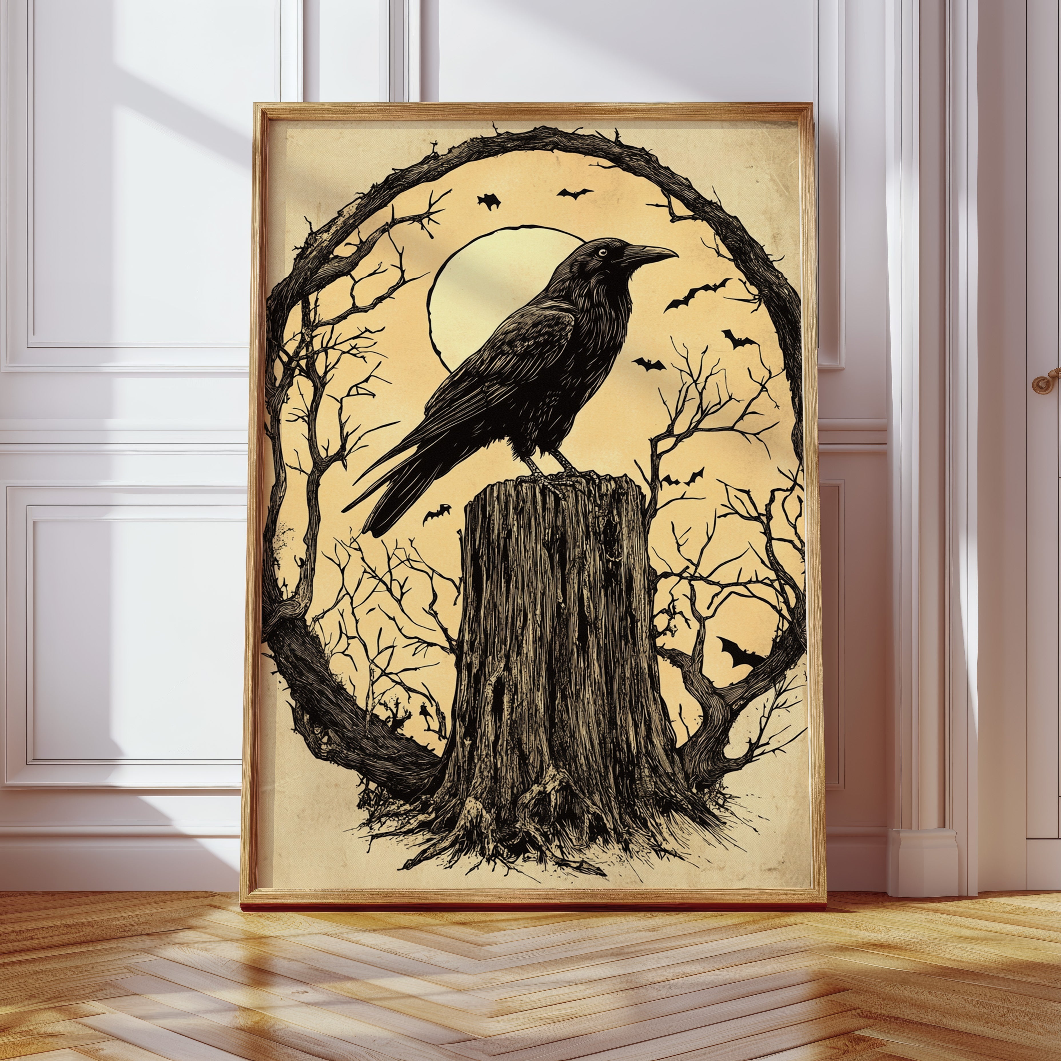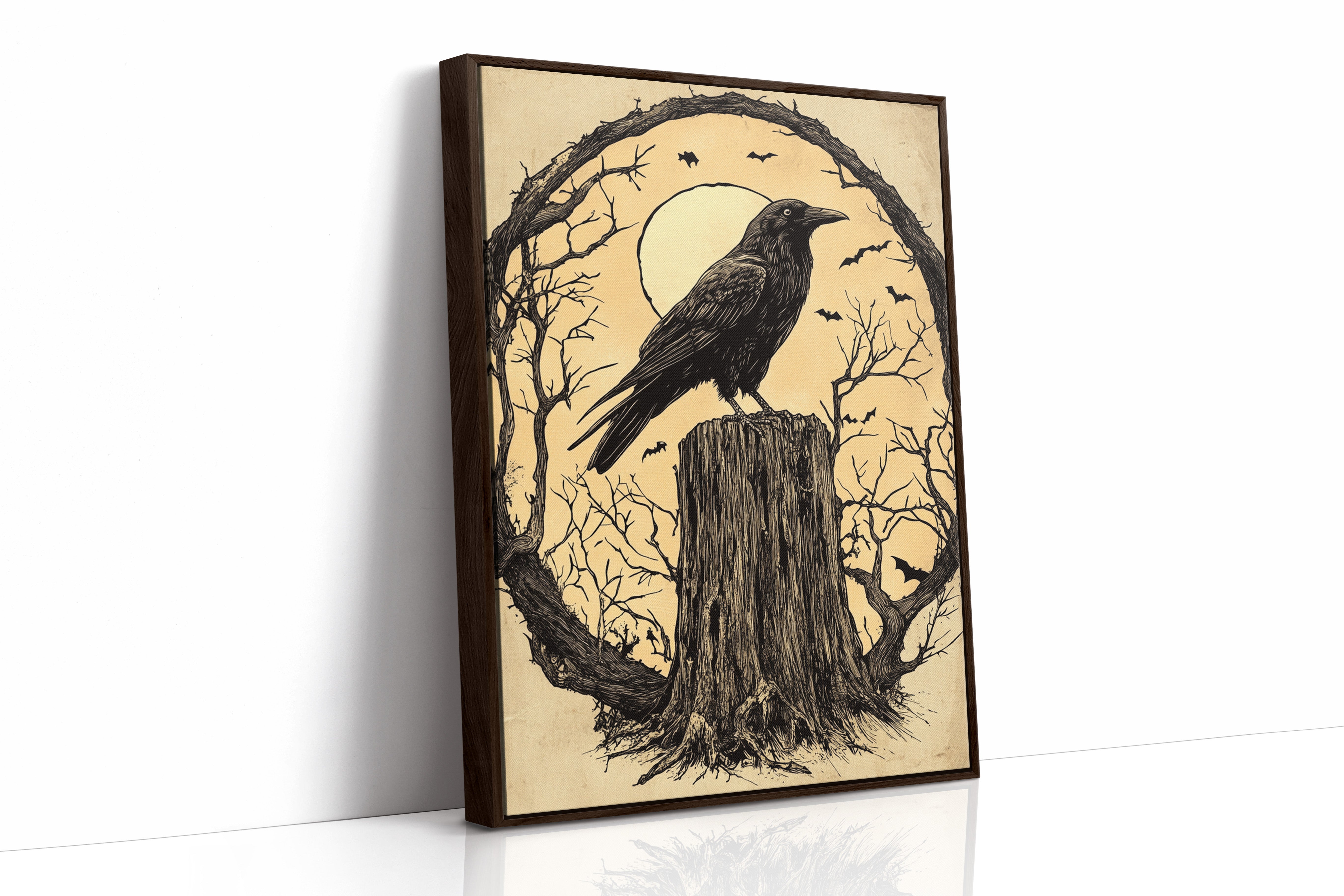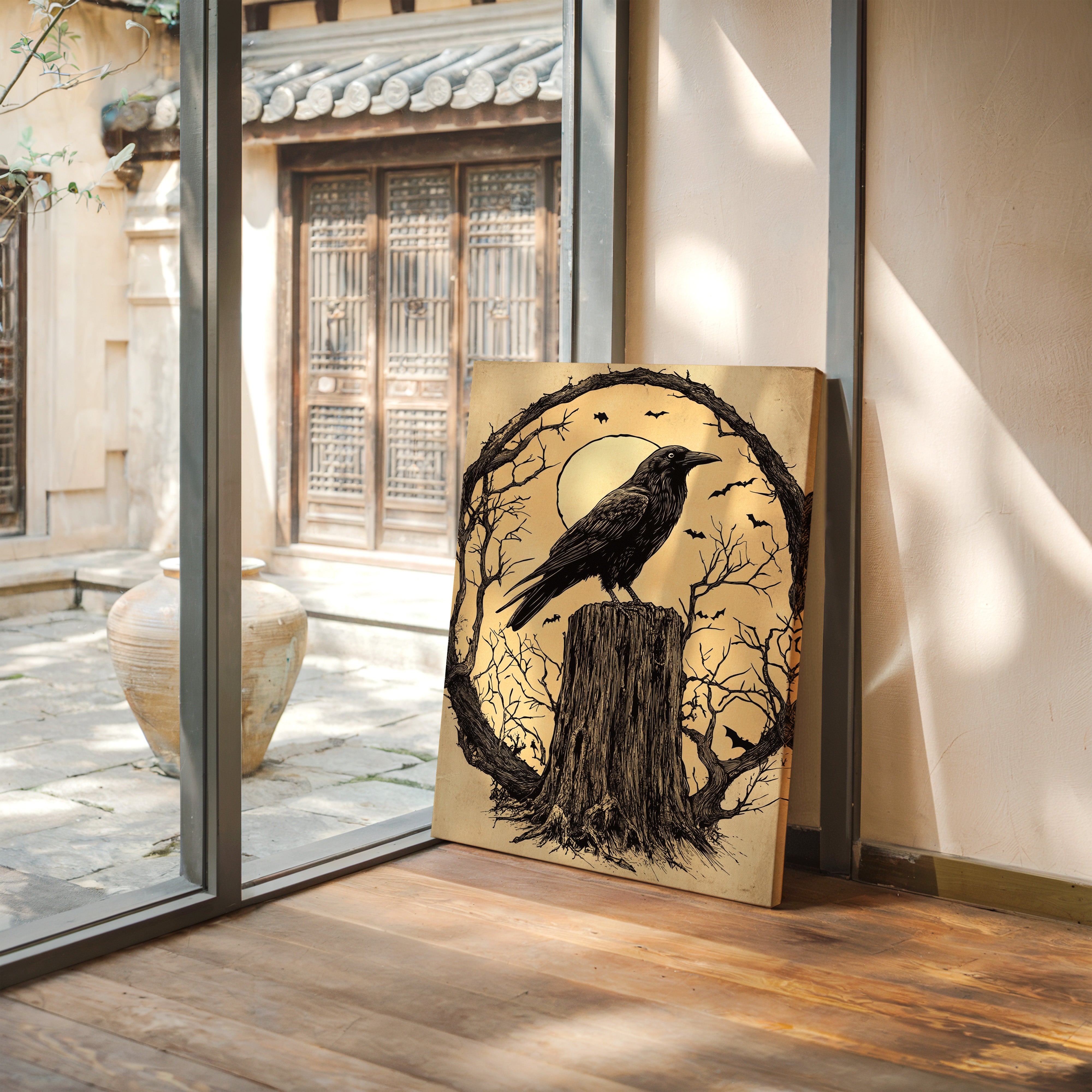 Step into a world where mystery and nature entwine under a haunting moonlit sky. 'Eclipse of the Raven' captivates with its striking portrayal of a raven perched on a weathered stump, silhouetted against an amber glow. The intricate details of barren branches and distant bats evoke a sense of gothic elegance and wild beauty. Perfect for those who cherish the allure of the mysterious and the untamed, this piece brings an enigmatic charm to any space.