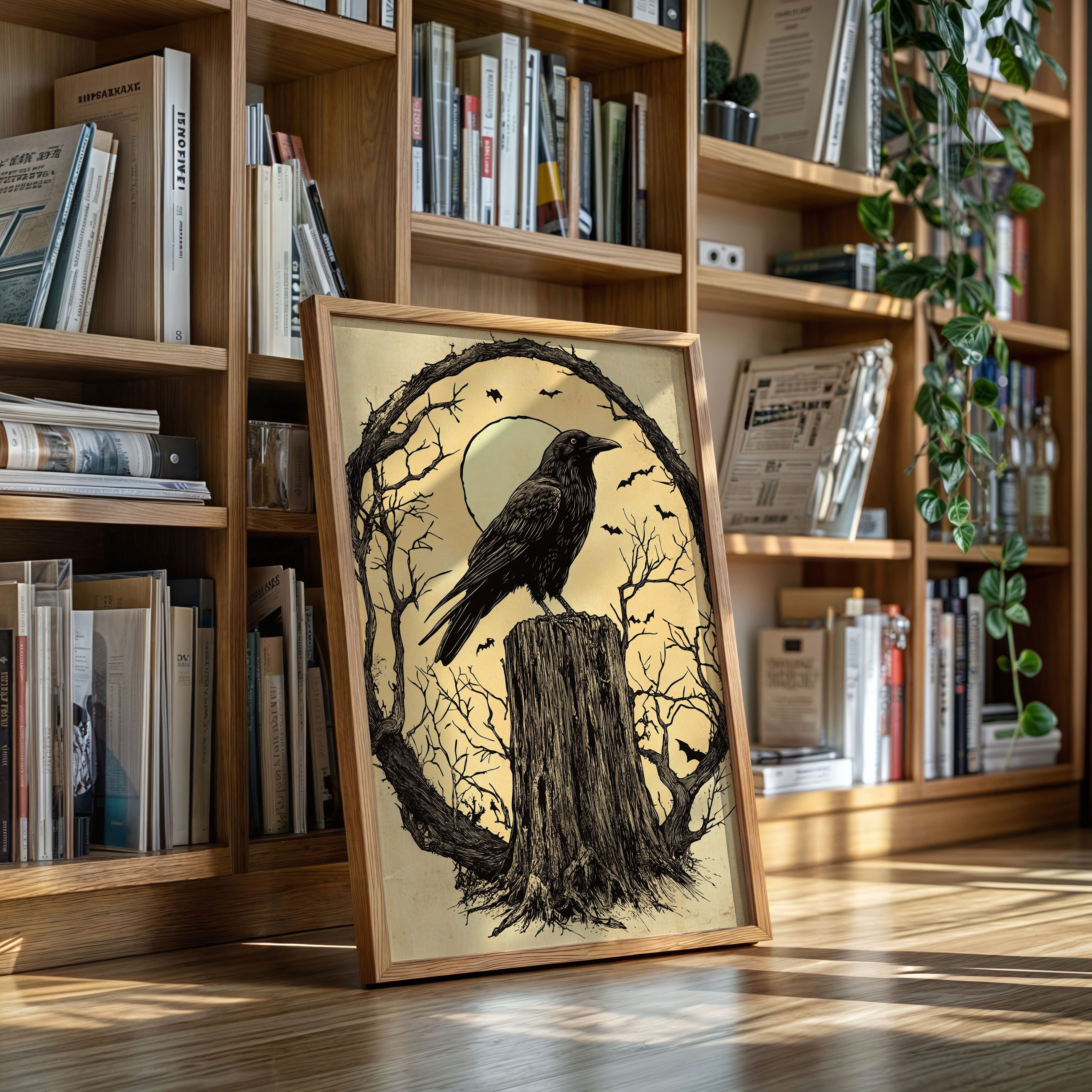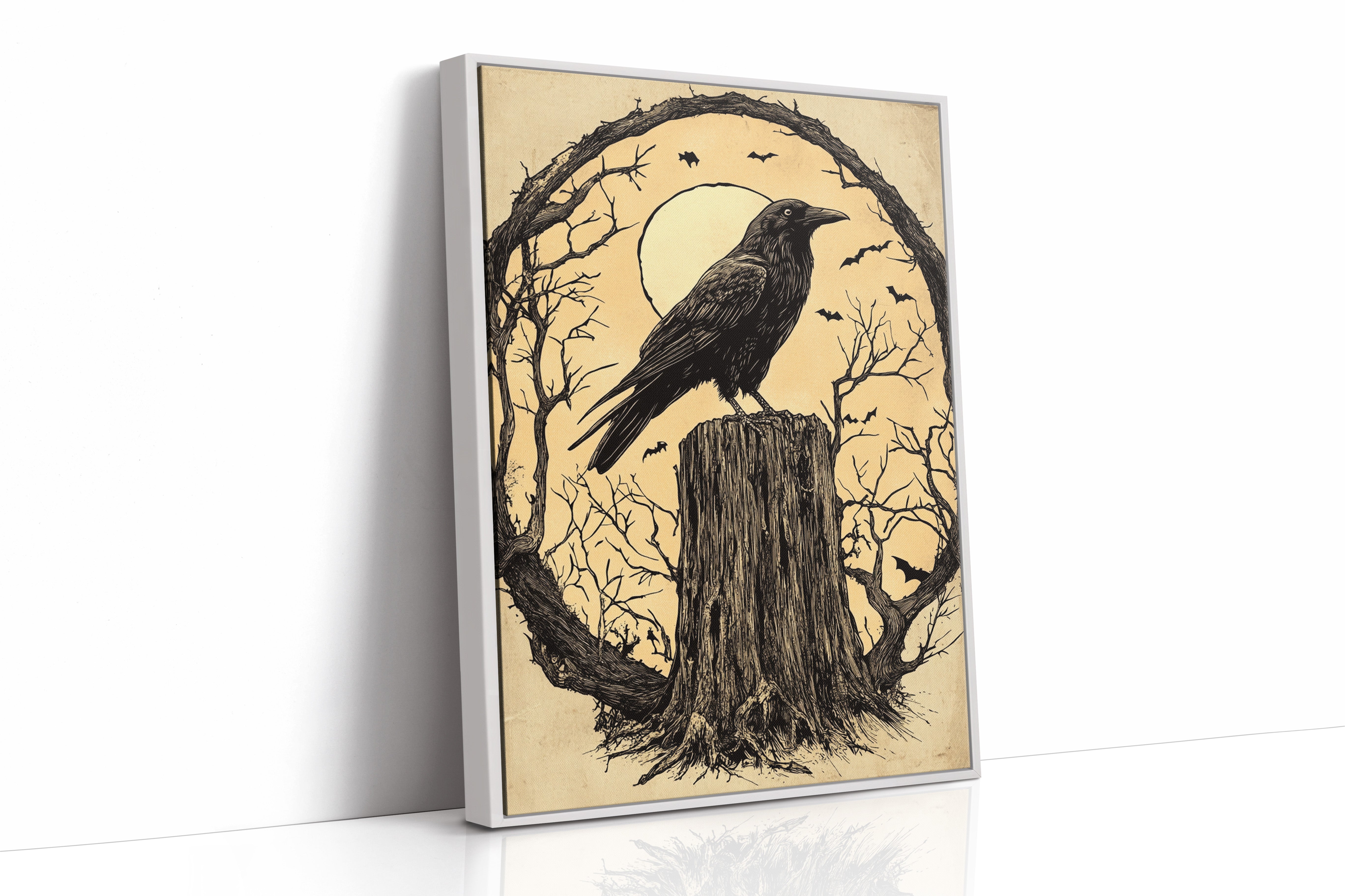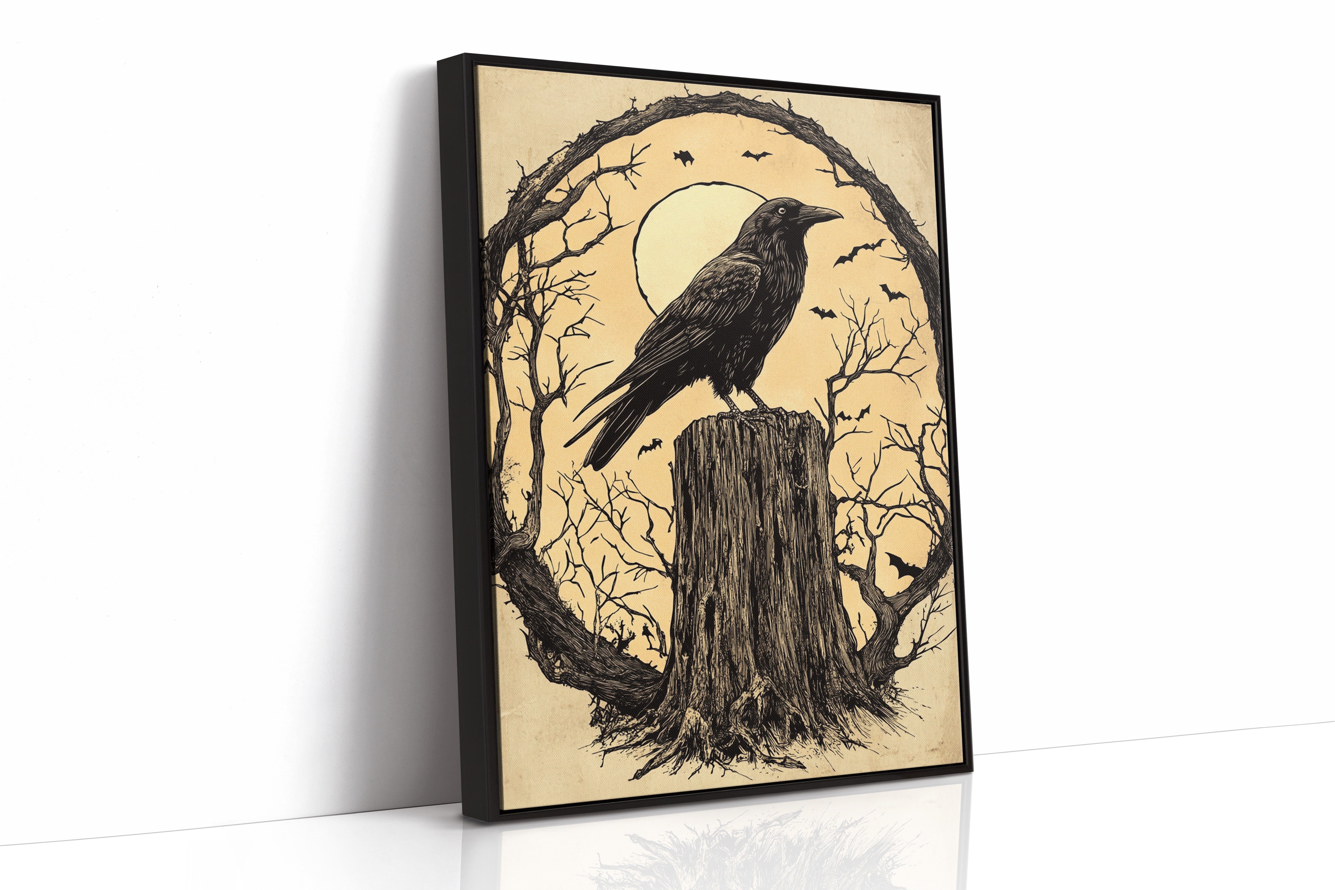 Step into a world where mystery and nature entwine under a haunting moonlit sky. 'Eclipse of the Raven' captivates with its striking portrayal of a raven perched on a weathered stump, silhouetted against an amber glow. The intricate details of barren branches and distant bats evoke a sense of gothic elegance and wild beauty. Perfect for those who cherish the allure of the mysterious and the untamed, this piece brings an enigmatic charm to any space.