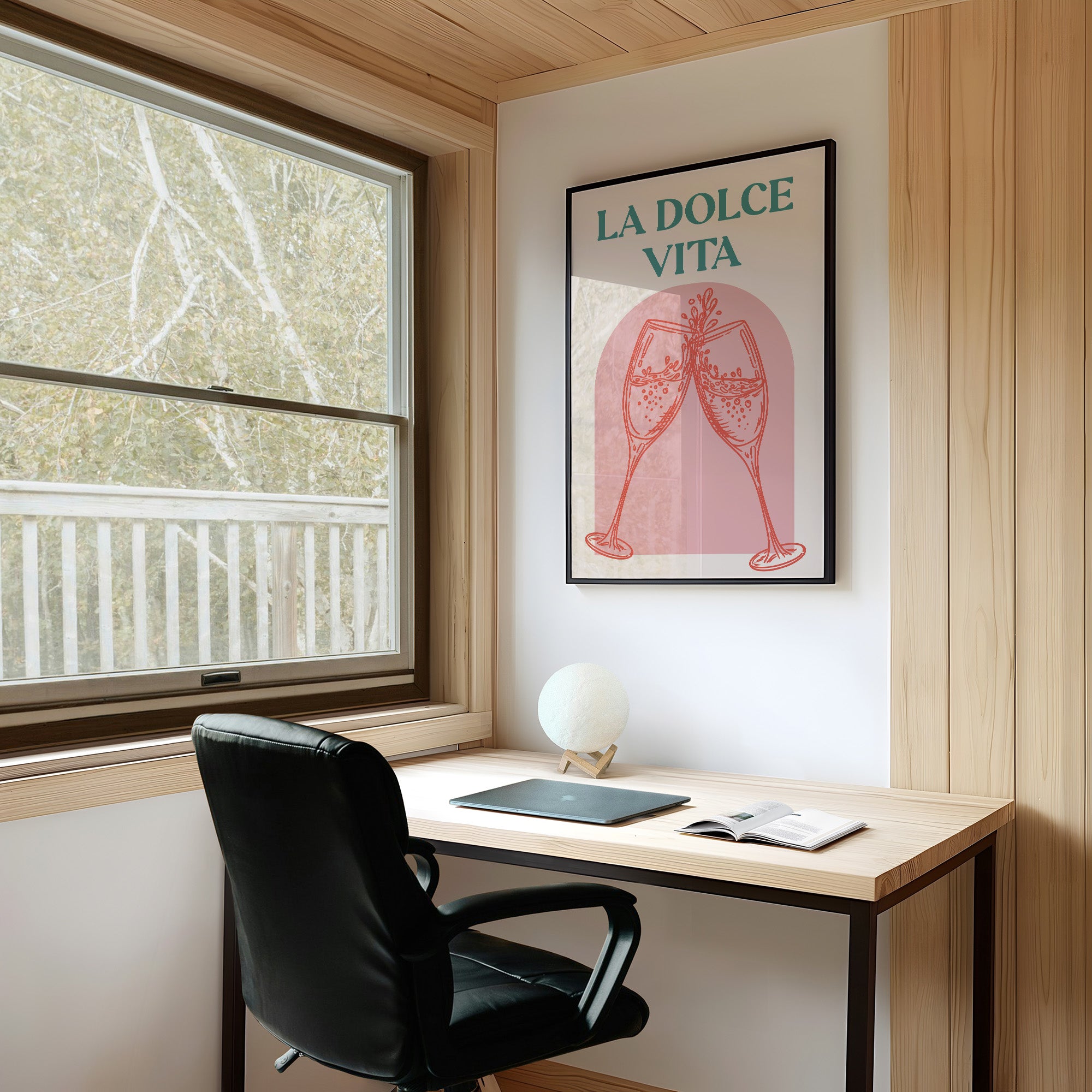 A minimalist illustration featuring two champagne flutes toasting against a soft pink arch background. The glasses are rendered in a vibrant coral-red line drawing style, complete with bubbling champagne and splashing liquid at the point where they clink together. Above this celebratory image, the phrase "LA DOLCE VITA" is elegantly displayed in teal typography, invoking the Italian concept of "the sweet life" and suggesting indulgence, pleasure, and living in the moment. The color palette of cream, pink, and teal creates a contemporary yet timeless aesthetic perfect for celebrating life's joyful occasions.