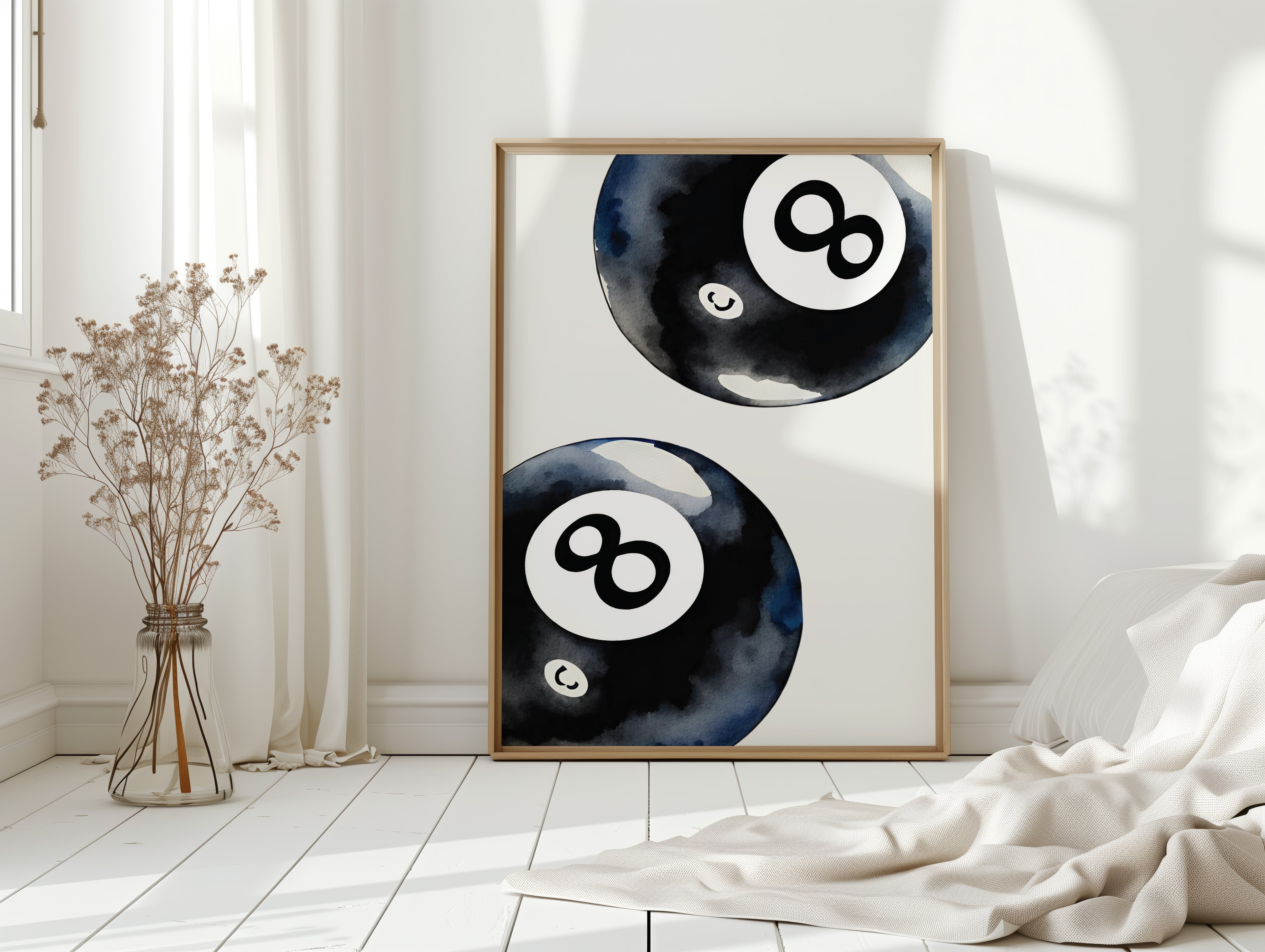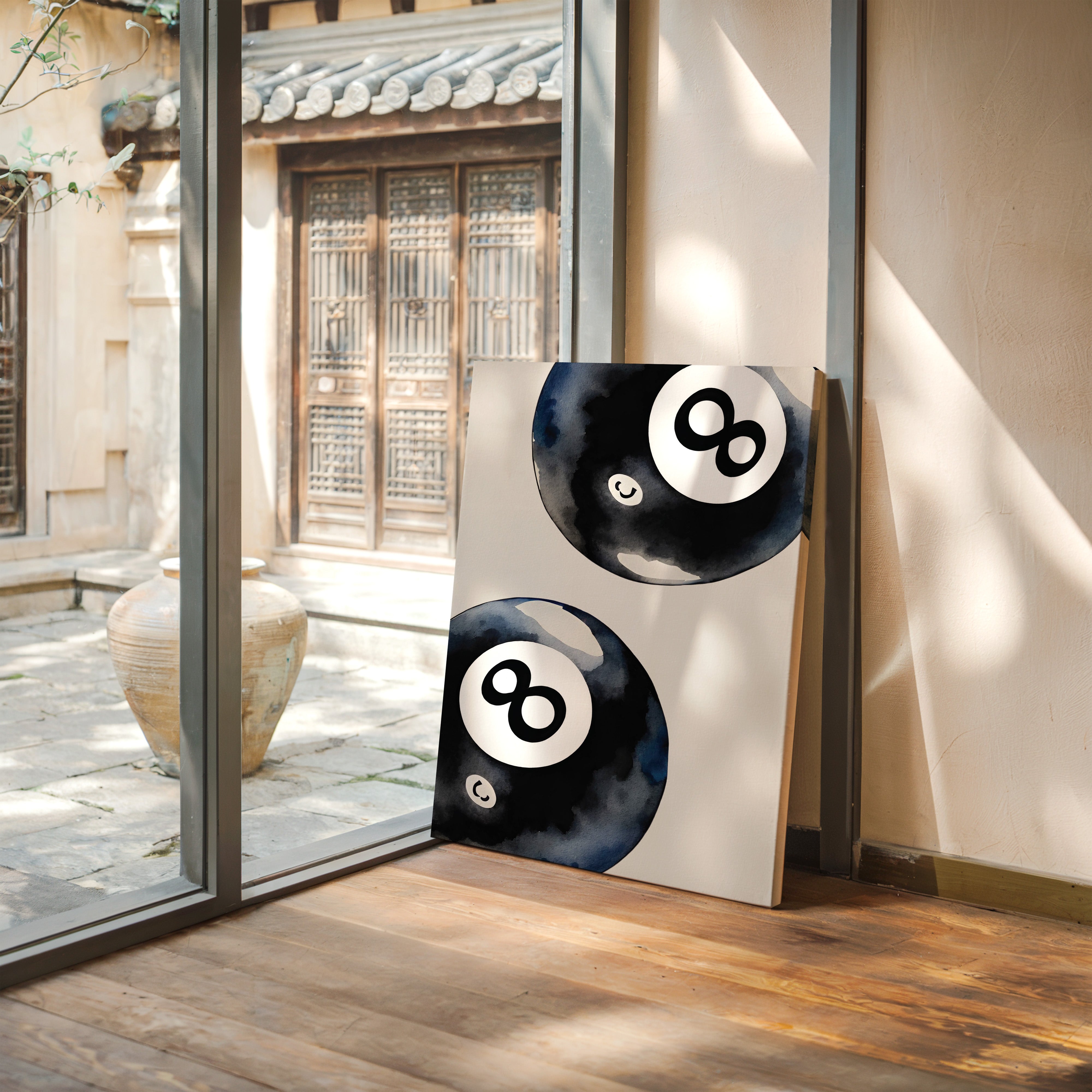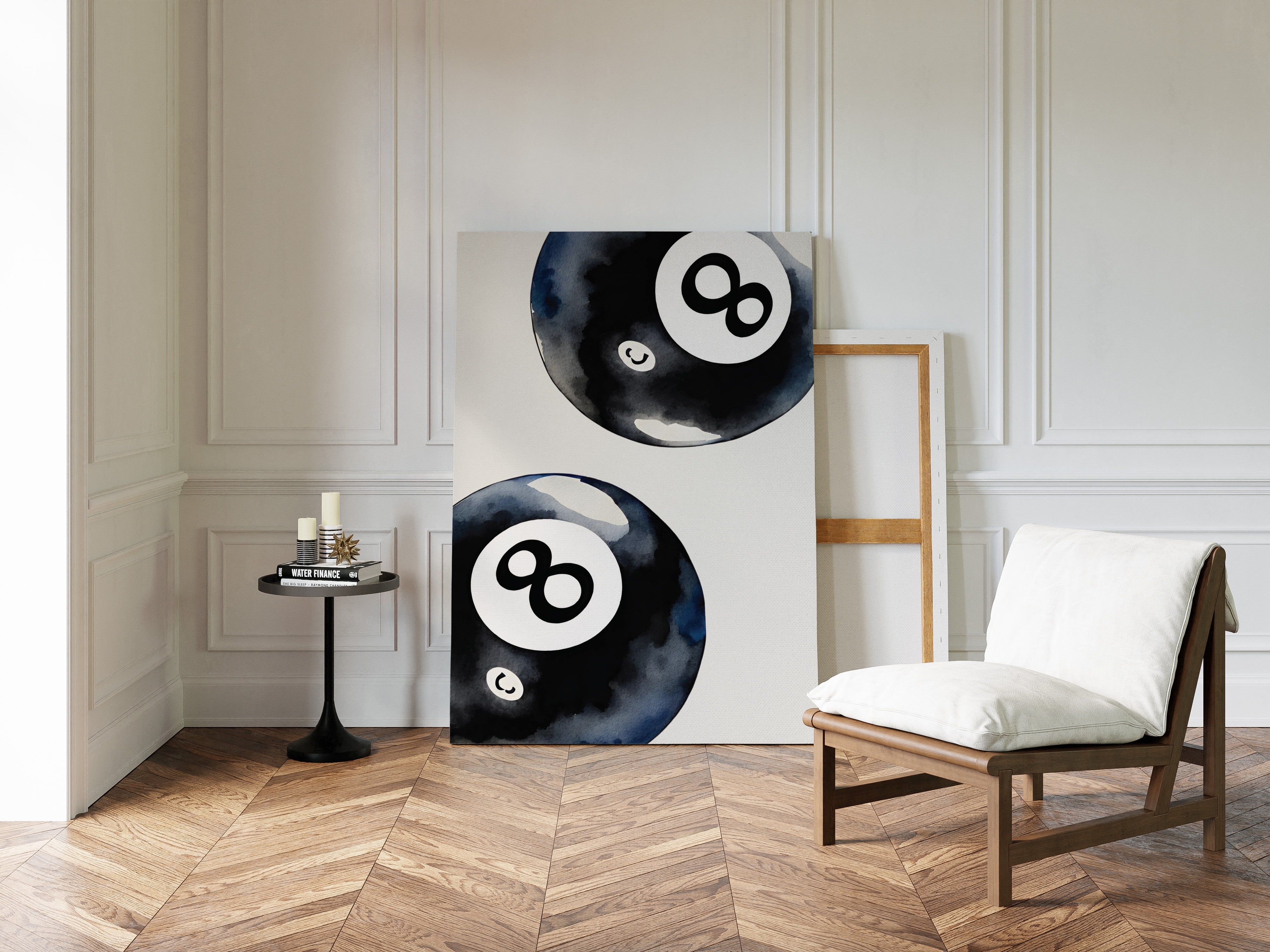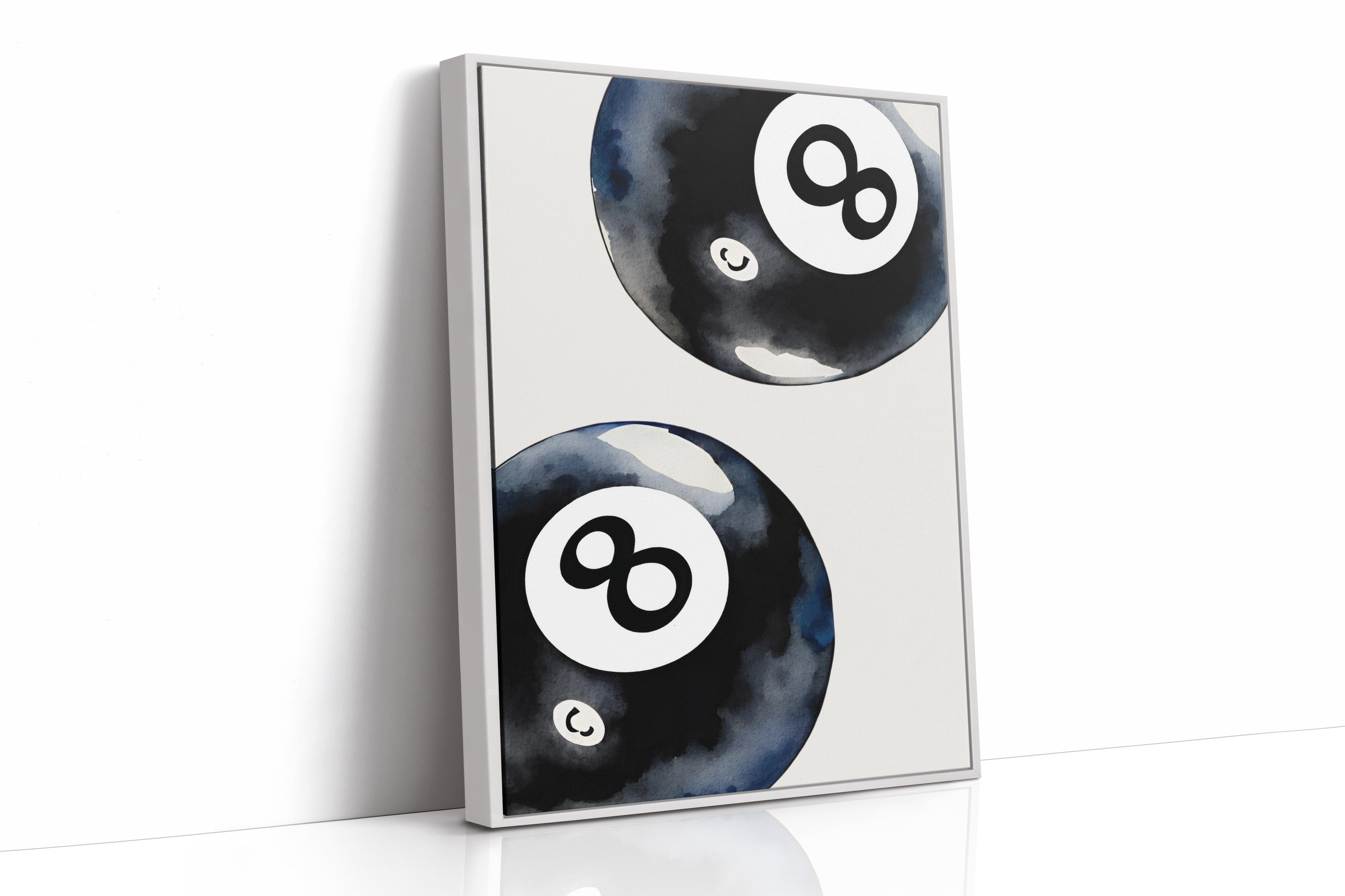 Deep indigo washes blend with stark white numerals, creating a mesmerizing dance of contrast and form. This piece from our Contemporary collection celebrates the iconic simplicity of game room culture with an artistic twist. The watercolor-like edges soften the geometric precision, while twin eight balls float in perfect harmony against a clean backdrop, suggesting both movement and stillness. The composition speaks to both playfulness and sophistication, making it an unexpected addition to modern interiors. This striking piece adds character to a home office, game room, or any space seeking a touch of refined whimsy.