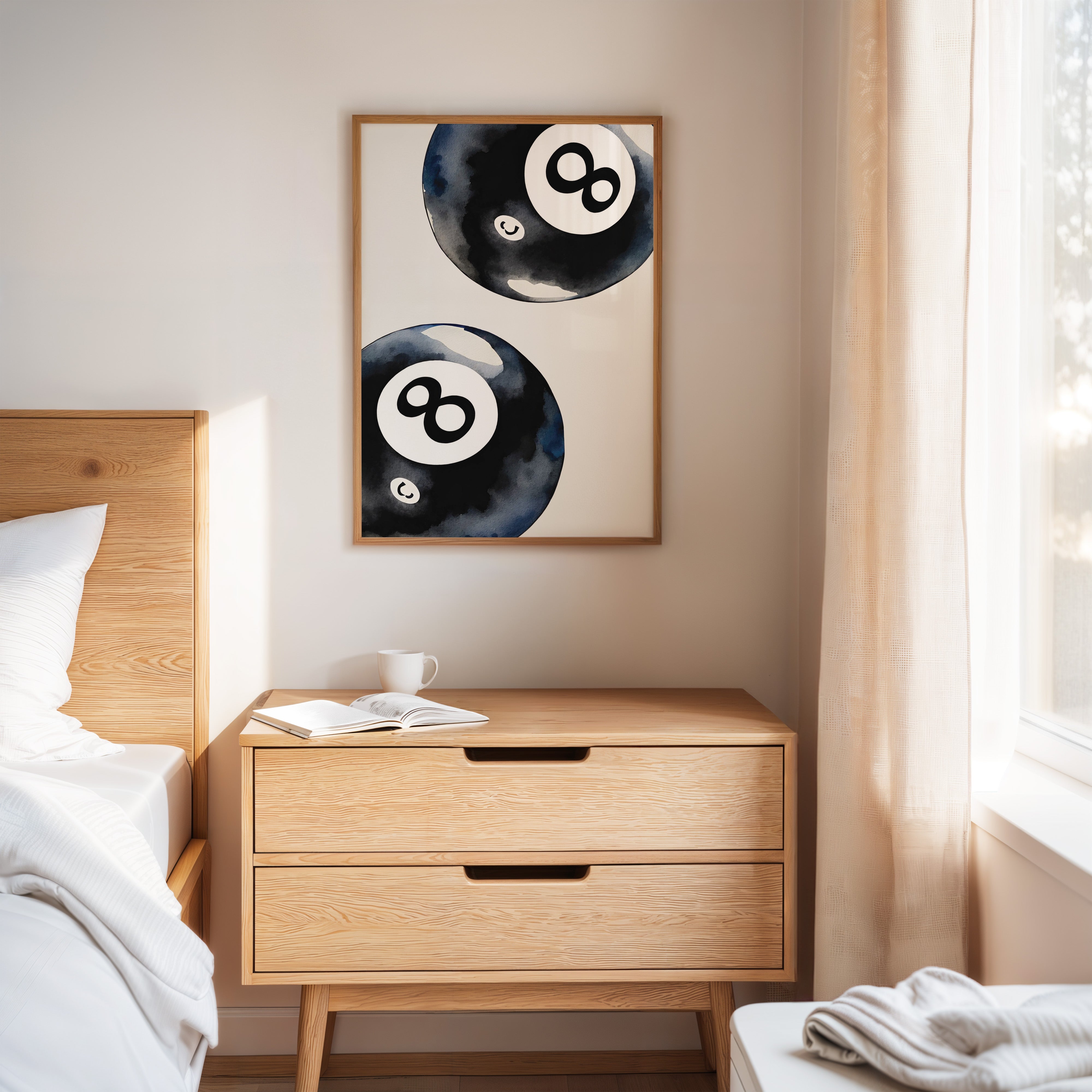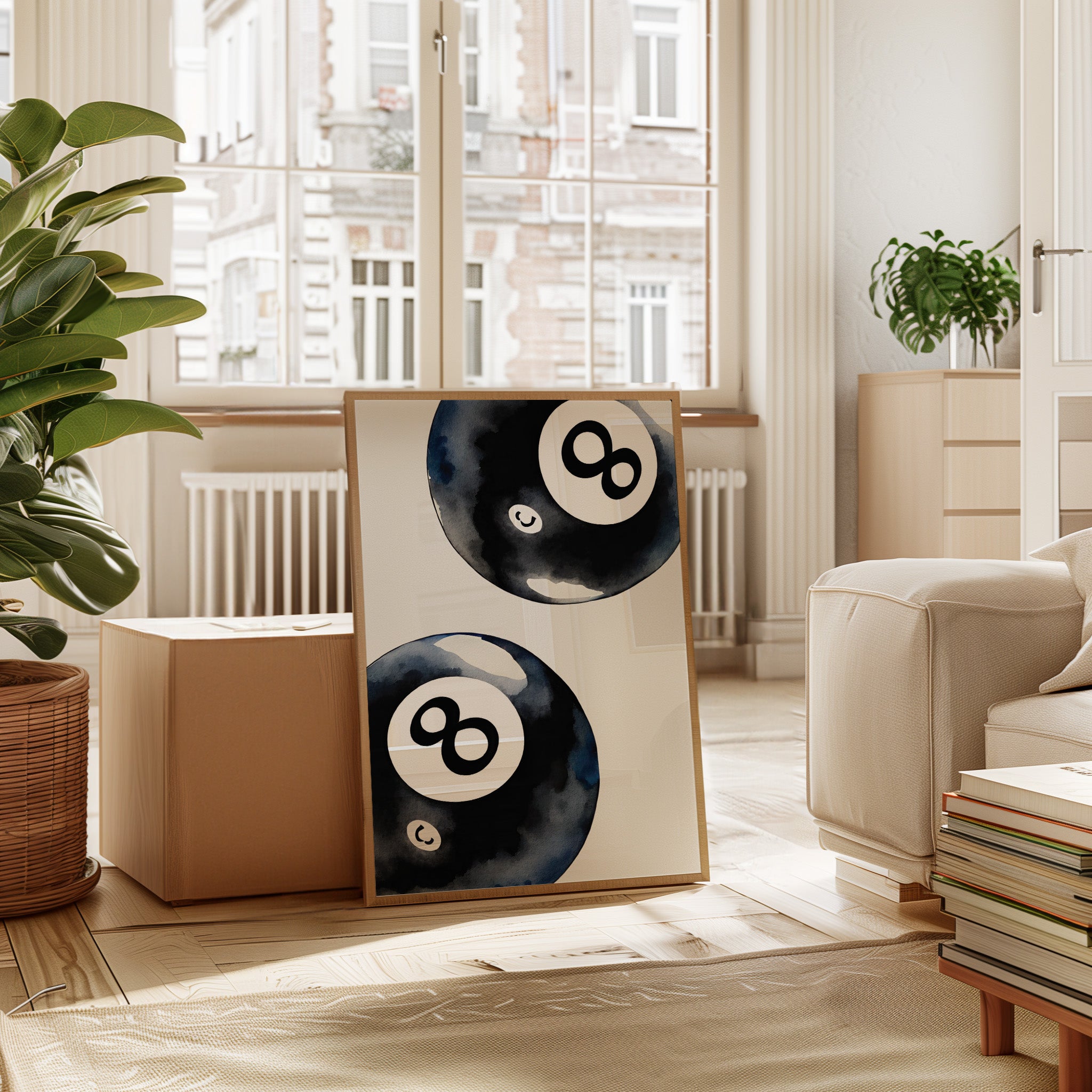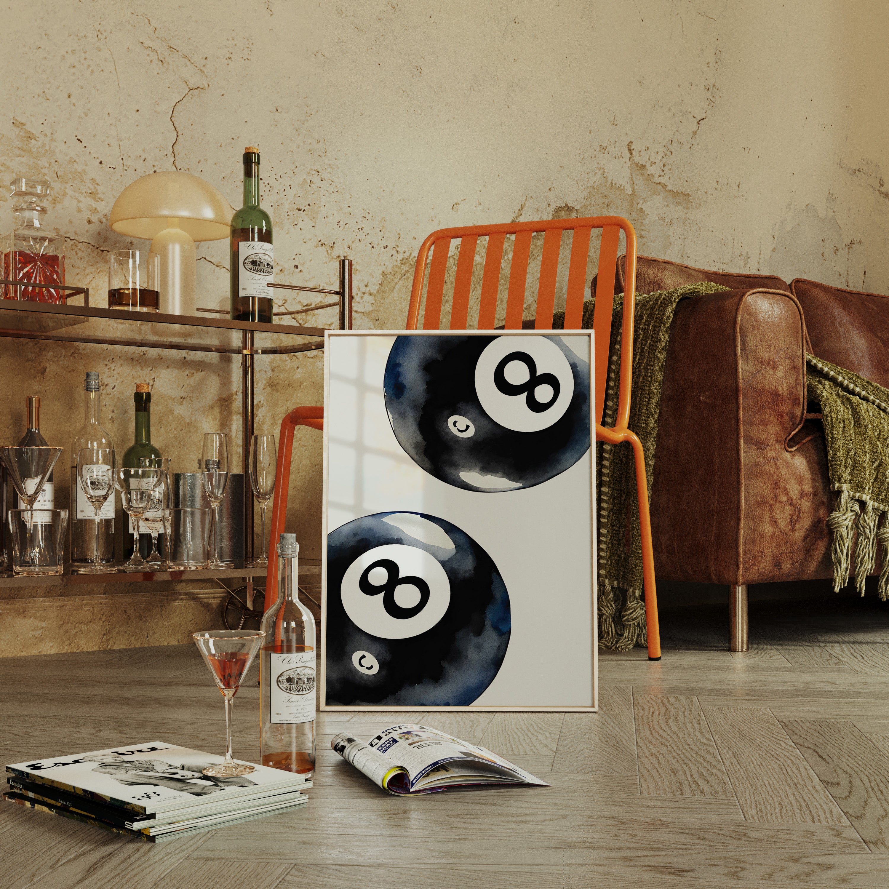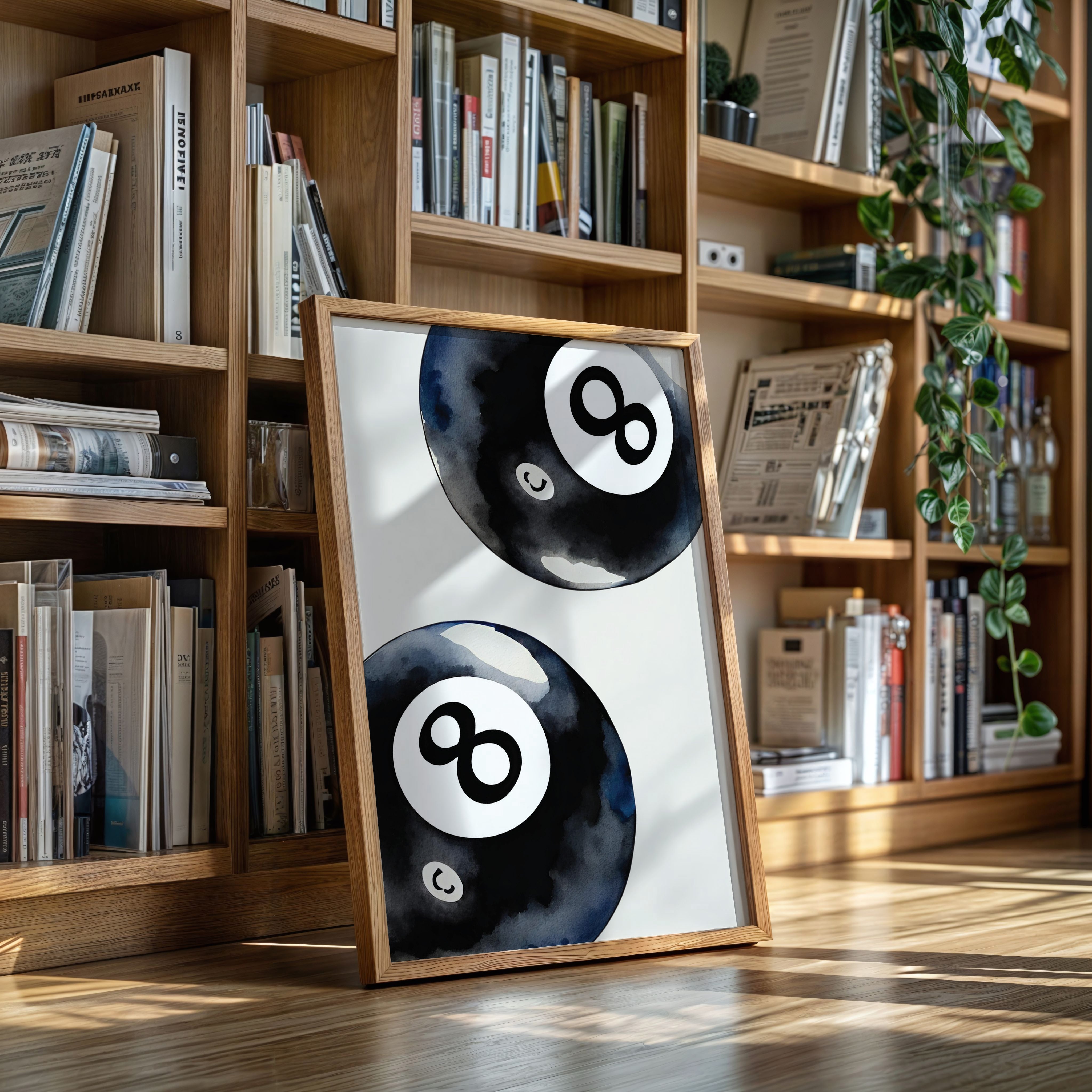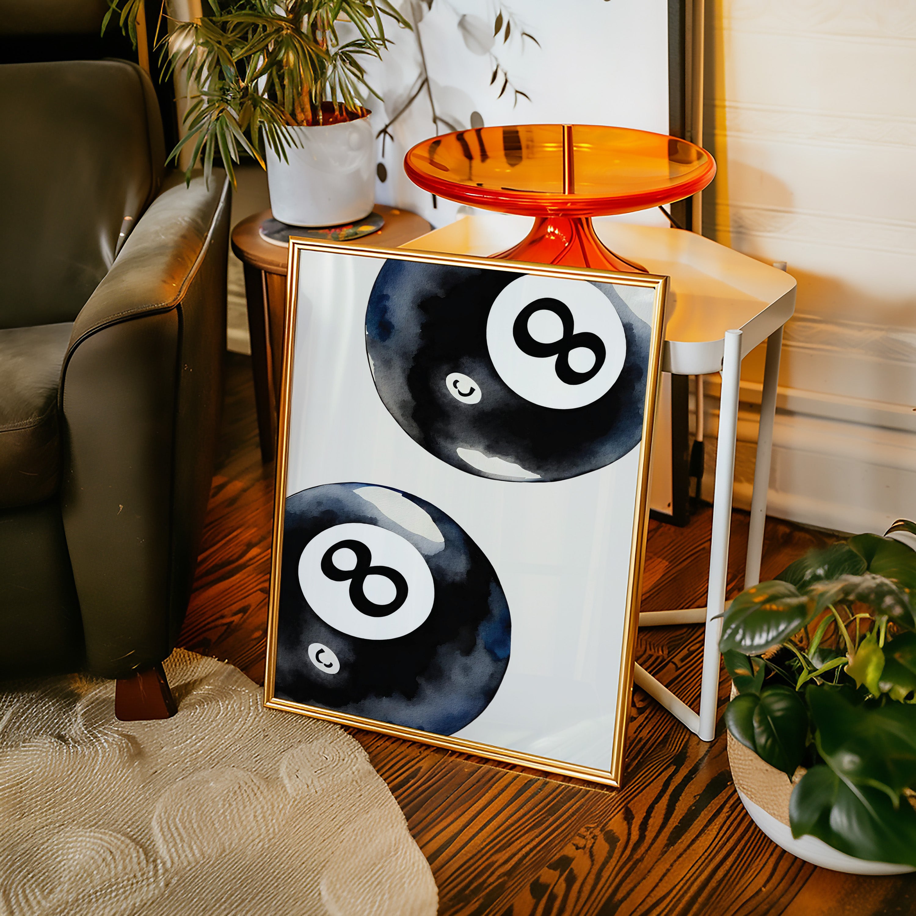 Deep indigo washes blend with stark white numerals, creating a mesmerizing dance of contrast and form. This piece from our Contemporary collection celebrates the iconic simplicity of game room culture with an artistic twist. The watercolor-like edges soften the geometric precision, while twin eight balls float in perfect harmony against a clean backdrop, suggesting both movement and stillness. The composition speaks to both playfulness and sophistication, making it an unexpected addition to modern interiors. This striking piece adds character to a home office, game room, or any space seeking a touch of refined whimsy.