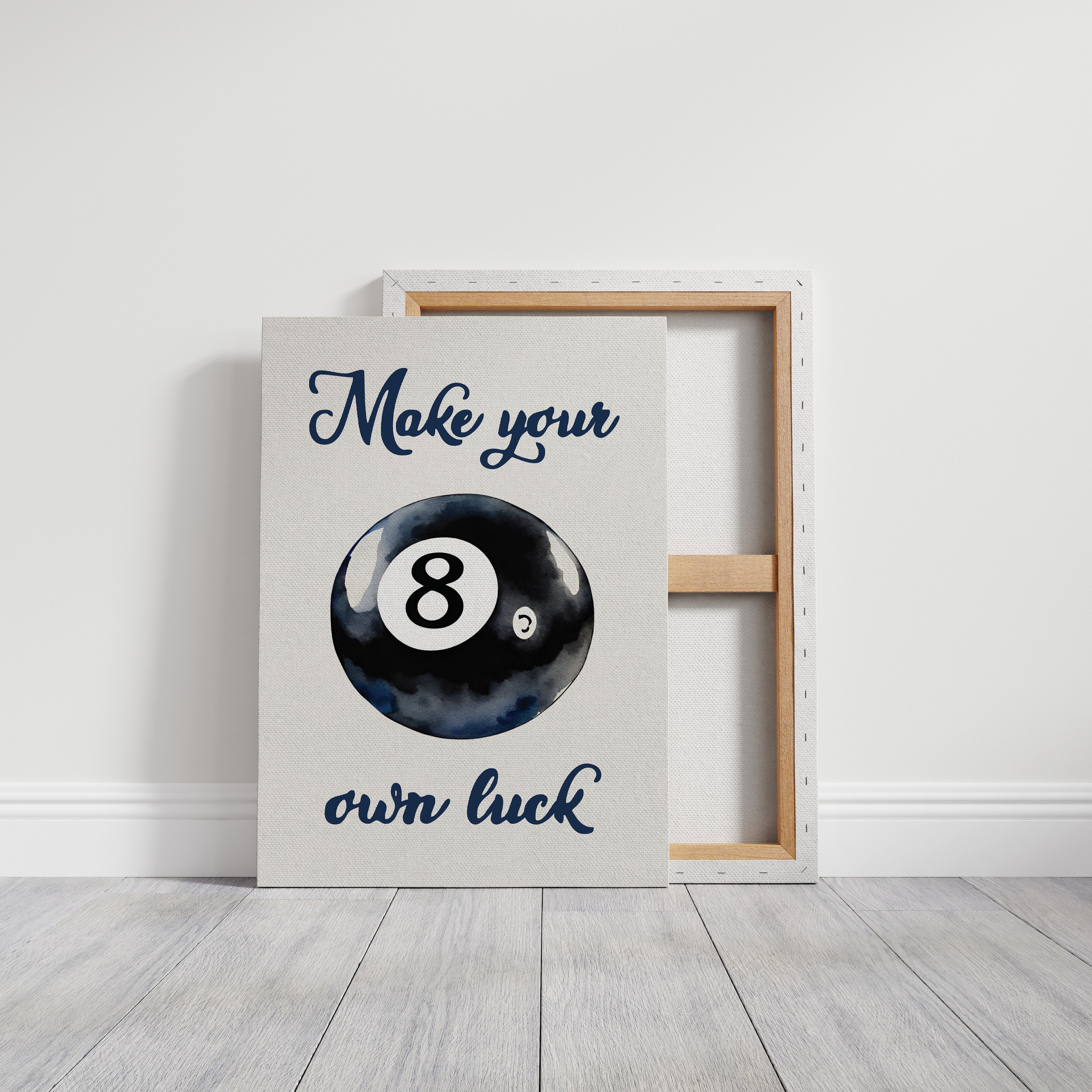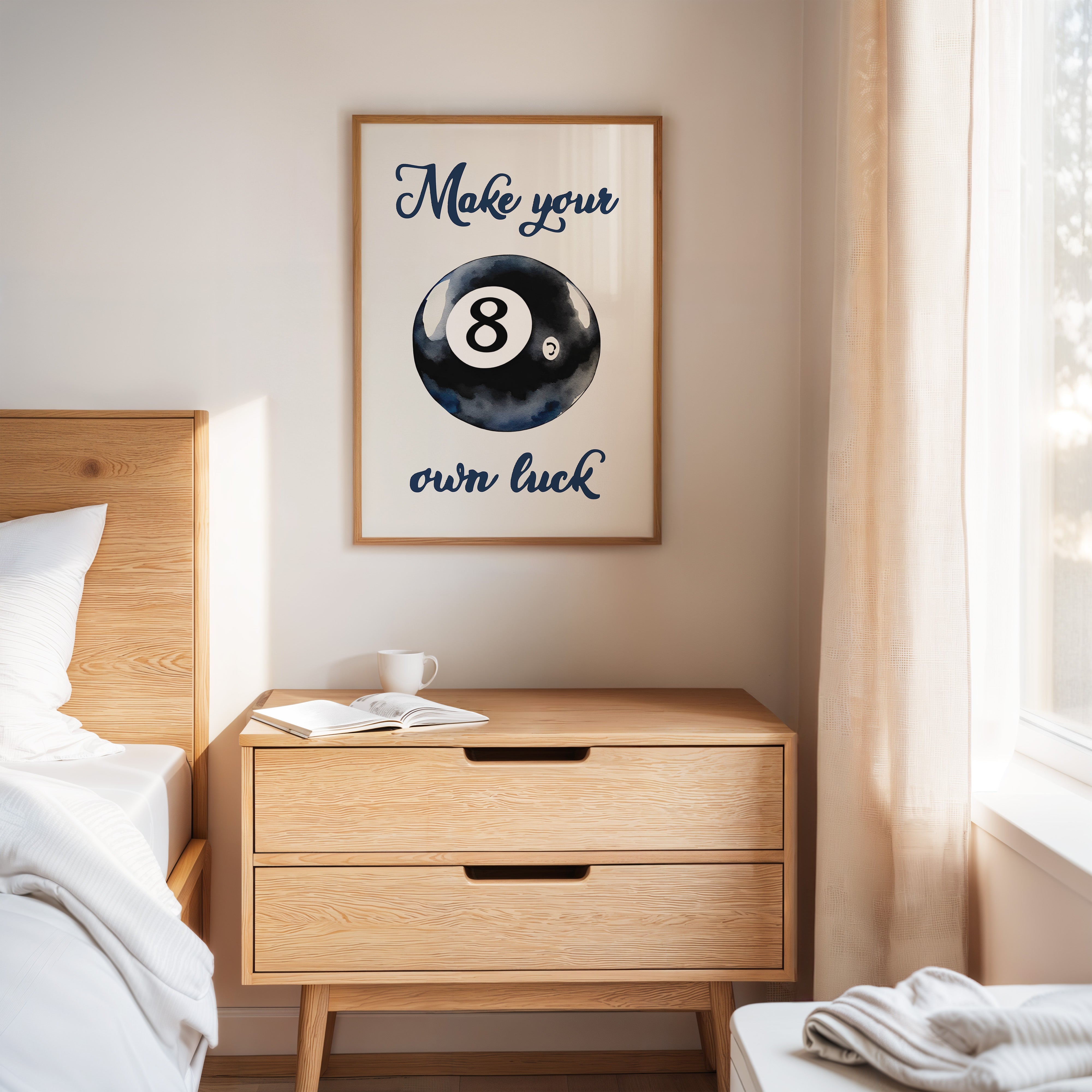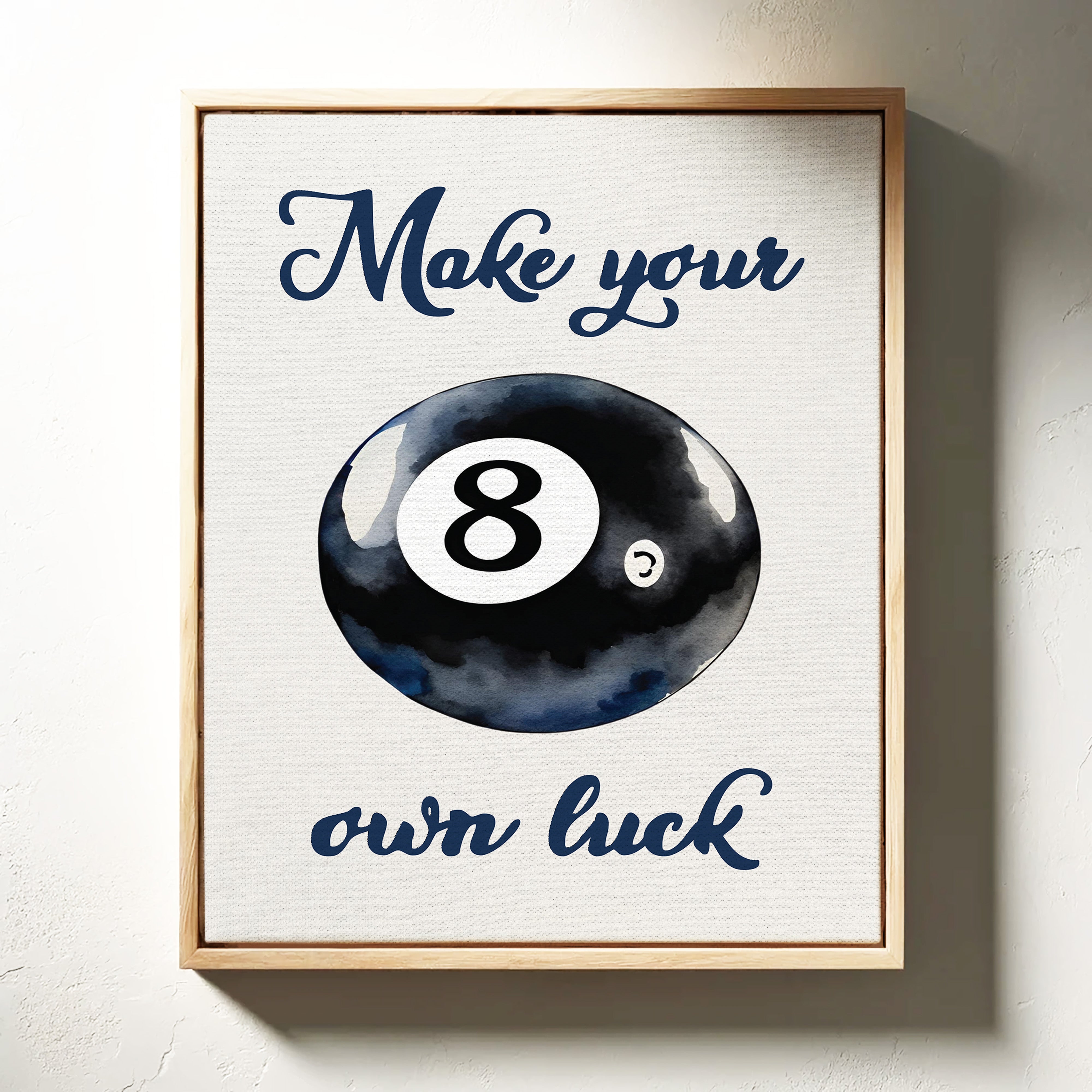 Sunlight streams across white floors, illuminating a moment of possibility and potential. This contemporary motivational piece brings classic game room nostalgia into modern minimalist design. The watercolor eight ball floats in perfect balance against crisp white space, while navy blue script adds a touch of playful elegance. The contrast between the bold geometric sphere and flowing typography creates a dynamic interplay of fate and free will. Perfect for a home office, game room, or any space where dreams and determination meet, adding both inspiration and sophisticated whimsy to your walls. The soft natural lighting and gentle shadows invite quiet contemplation of life's infinite possibilities.