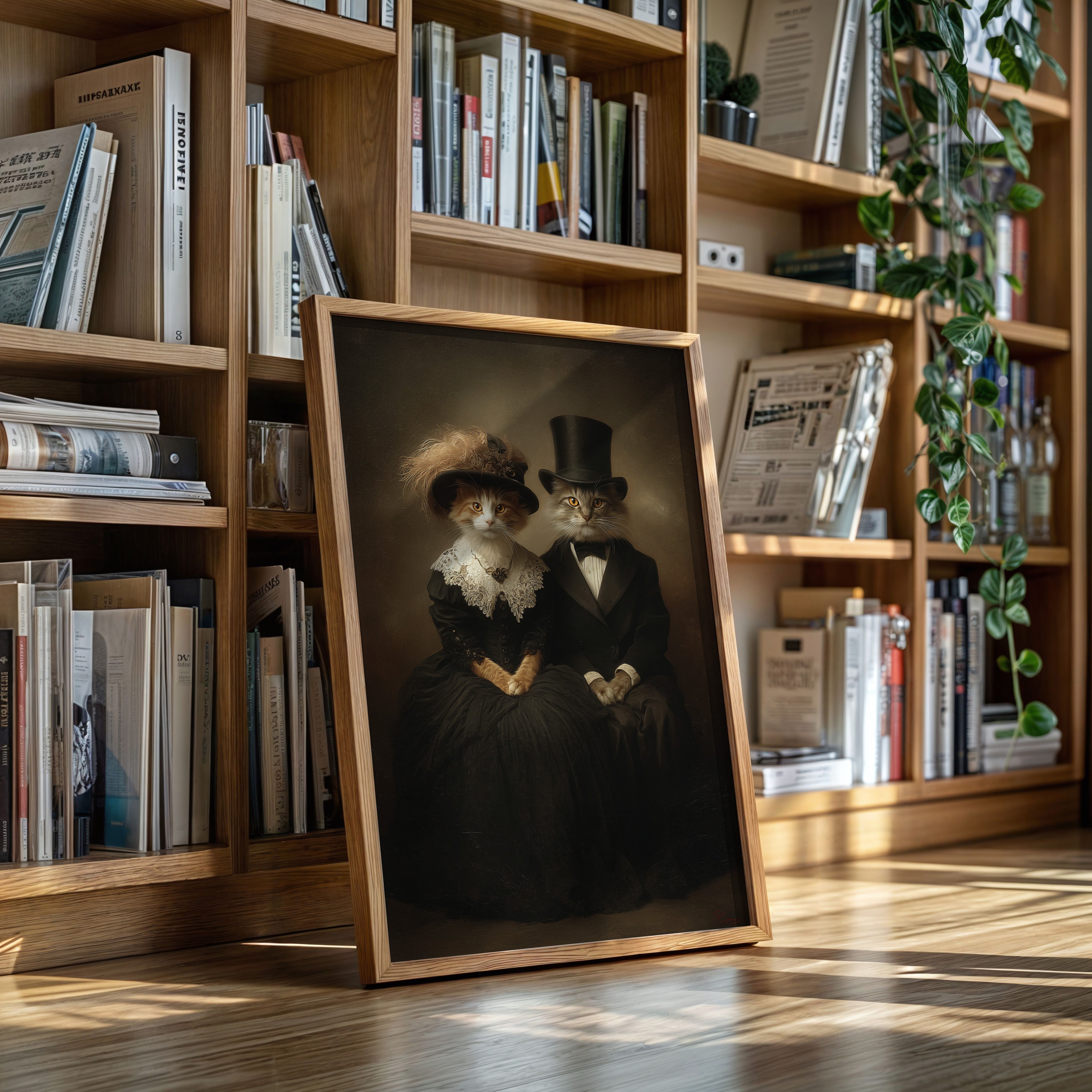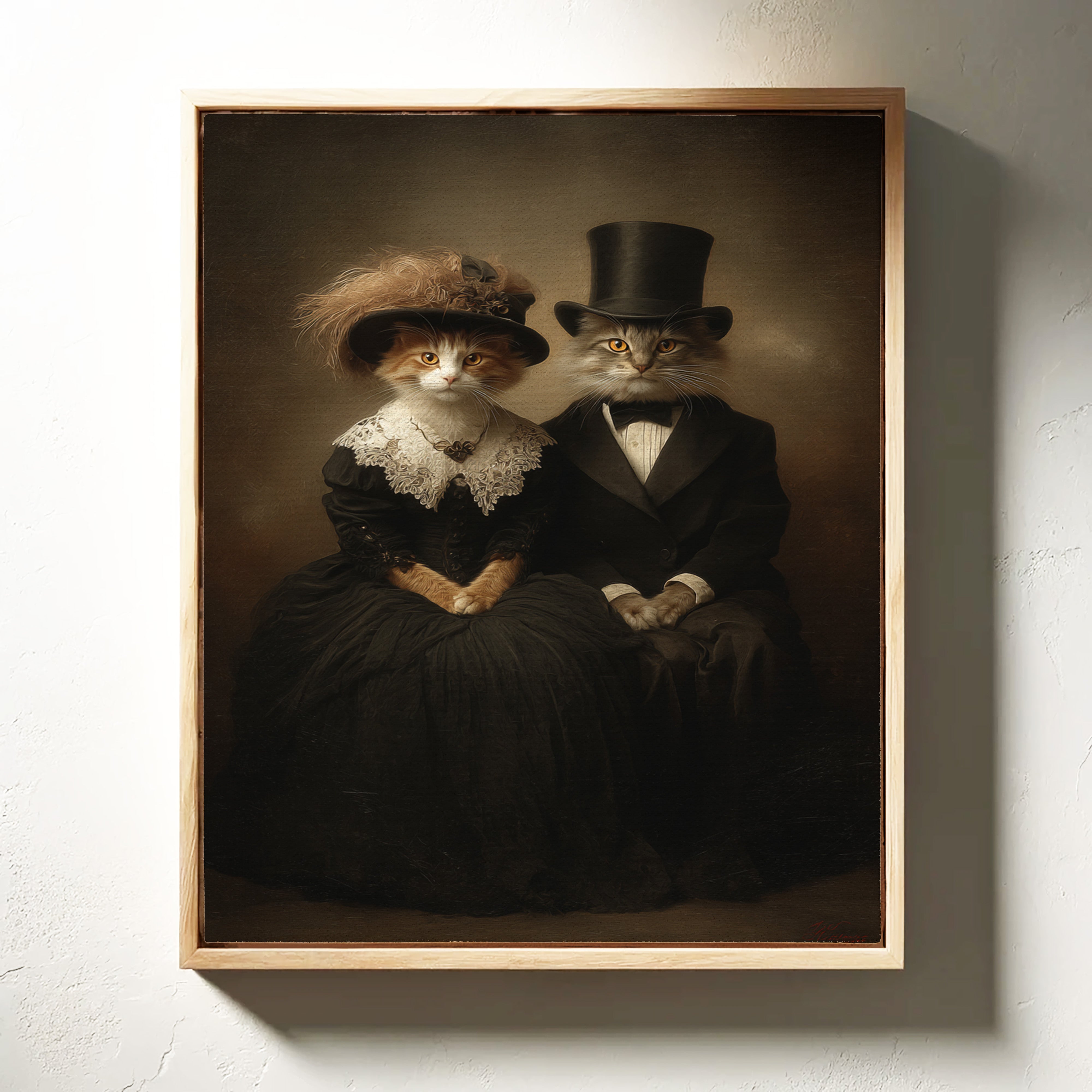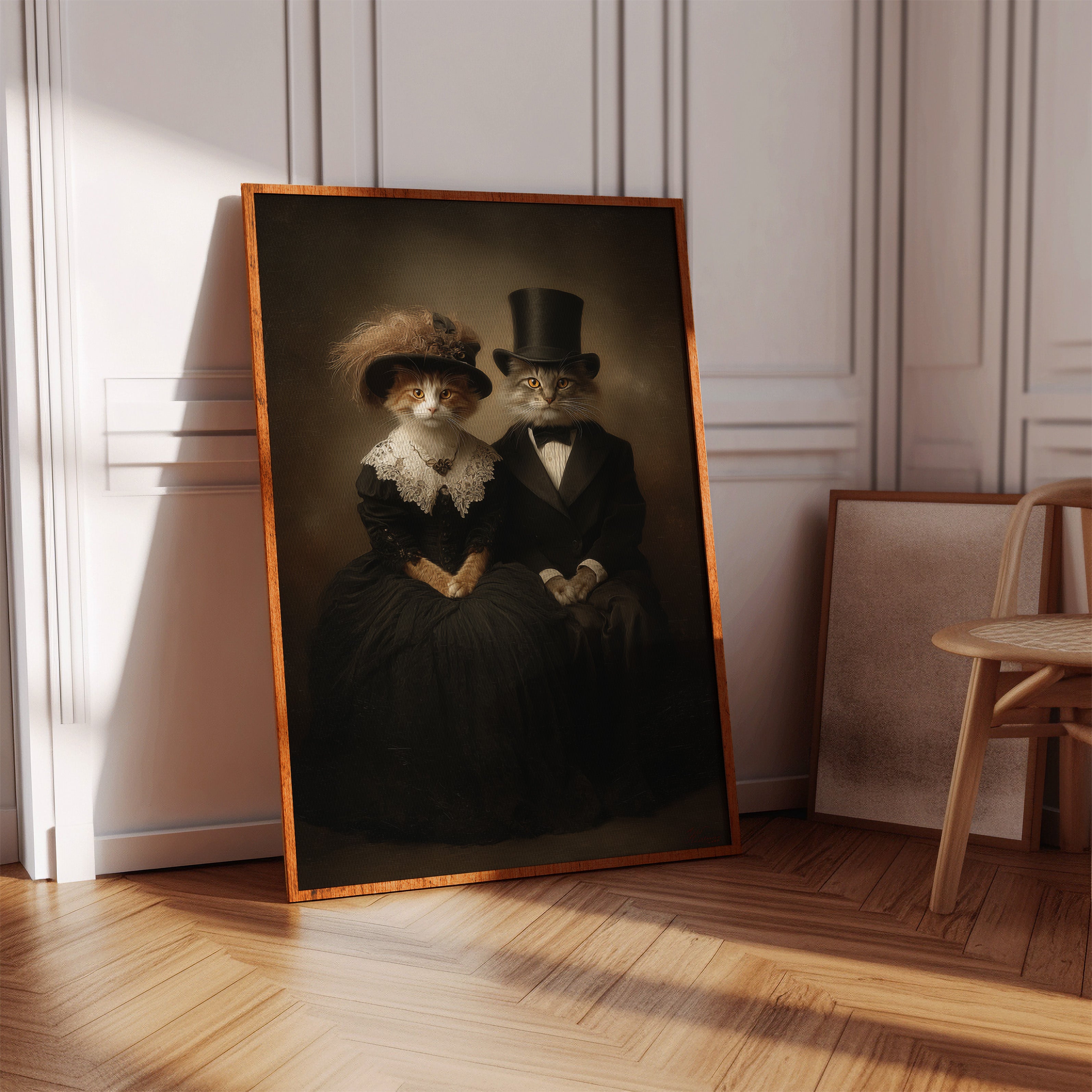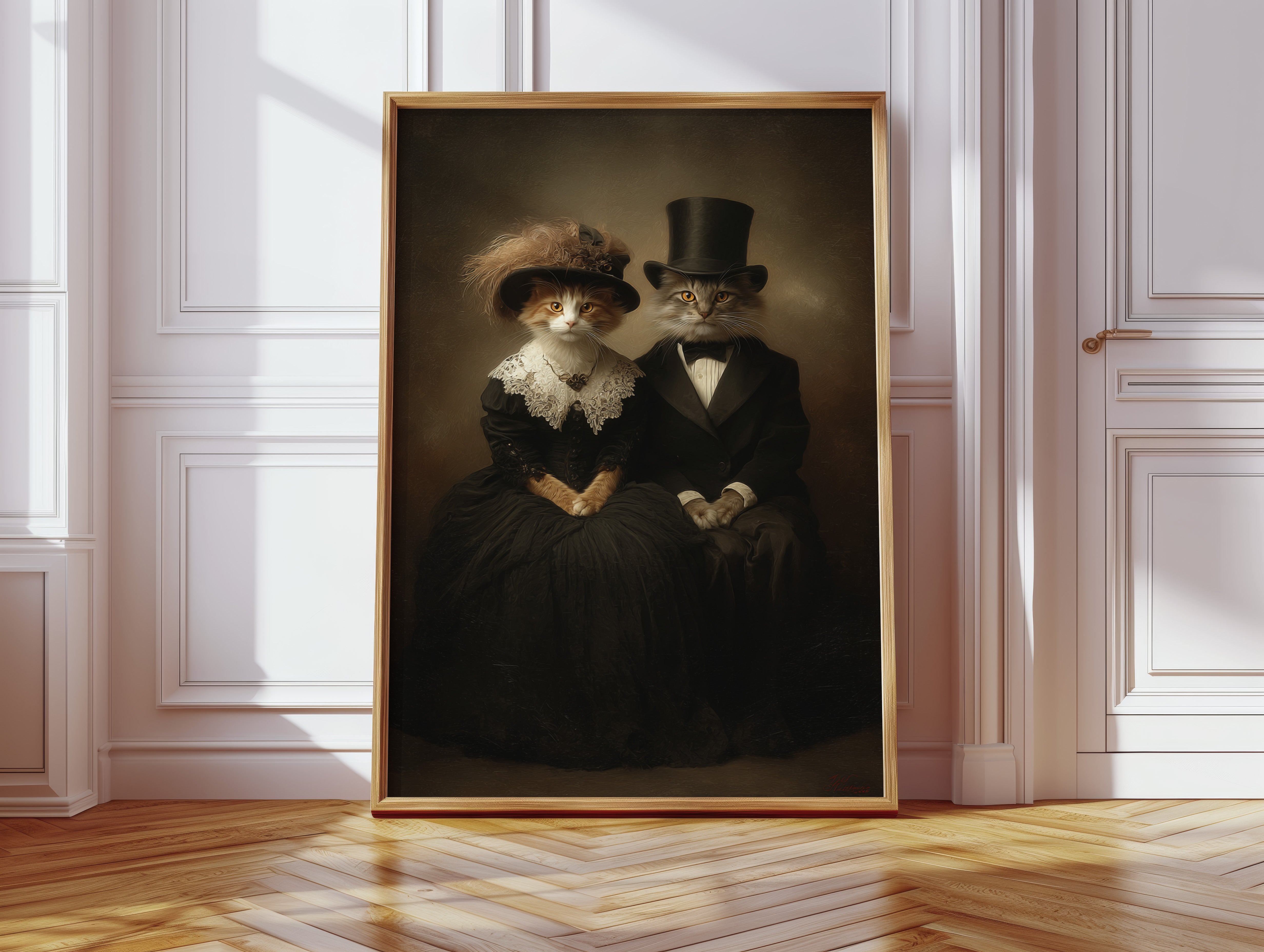 In a world where whimsy meets sophistication, two regal cats pose in timeless fashion, their expressions a blend of curiosity and poise. This piece embodies the artisanal spirit, merging playful imagination with classic elegance. Adorned in exquisite attire, the feline duo captures the essence of a bygone era, their vibrant fur contrasting beautifully with the rich textures of their garments. This enchanting scene invites warmth and charm into your space, perfect for a cozy reading nook or an eclectic living room.