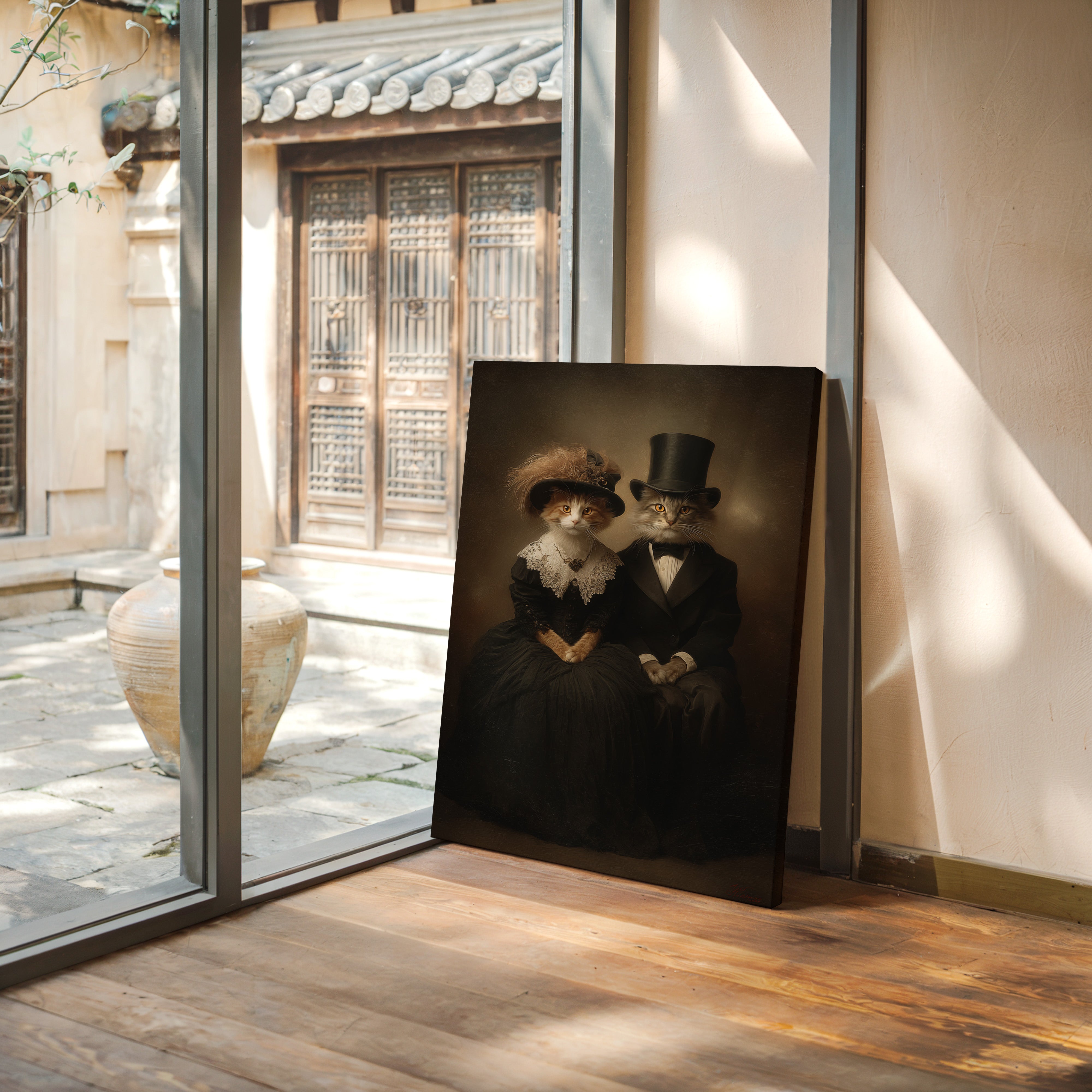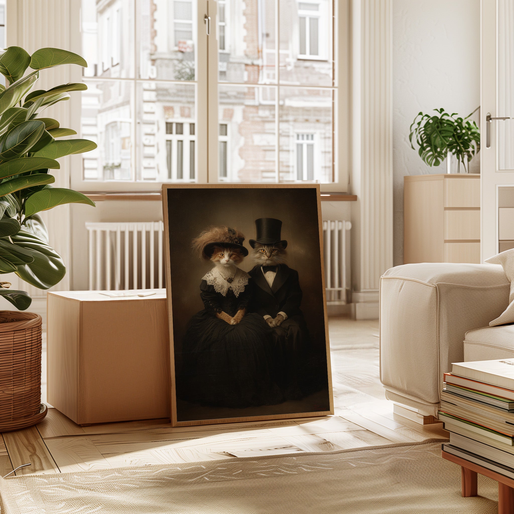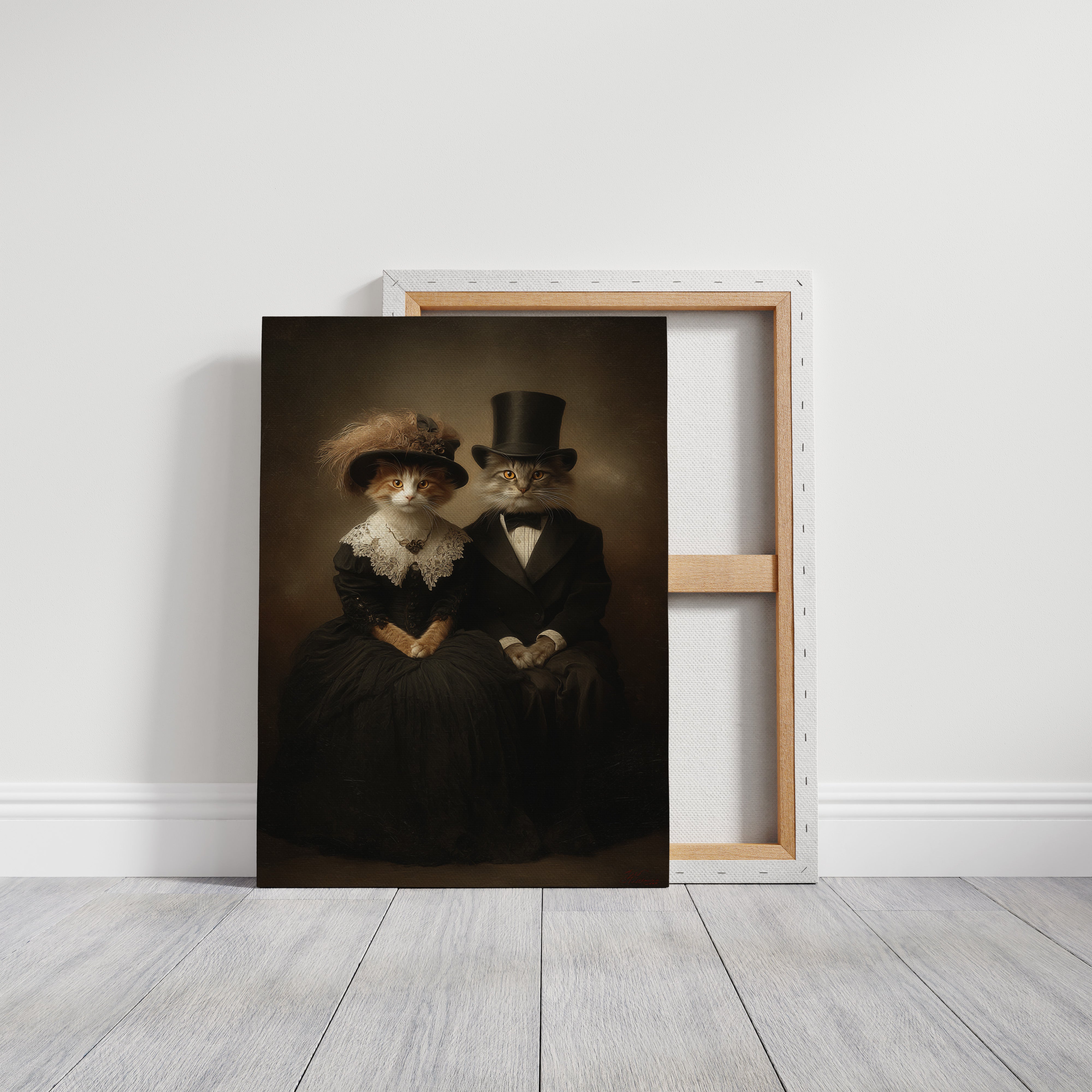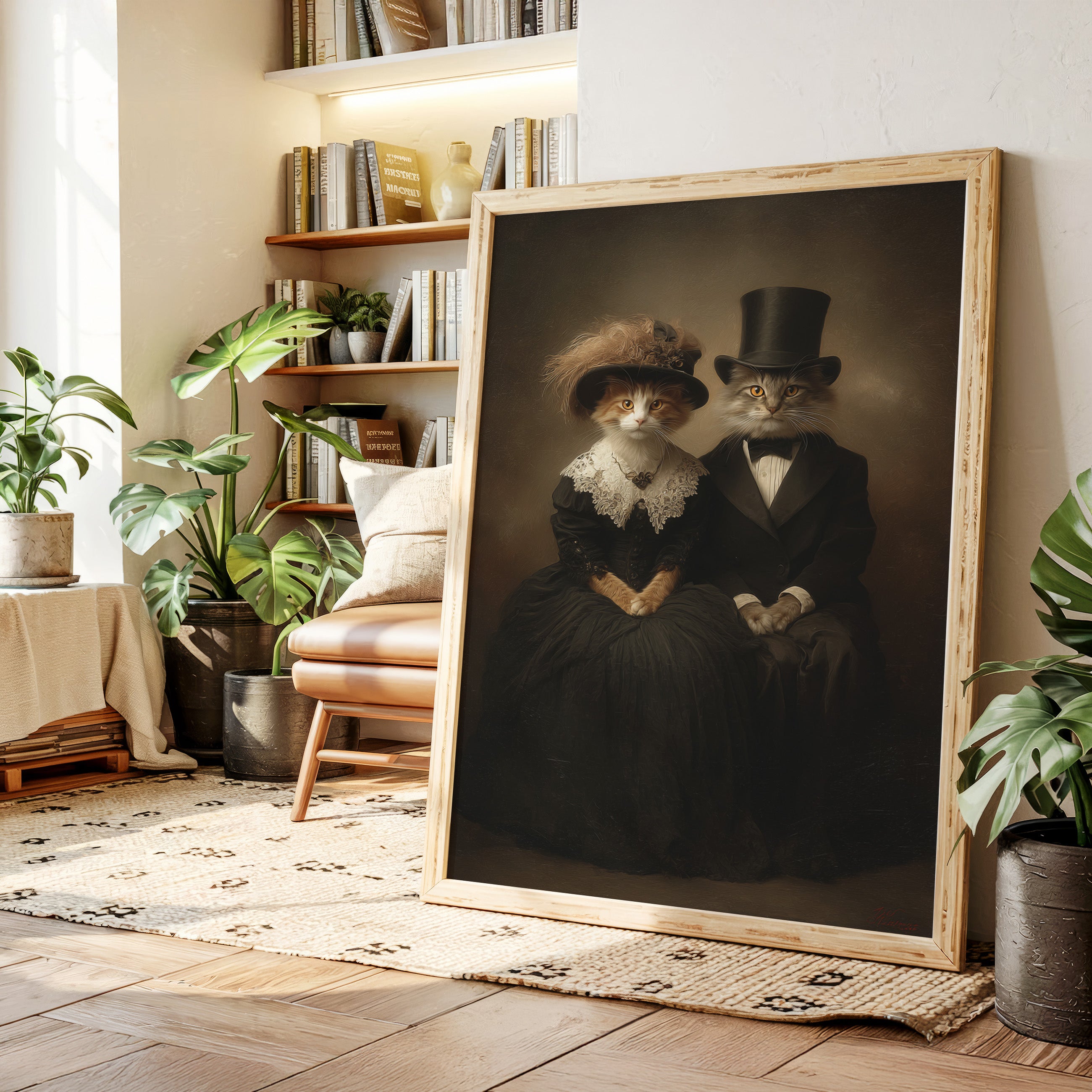 In a world where whimsy meets sophistication, two regal cats pose in timeless fashion, their expressions a blend of curiosity and poise. This piece embodies the artisanal spirit, merging playful imagination with classic elegance. Adorned in exquisite attire, the feline duo captures the essence of a bygone era, their vibrant fur contrasting beautifully with the rich textures of their garments. This enchanting scene invites warmth and charm into your space, perfect for a cozy reading nook or an eclectic living room.