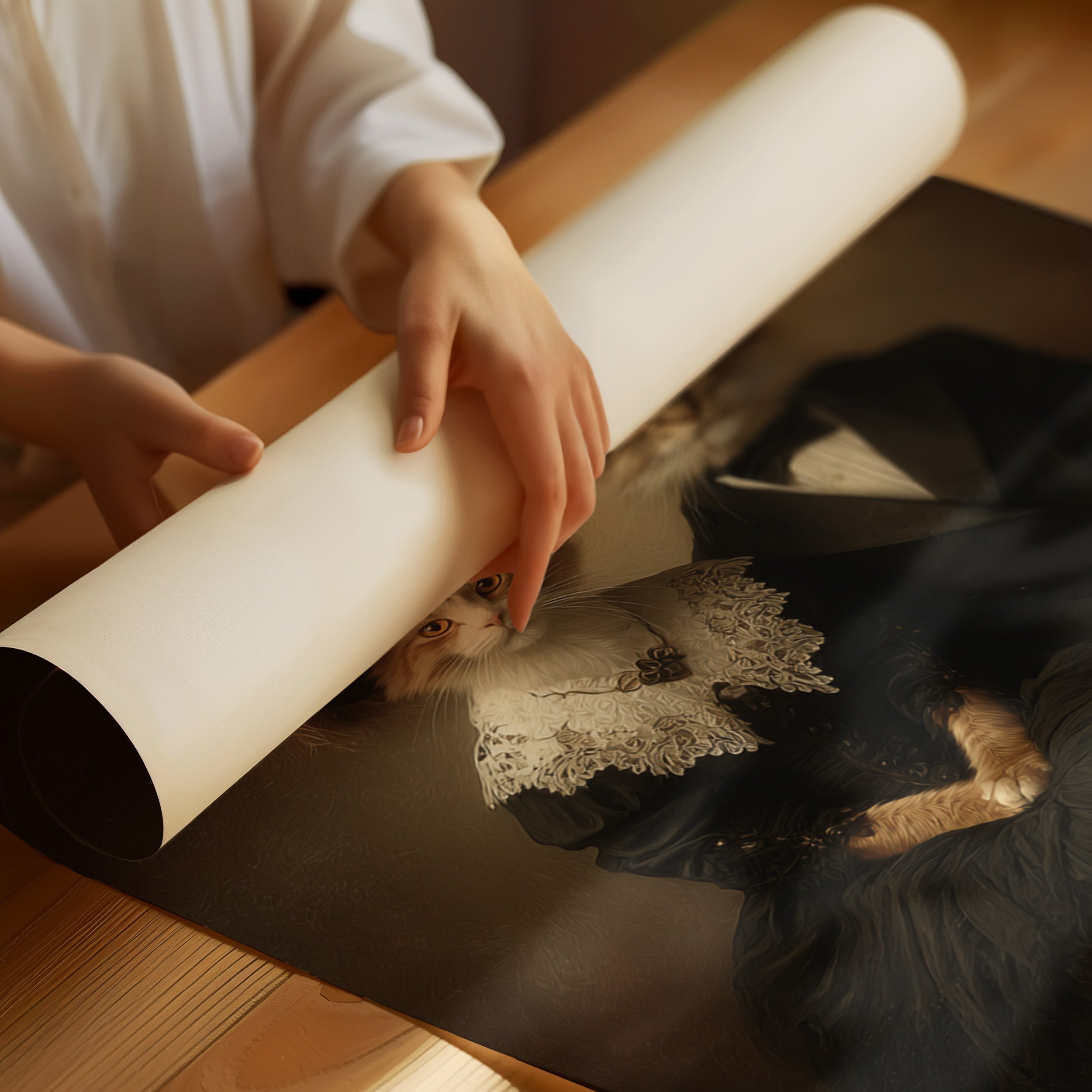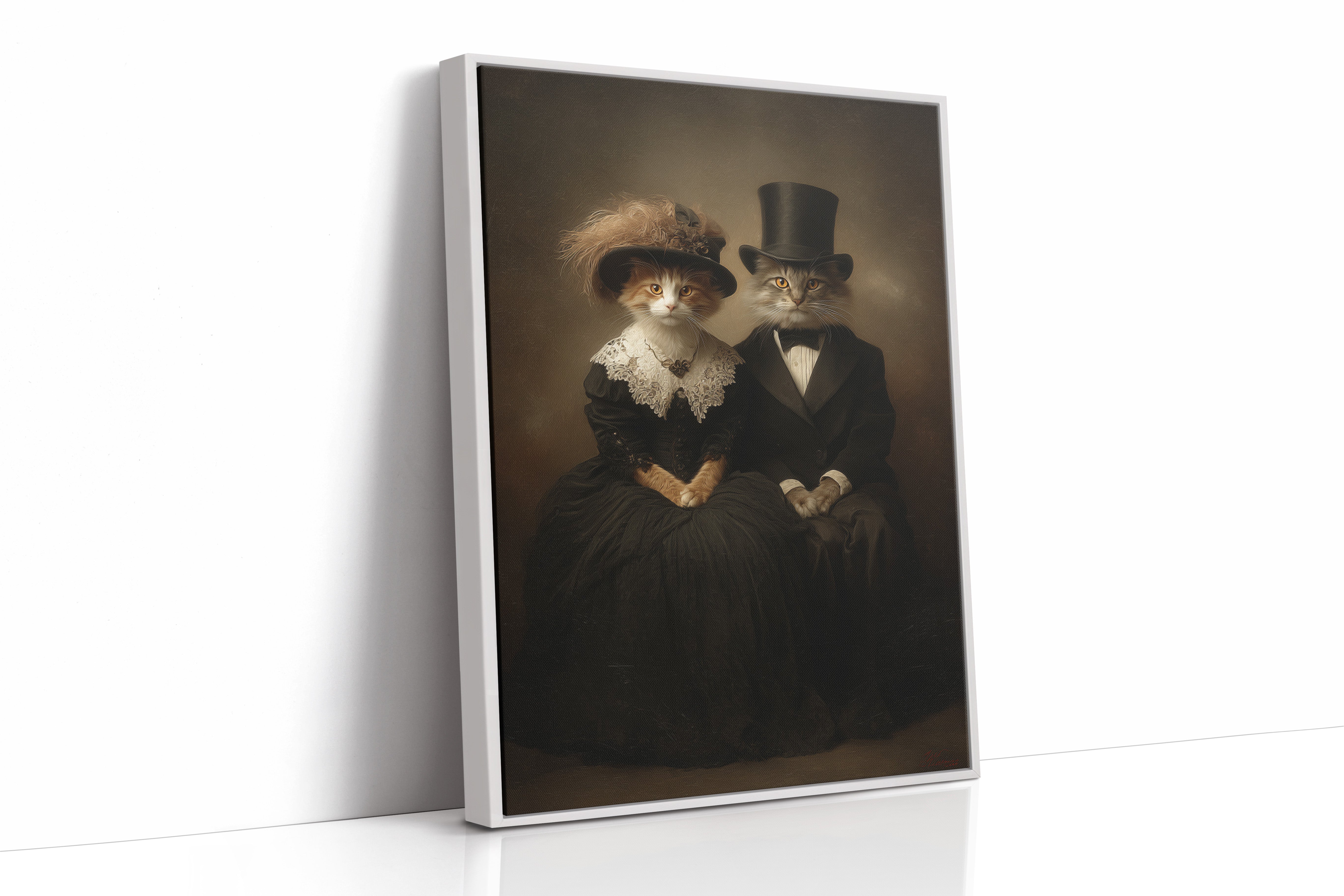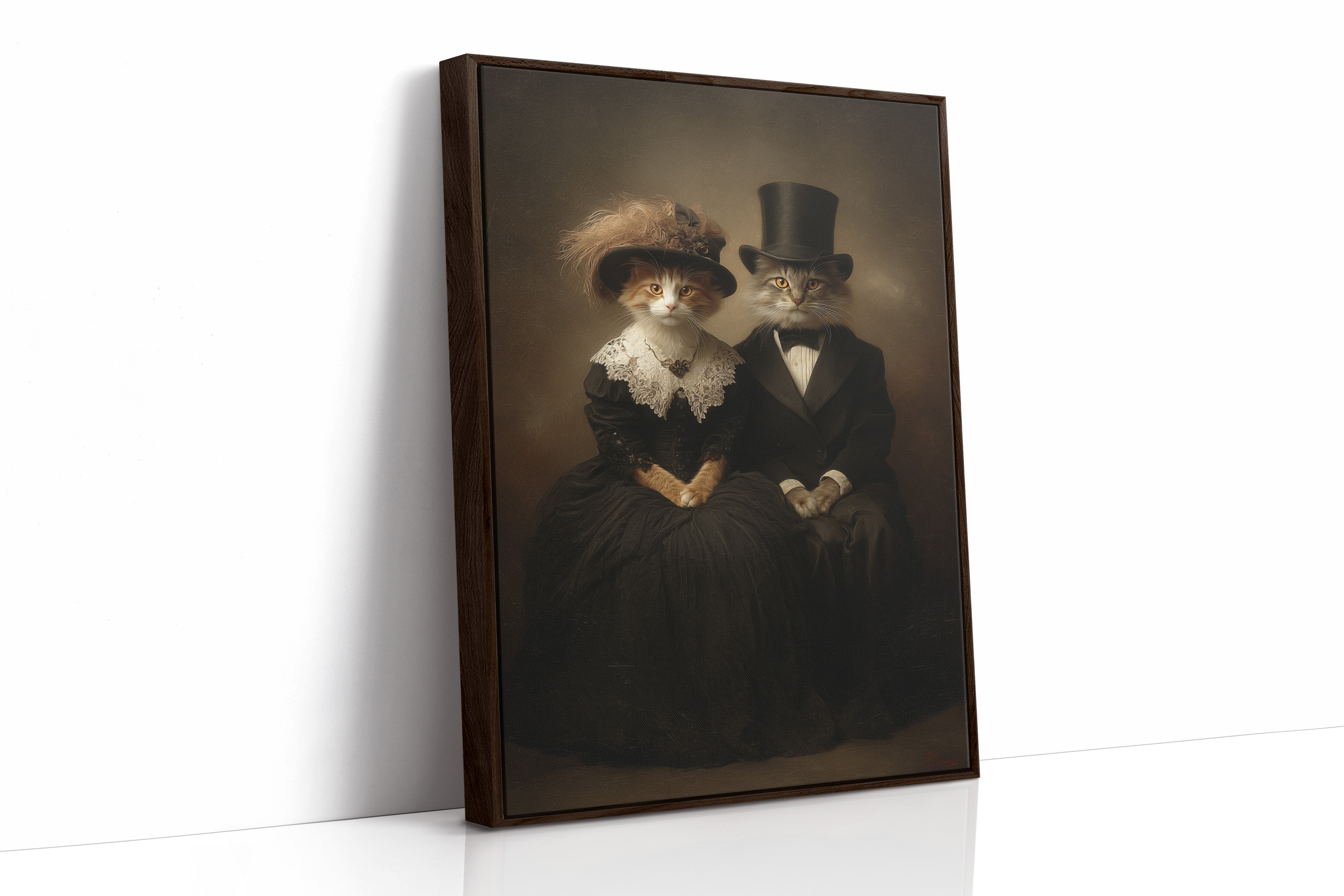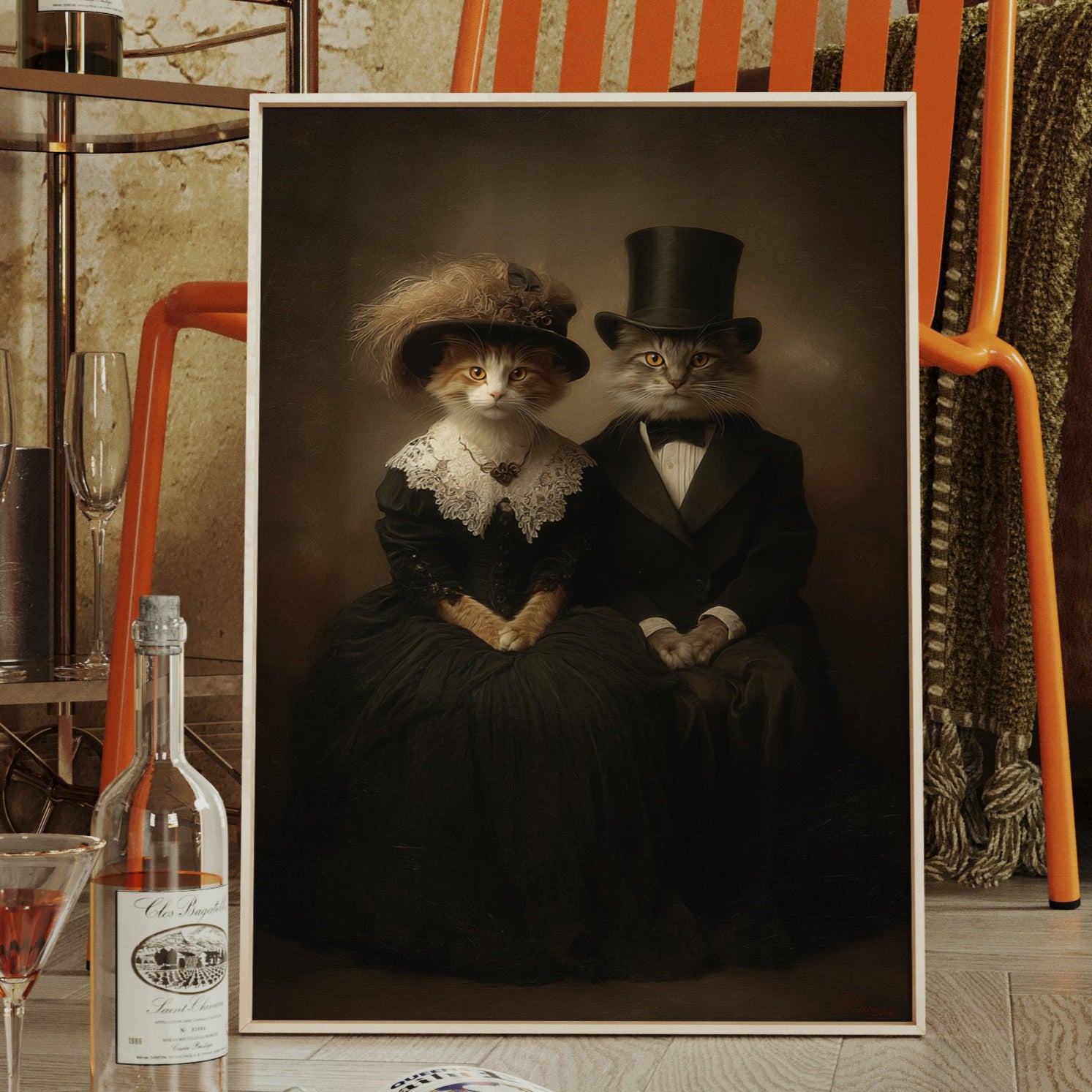 In a world where whimsy meets sophistication, two regal cats pose in timeless fashion, their expressions a blend of curiosity and poise. This piece embodies the artisanal spirit, merging playful imagination with classic elegance. Adorned in exquisite attire, the feline duo captures the essence of a bygone era, their vibrant fur contrasting beautifully with the rich textures of their garments. This enchanting scene invites warmth and charm into your space, perfect for a cozy reading nook or an eclectic living room.