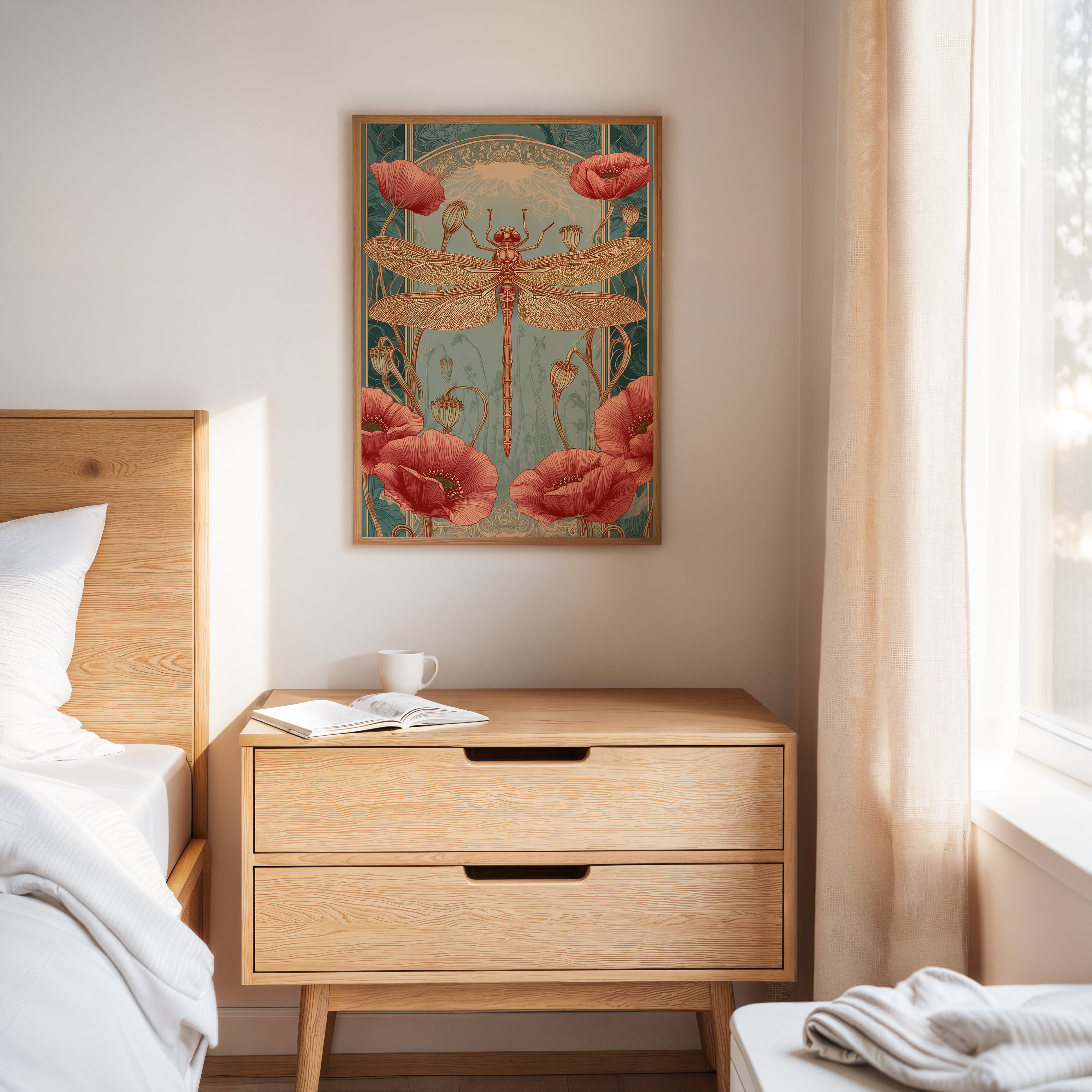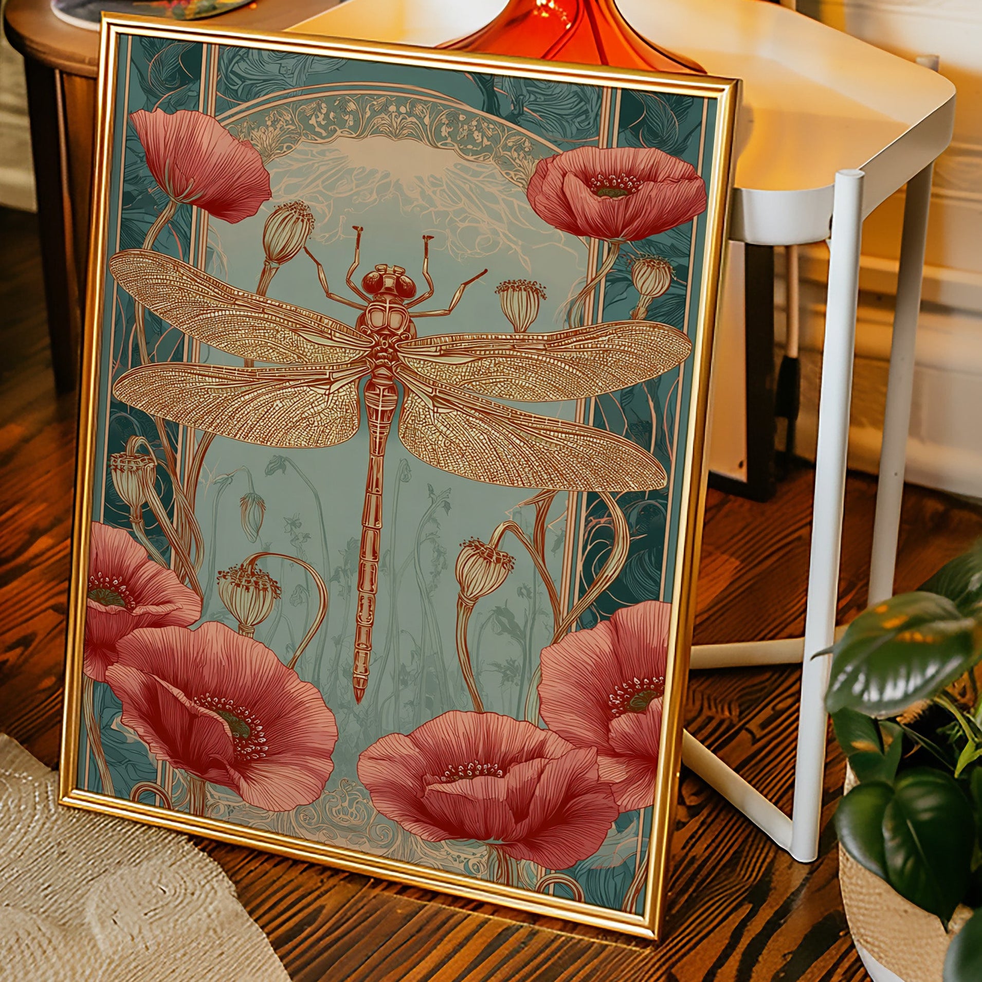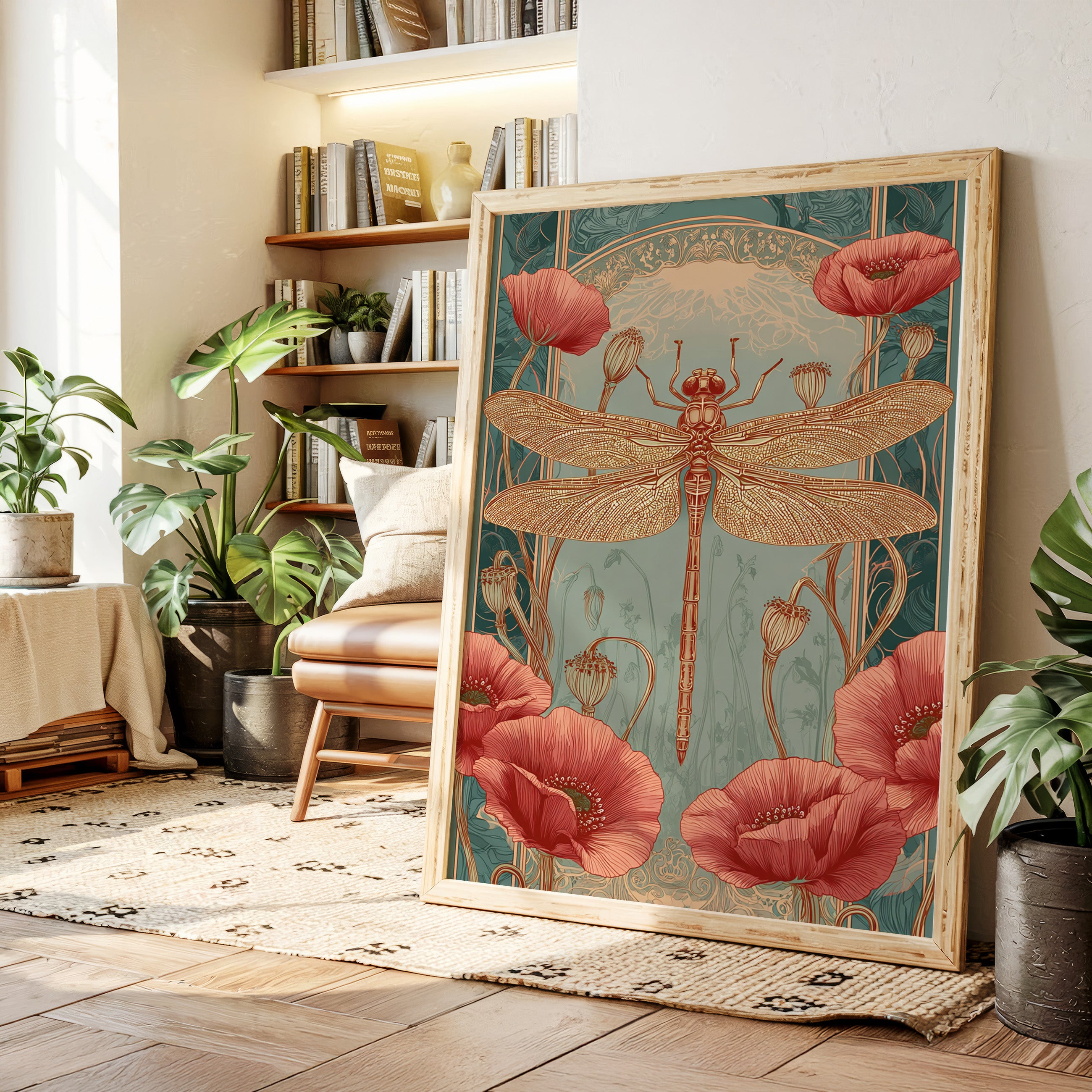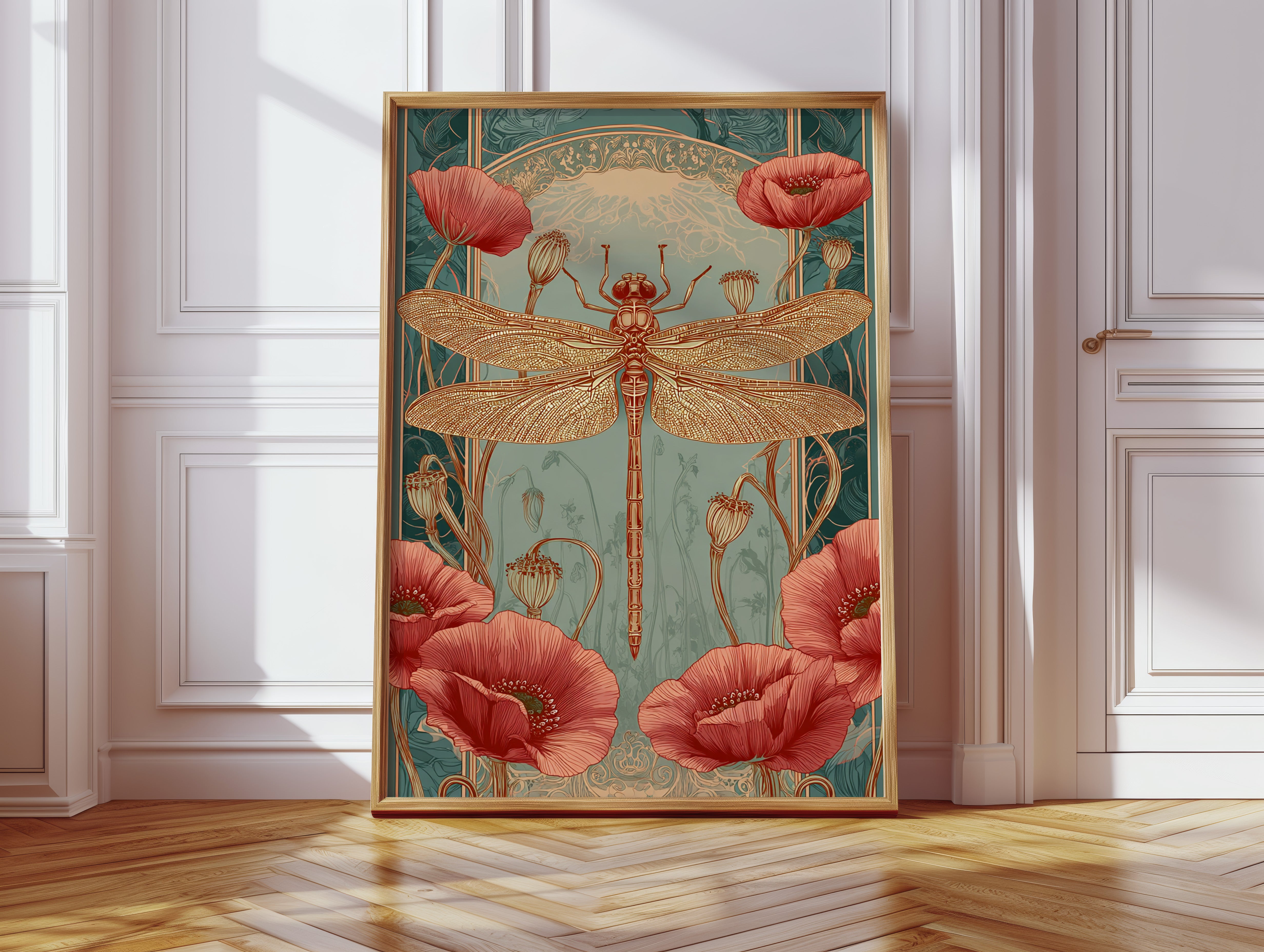 In a realm where artistry and nature intertwine, a dragonfly perches gracefully atop a vibrant bloom, heralding the beauty of fleeting moments. This piece embodies the essence of the Artisanal collection, celebrating the intricate dance of life and artistry. The delicate lines of the dragonflys wings contrast beautifully with the bold crimson of the poppies, evoking a sense of wonder and tranquility. Ideal for a serene reading nook or a vibrant entryway, this piece invites viewers to pause and reflect on the beauty surrounding them.