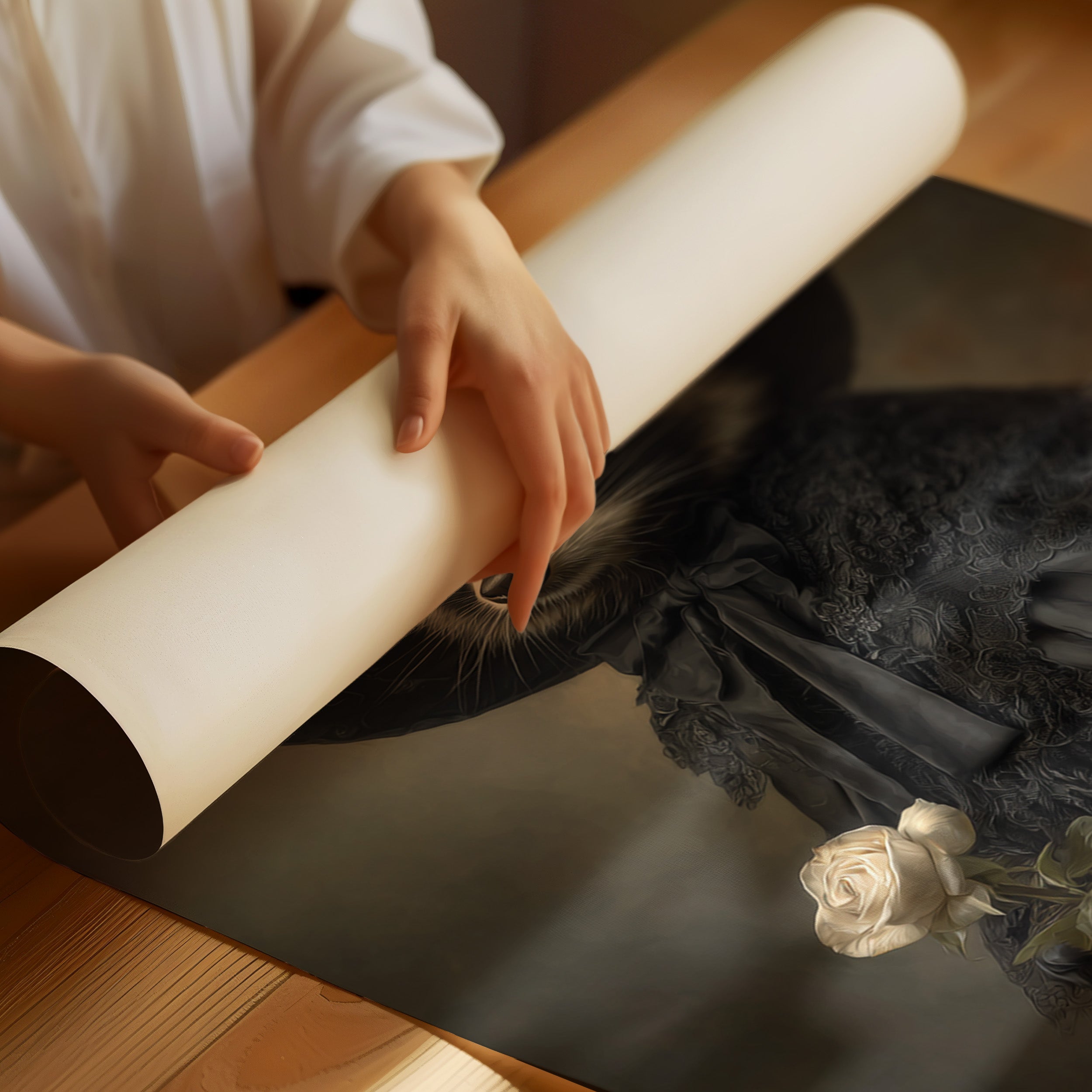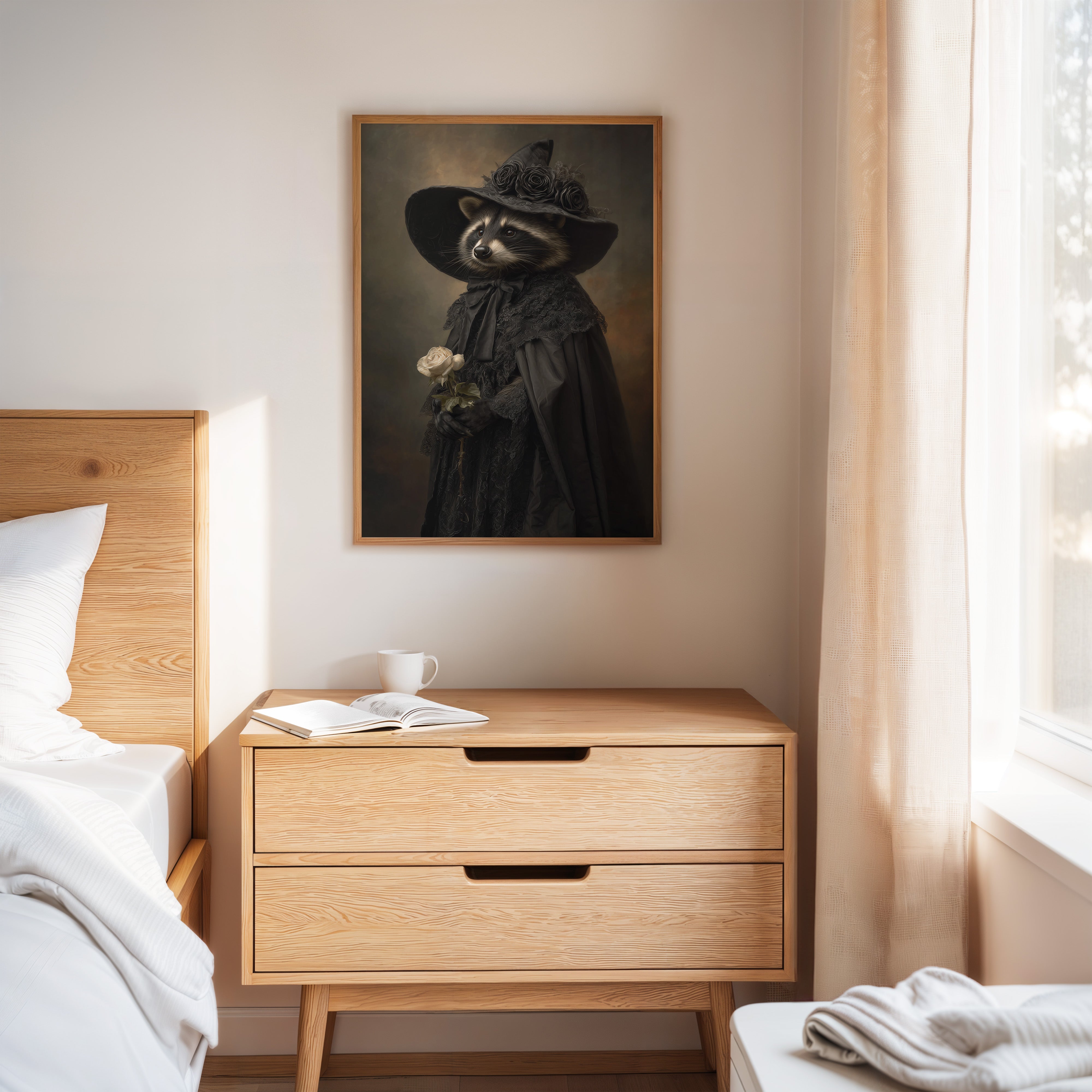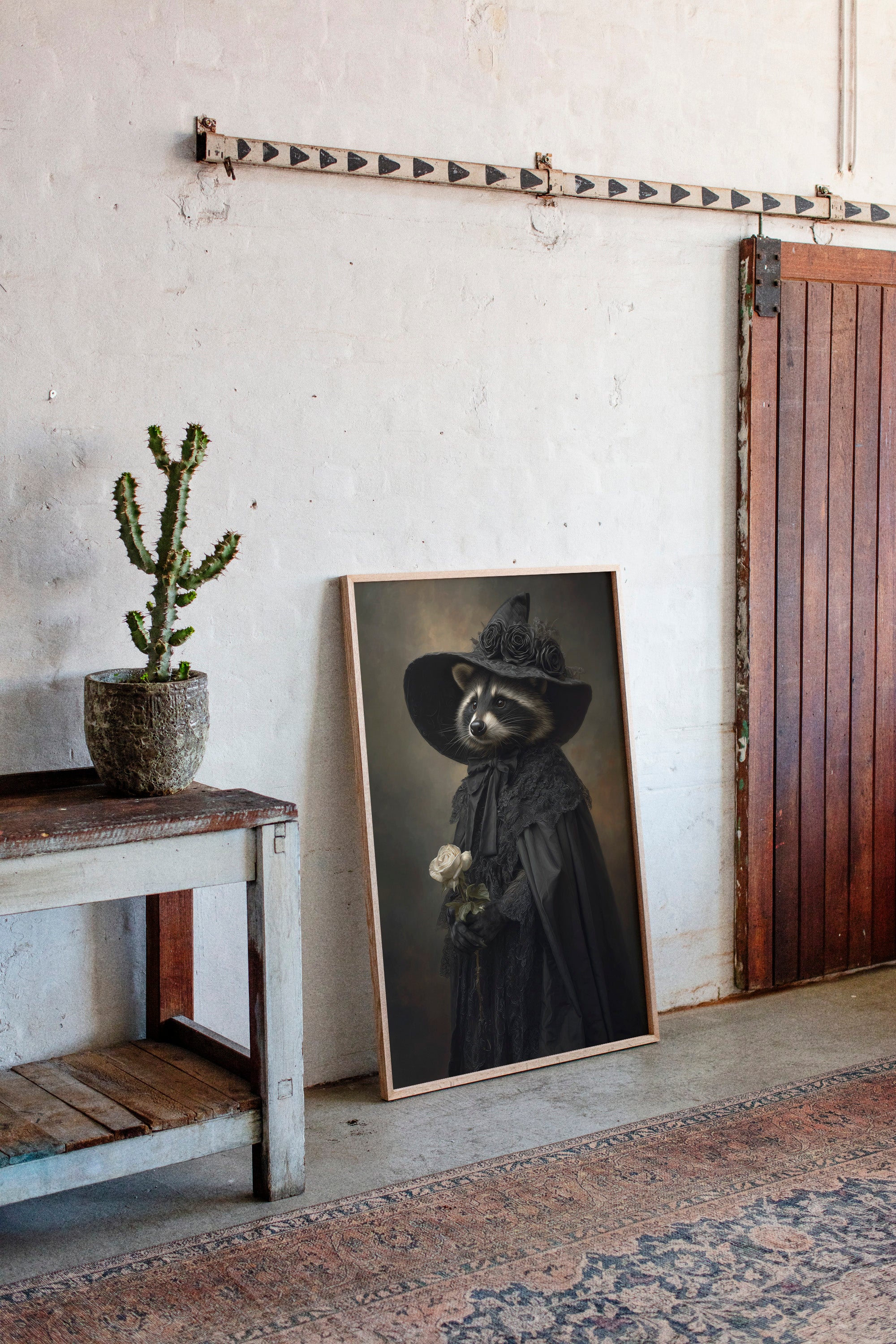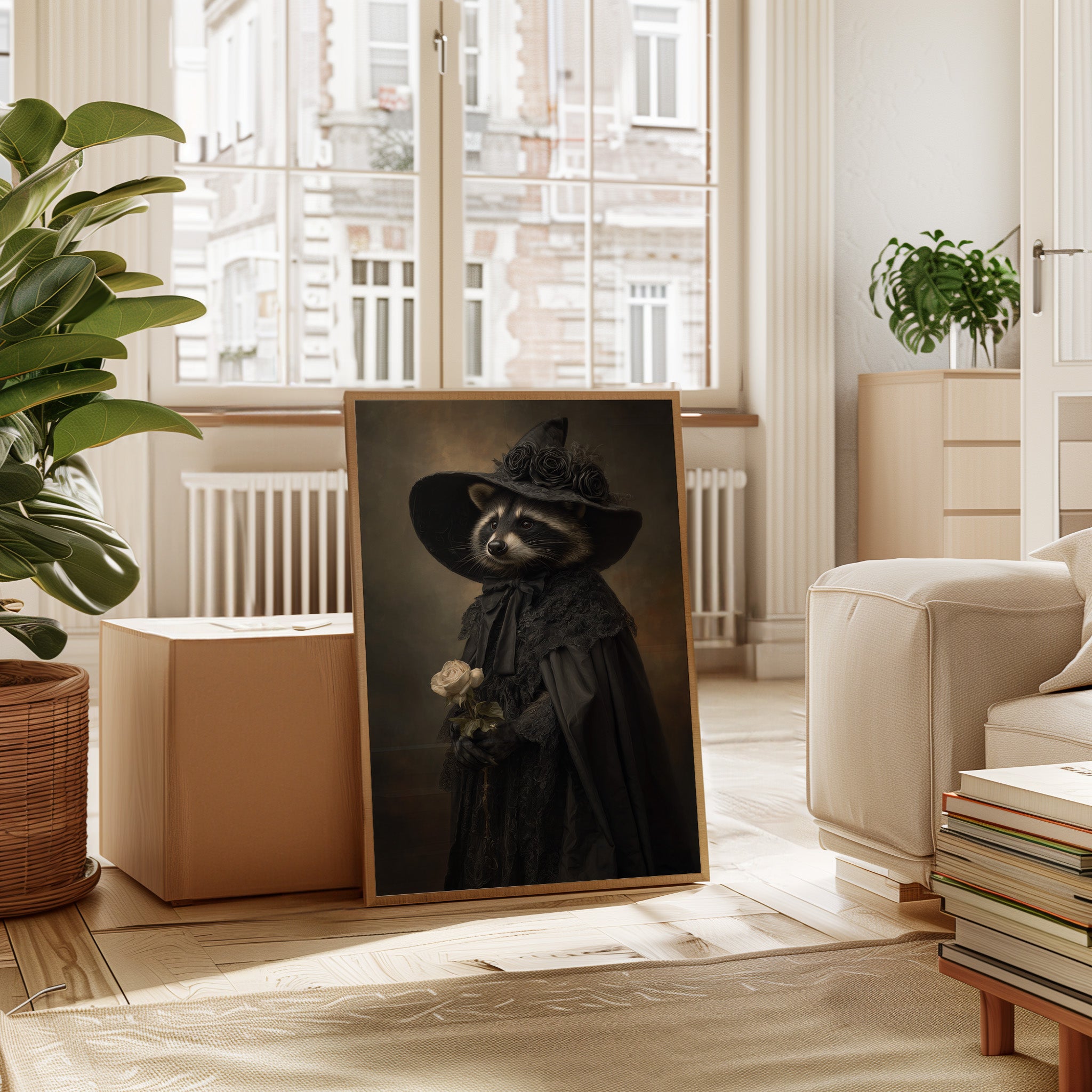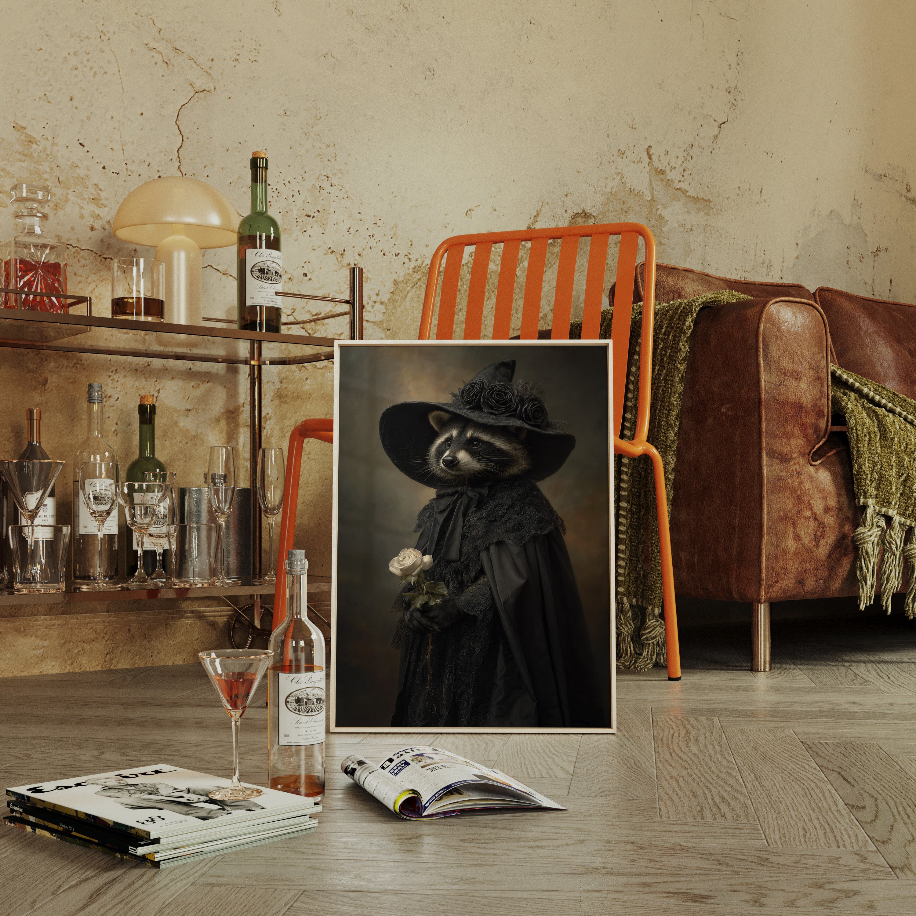 In a moment suspended between whimsy and grace, a raccoon clad in dark lace cradles a delicate rose, evoking a blend of mystery and charm. This piece embodies the unique spirit of the Artisanal collection, where creativity meets the unexpected. The intricate textures of the hat and cloak dance with muted tones, while the soft petals of the rose offer a tender contrast, inviting viewers to explore the narrative of nature entwined with elegance. Perfect for a cozy reading nook or an eclectic hallway, this piece invites conversation and intrigue.