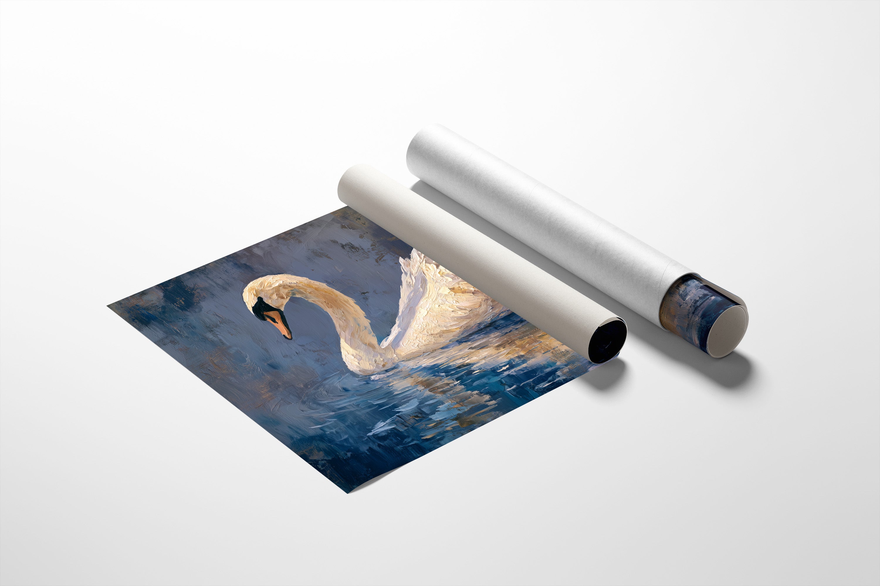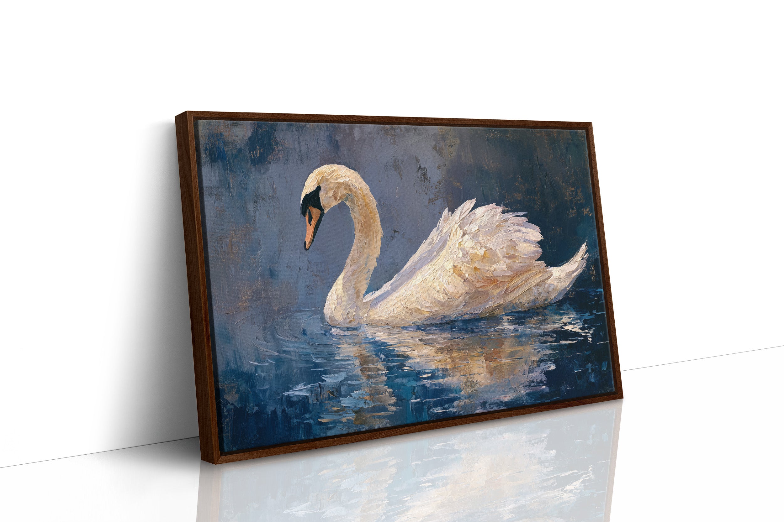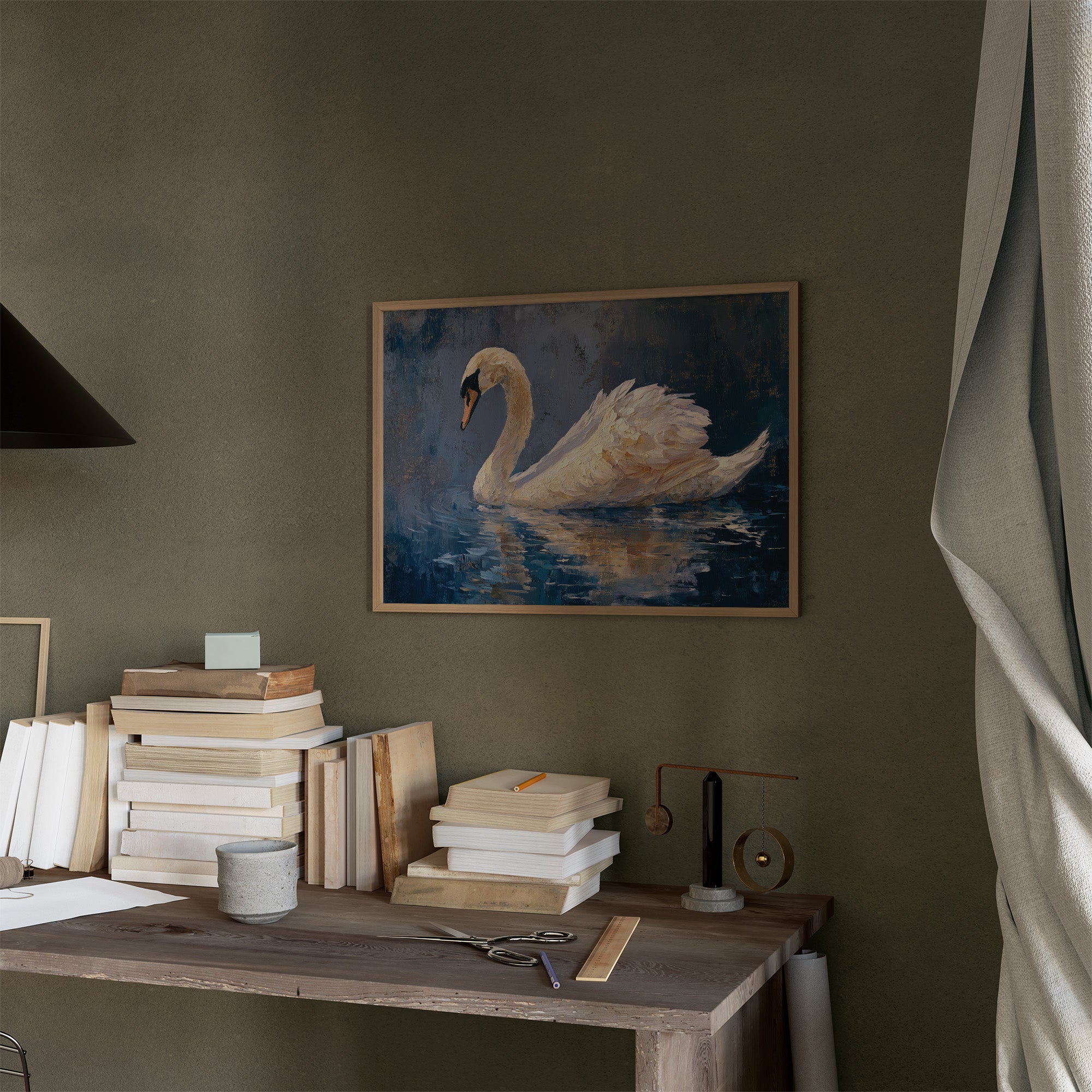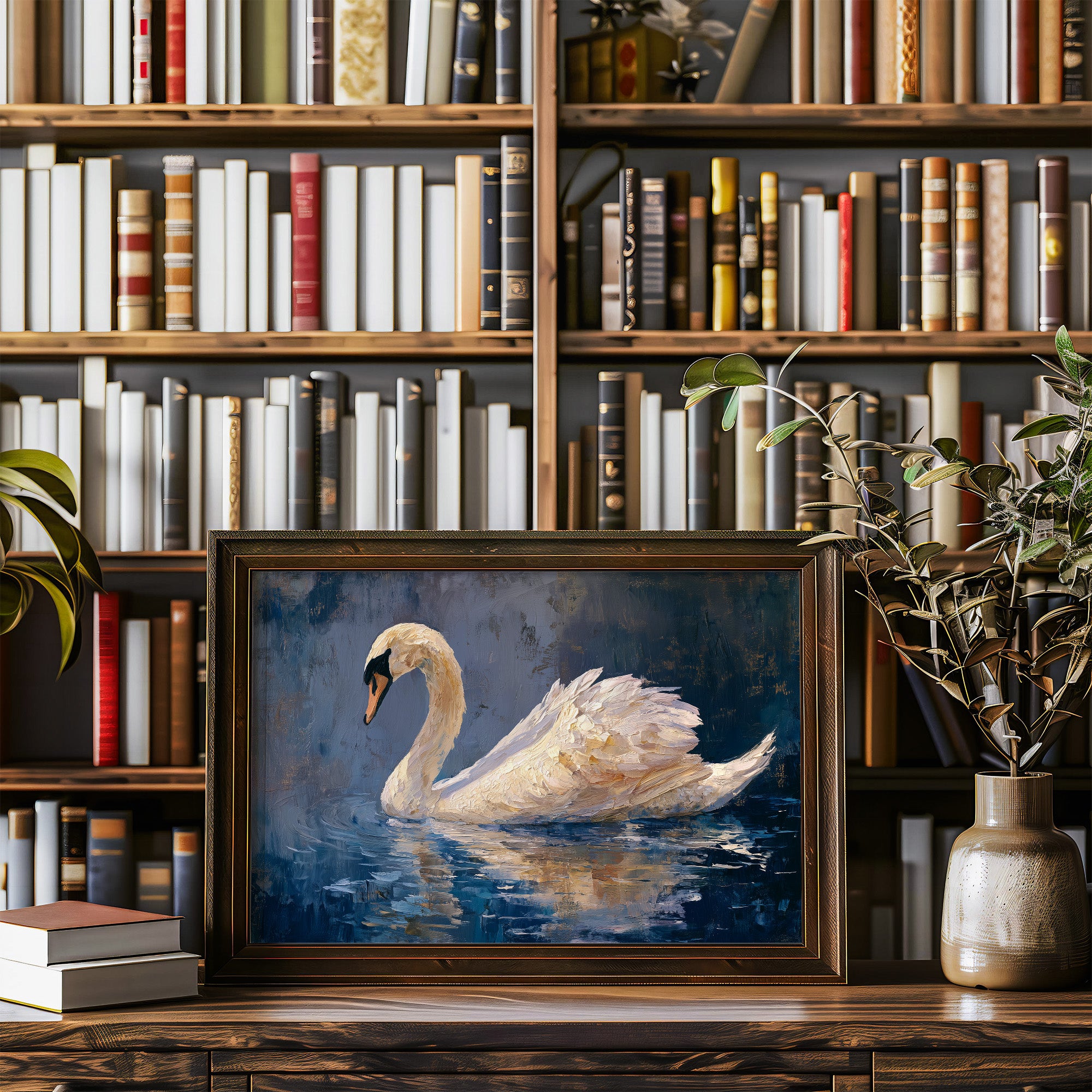 A solitary swan glides across deep indigo waters, its pristine white feathers catching the light with textural brilliance. The painting captures that perfect moment of serene confidence, where grace meets wild dignity in nature's quiet theater. Rich brushstrokes create a moody contrast between the luminous bird and the mysterious depths that cradle its reflection. This striking piece brings refined tranquility to a study, reading nook, or any space where contemplative beauty is cherished.