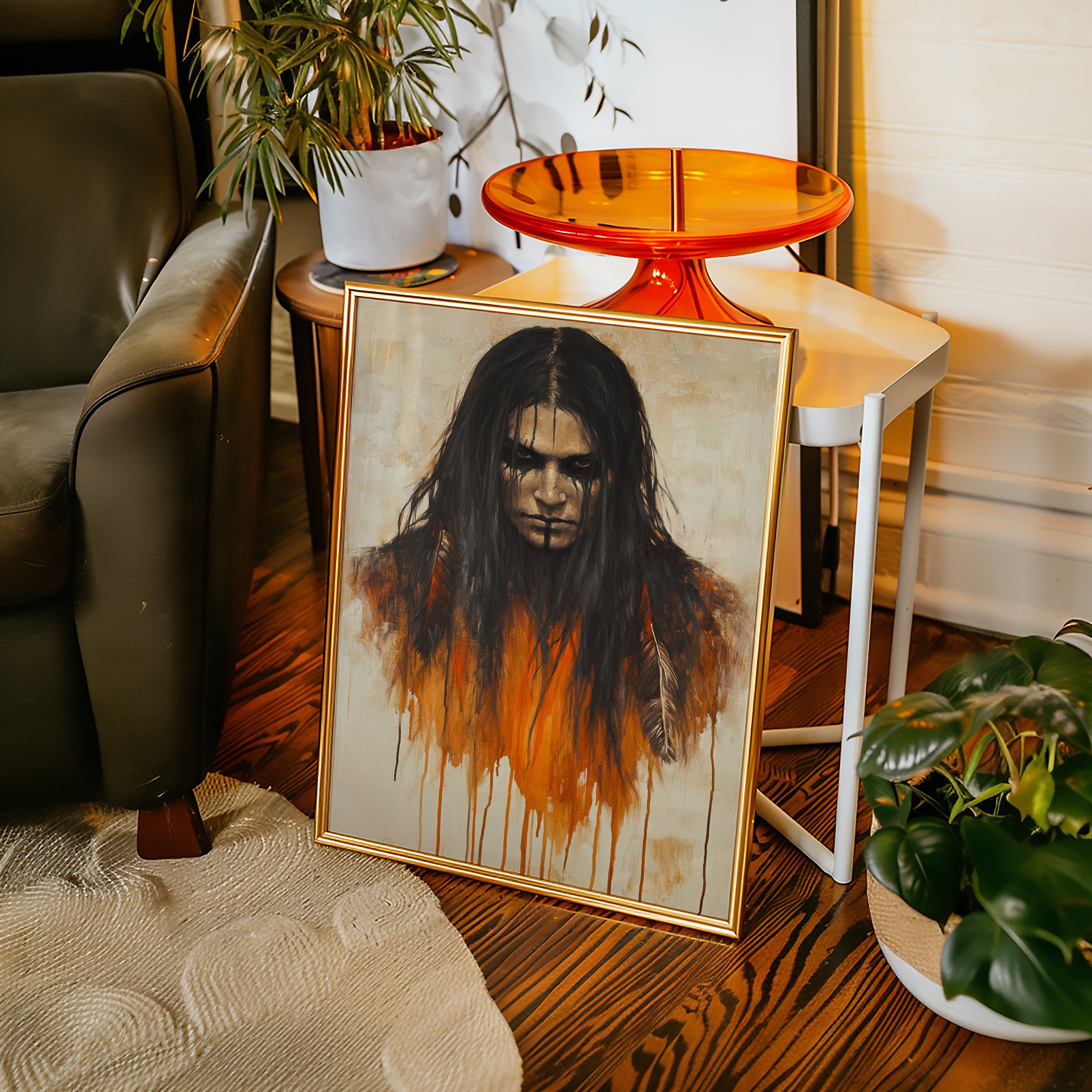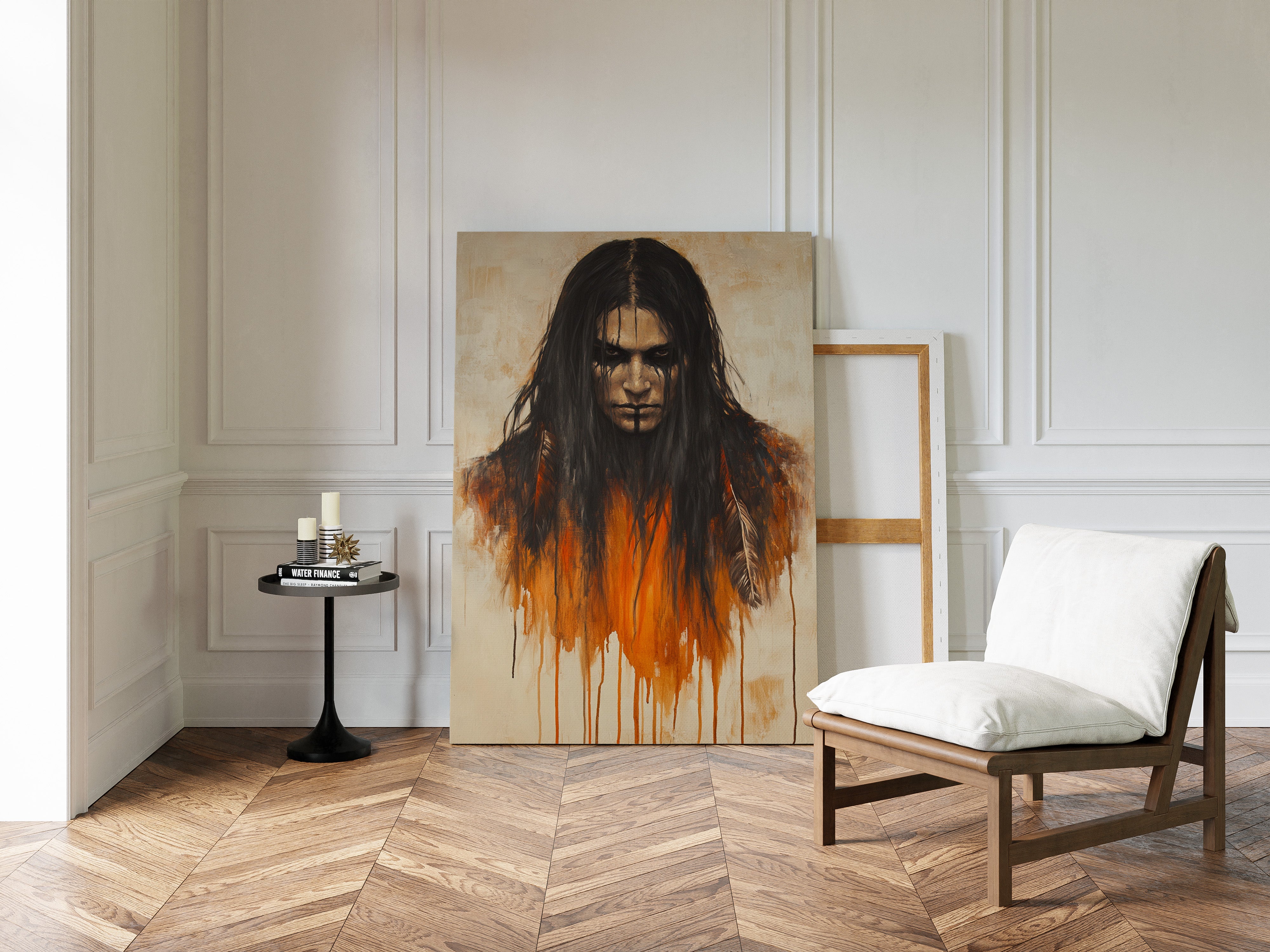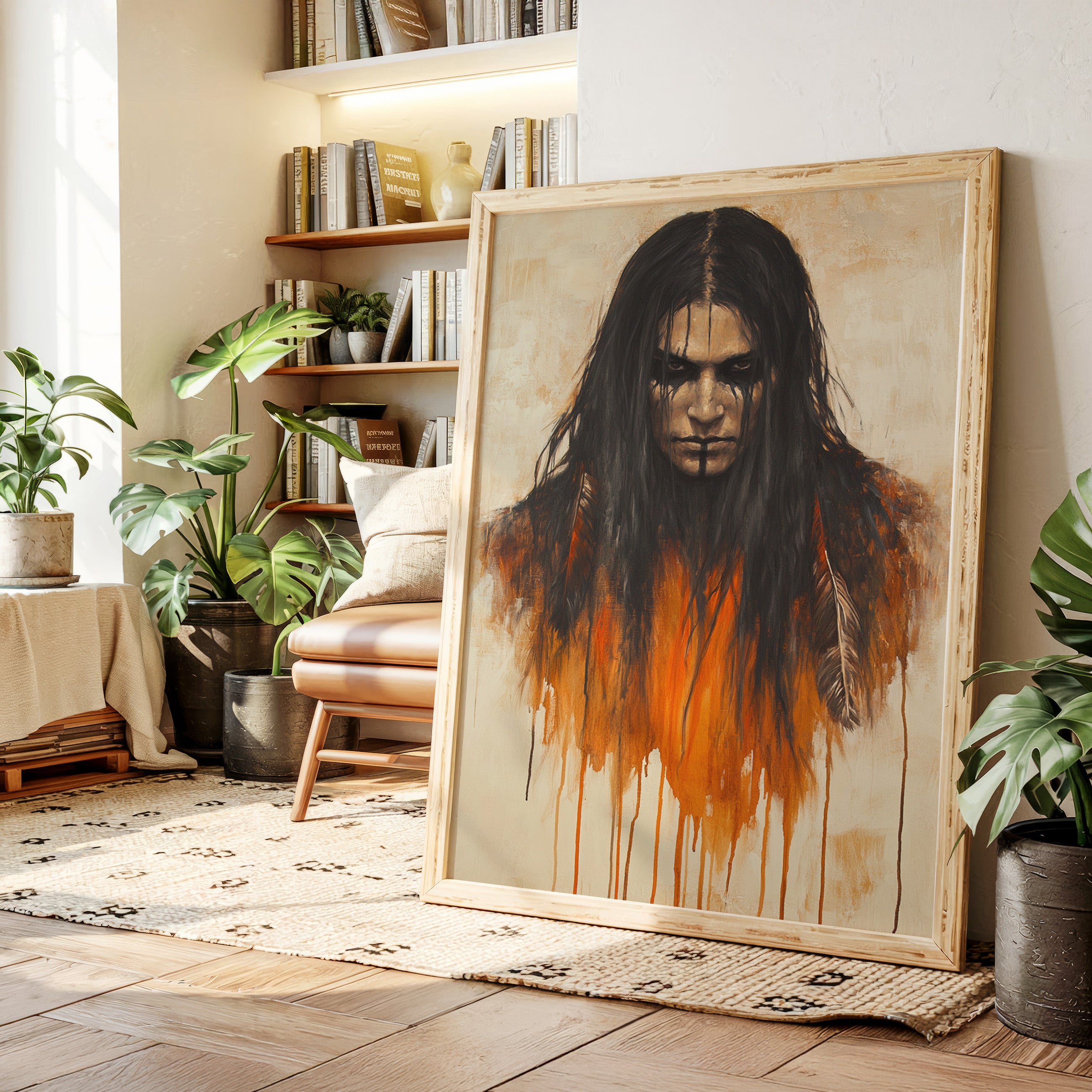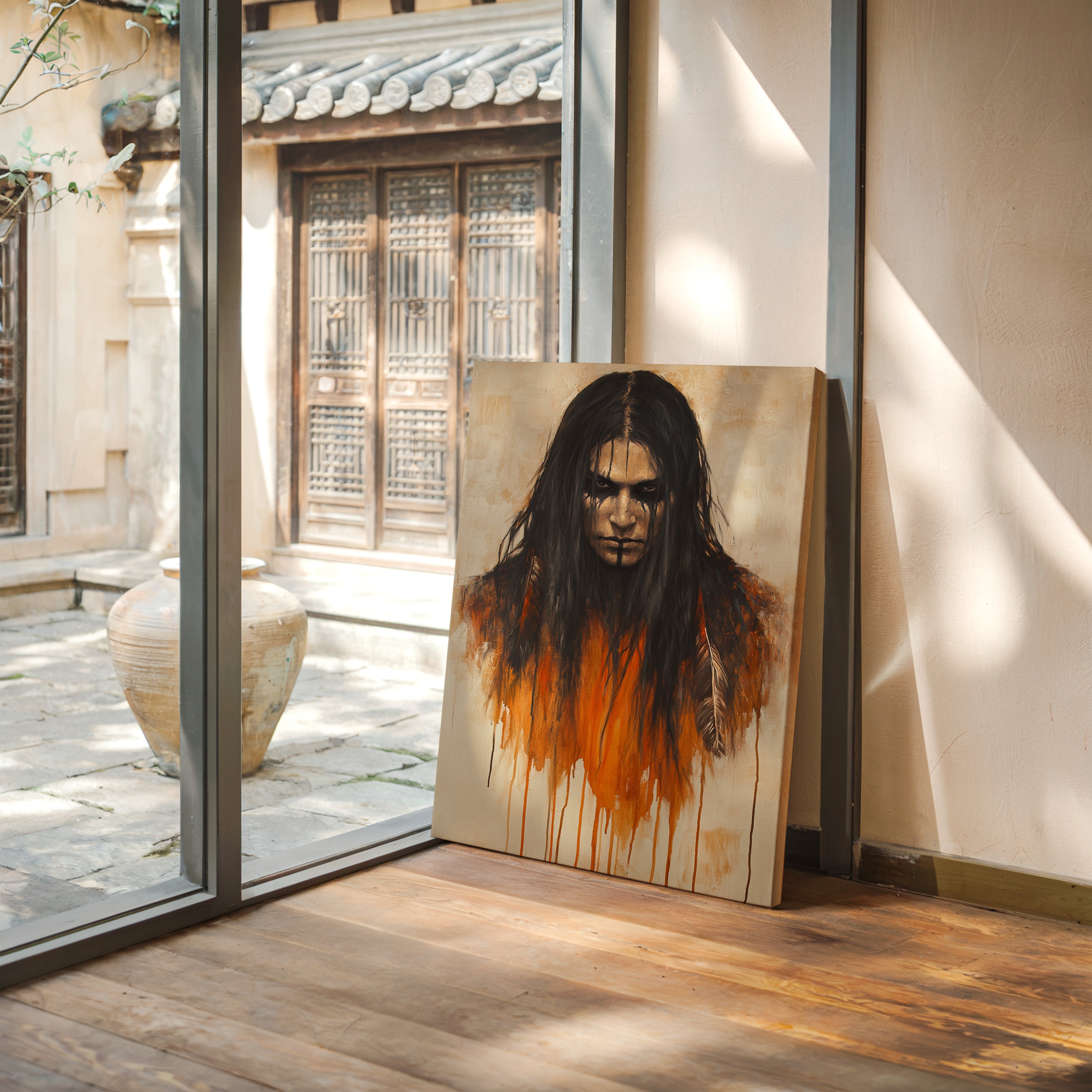 Eyes like coals and fire in the soul—this haunting figure drips with intensity and defiance. War paint, feathers, and burning orange tones ignite the canvas with fierce spirit.