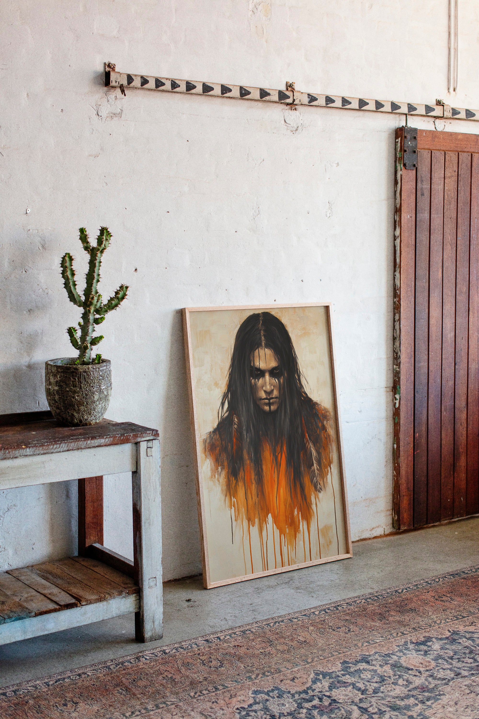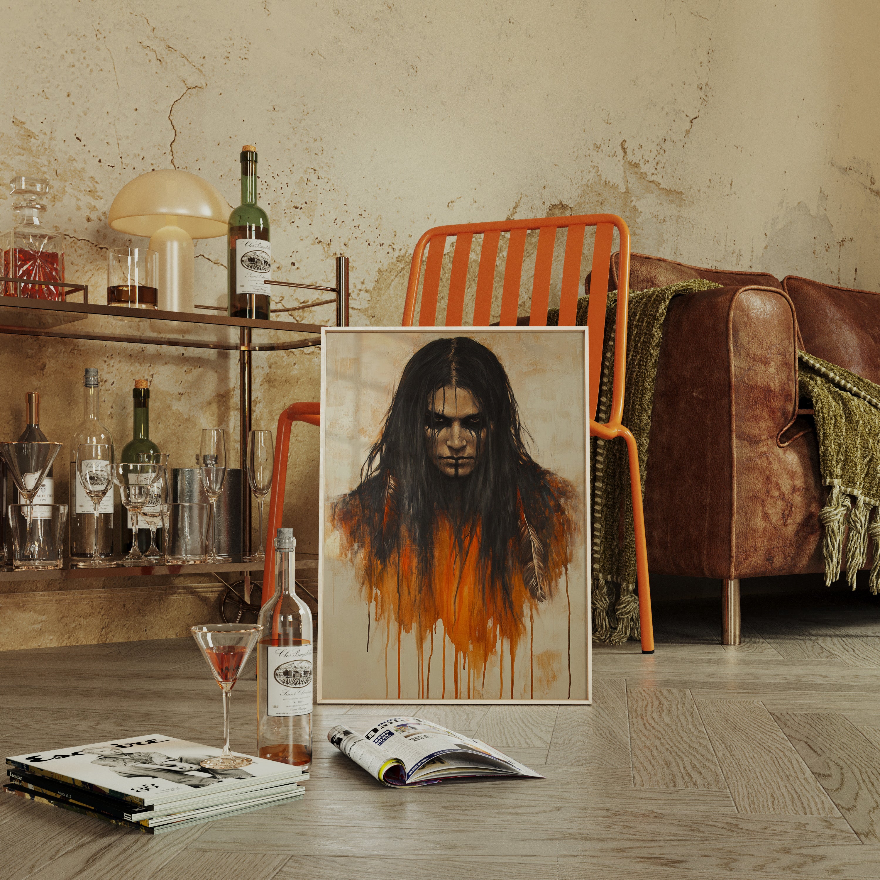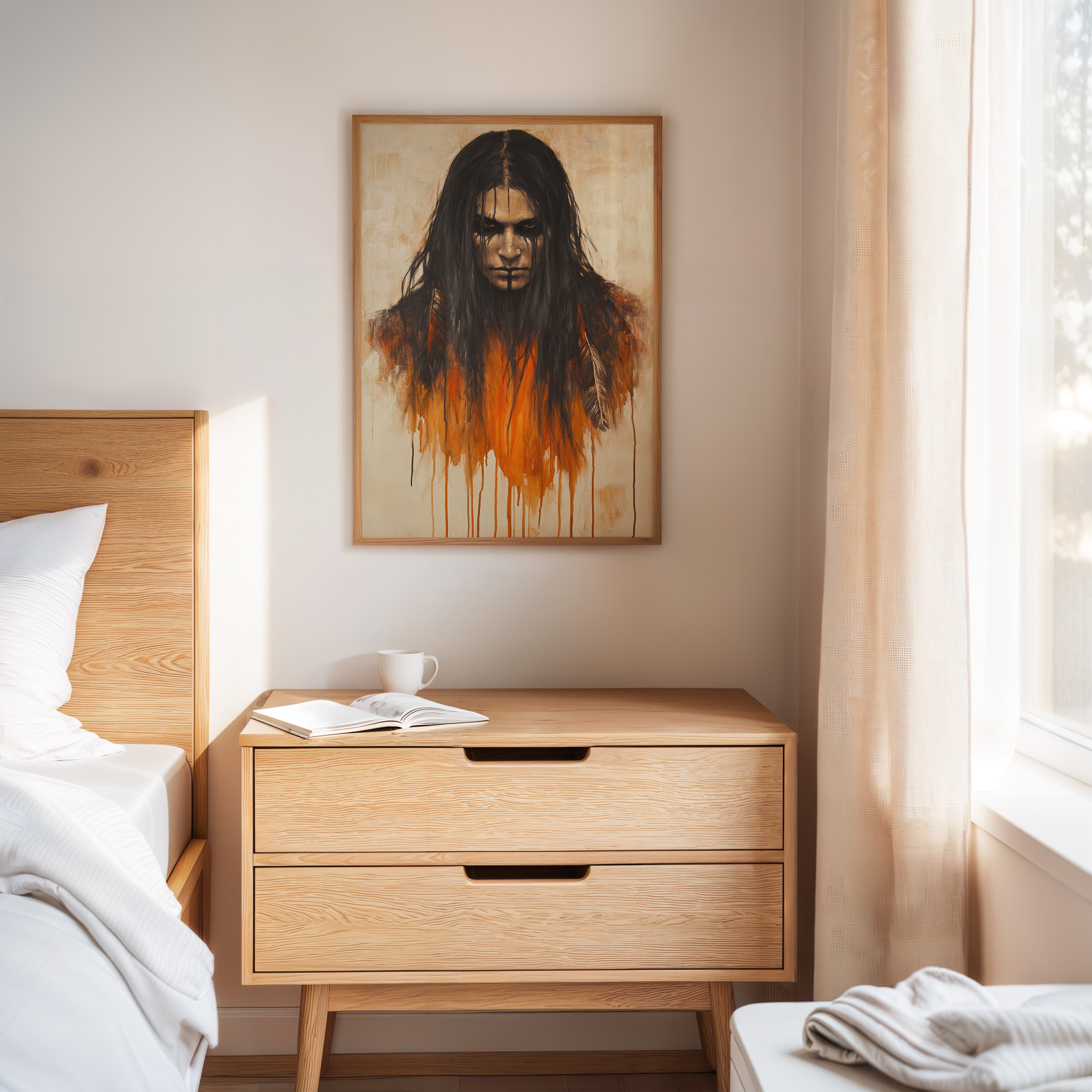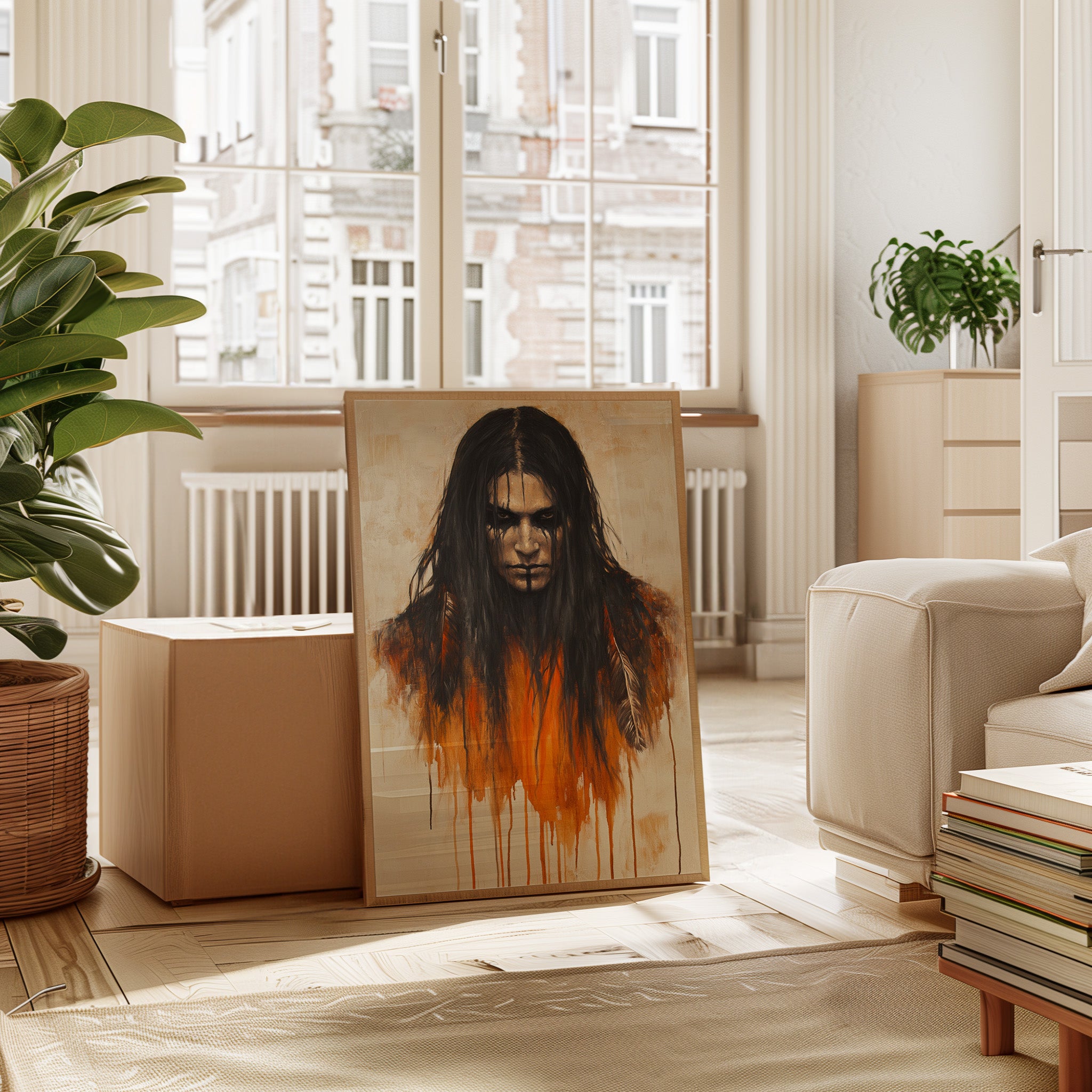 Eyes like coals and fire in the soul—this haunting figure drips with intensity and defiance. War paint, feathers, and burning orange tones ignite the canvas with fierce spirit.