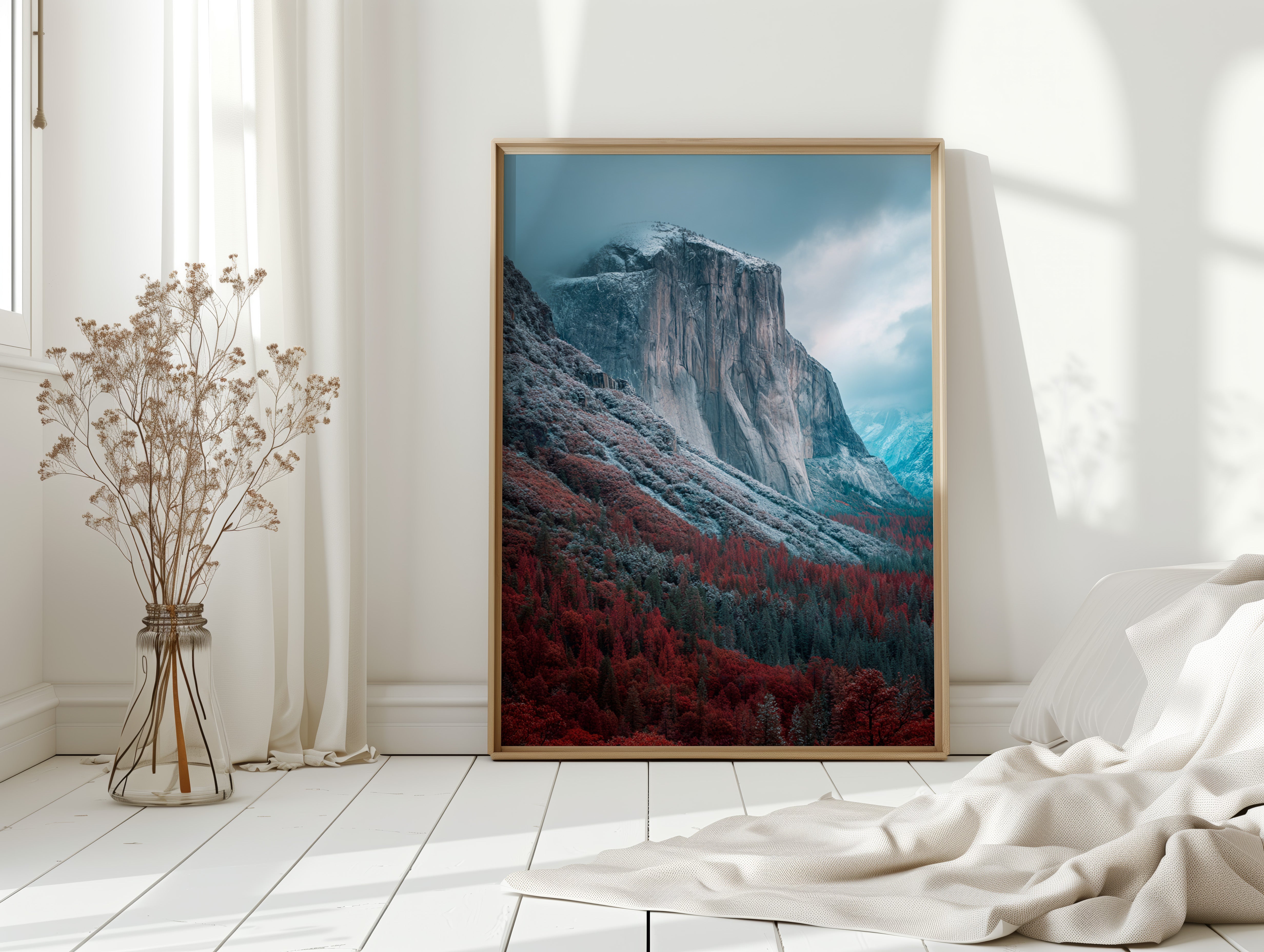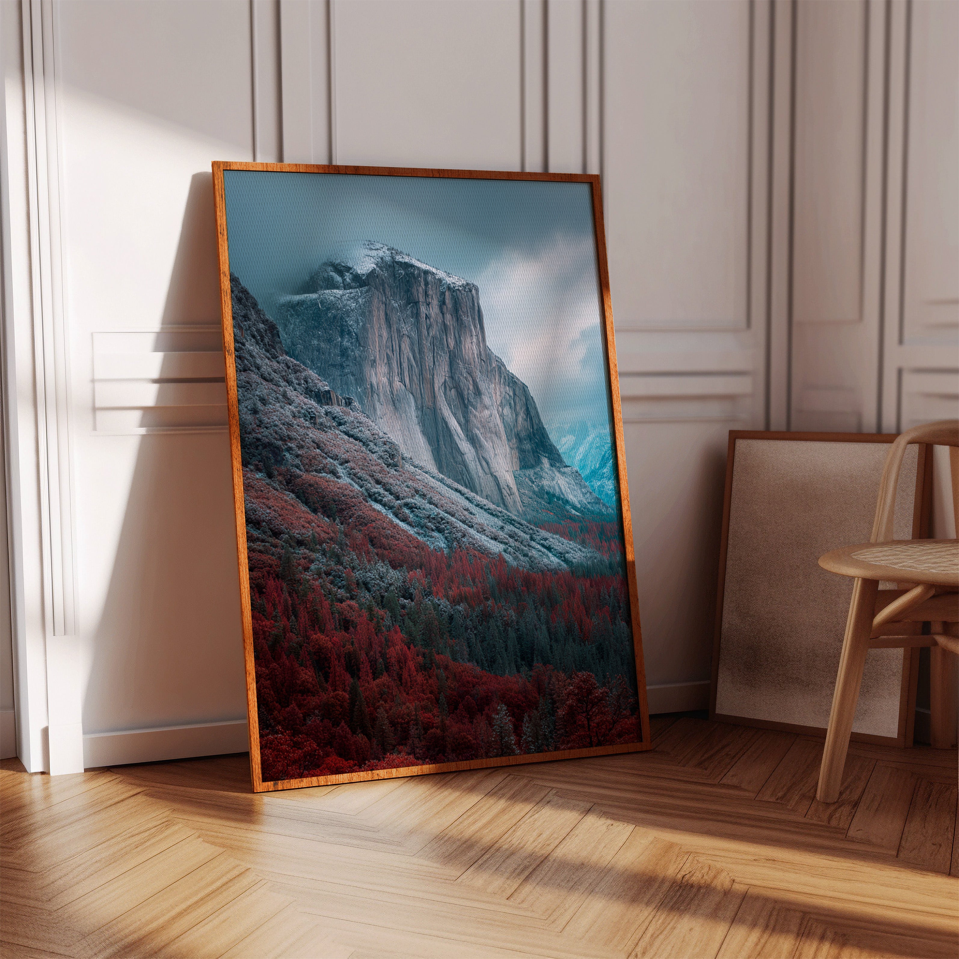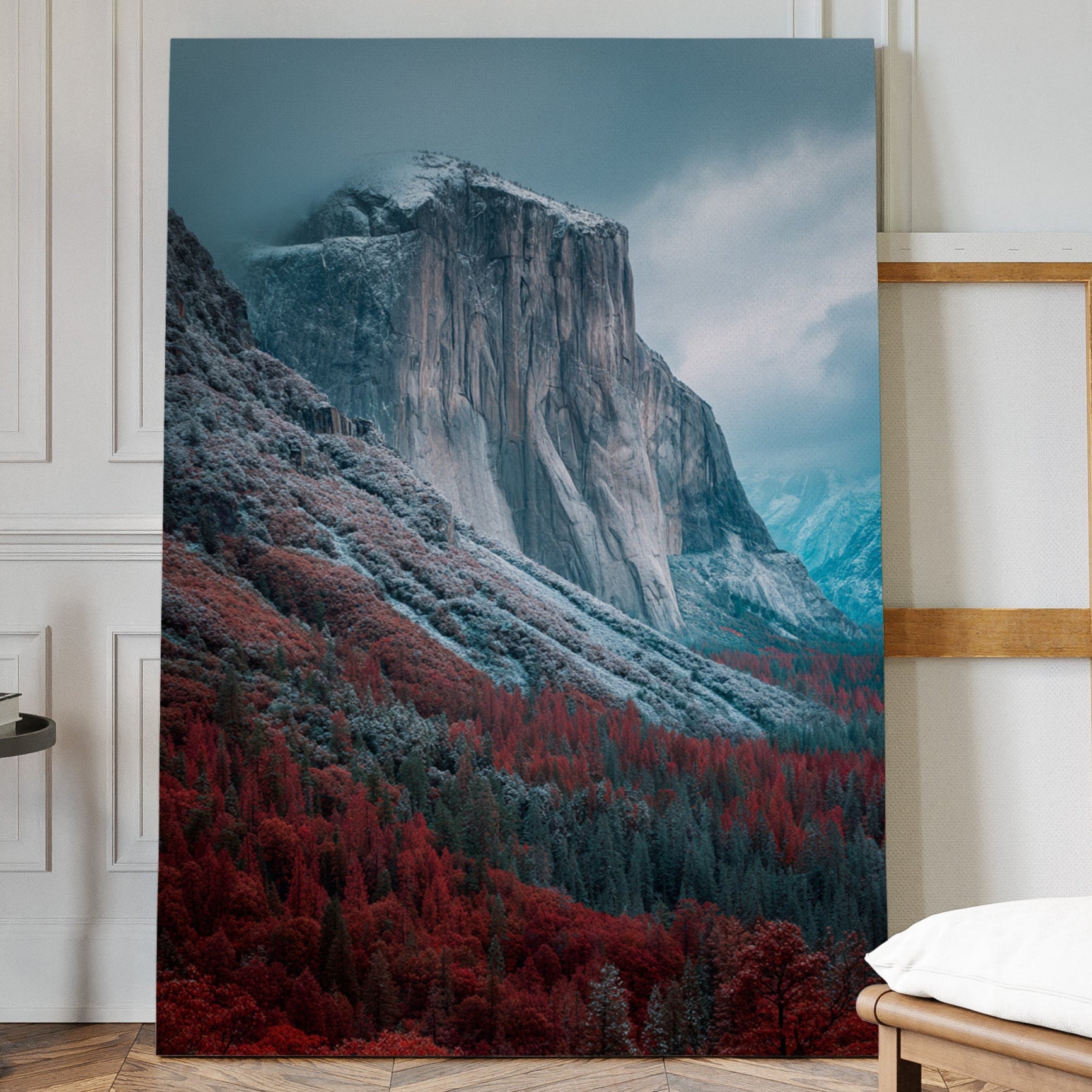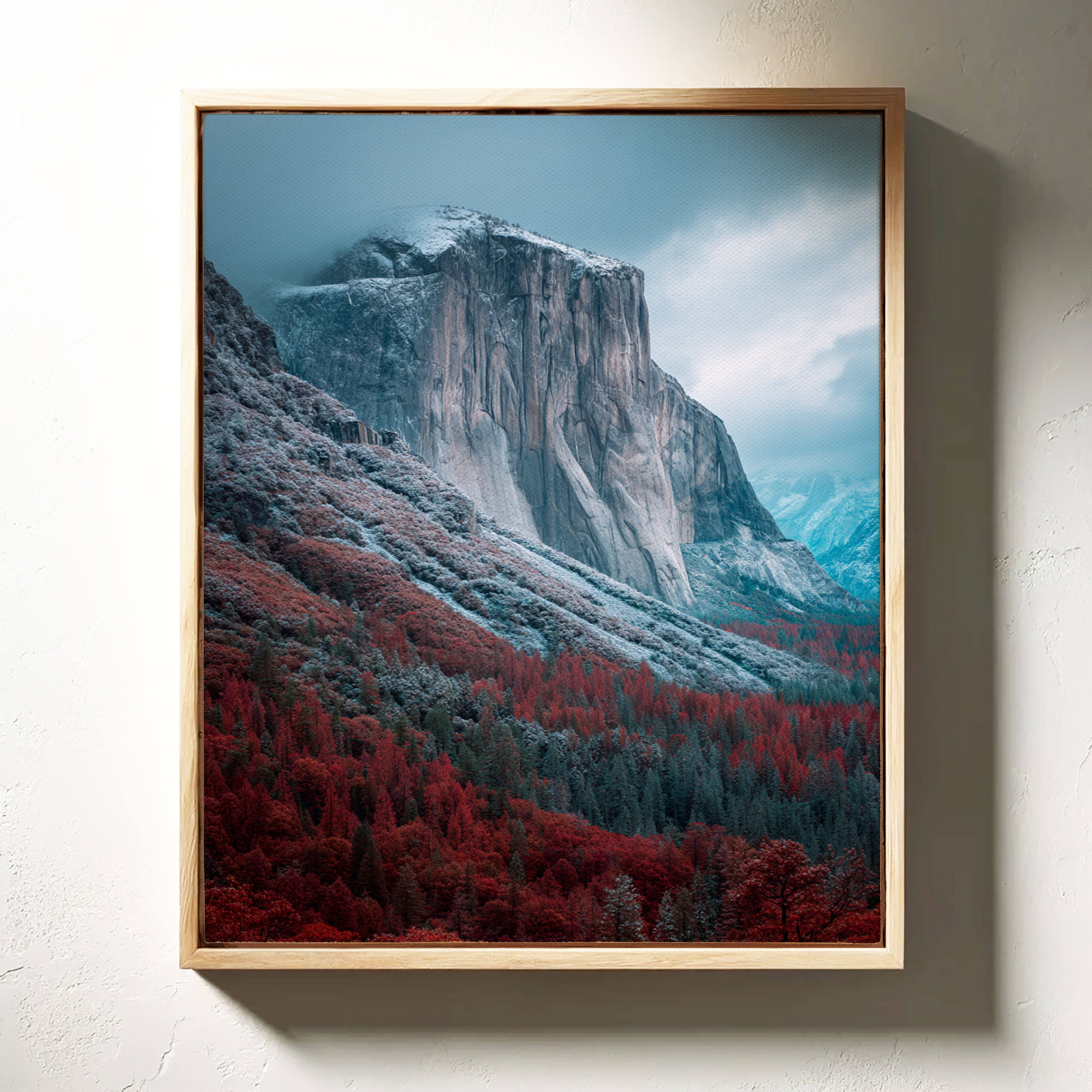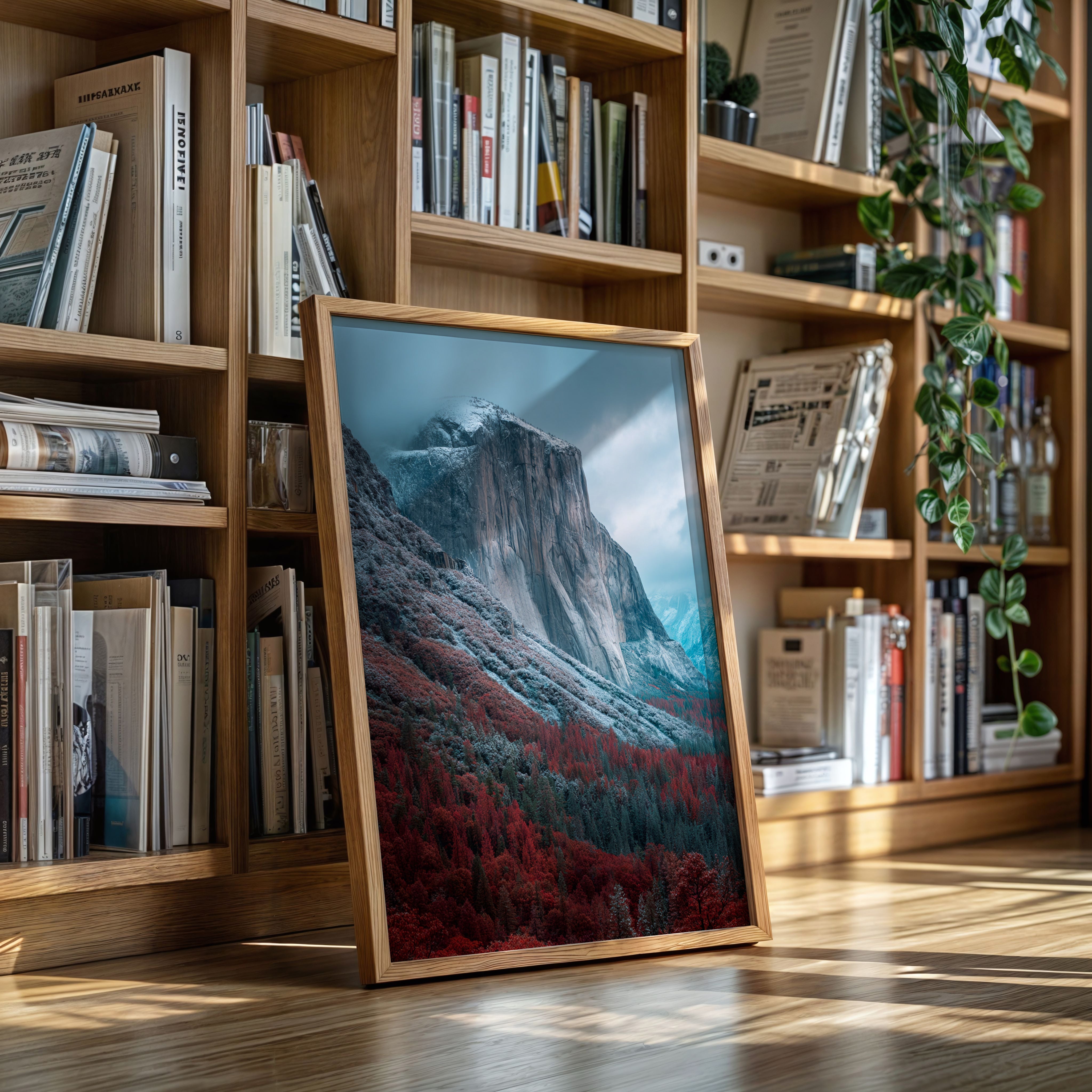 A striking mountain stands resolute, its surface etched with time, surrounded by a fiery embrace of autumn foliage. This piece embodies the raw beauty inherent in nature's cycles, inviting reflection and admiration. The vivid reds of the trees contrast with the cool tones of the mountain, creating a visual dialogue that speaks of transitions and resilience. Ideal for a living space or study, this artwork brings a sense of grounding and connection to the outdoors.