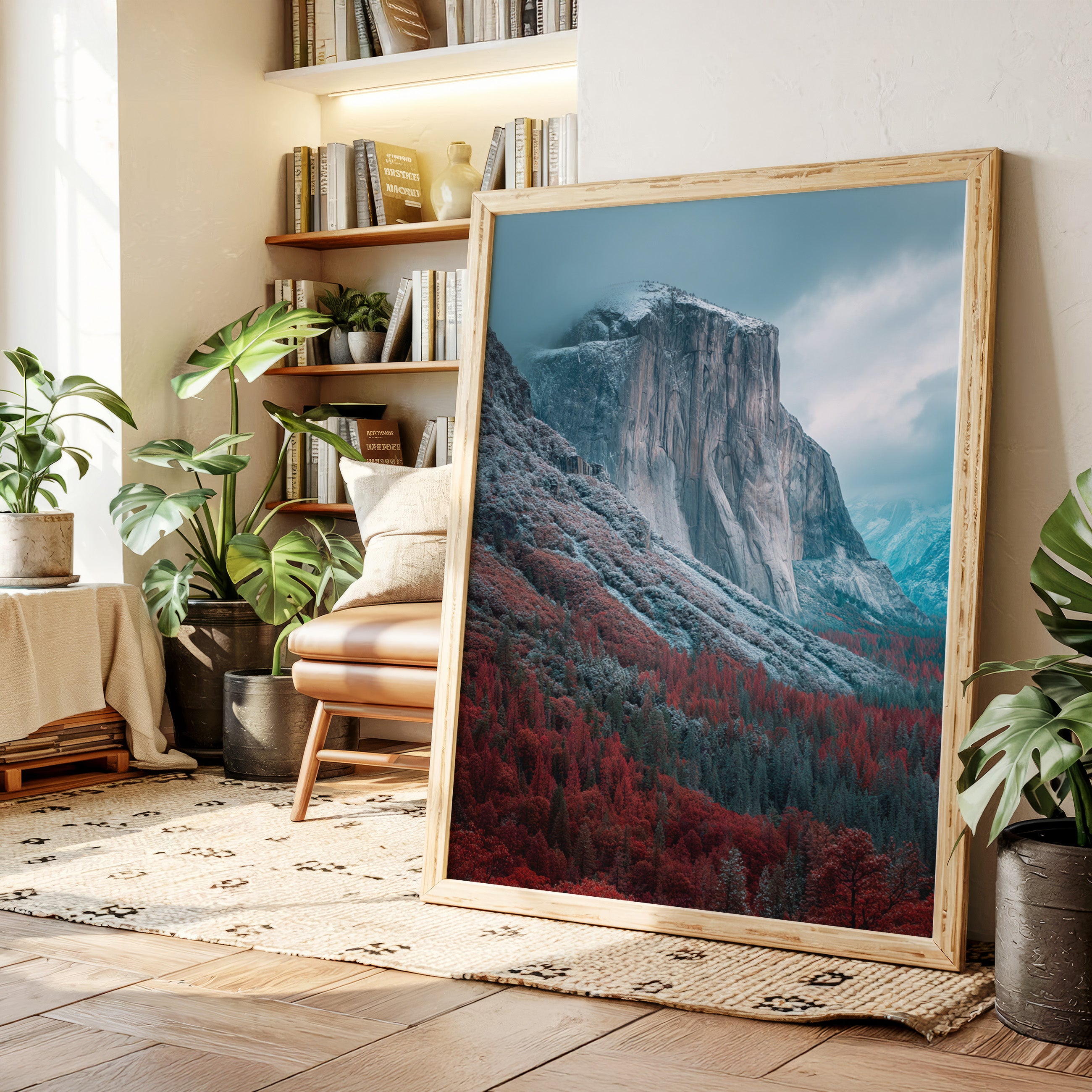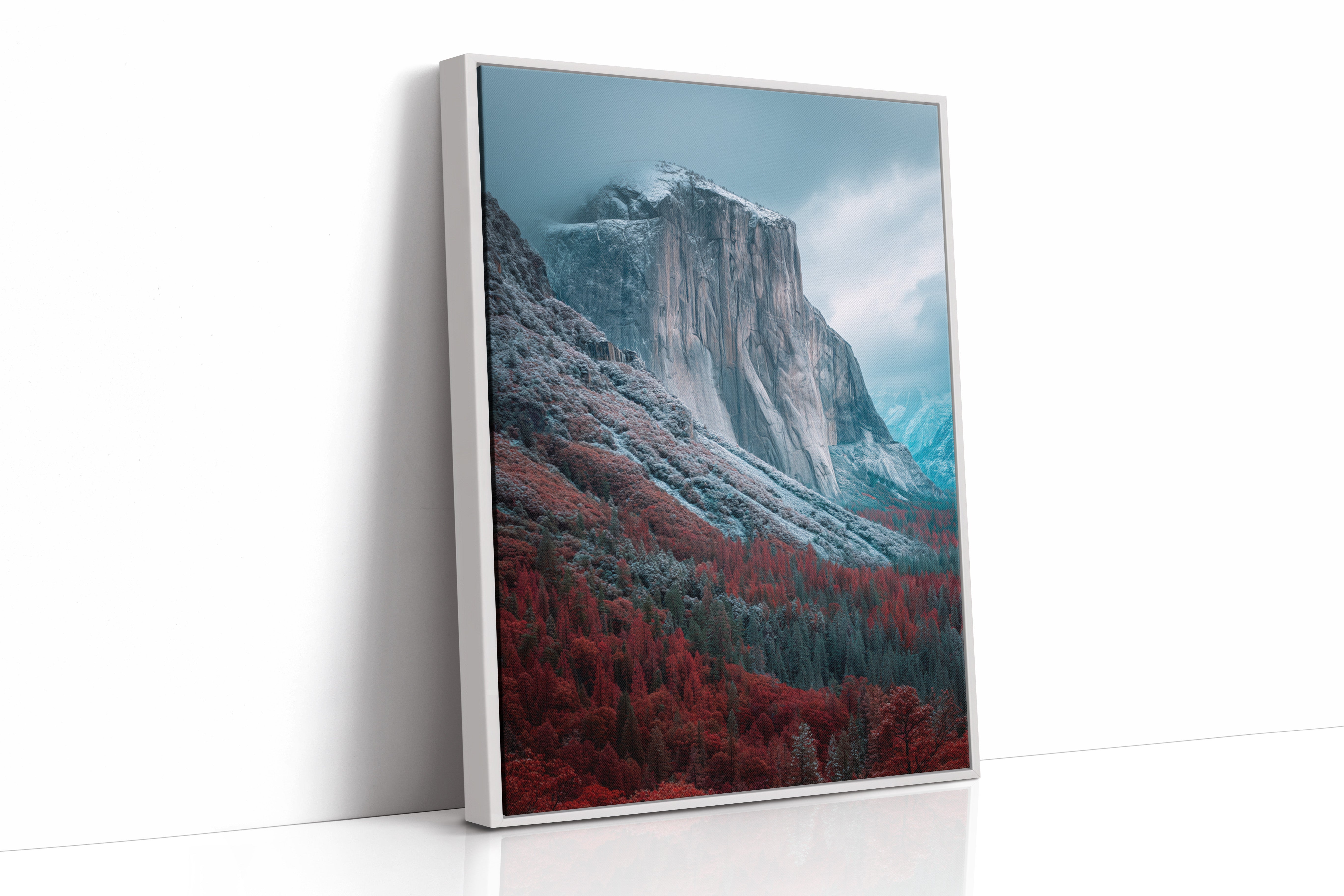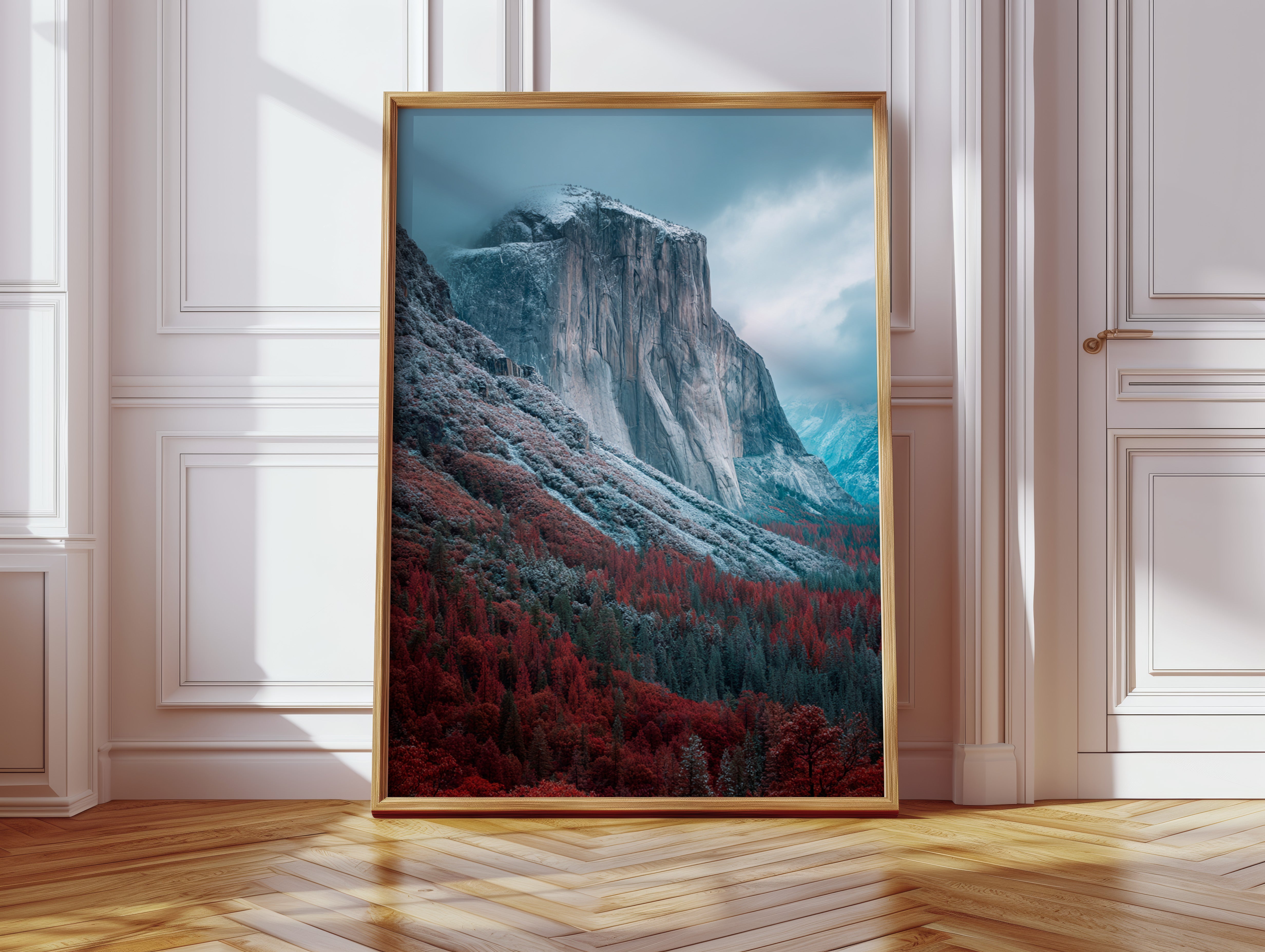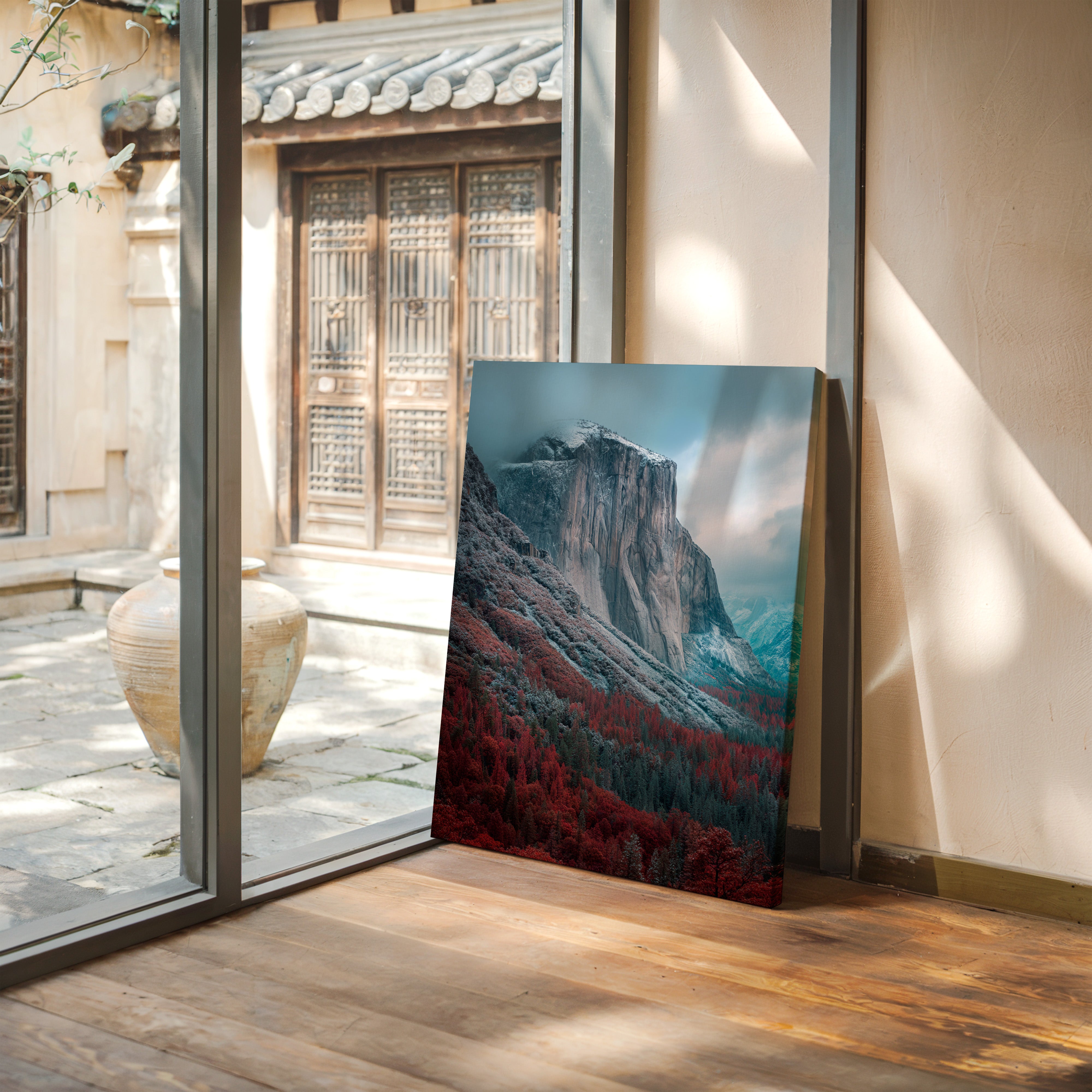 A striking mountain stands resolute, its surface etched with time, surrounded by a fiery embrace of autumn foliage. This piece embodies the raw beauty inherent in nature's cycles, inviting reflection and admiration. The vivid reds of the trees contrast with the cool tones of the mountain, creating a visual dialogue that speaks of transitions and resilience. Ideal for a living space or study, this artwork brings a sense of grounding and connection to the outdoors.