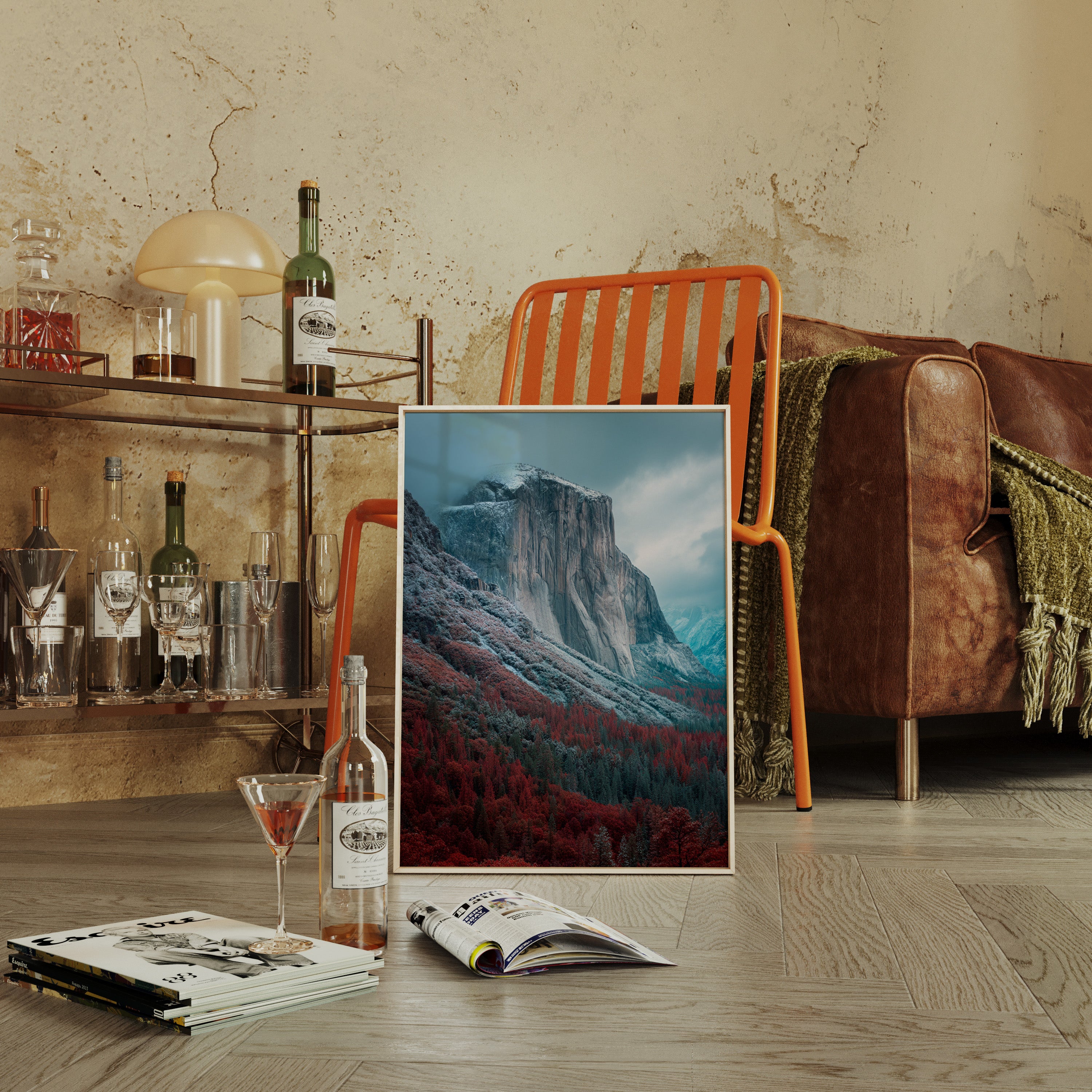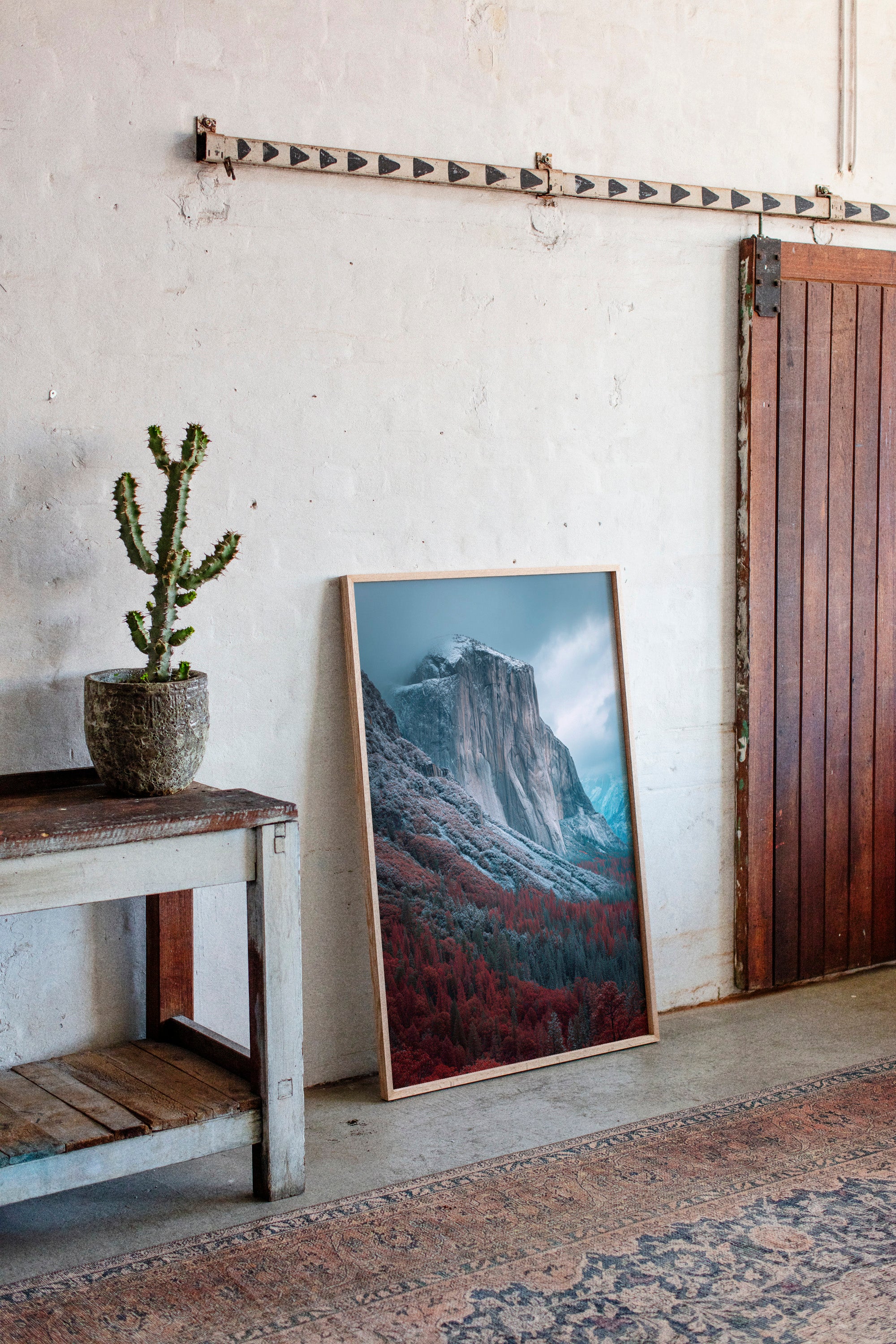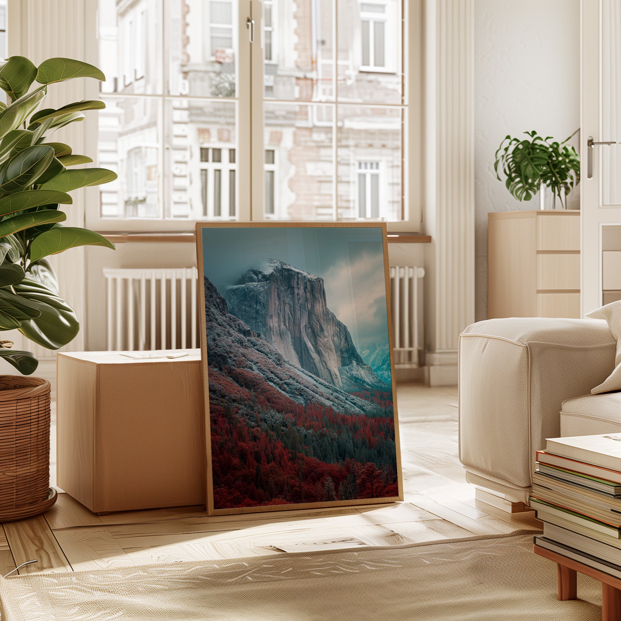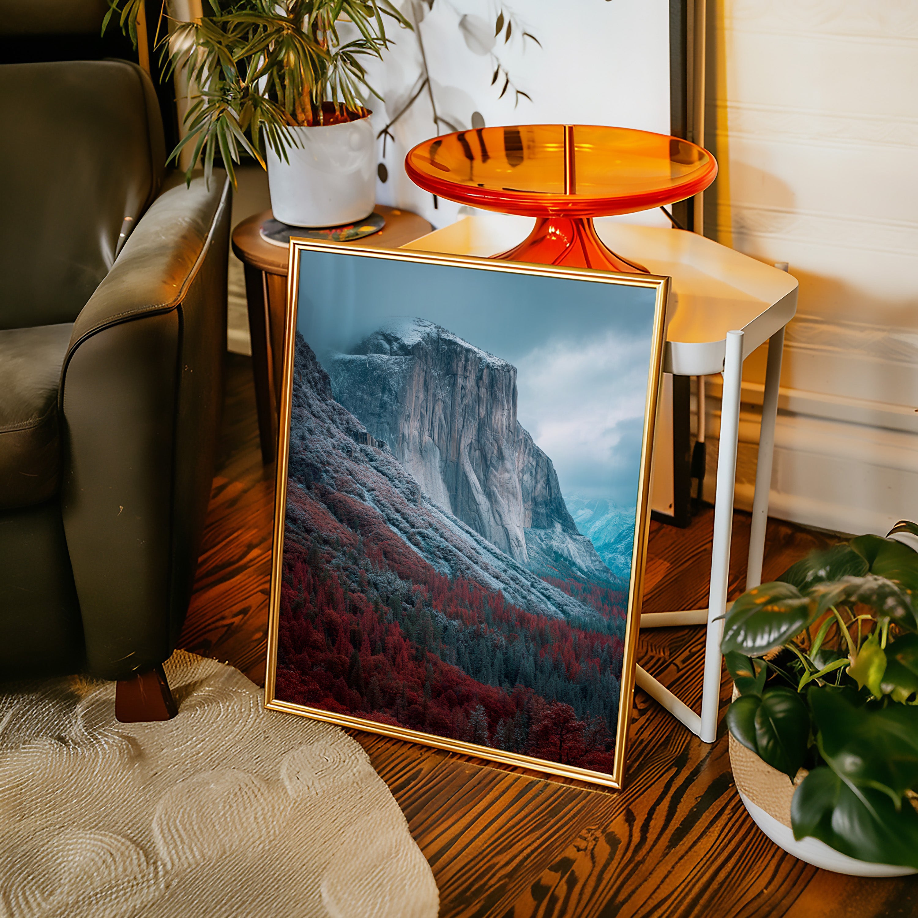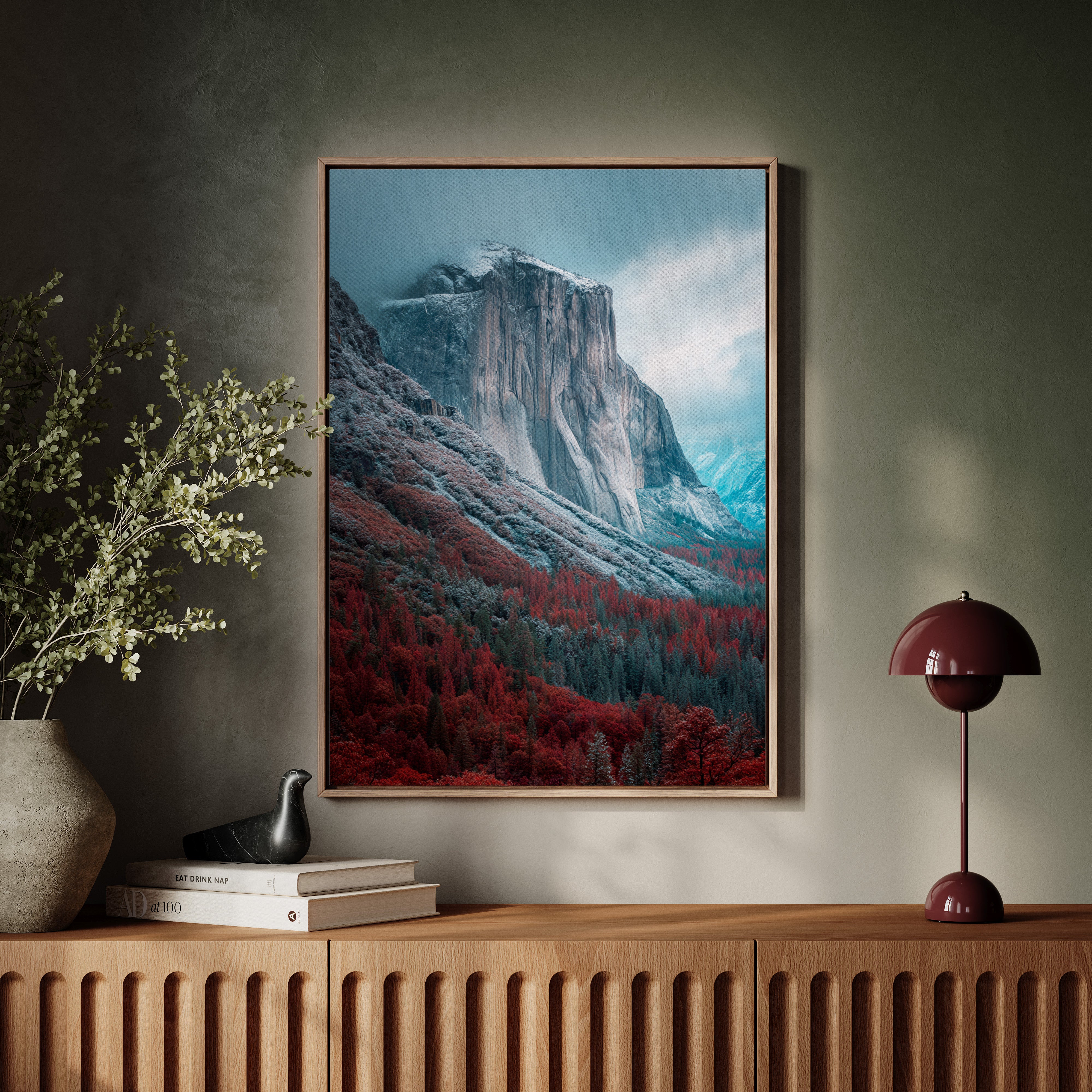 A striking mountain stands resolute, its surface etched with time, surrounded by a fiery embrace of autumn foliage. This piece embodies the raw beauty inherent in nature's cycles, inviting reflection and admiration. The vivid reds of the trees contrast with the cool tones of the mountain, creating a visual dialogue that speaks of transitions and resilience. Ideal for a living space or study, this artwork brings a sense of grounding and connection to the outdoors.