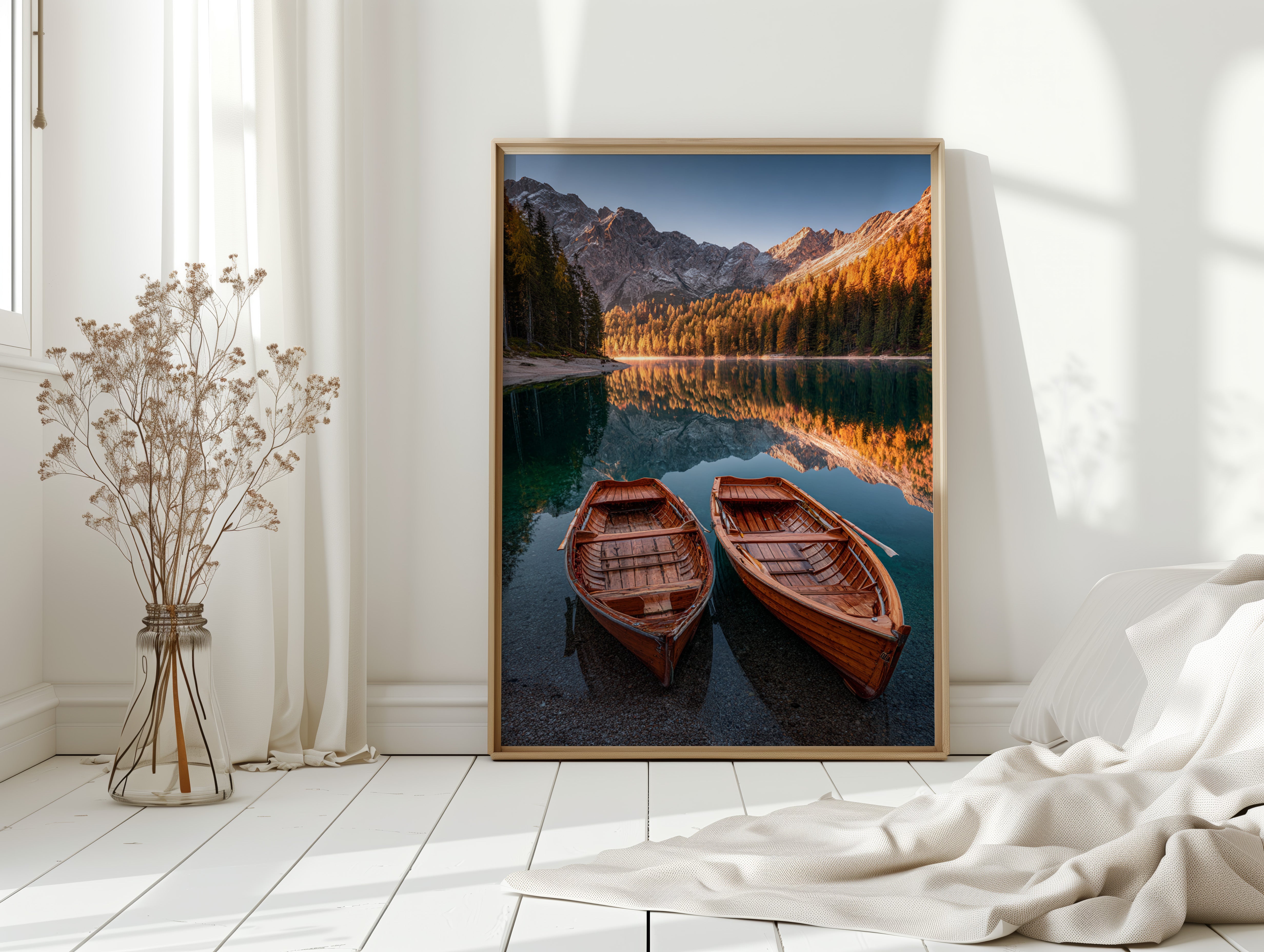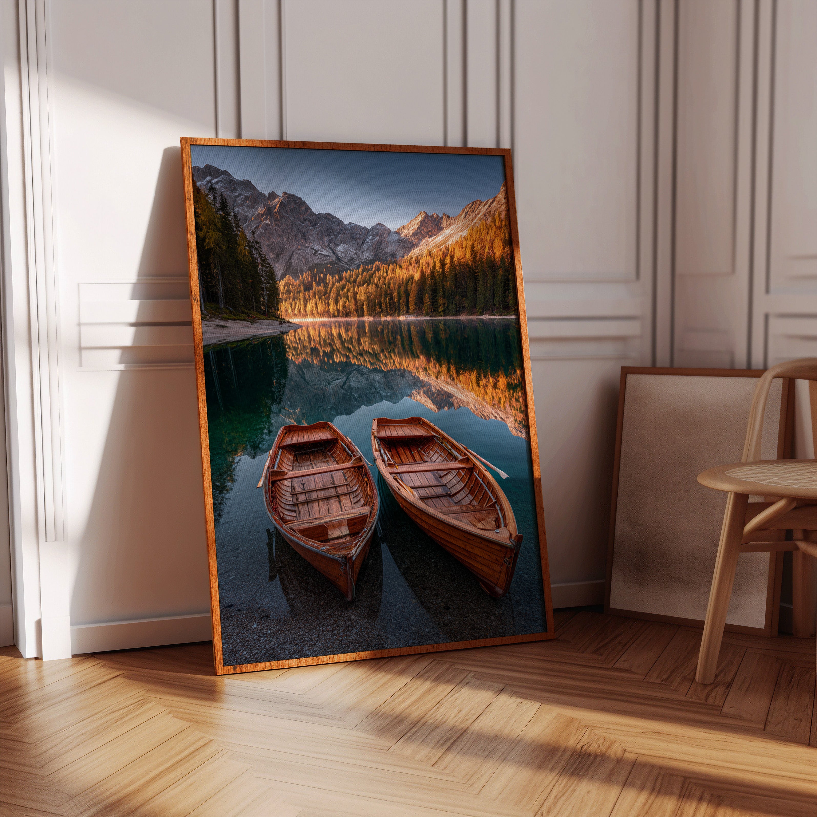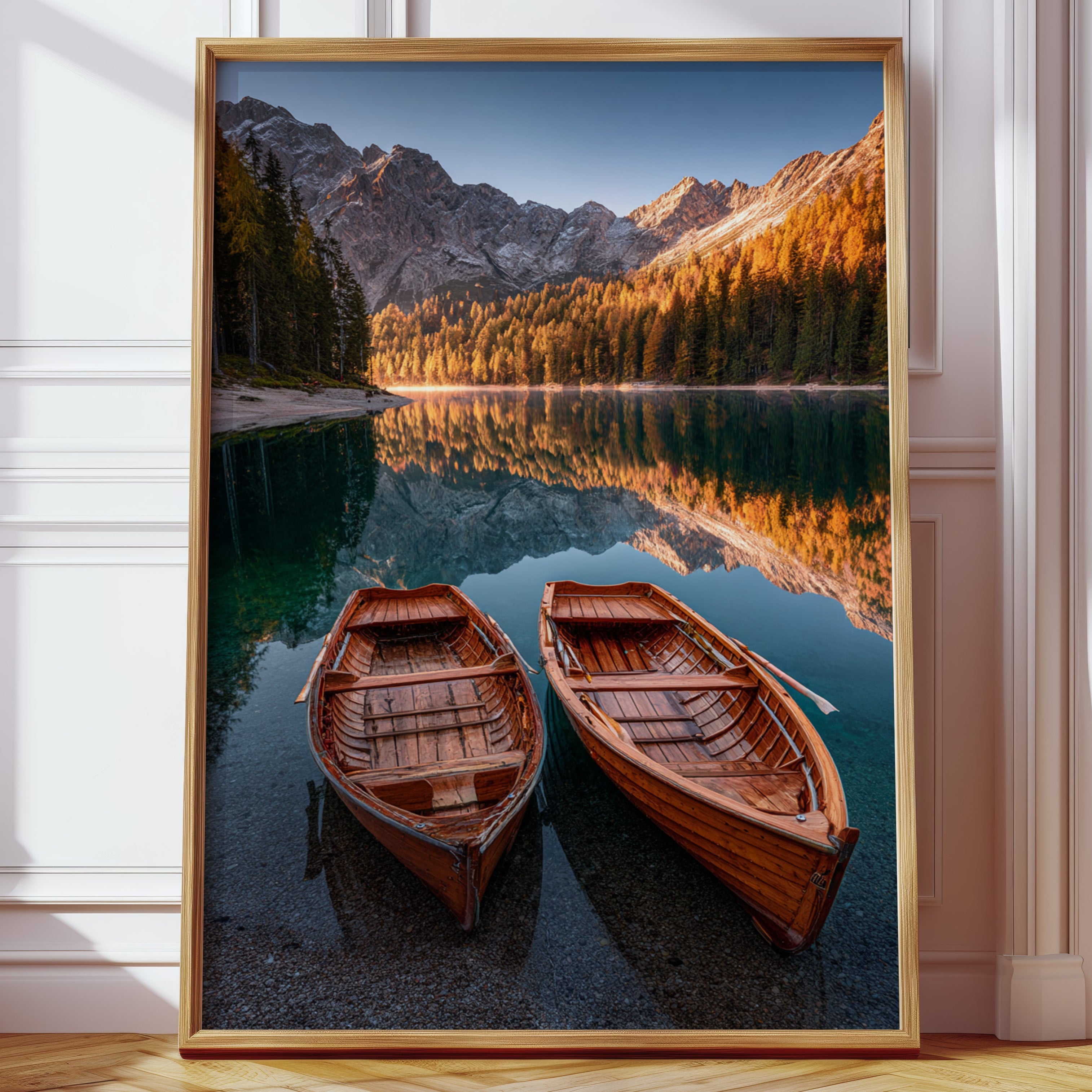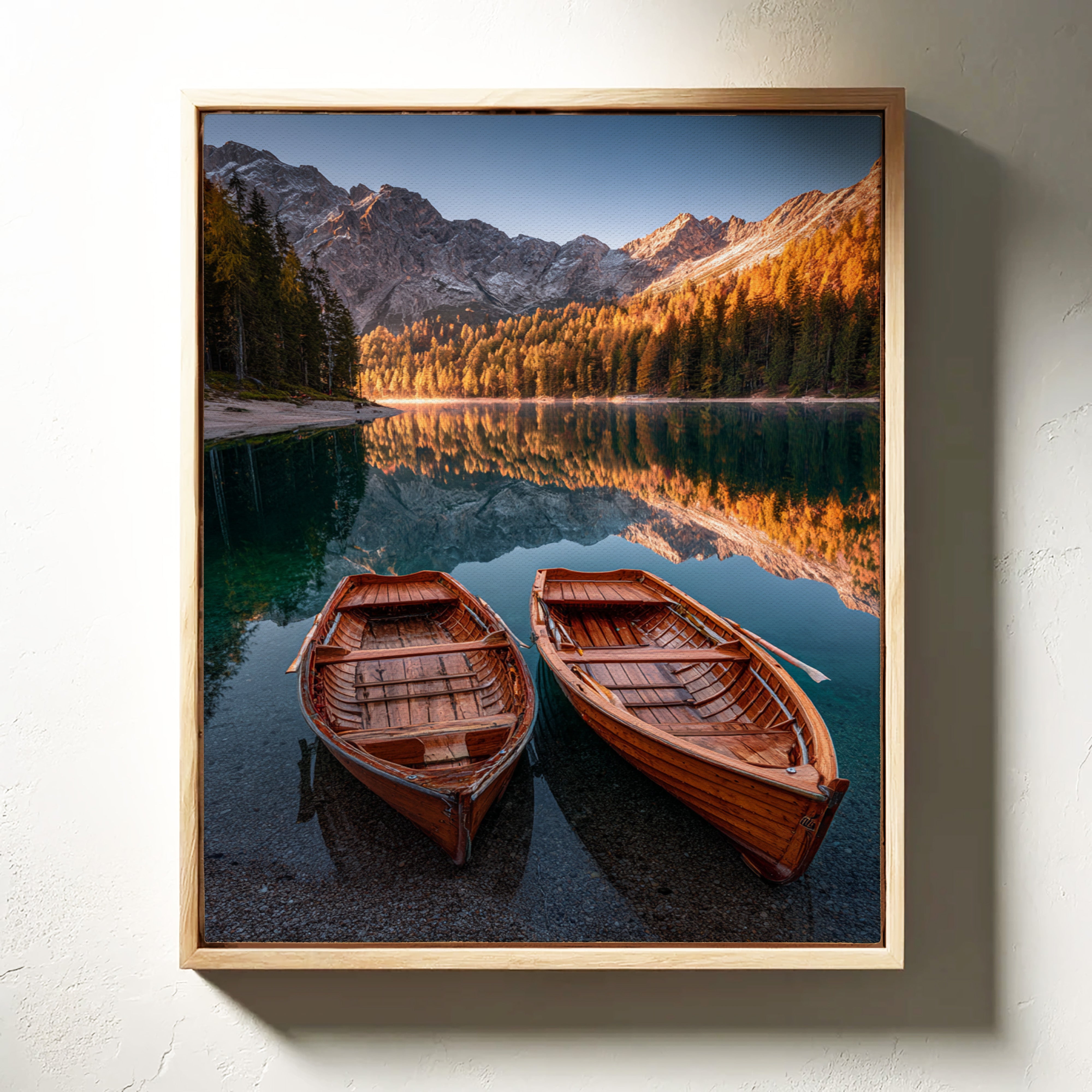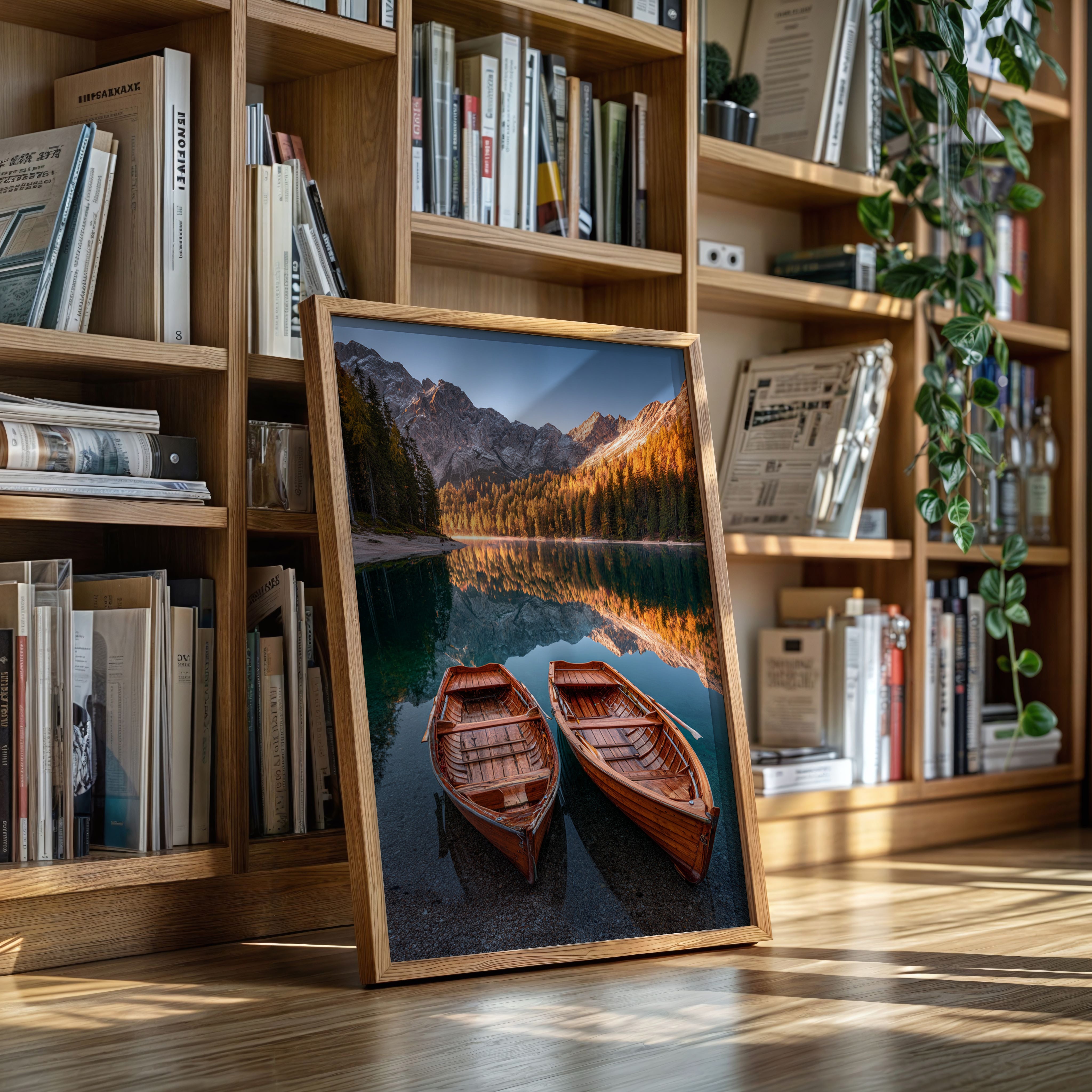 As the sun dips below the peaks, two wooden boats rest in tranquil waters, their reflections merging with the fiery hues of autumn foliage. A serene addition to the Artisanal collection, this piece captures nature's elegance in its purest form. The rich textures of the boats and the shimmering lake evoke a sense of nostalgia, inviting the viewer to imagine stories of journeys past and quiet moments shared. Perfect for a cozy living room or a serene study, this artwork brings warmth and a touch of adventure to any space.